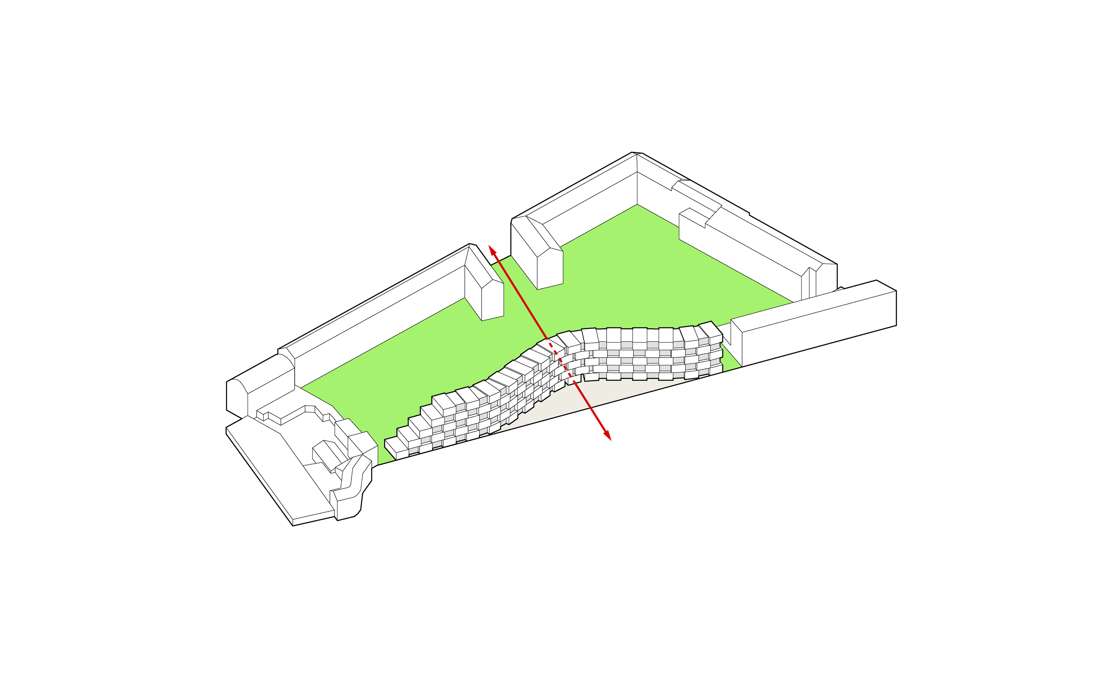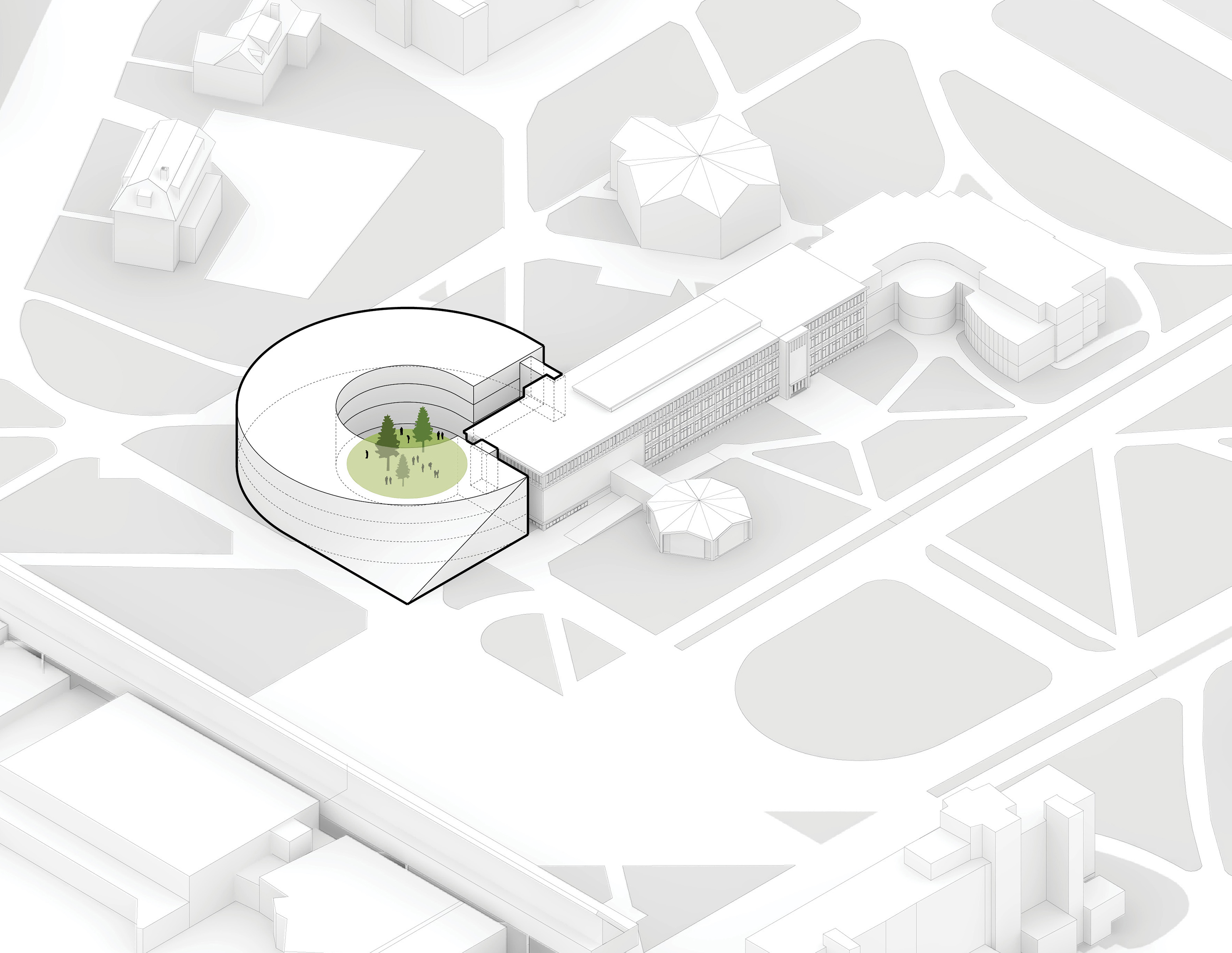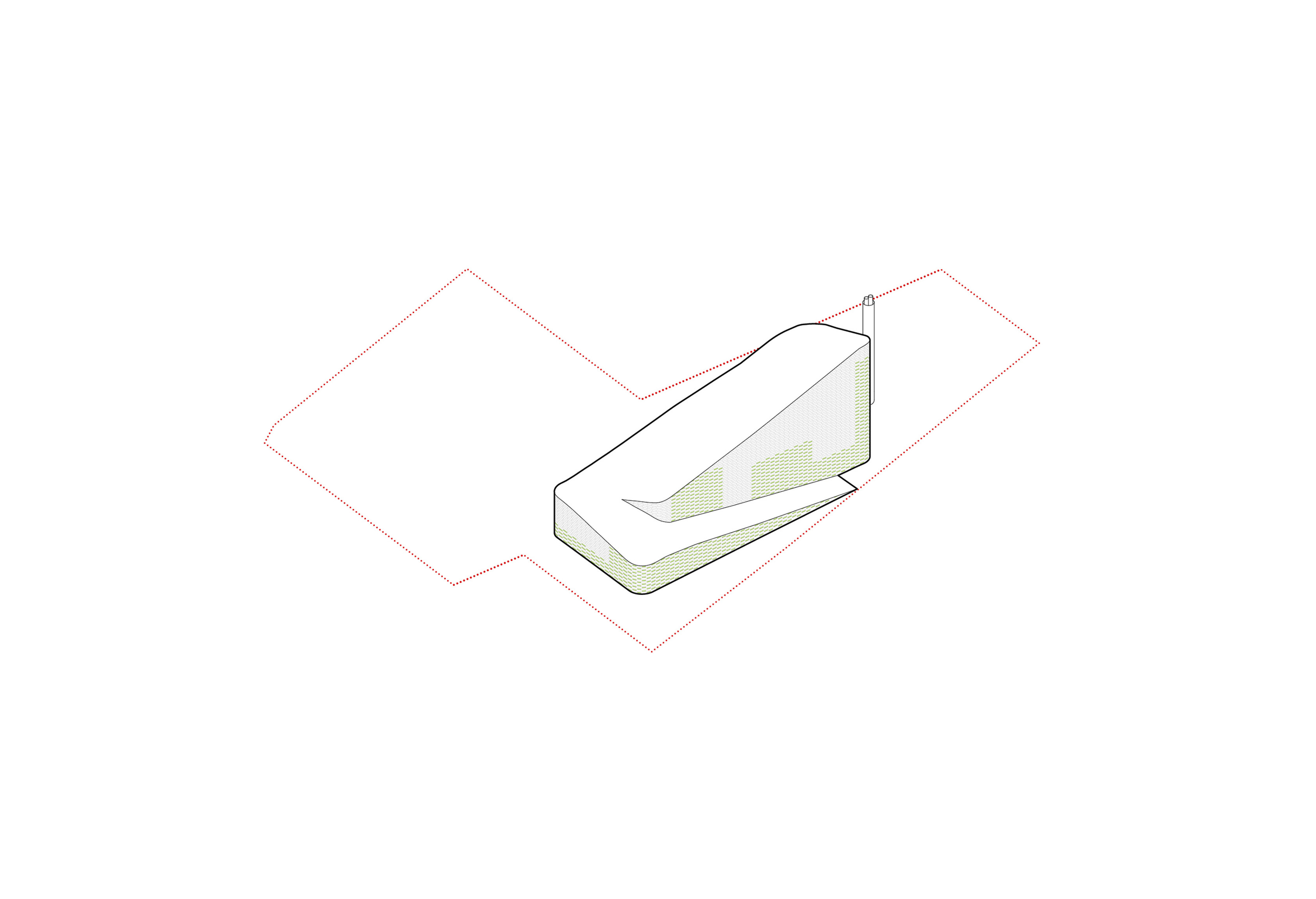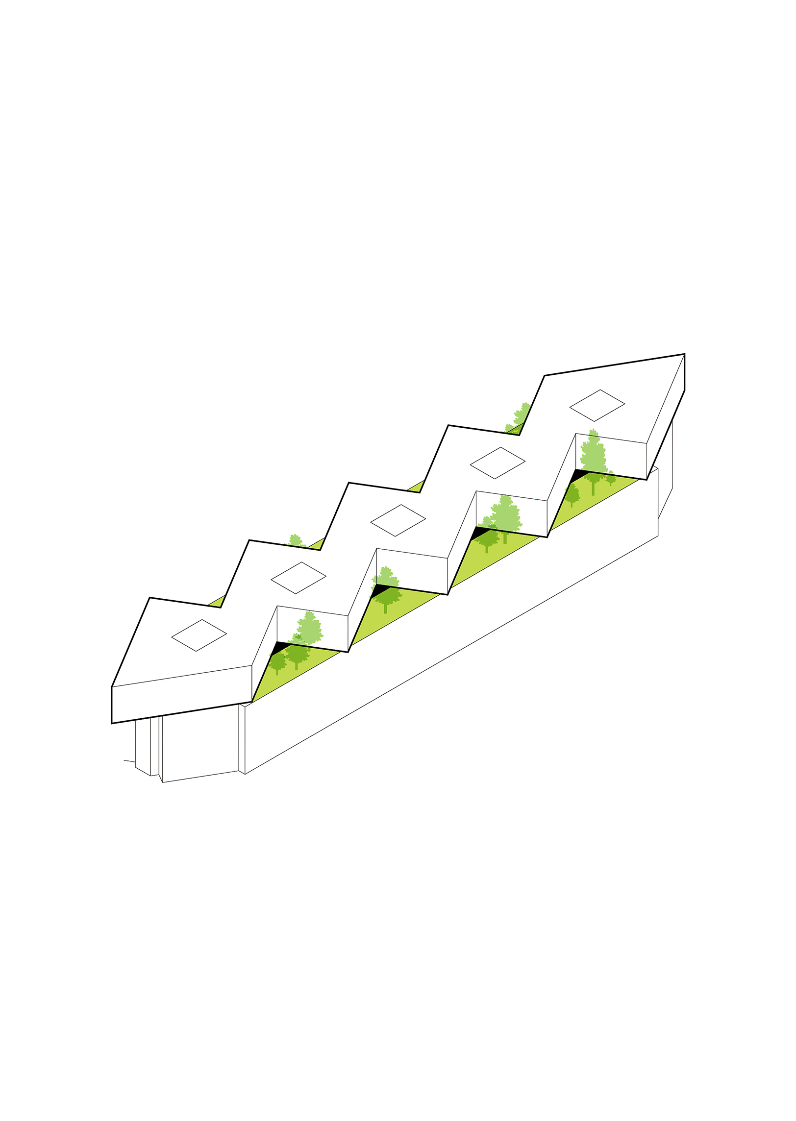 The roof construction of the building is a key element in the clinic’s contextual disguise. In places where the building is half rooted underground the green lawn slips over the roof, making the clinic a natural environment for the cure of mental illness.