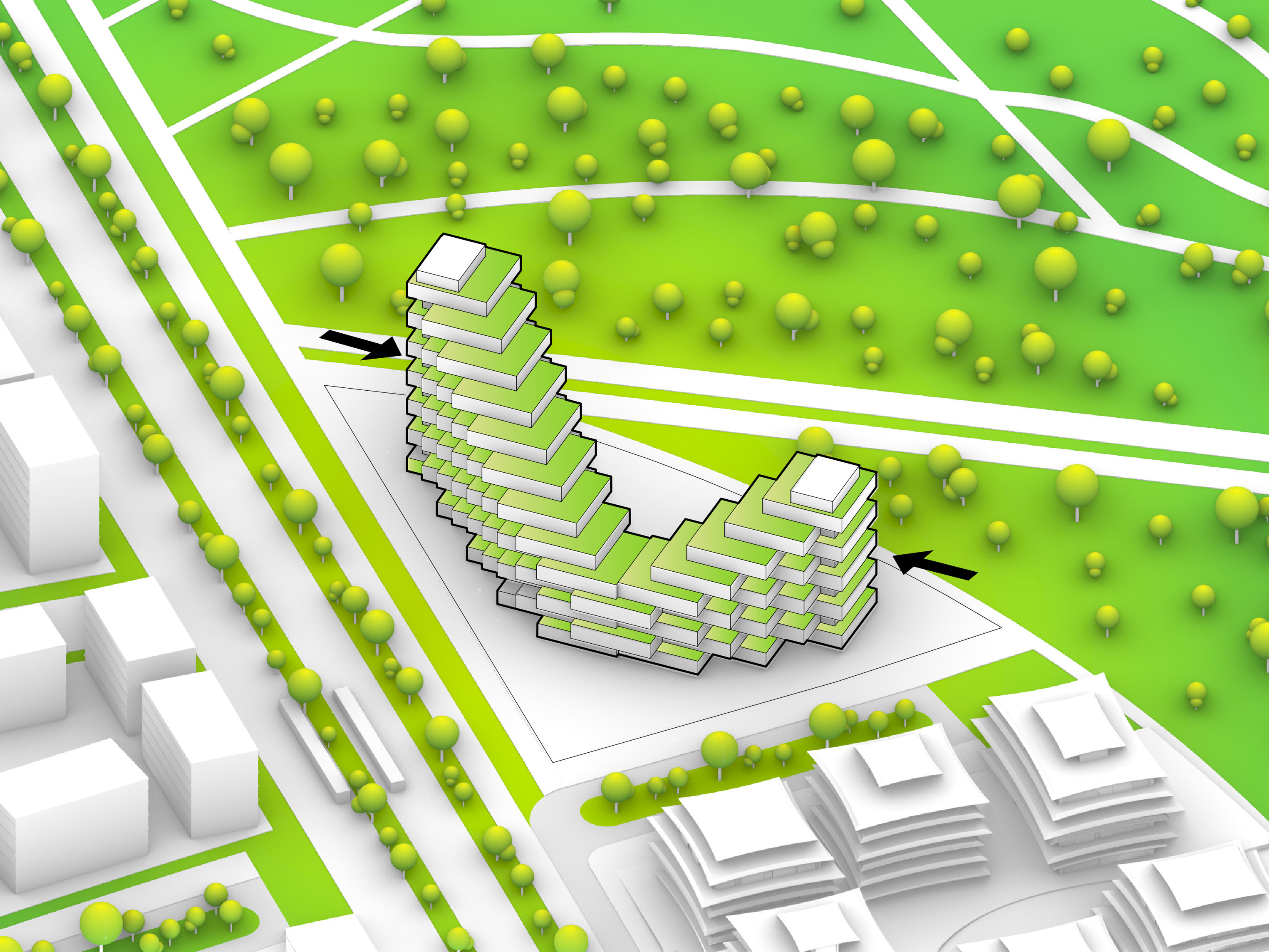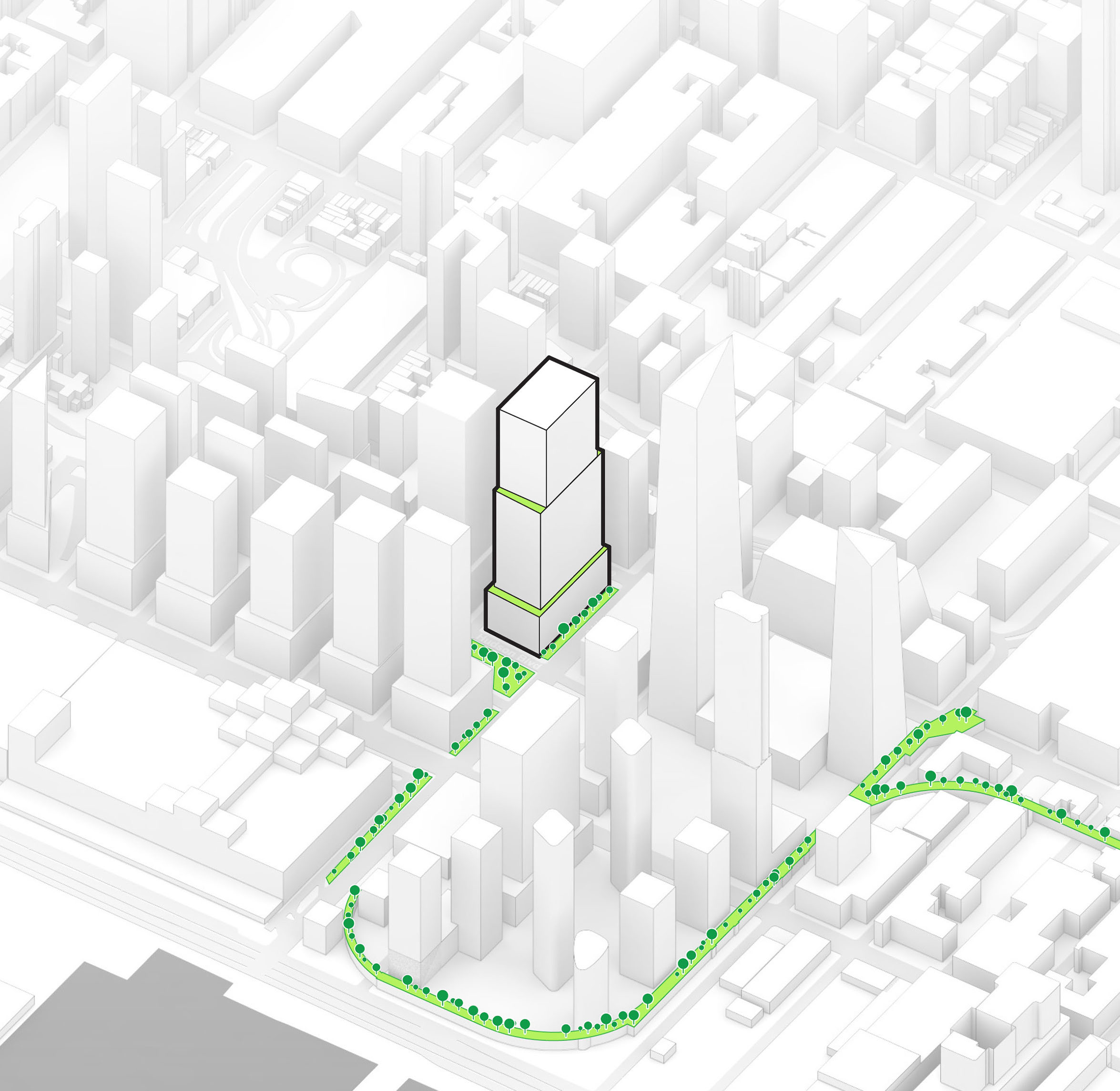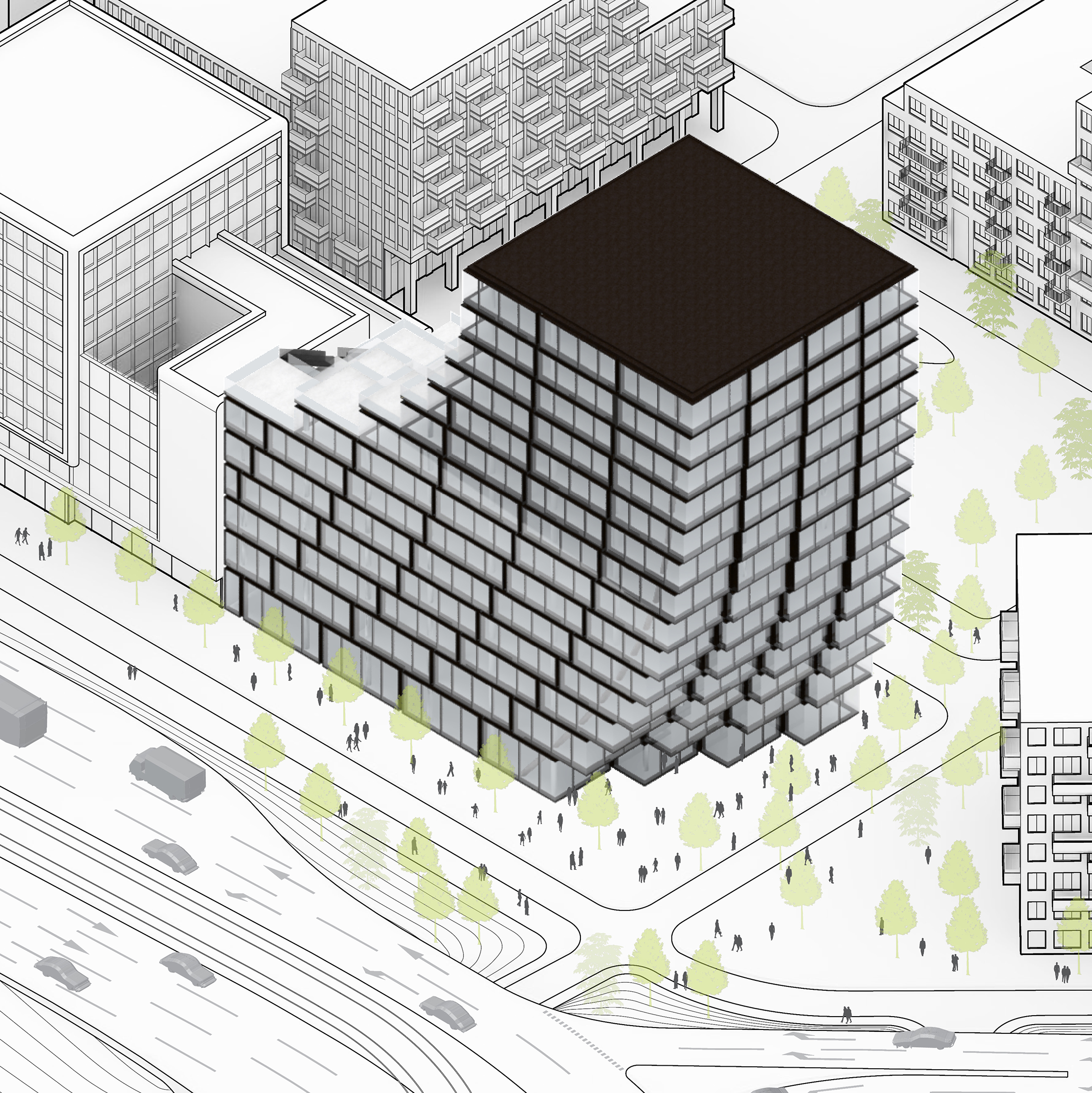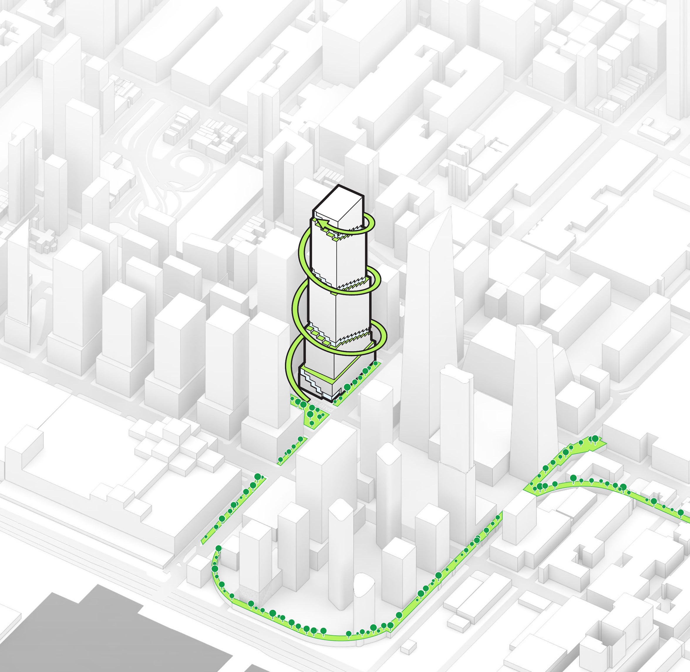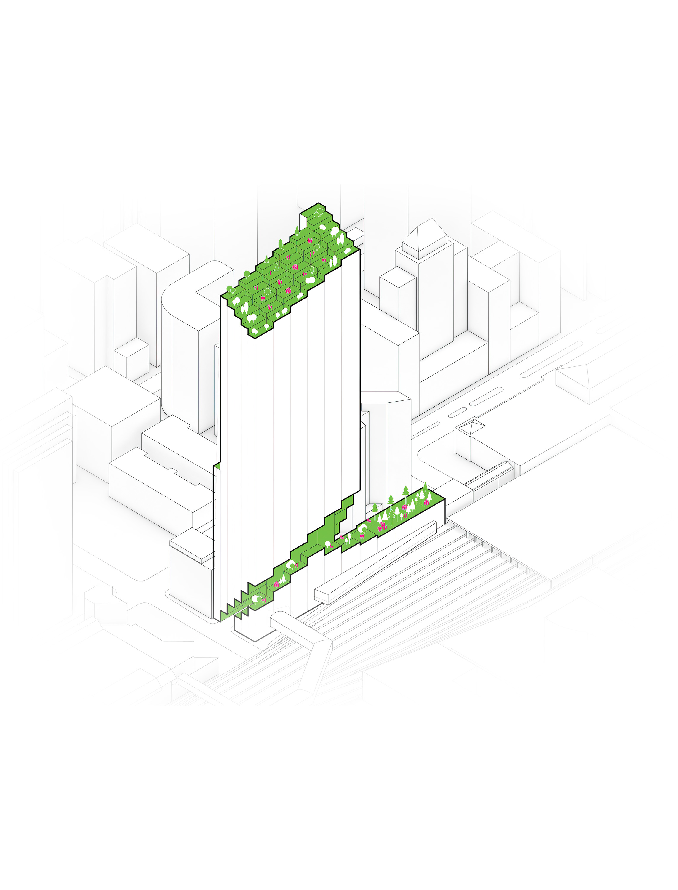At its base, a pedestrian through-block connection forms a new gateway to the park and subway station. Throughout its height, soft openings are carved into the building mass to create eight distinct blocks. These ‘buildings within a building’ are connected by large, communal green terraces at different elevations.