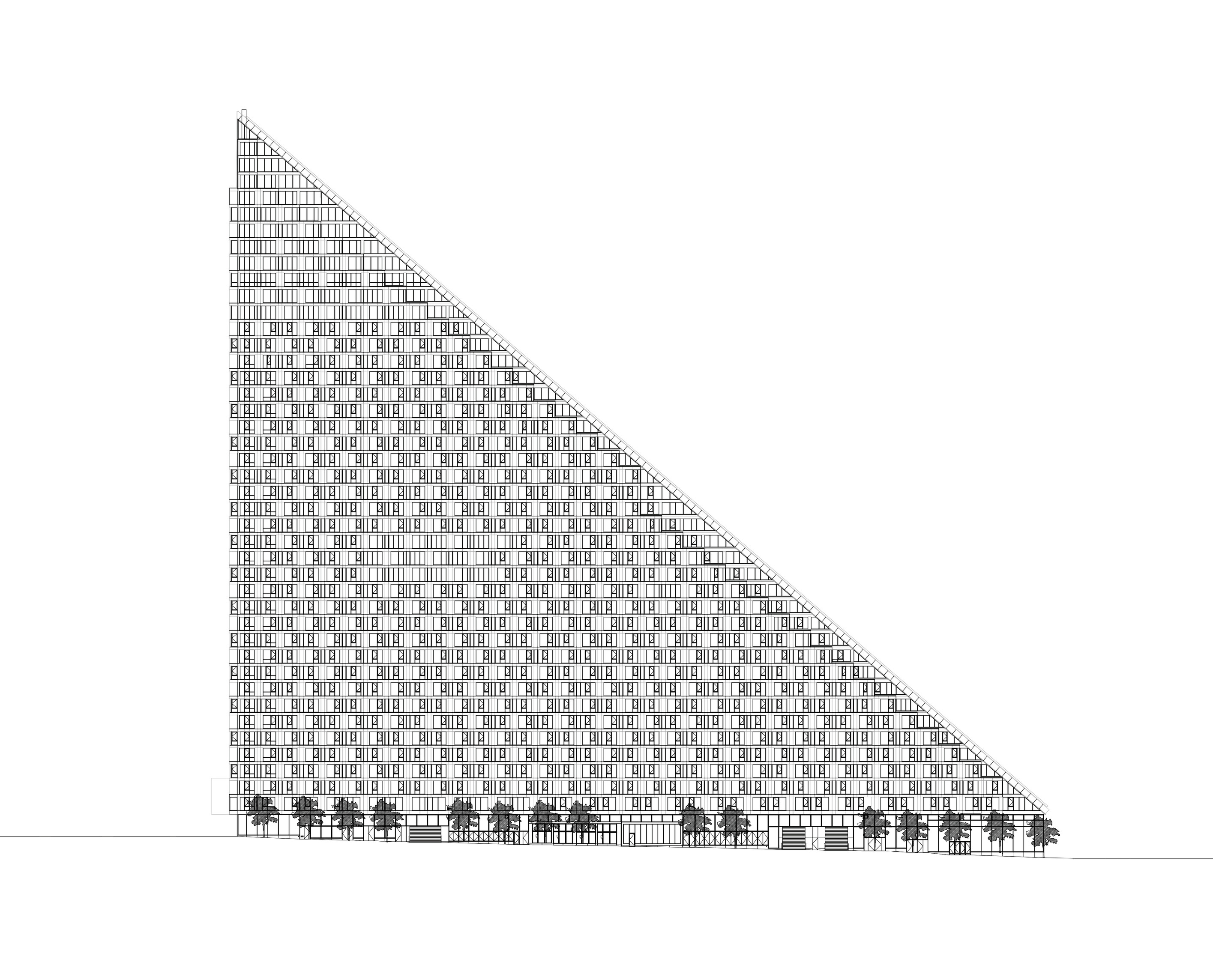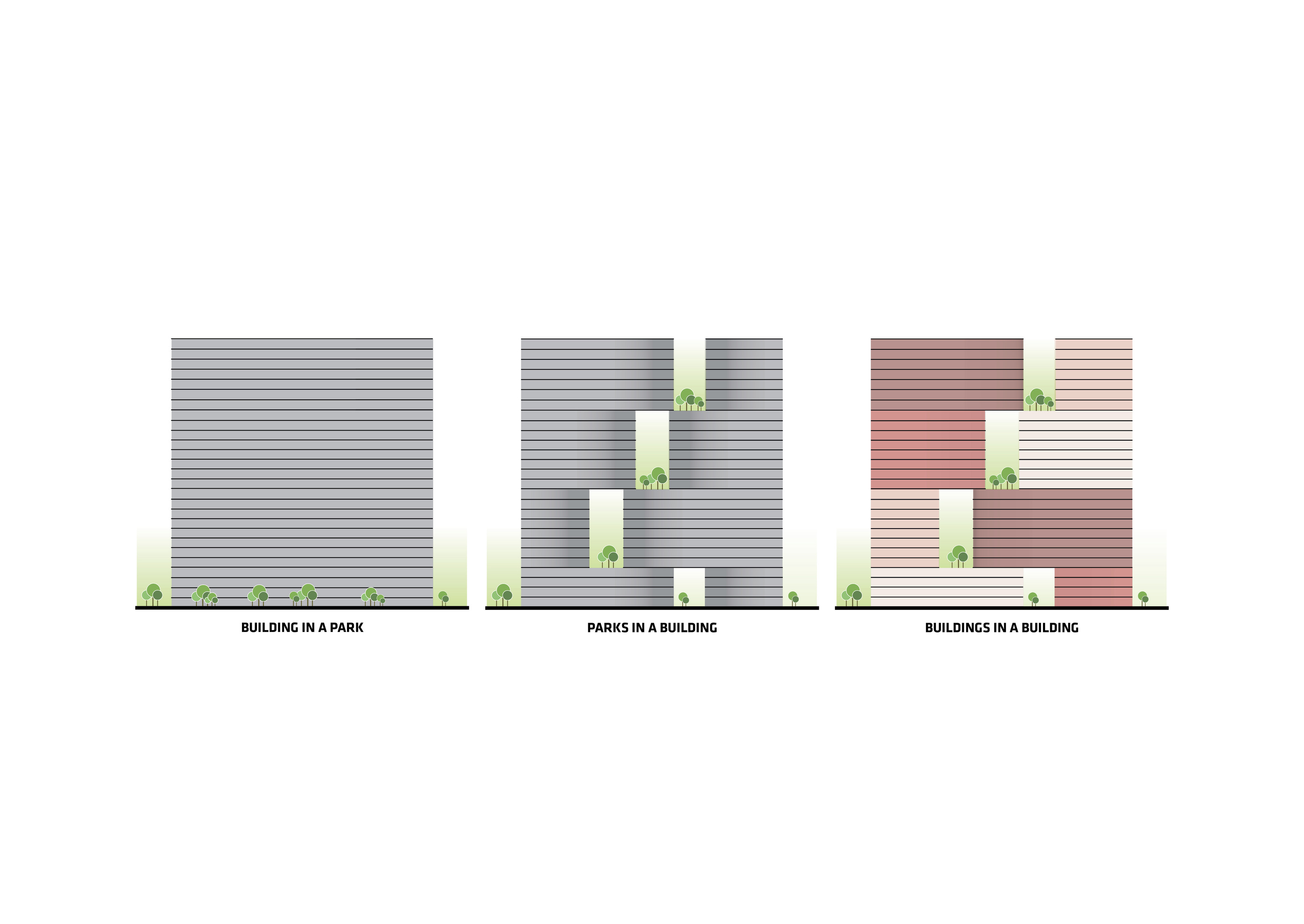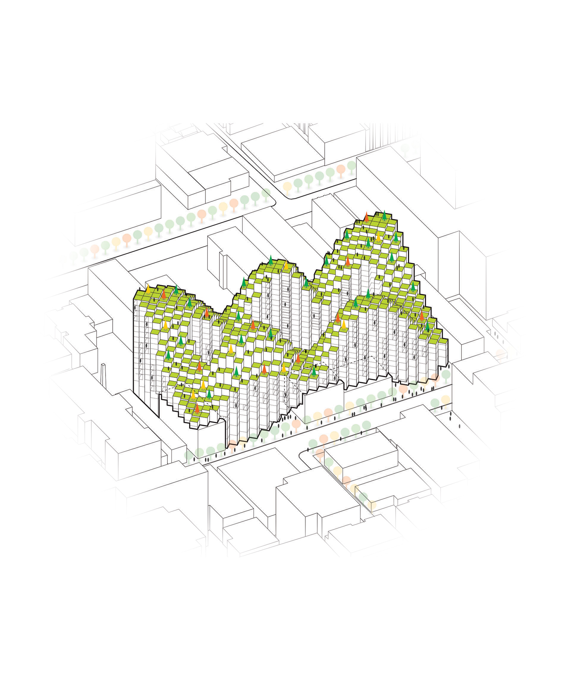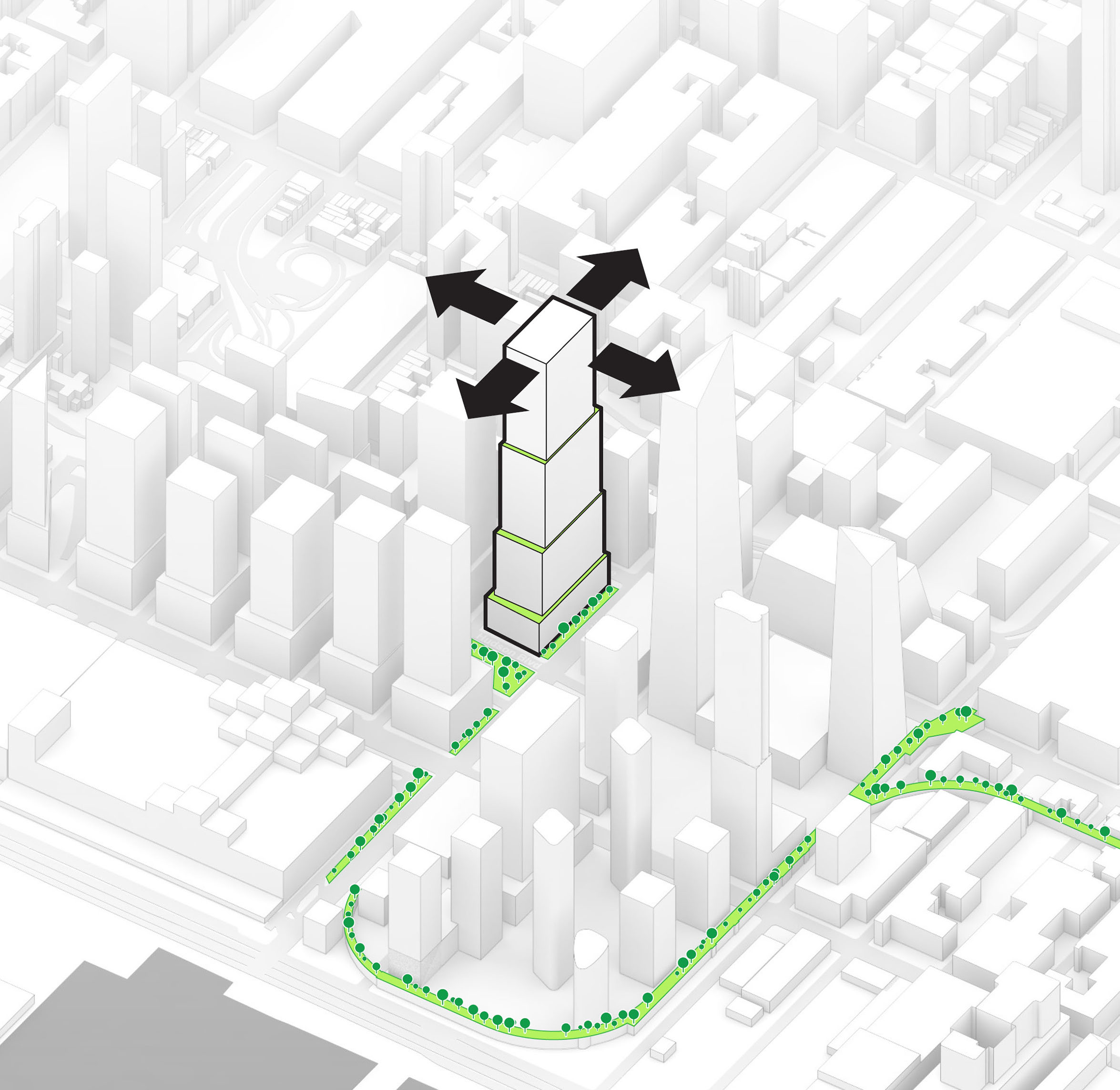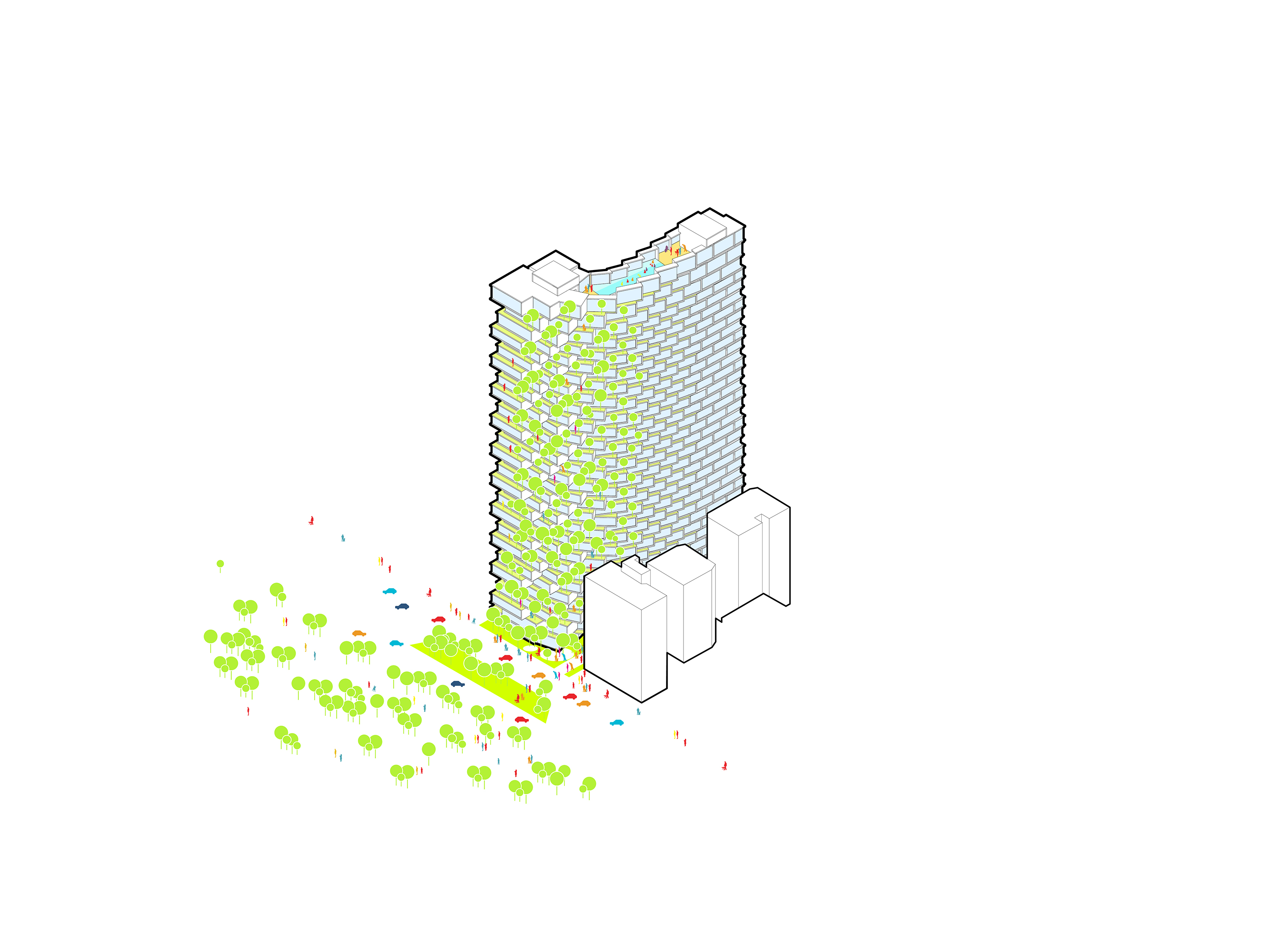 At its base, a pedestrian through-block connection forms a new gateway to the park and subway station. Throughout its height, soft openings are carved into the building mass to create eight distinct blocks. These ‘buildings within a building’ are connected by large, communal green terraces at different elevations.
