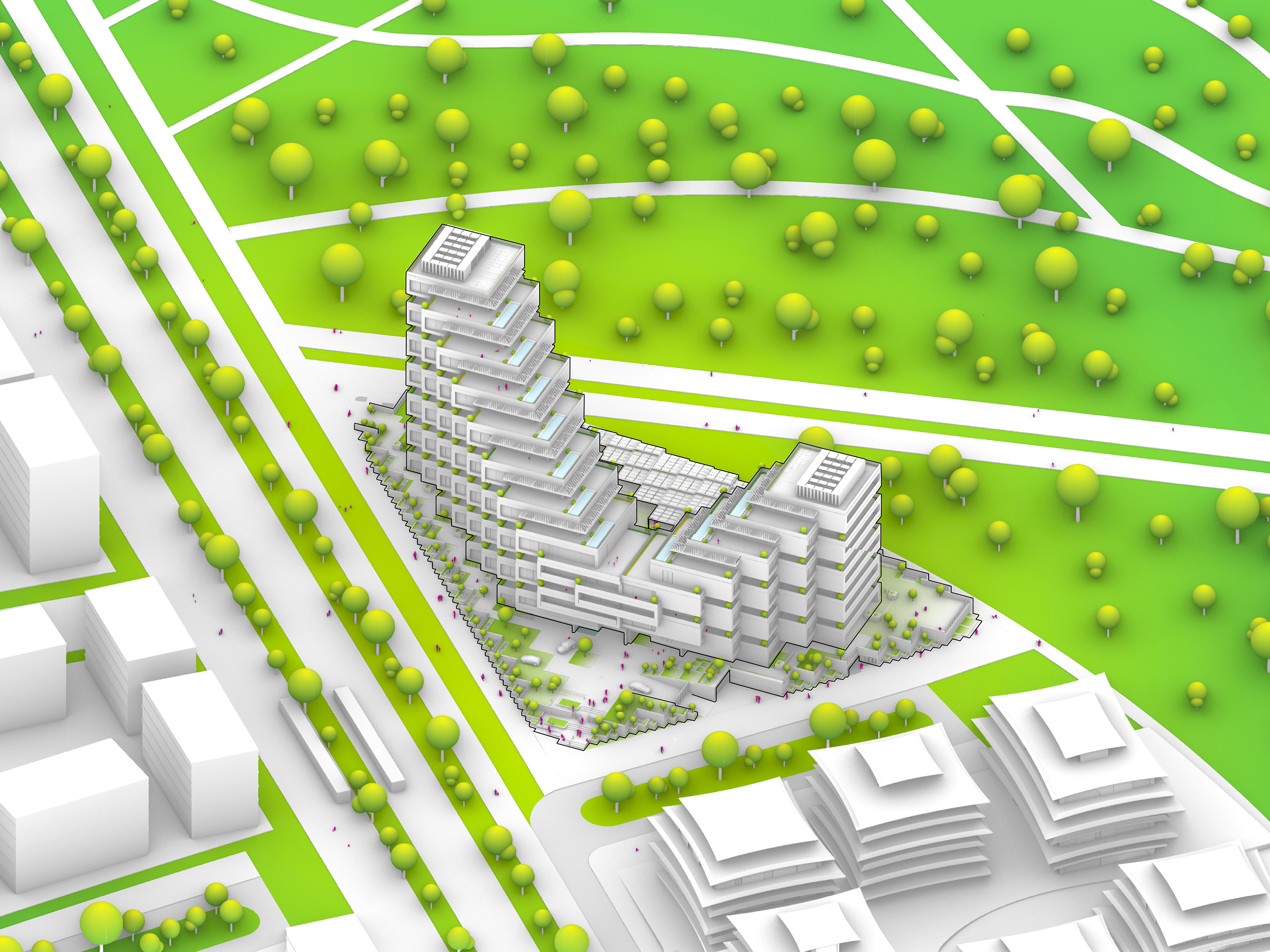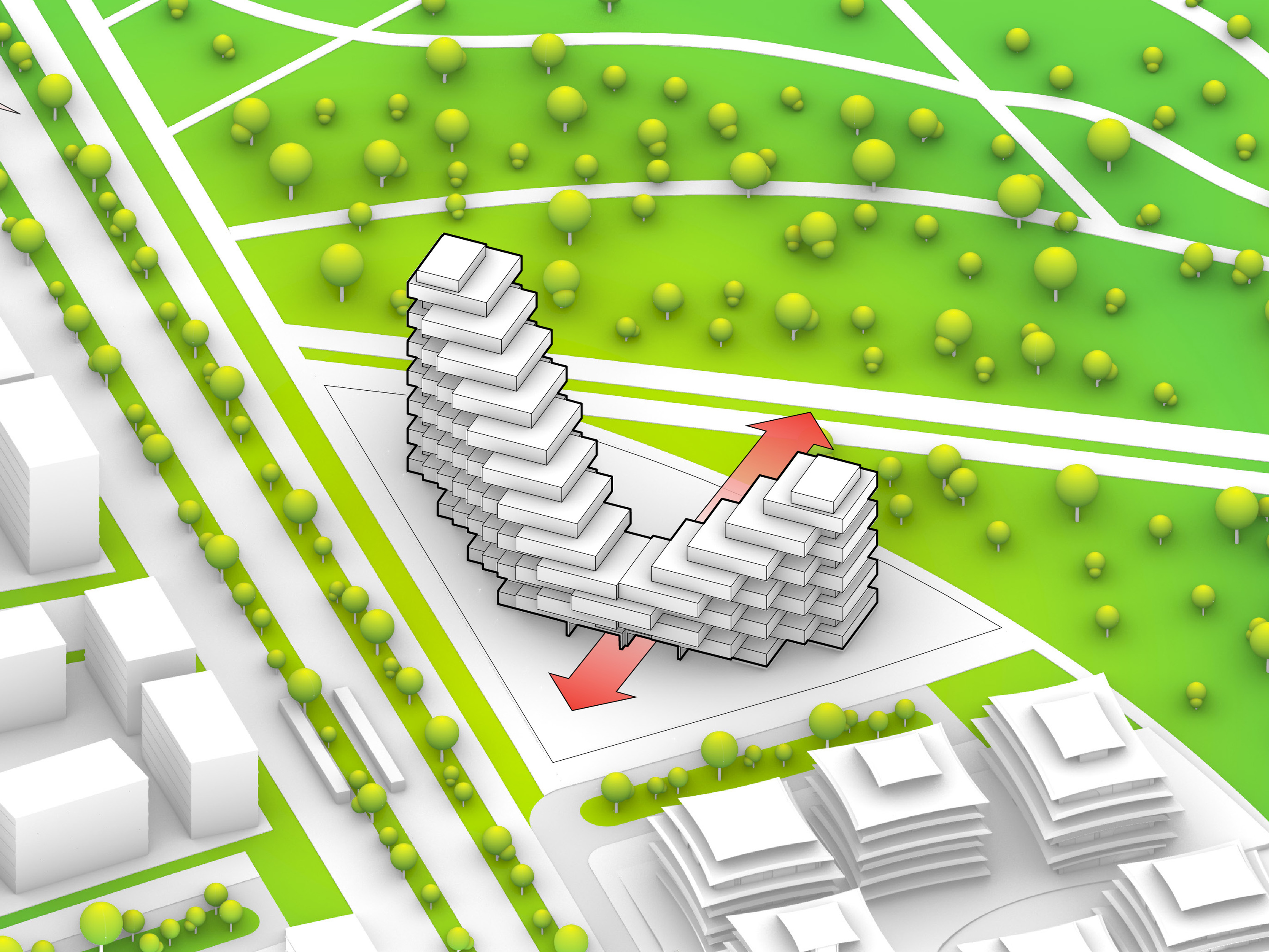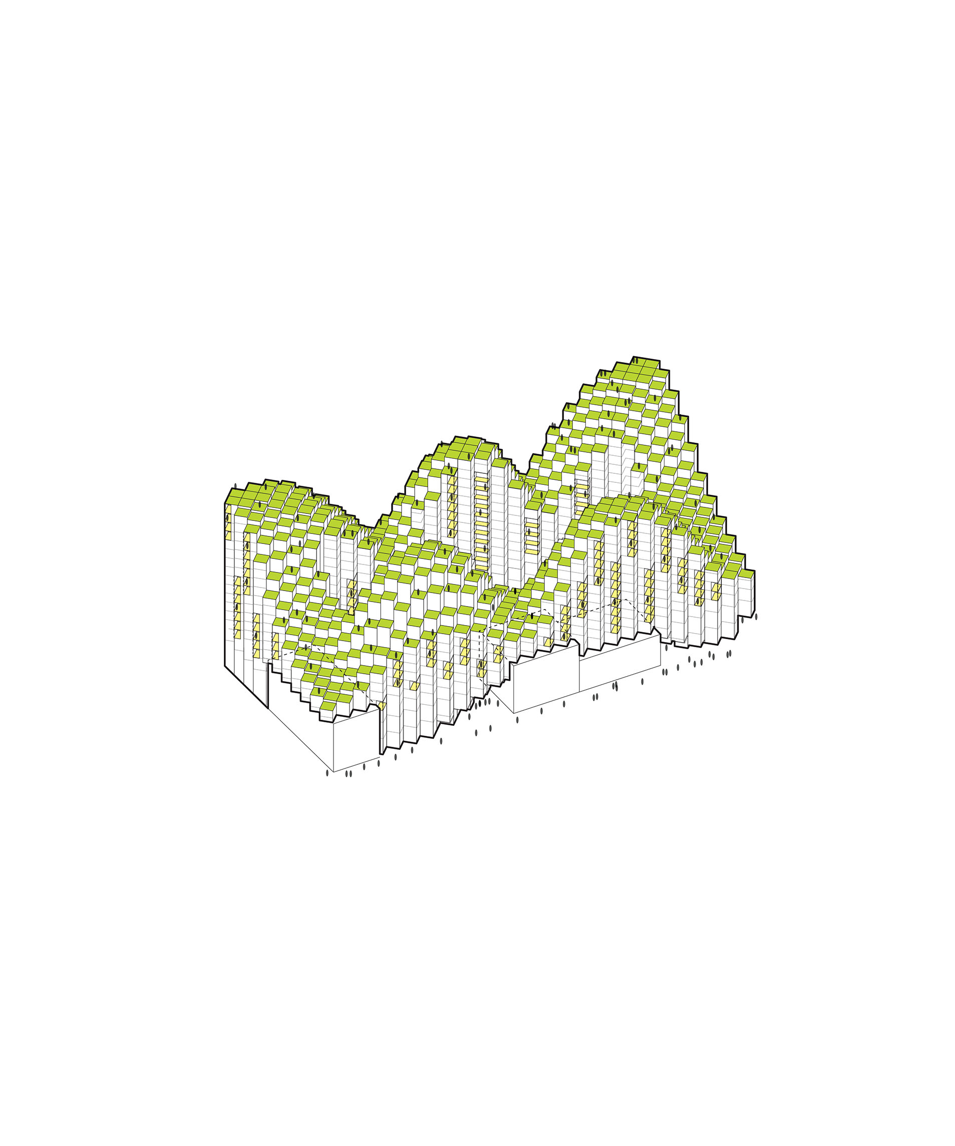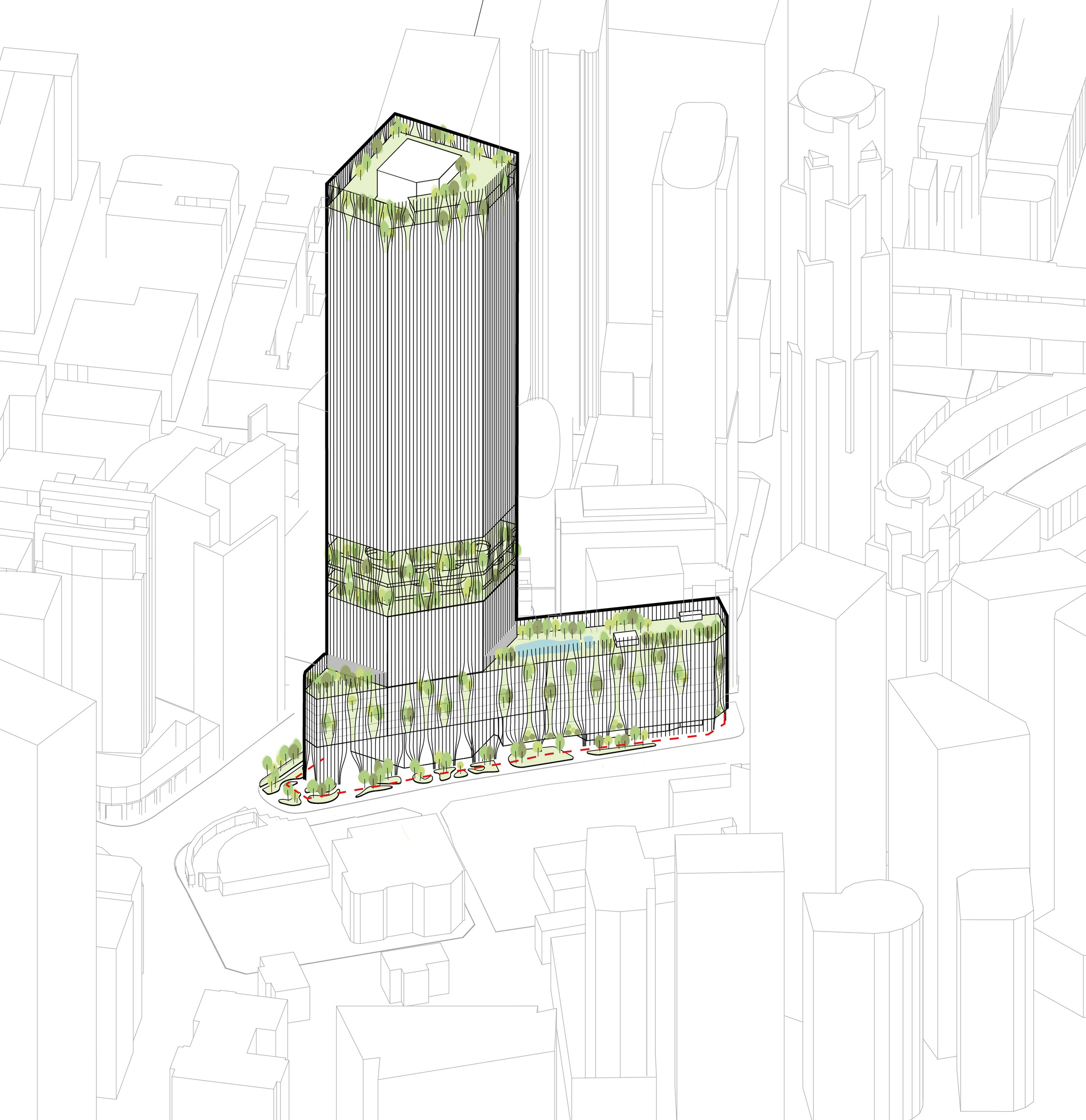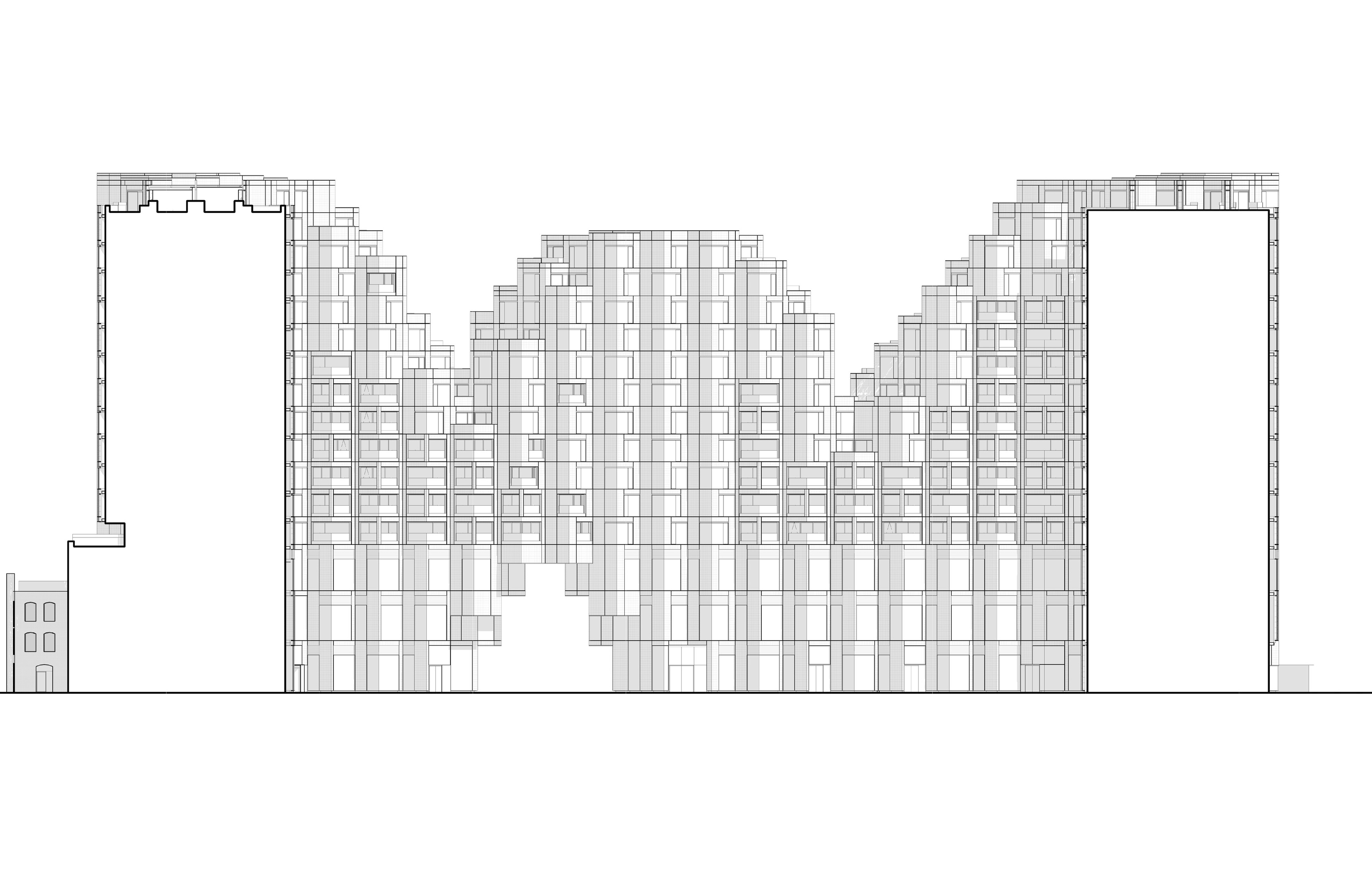 At its base, a pedestrian through-block connection forms a new gateway to the park and subway station. Throughout its height, soft openings are carved into the building mass to create eight distinct blocks. These ‘buildings within a building’ are connected by large, communal green terraces at different elevations.