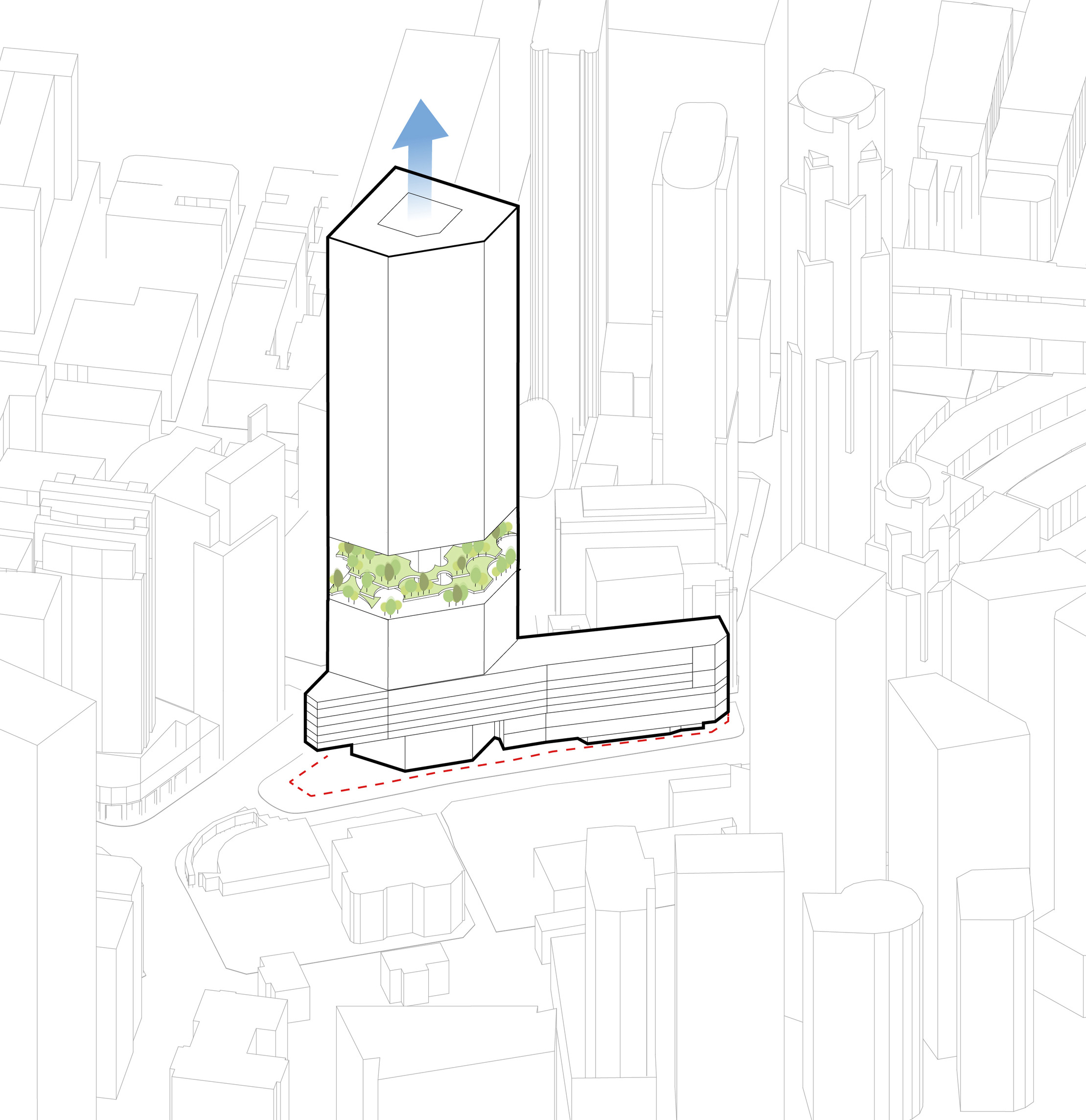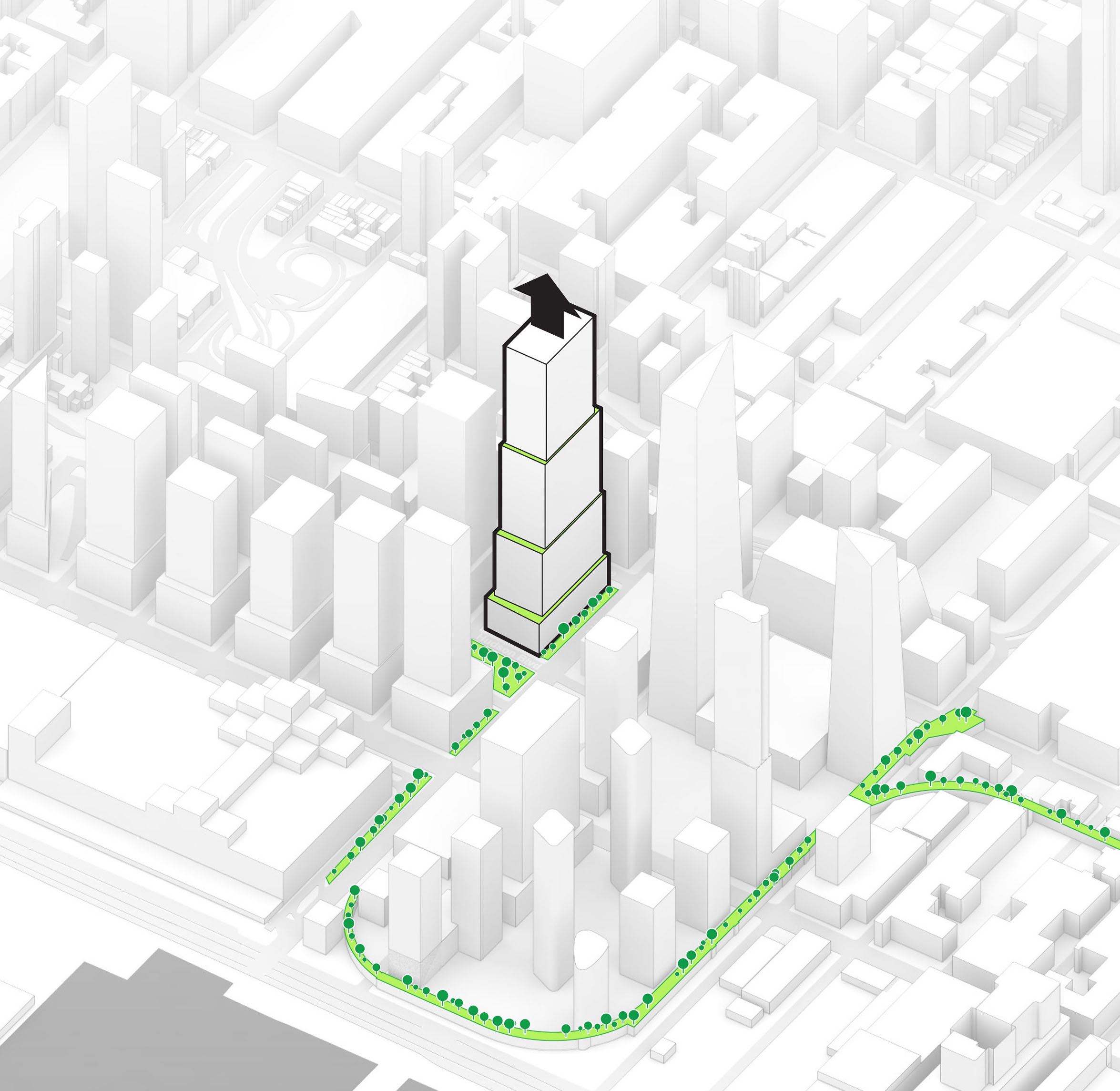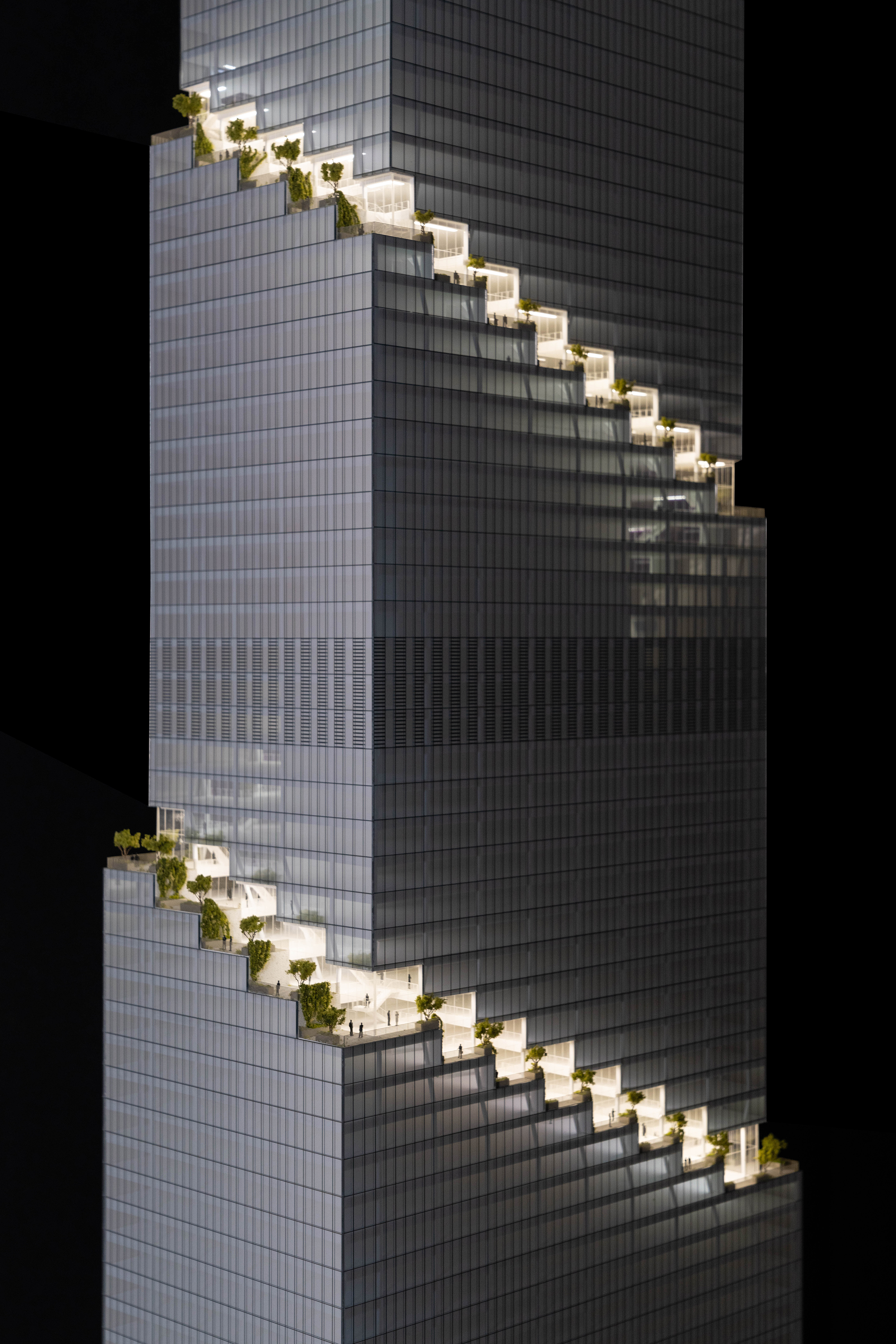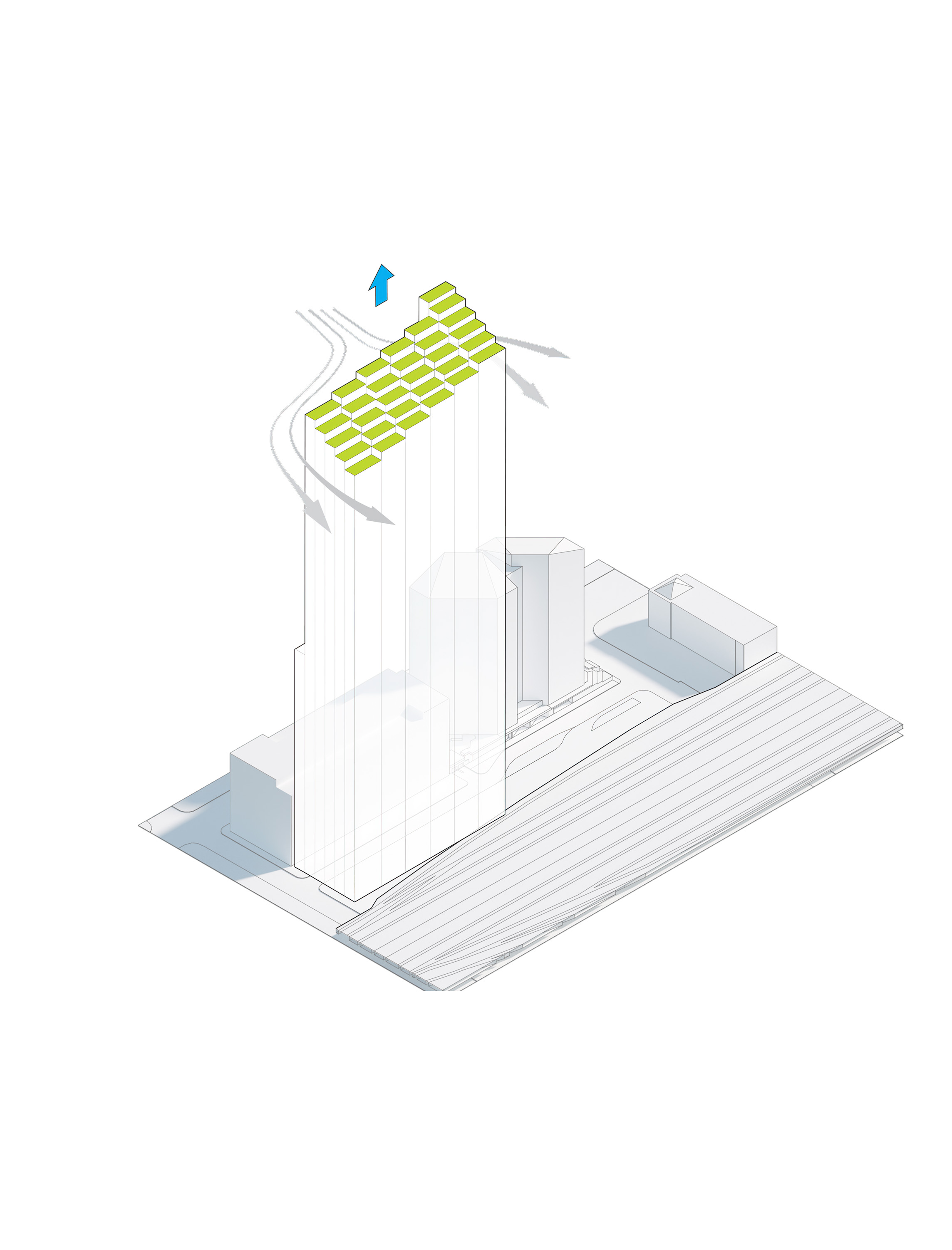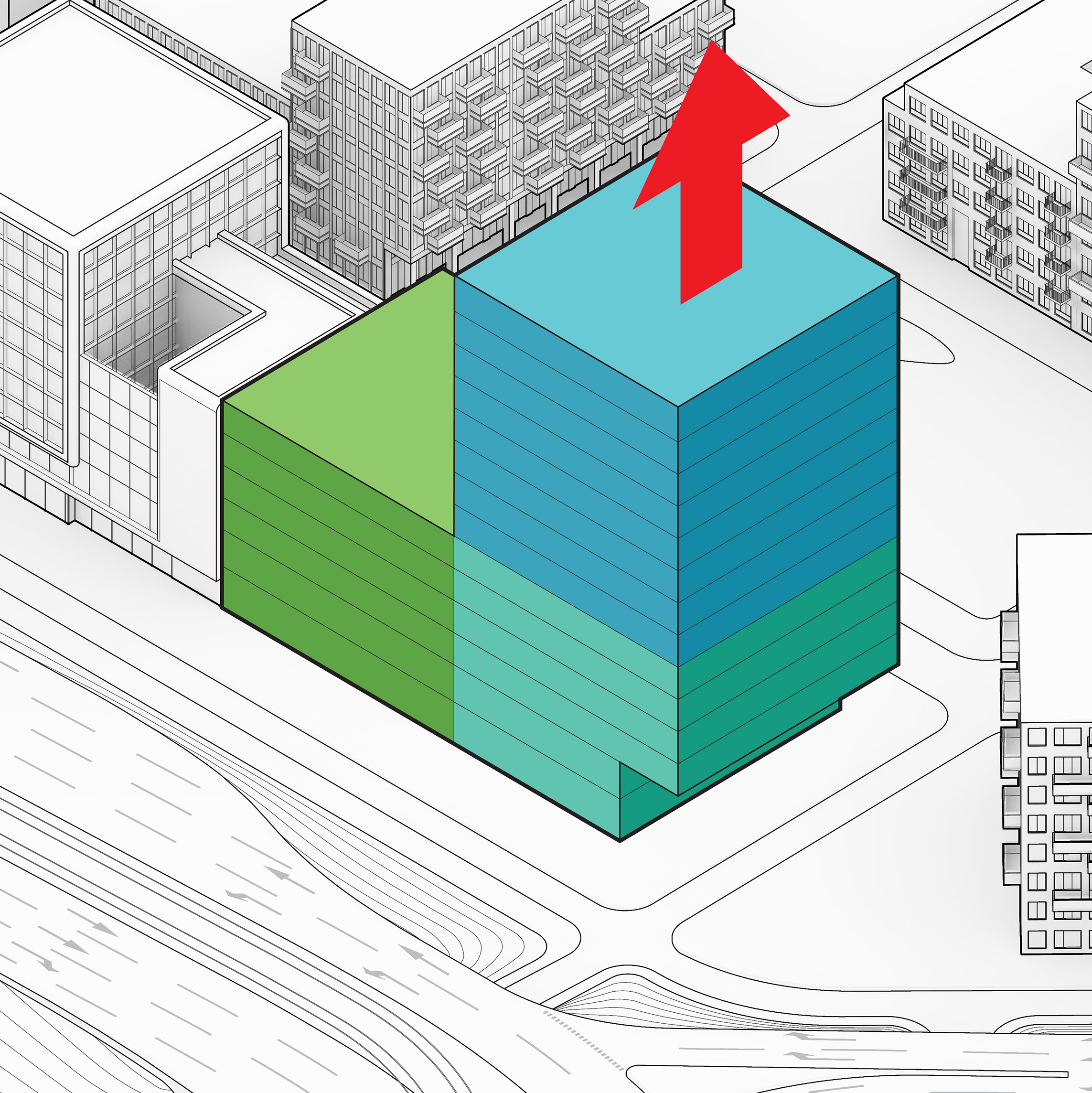 At its base, a pedestrian through-block connection forms a new gateway to the park and subway station. Throughout its height, soft openings are carved into the building mass to create eight distinct blocks. These ‘buildings within a building’ are connected by large, communal green terraces at different elevations.