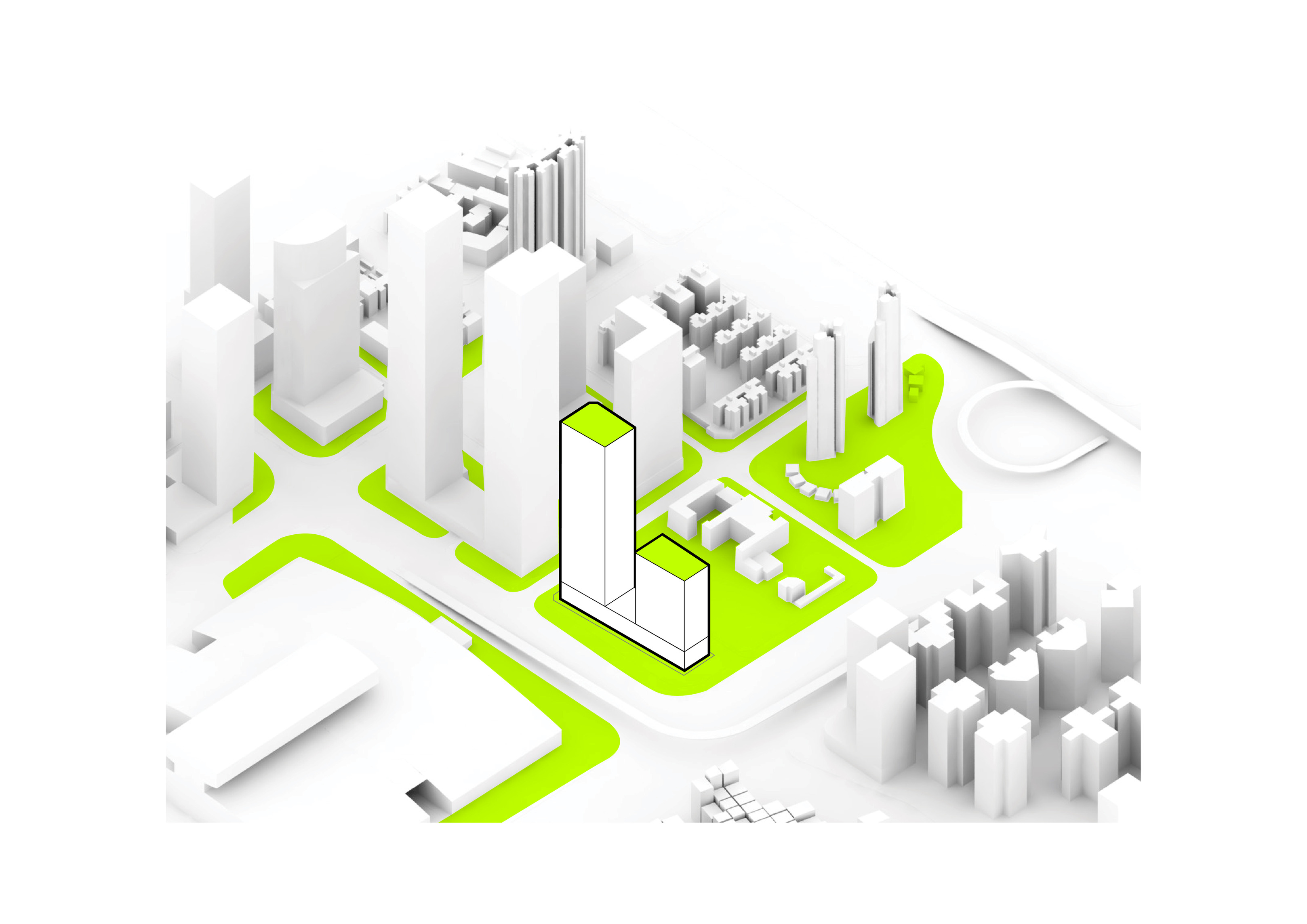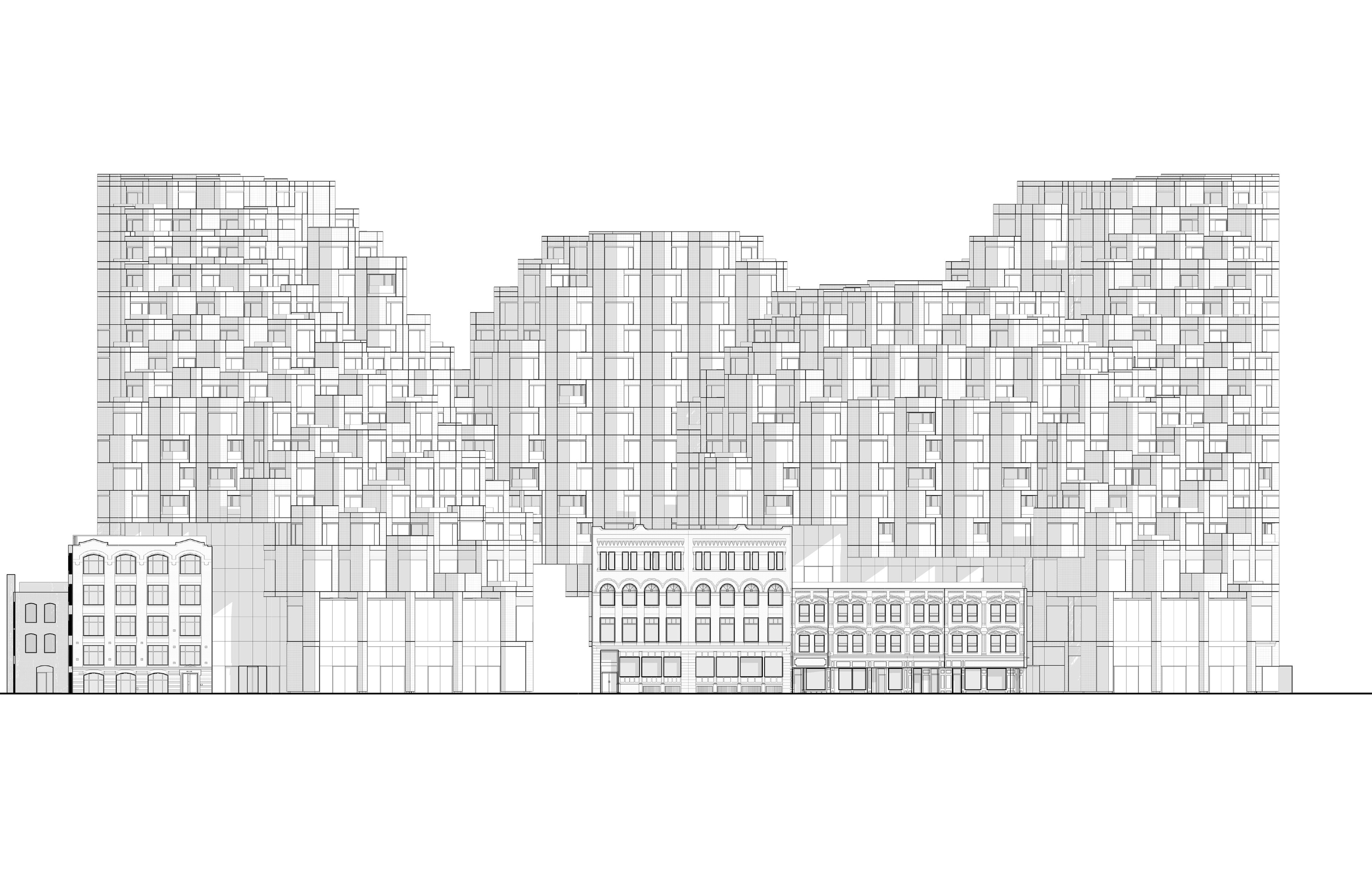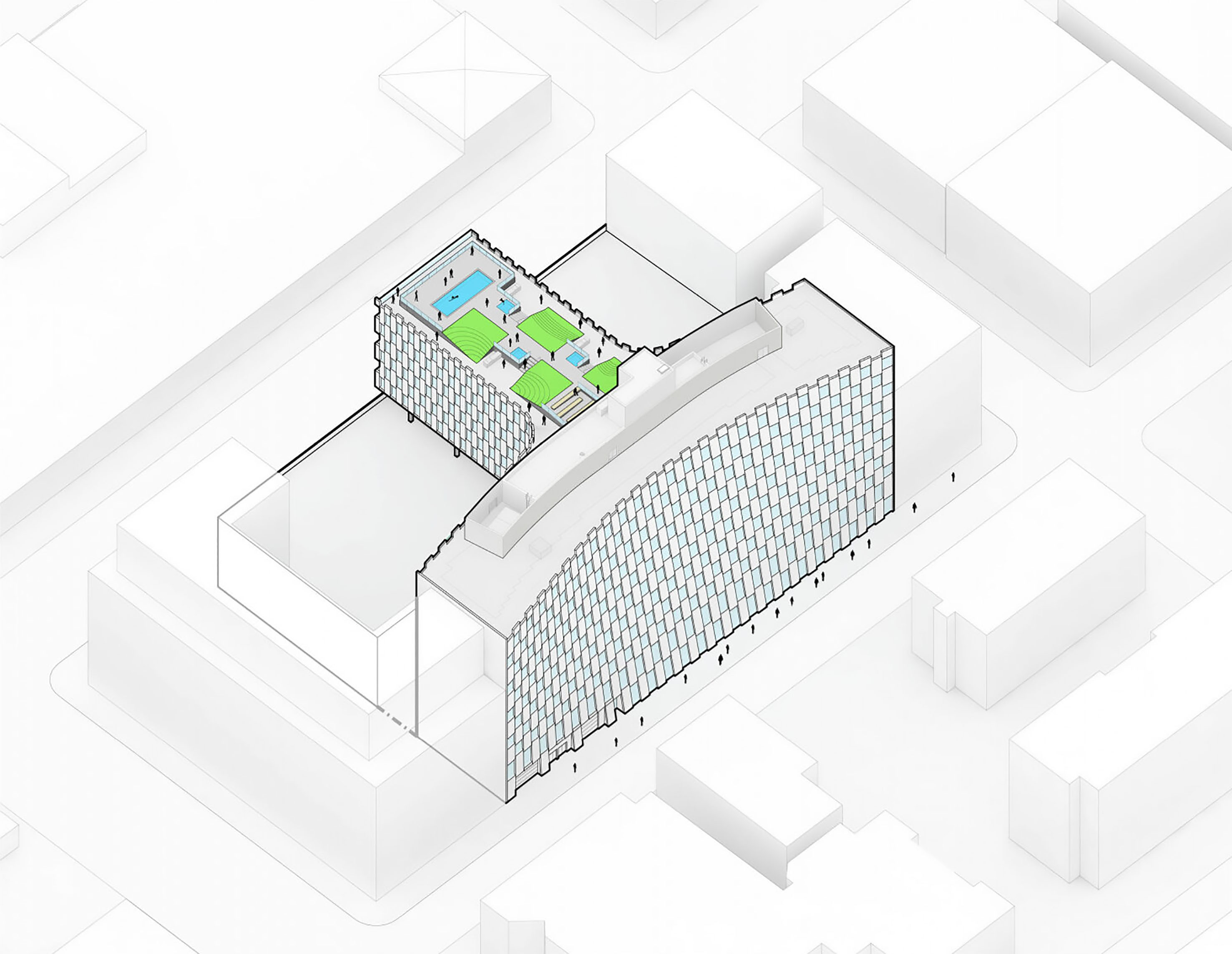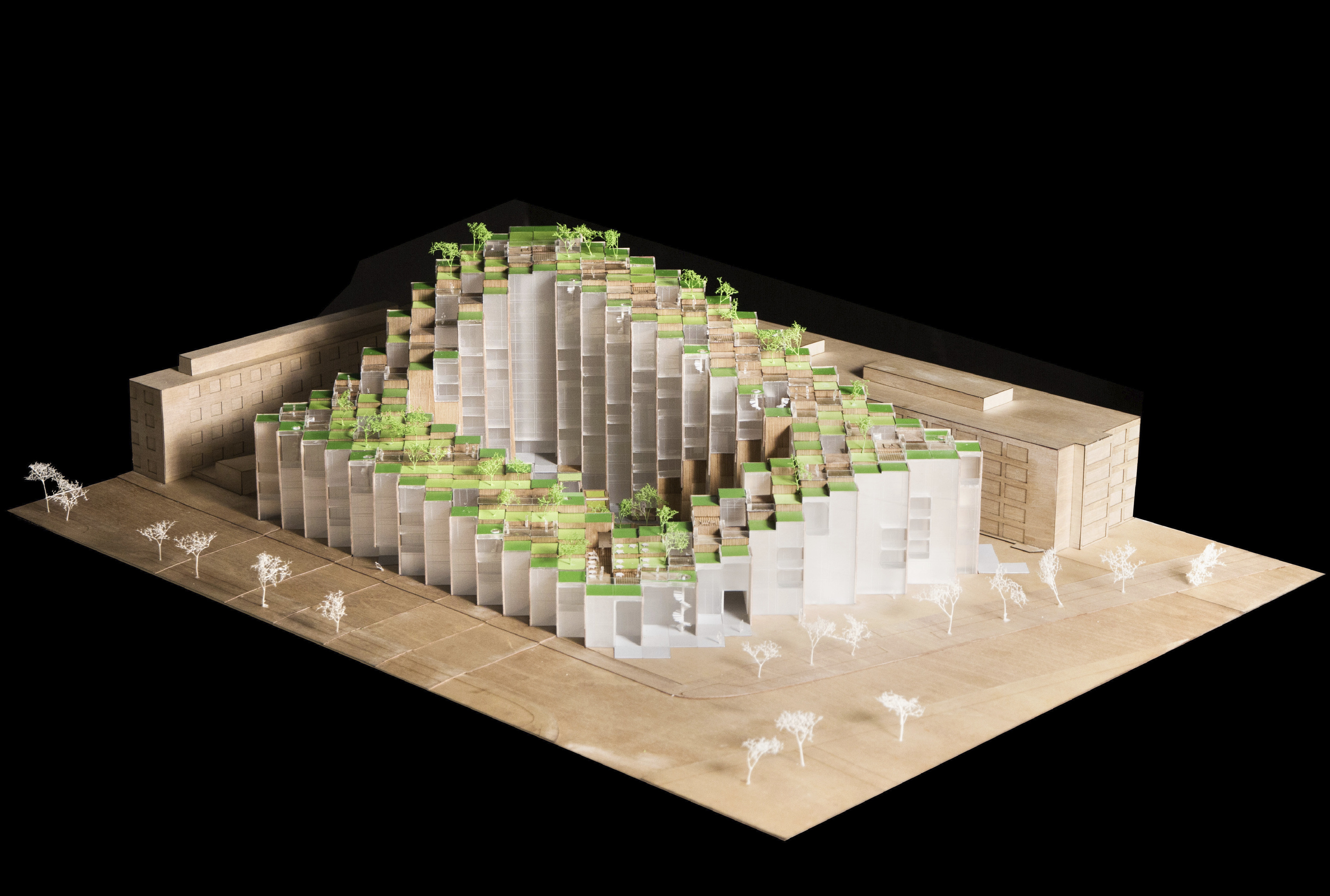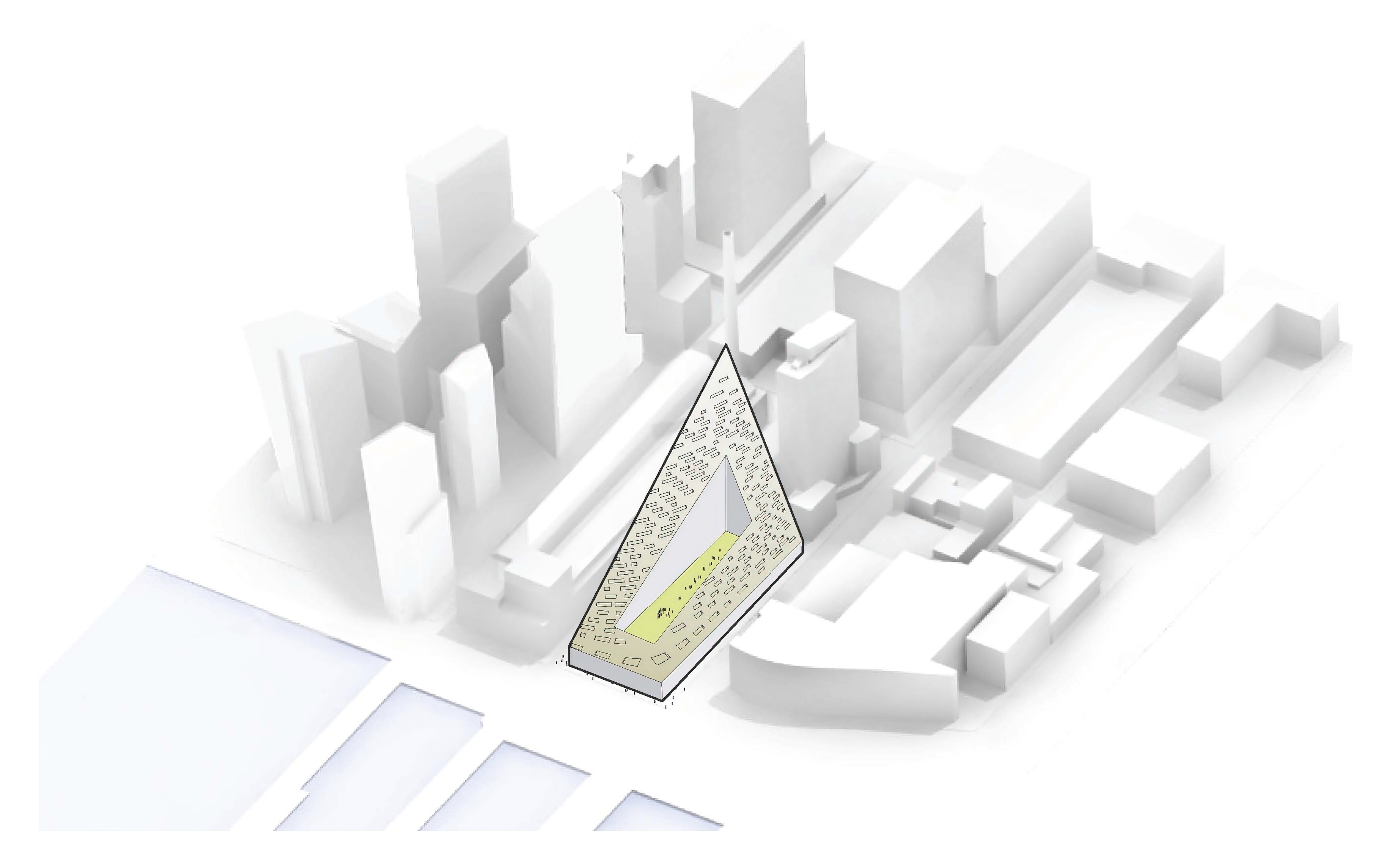 At its base, a pedestrian through-block connection forms a new gateway to the park and subway station. Throughout its height, soft openings are carved into the building mass to create eight distinct blocks. These ‘buildings within a building’ are connected by large, communal green terraces at different elevations.