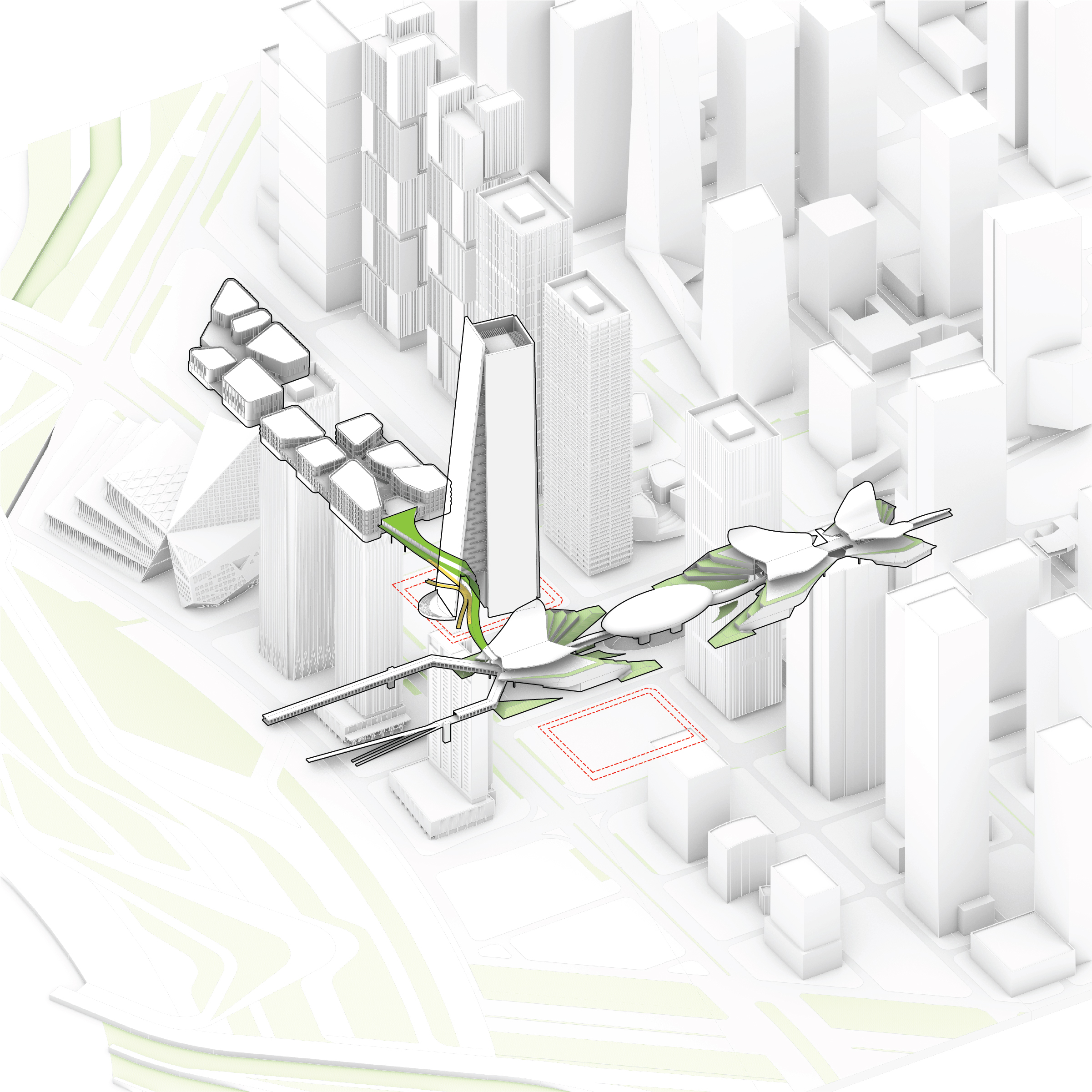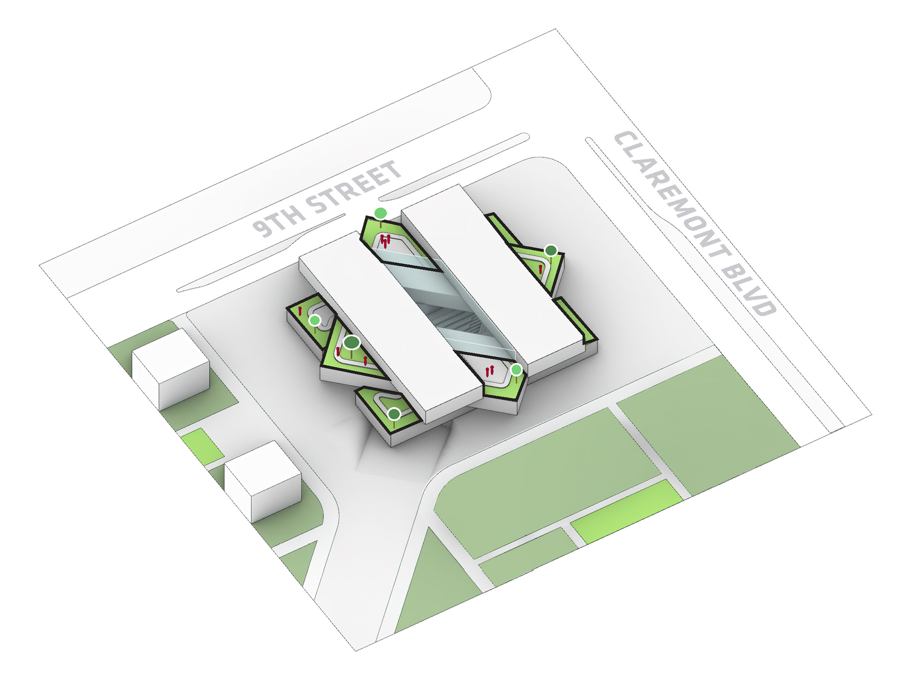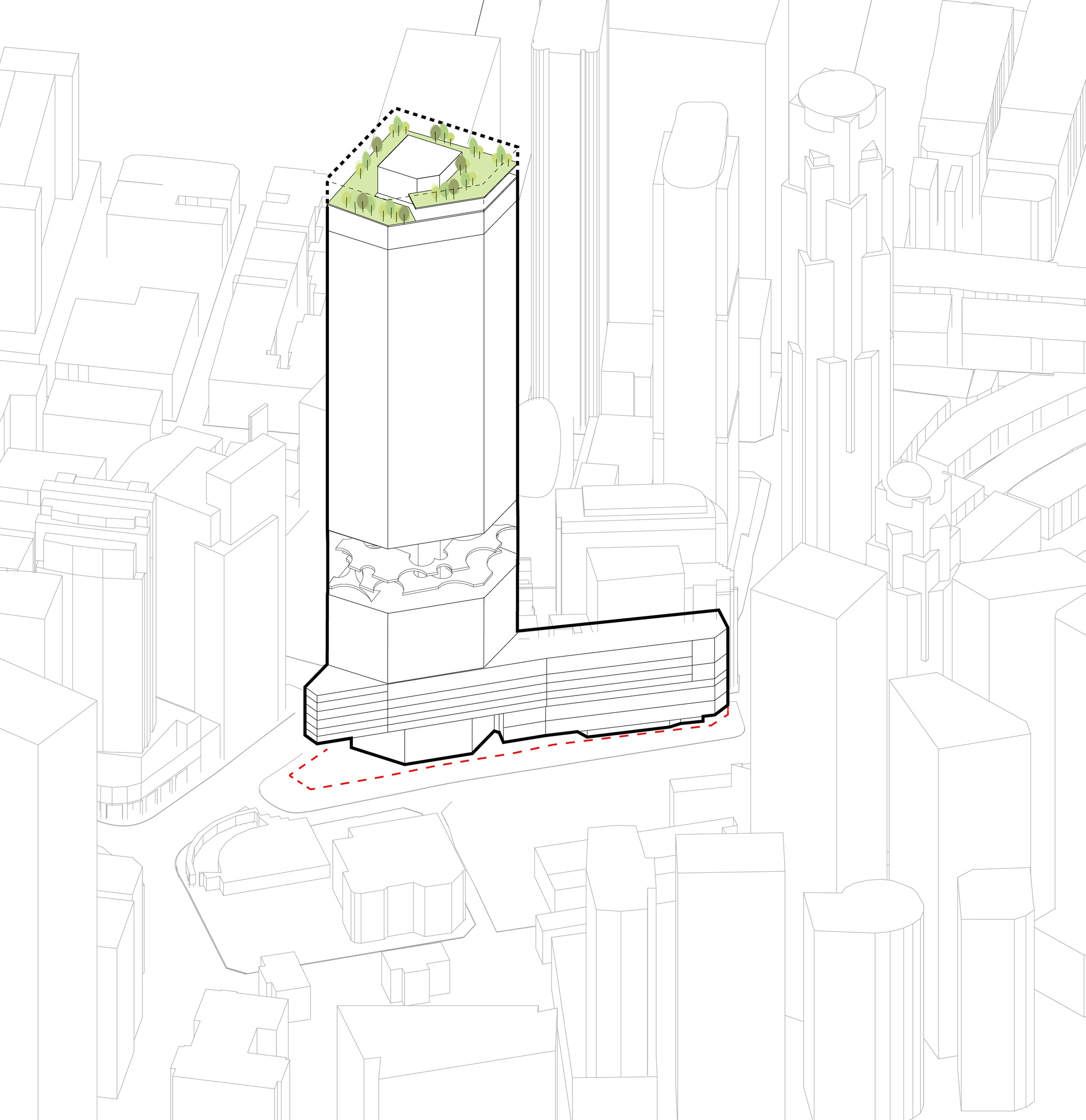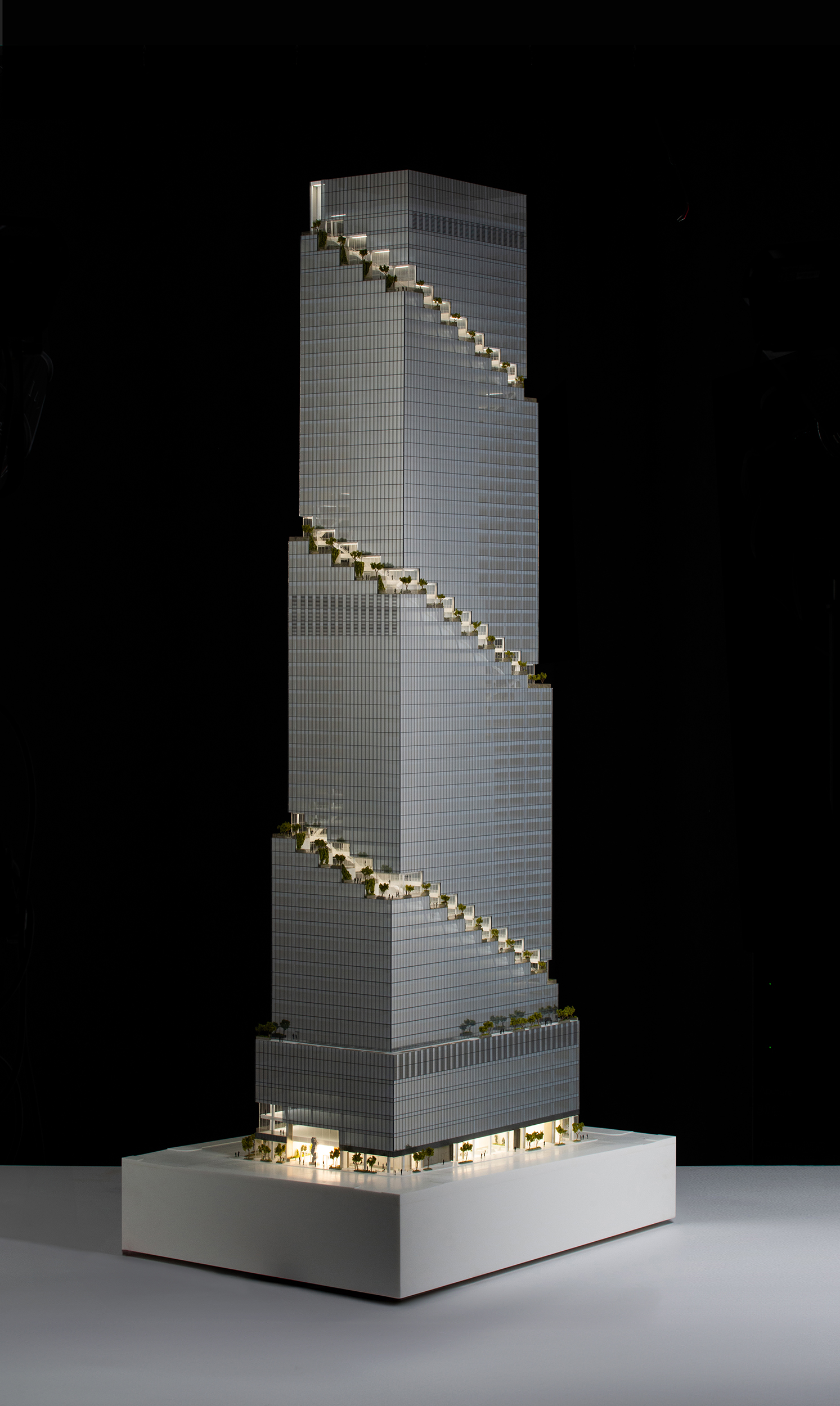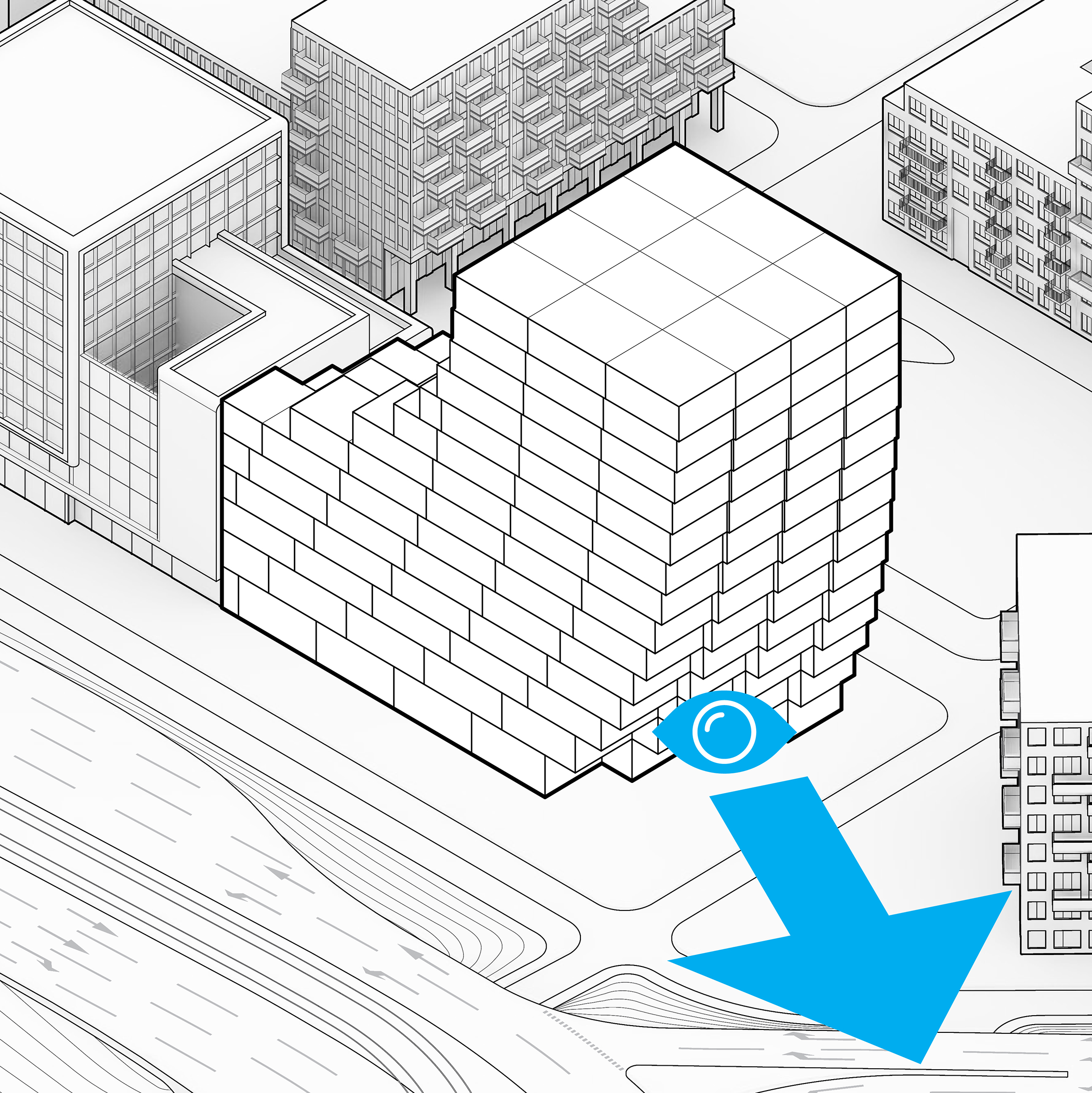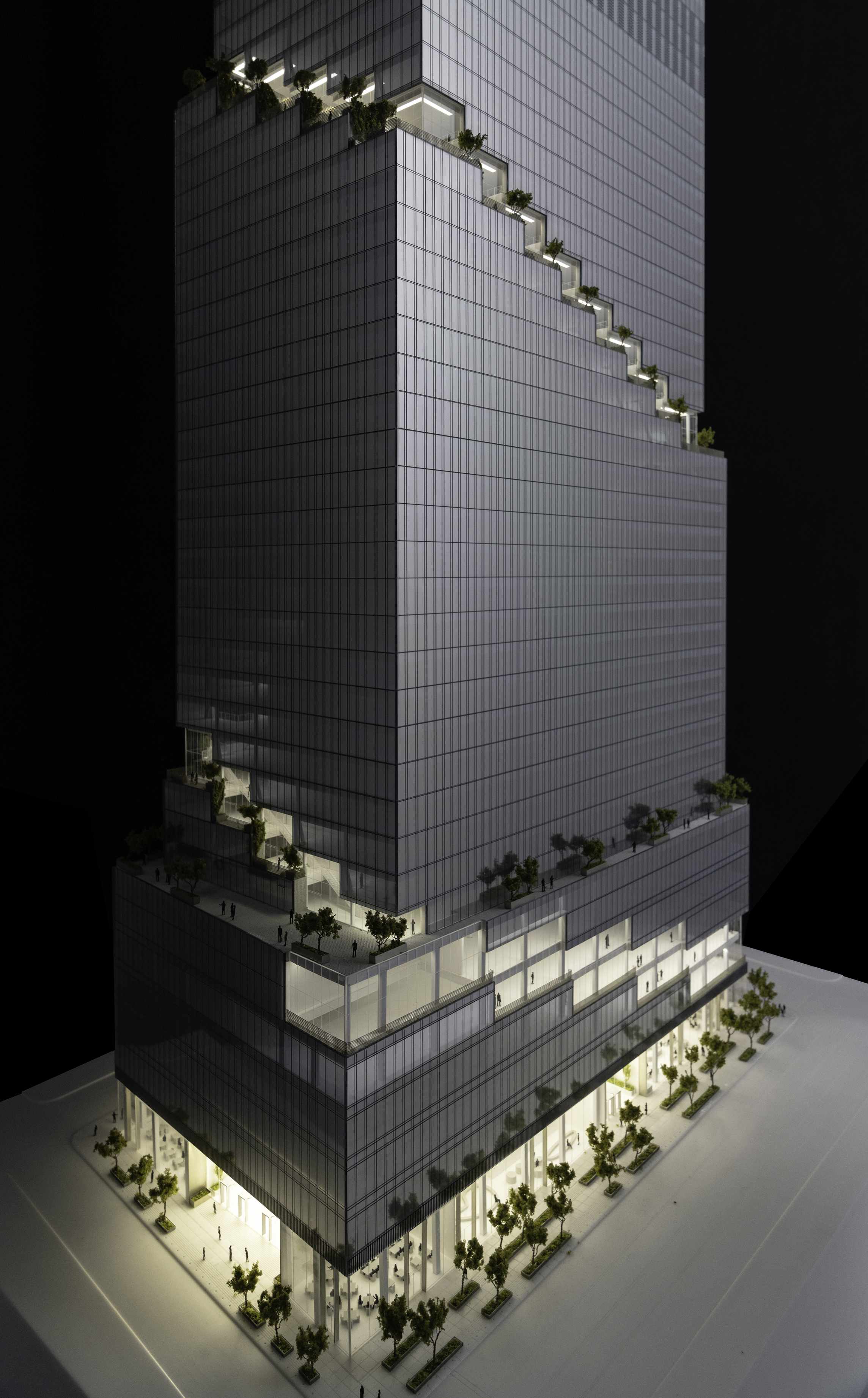 At its base, a pedestrian through-block connection forms a new gateway to the park and subway station. Throughout its height, soft openings are carved into the building mass to create eight distinct blocks. These ‘buildings within a building’ are connected by large, communal green terraces at different elevations.