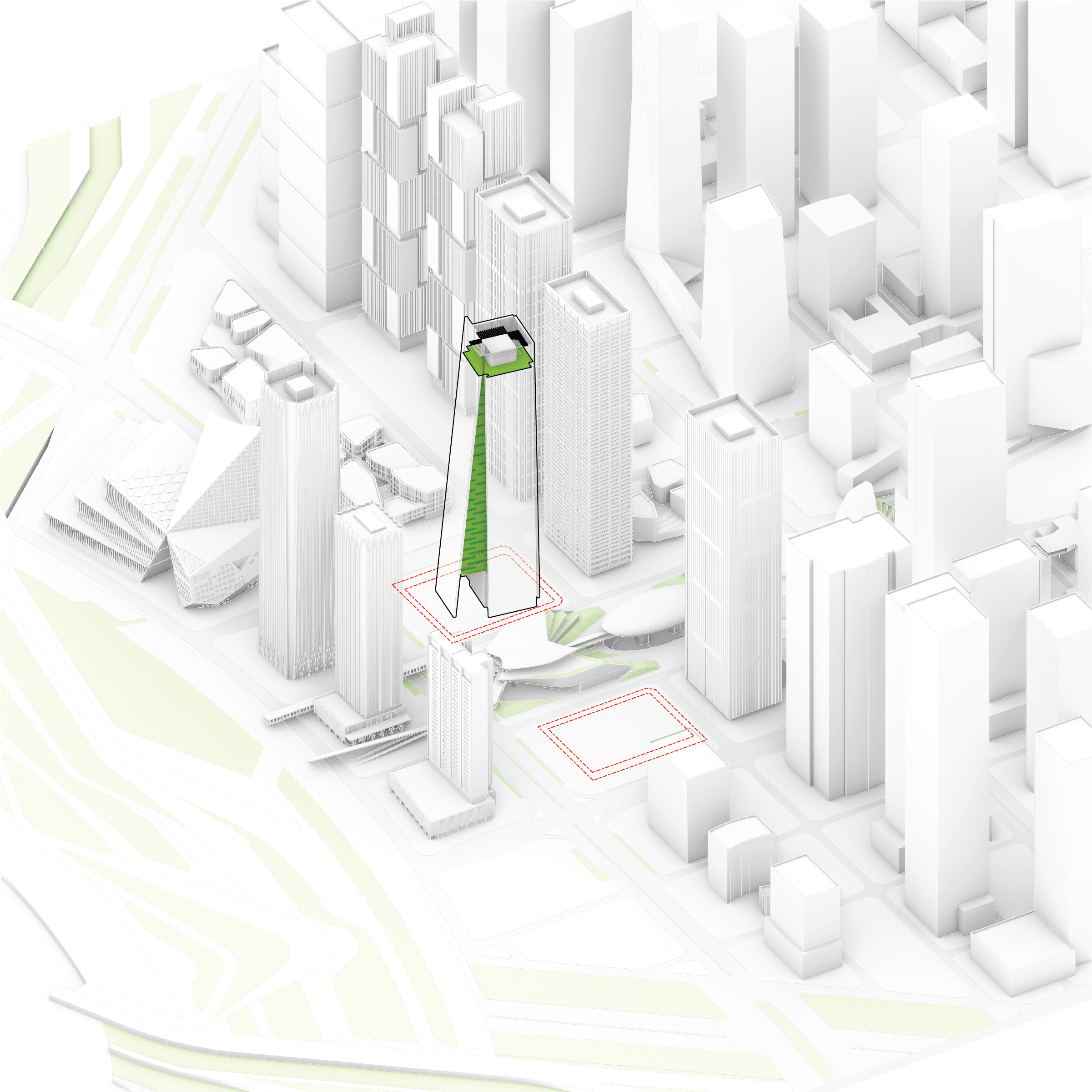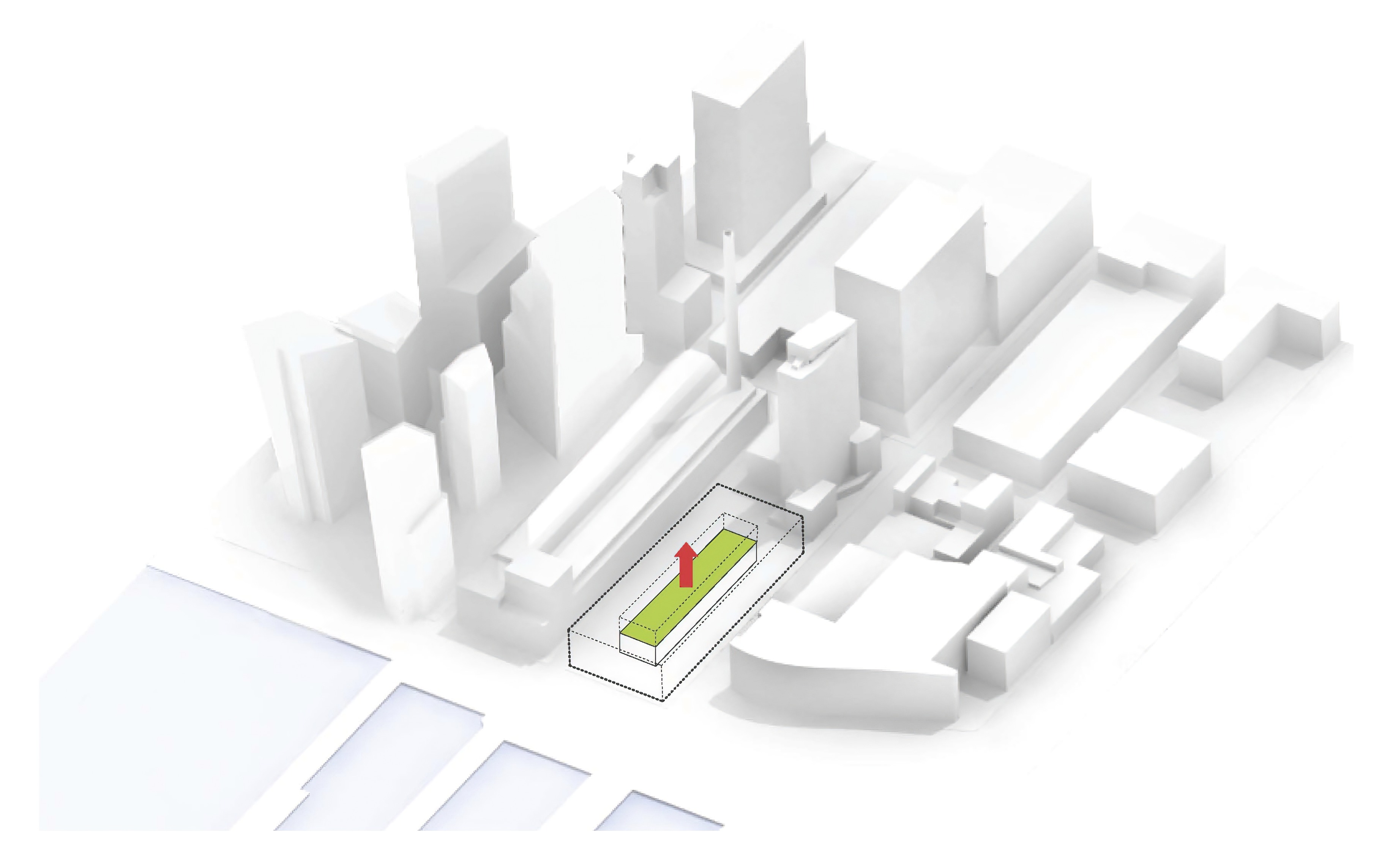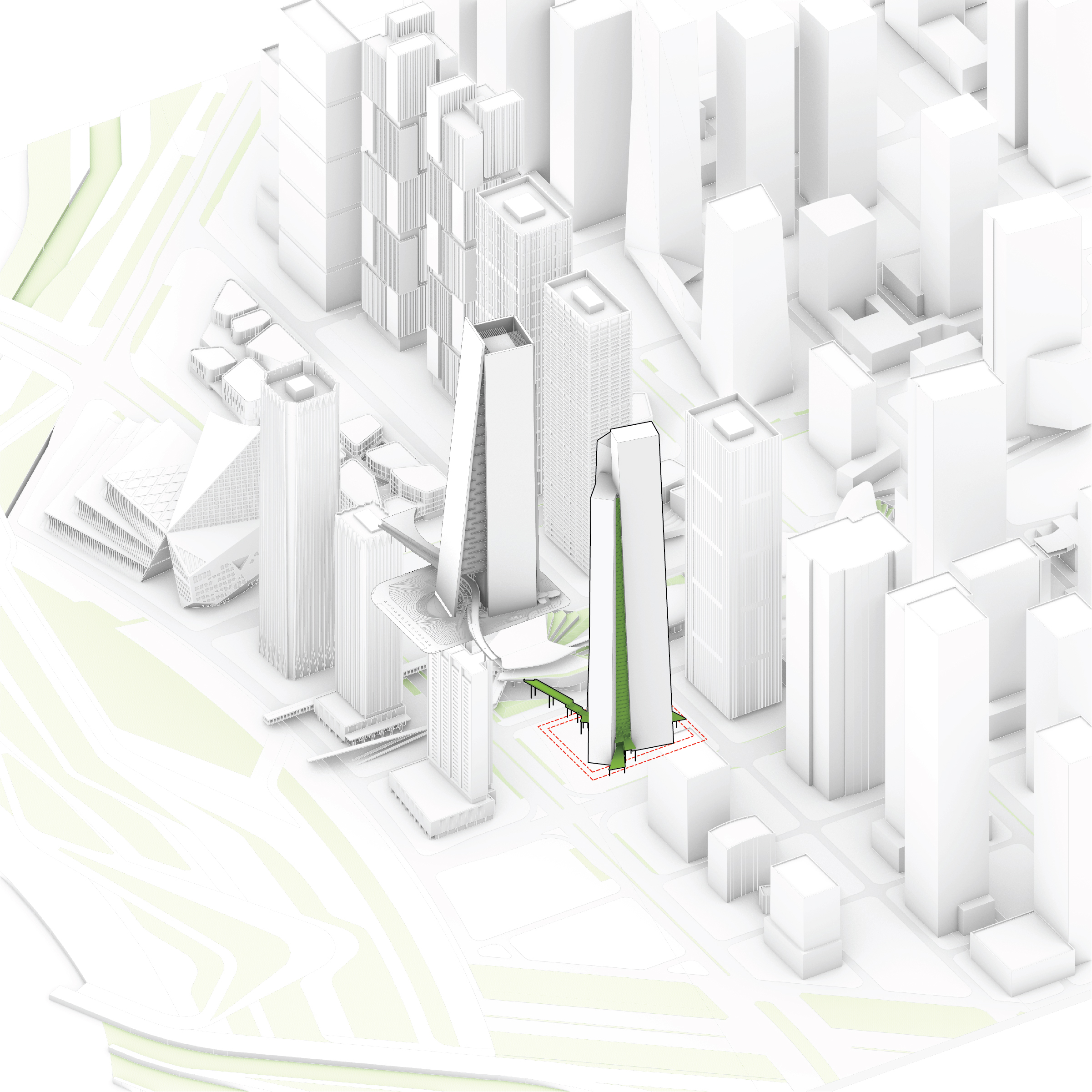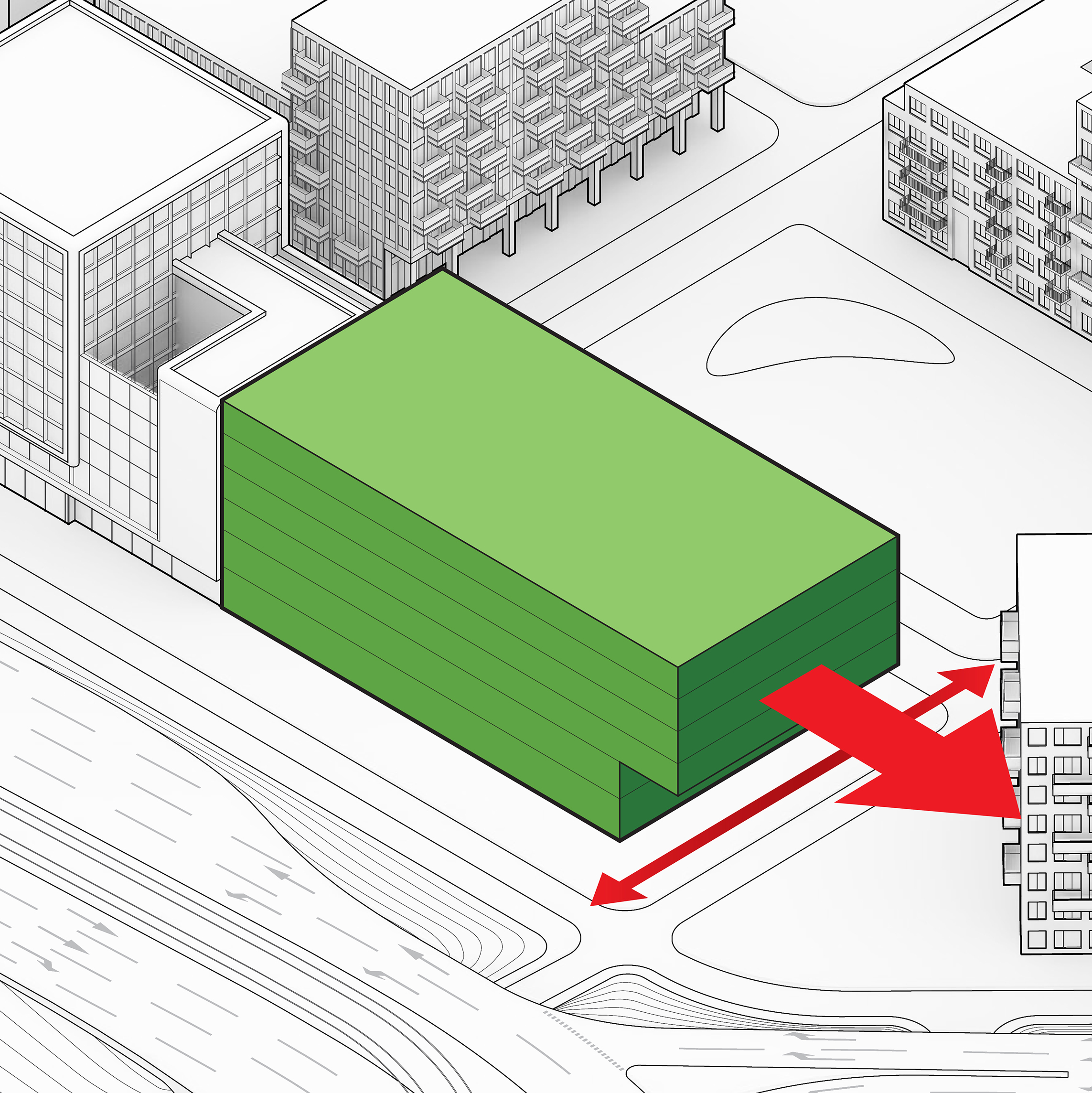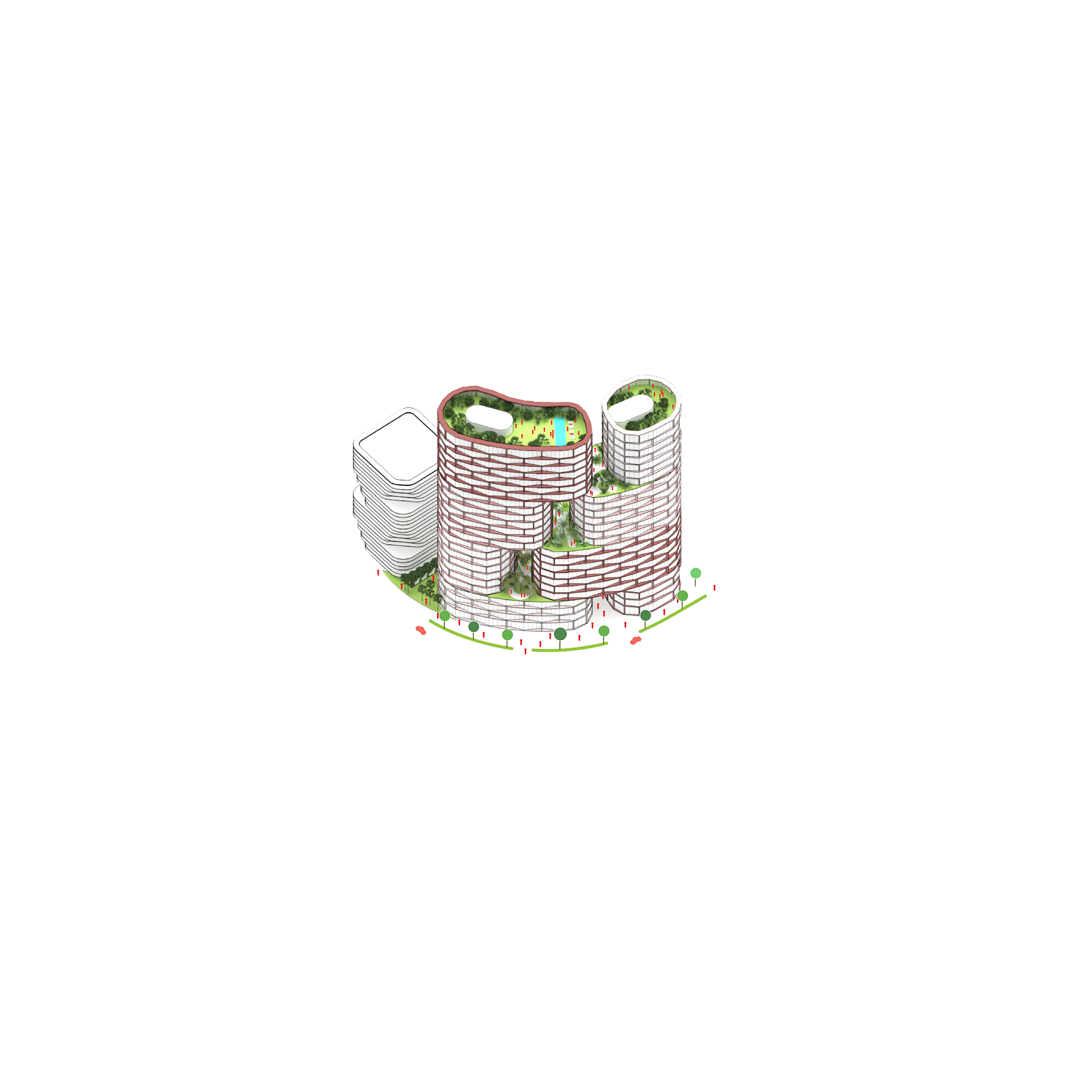 At its base, a pedestrian through-block connection forms a new gateway to the park and subway station. Throughout its height, soft openings are carved into the building mass to create eight distinct blocks. These ‘buildings within a building’ are connected by large, communal green terraces at different elevations.