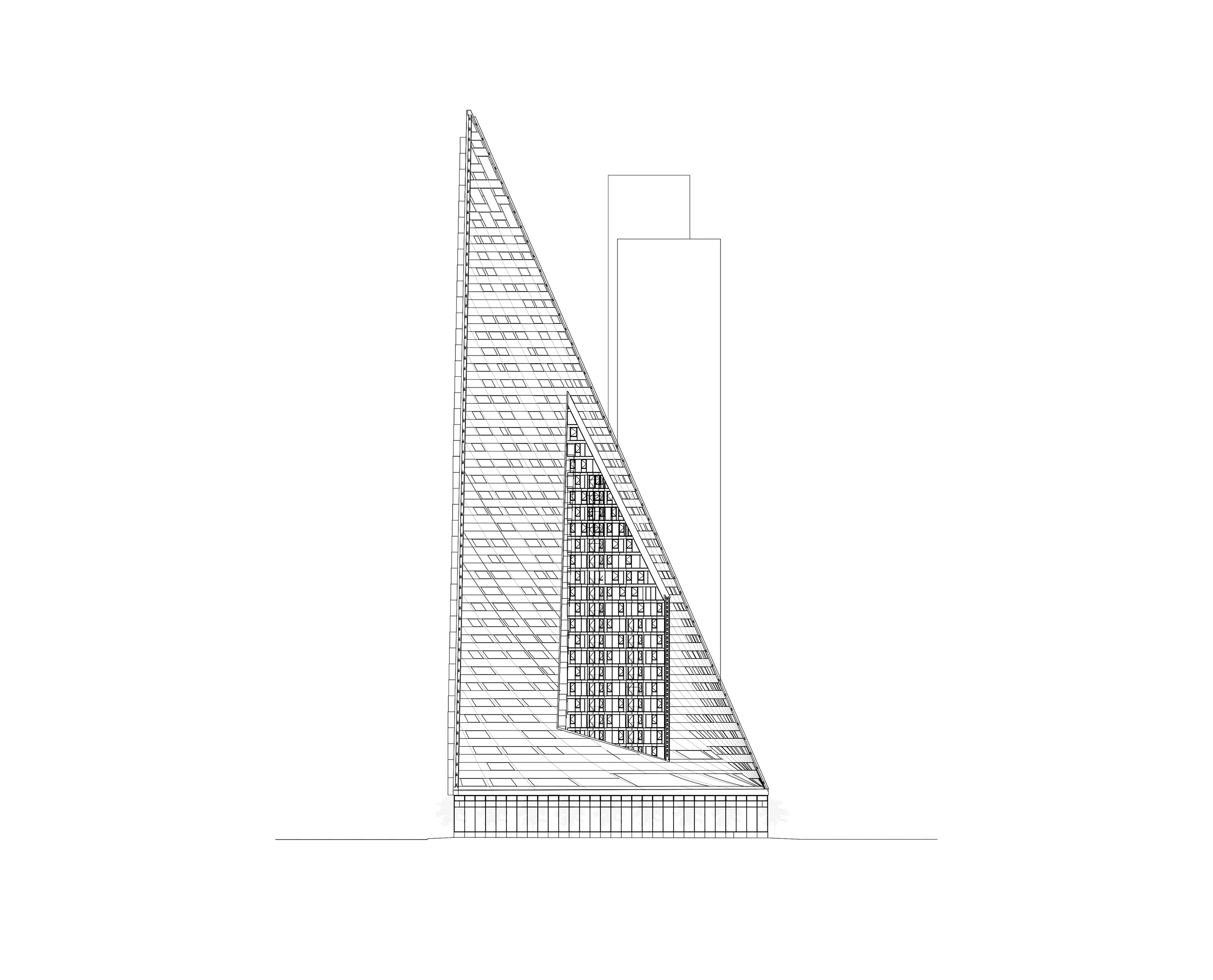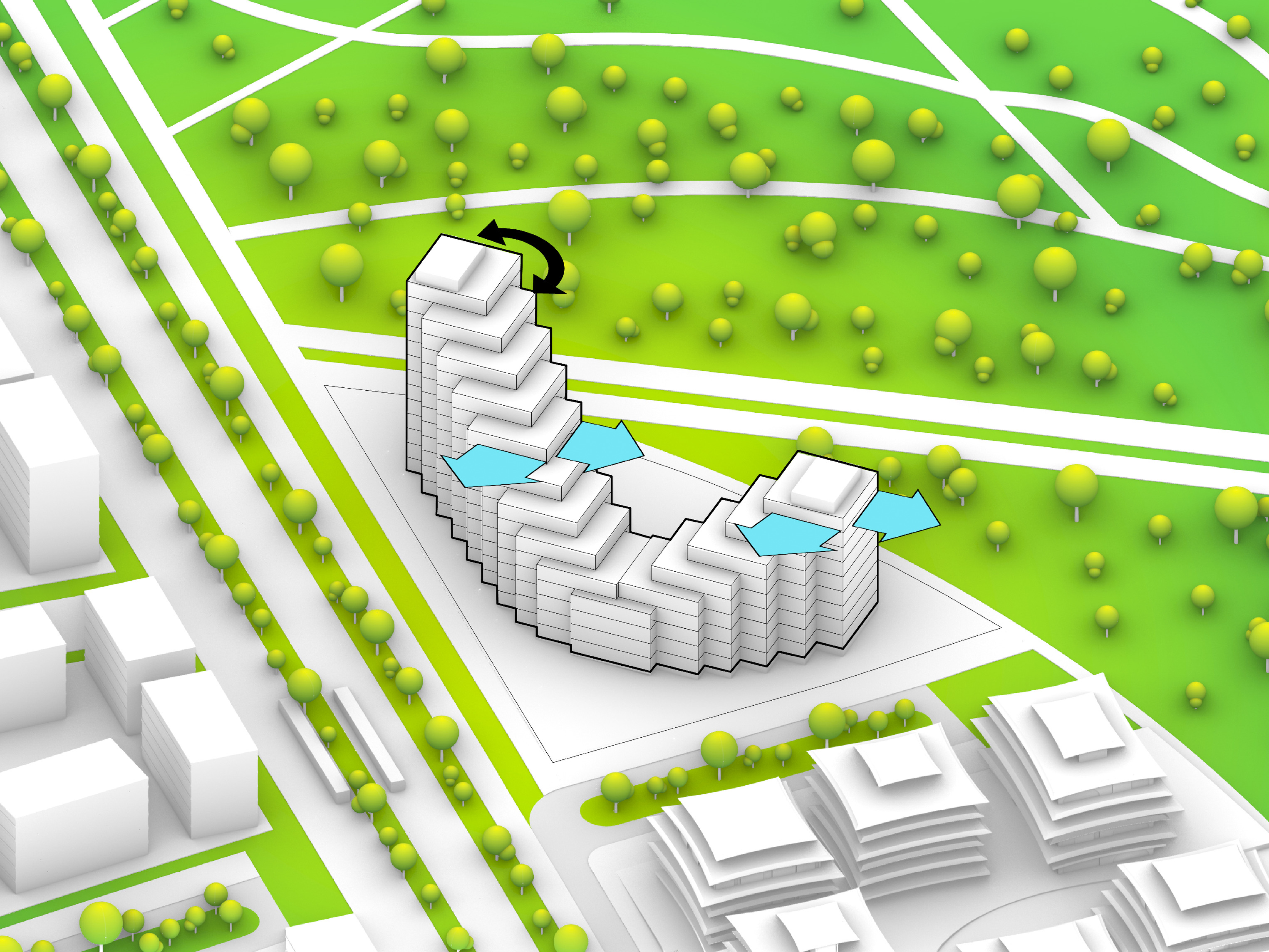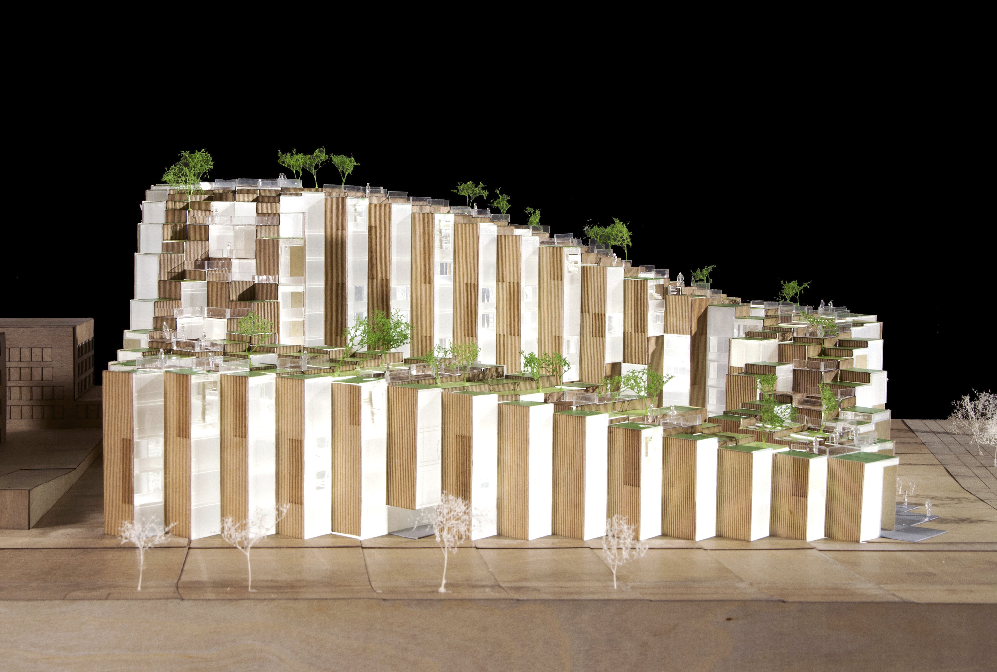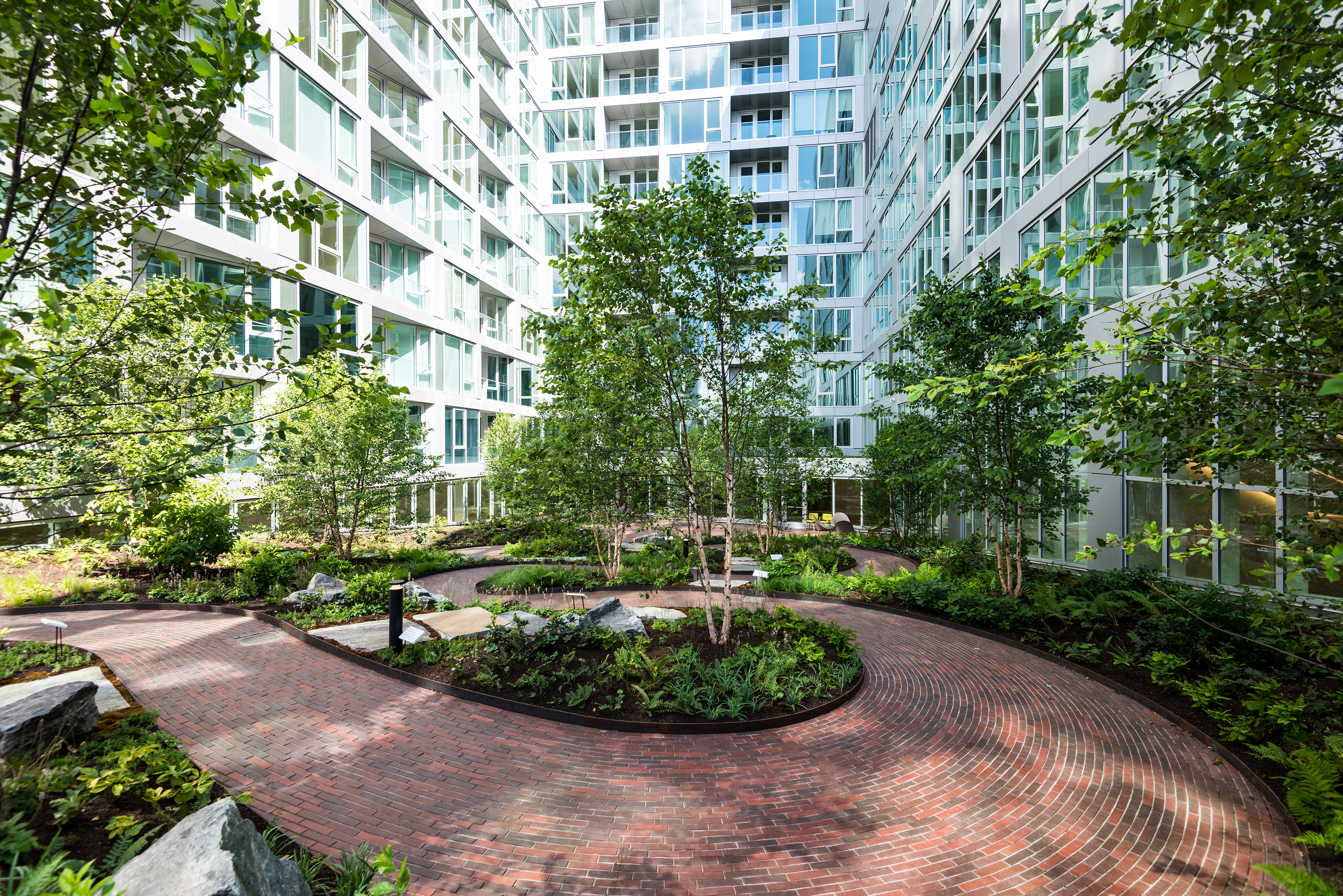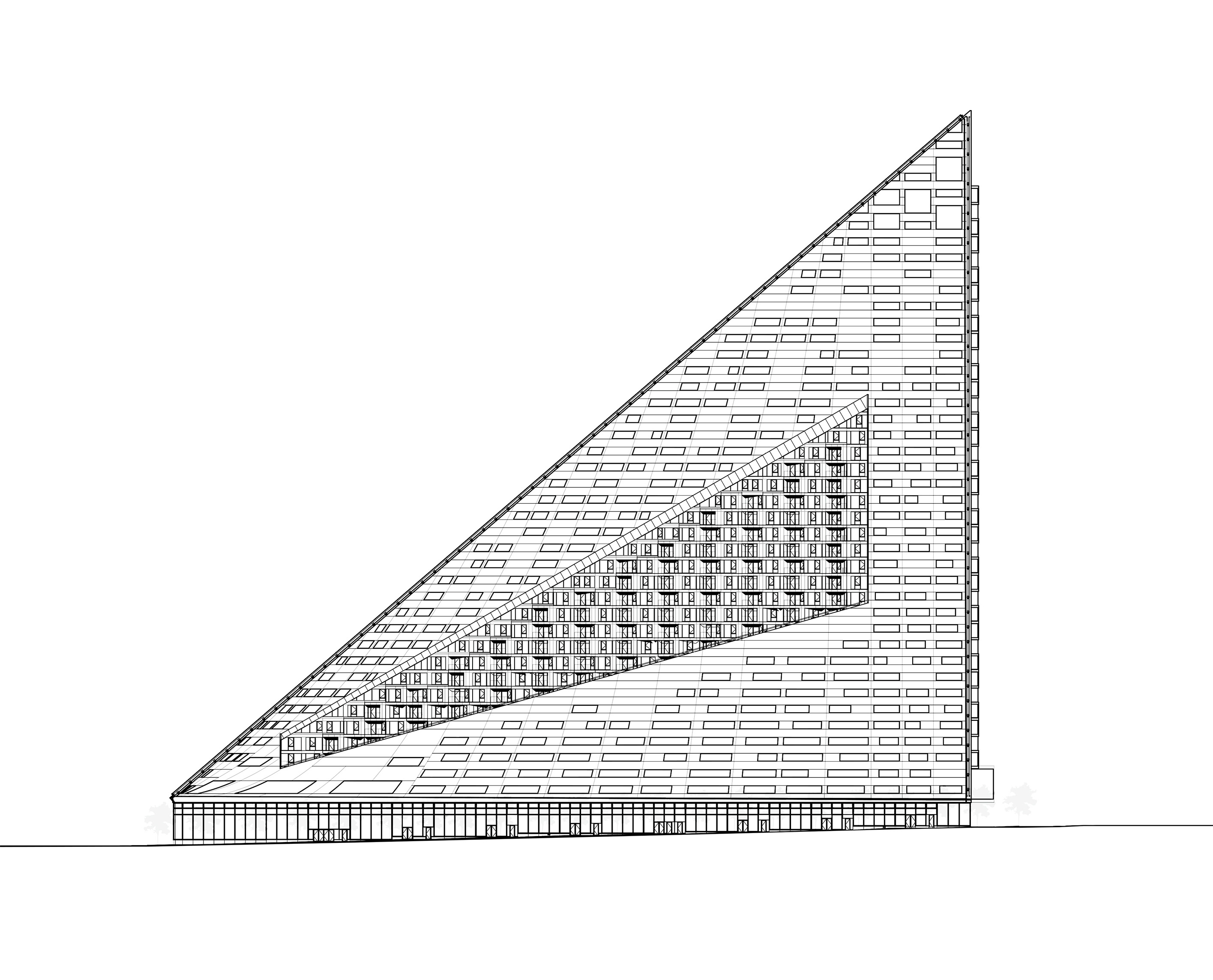 At its base, a pedestrian through-block connection forms a new gateway to the park and subway station. Throughout its height, soft openings are carved into the building mass to create eight distinct blocks. These ‘buildings within a building’ are connected by large, communal green terraces at different elevations.