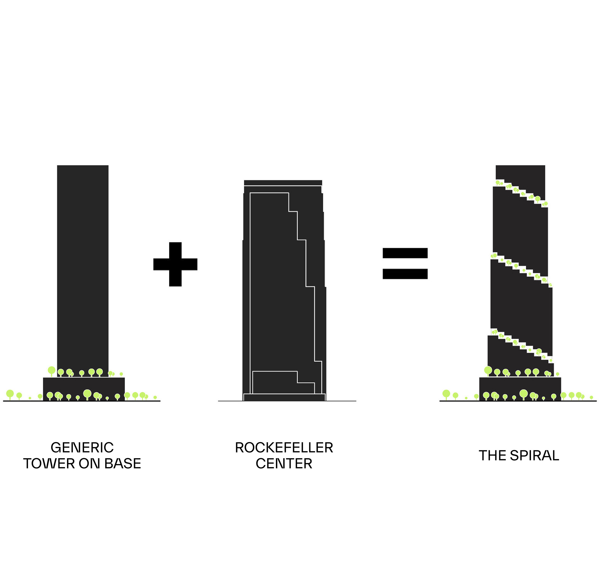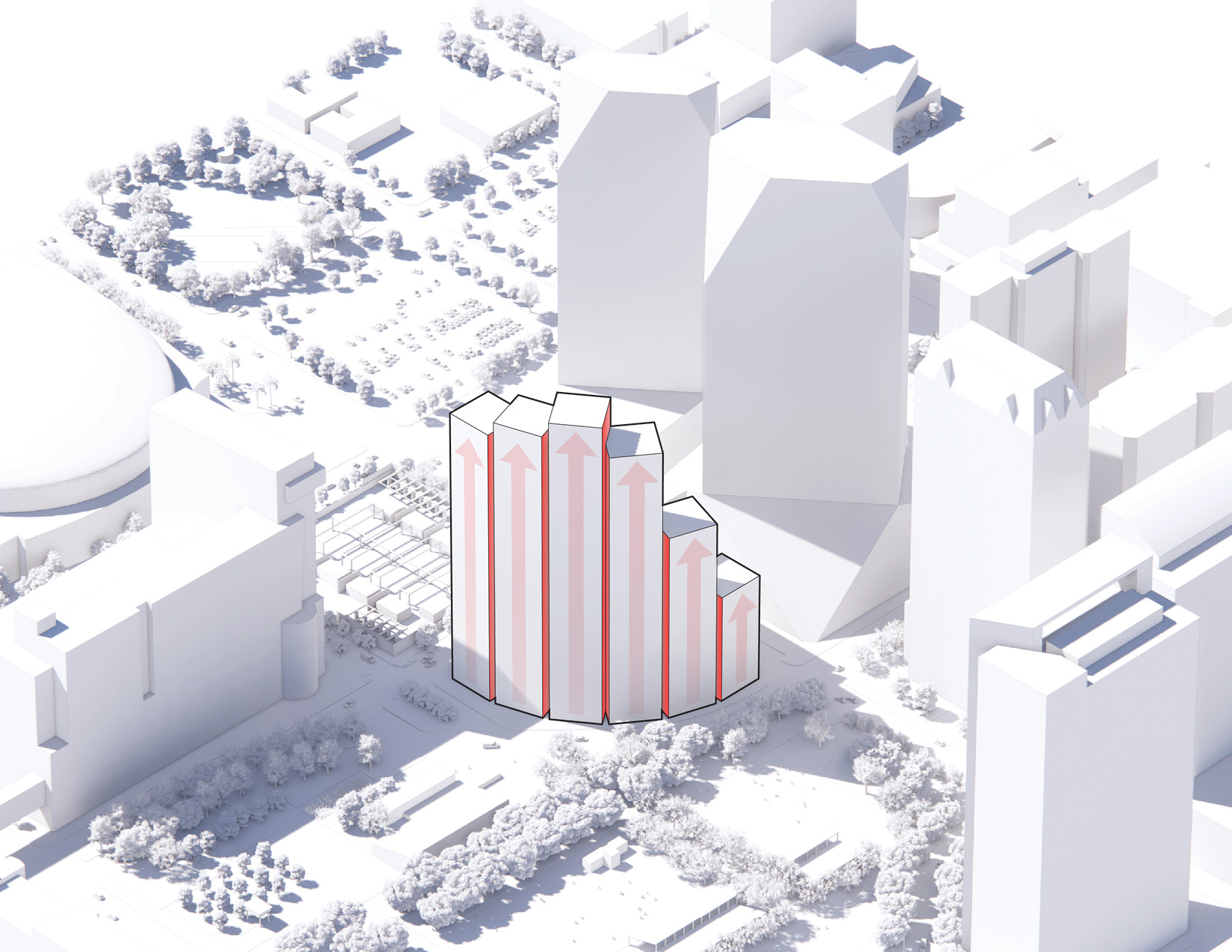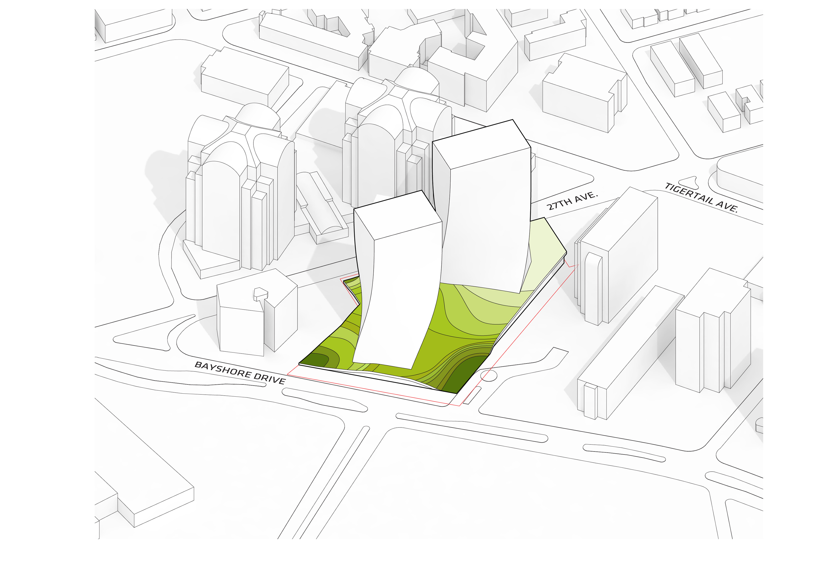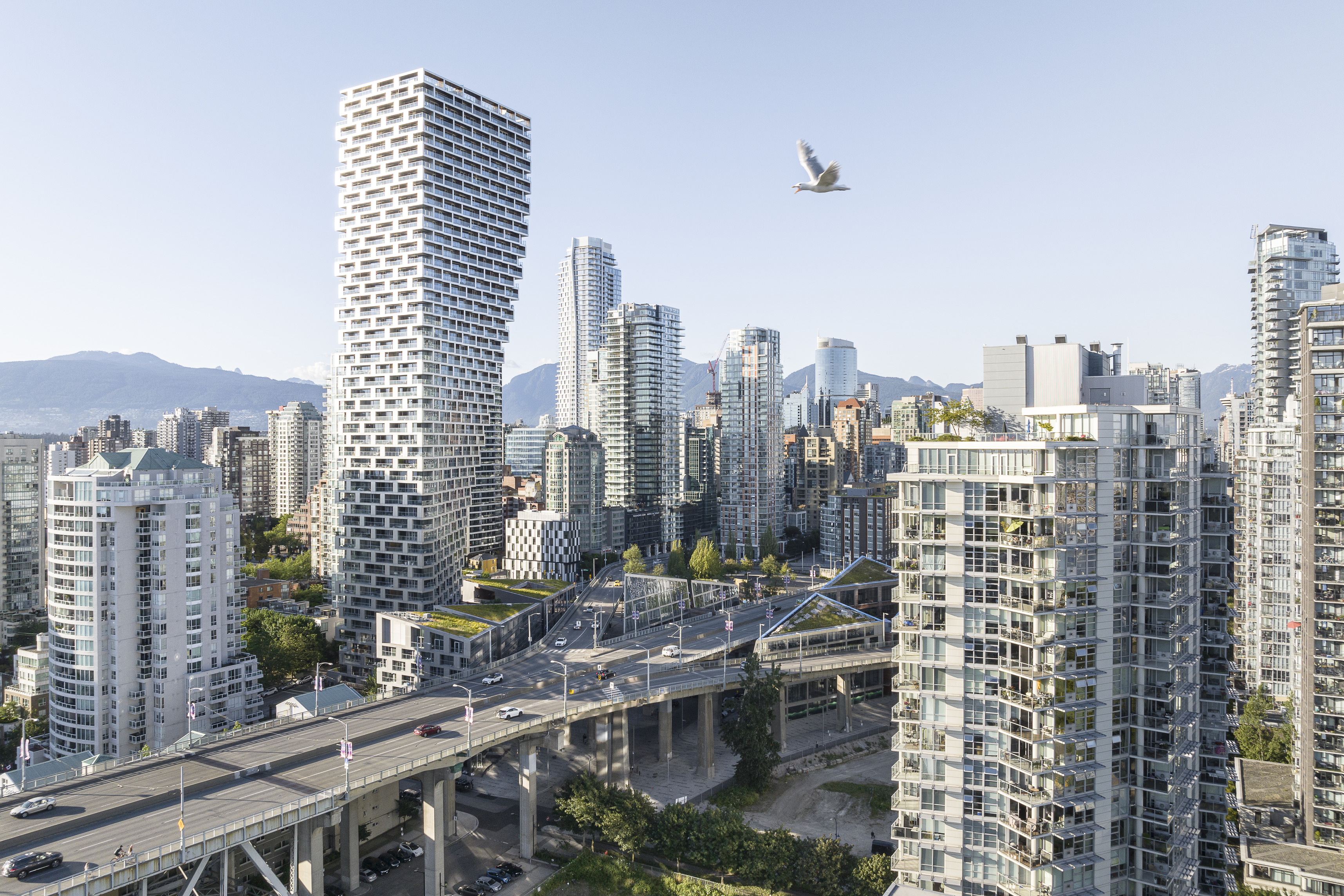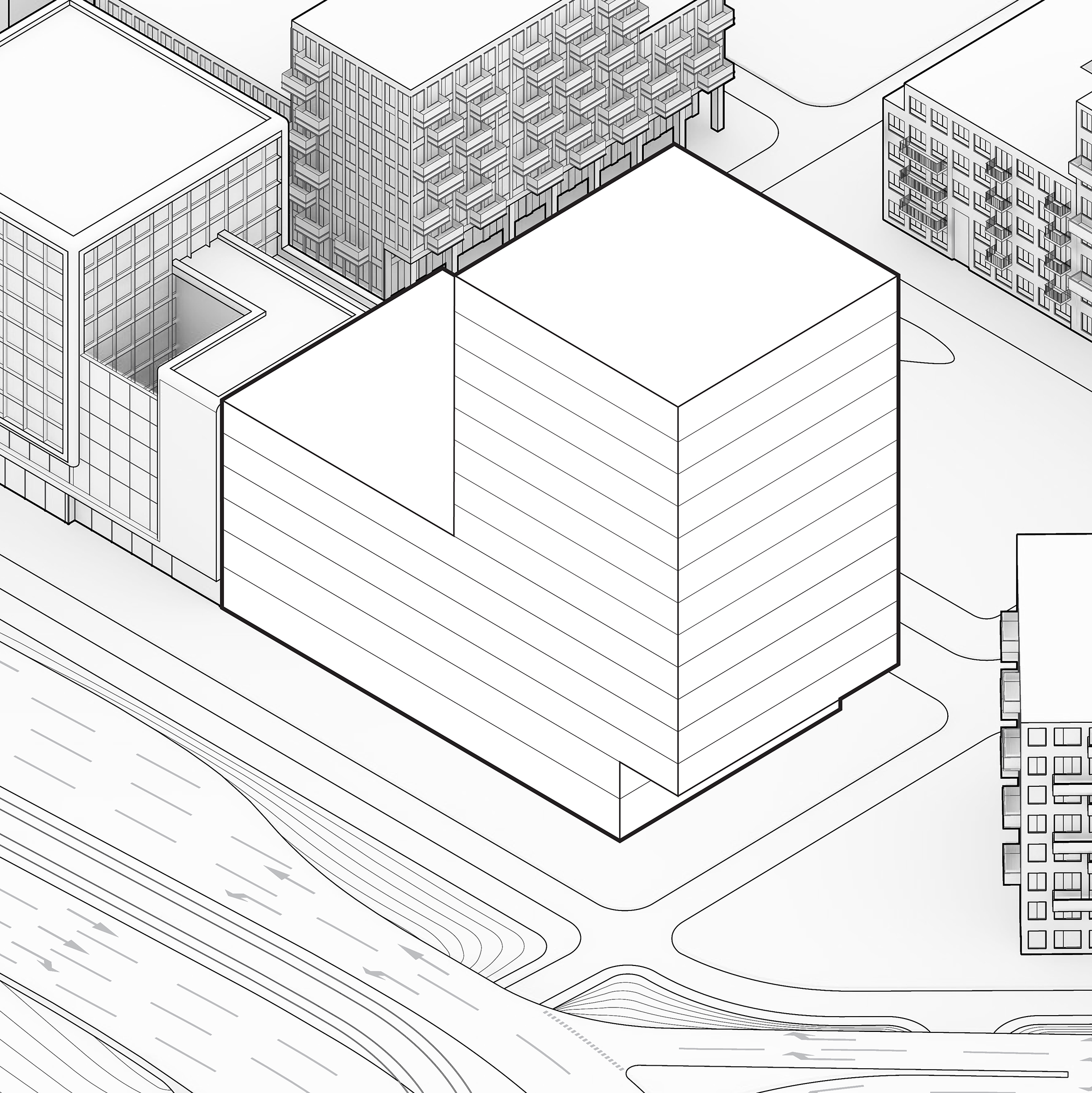 At its base, a pedestrian through-block connection forms a new gateway to the park and subway station. Throughout its height, soft openings are carved into the building mass to create eight distinct blocks. These ‘buildings within a building’ are connected by large, communal green terraces at different elevations.