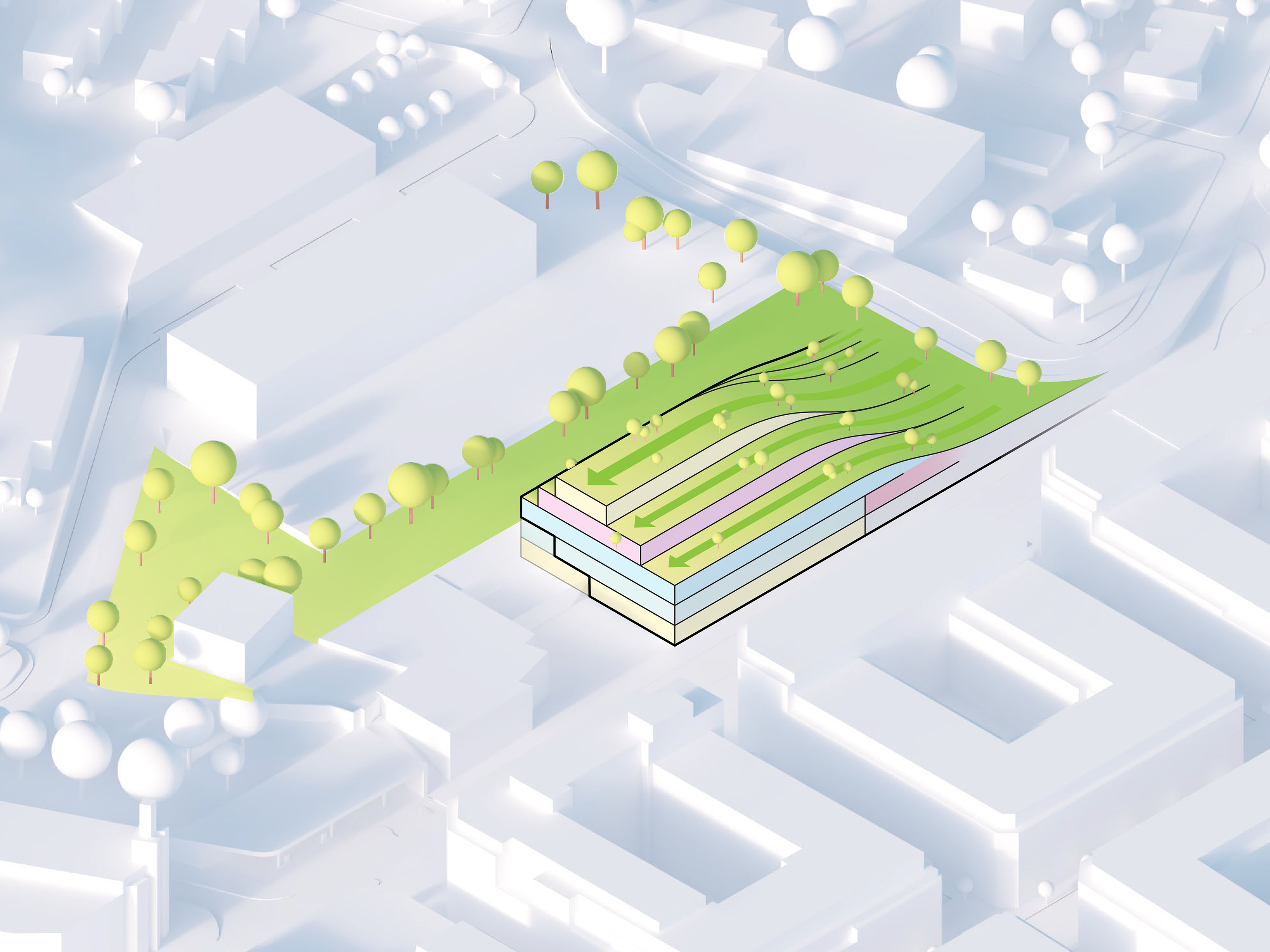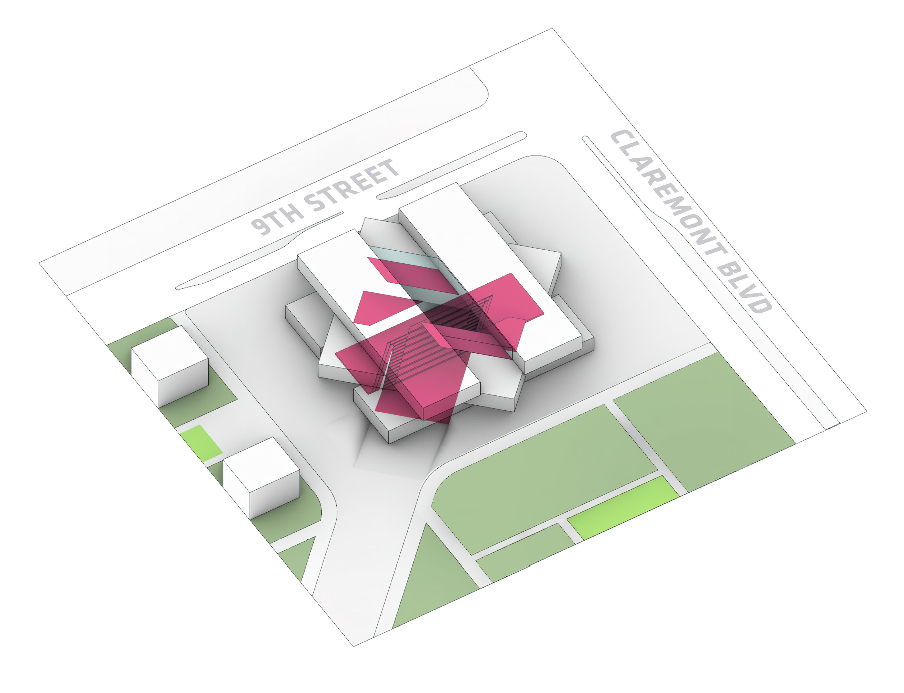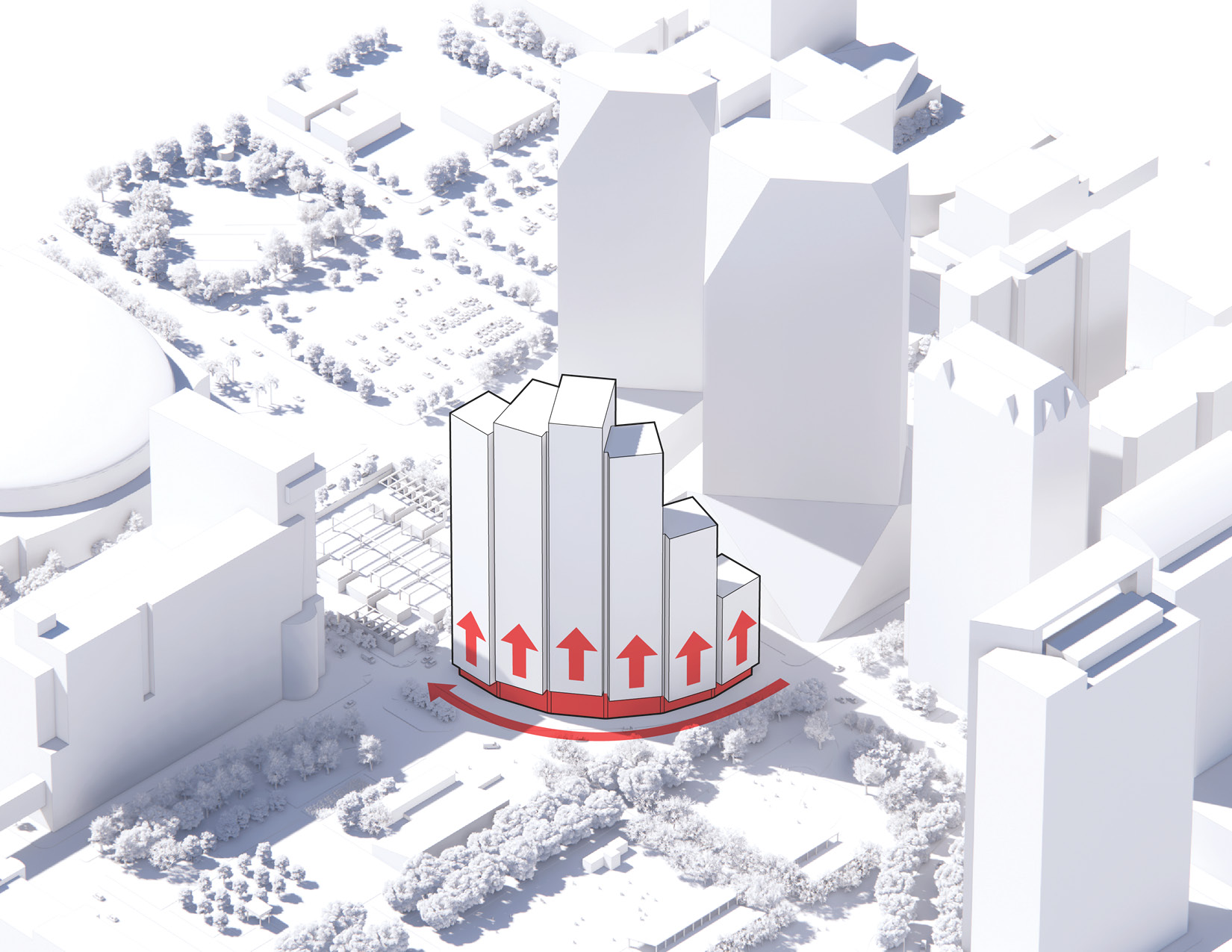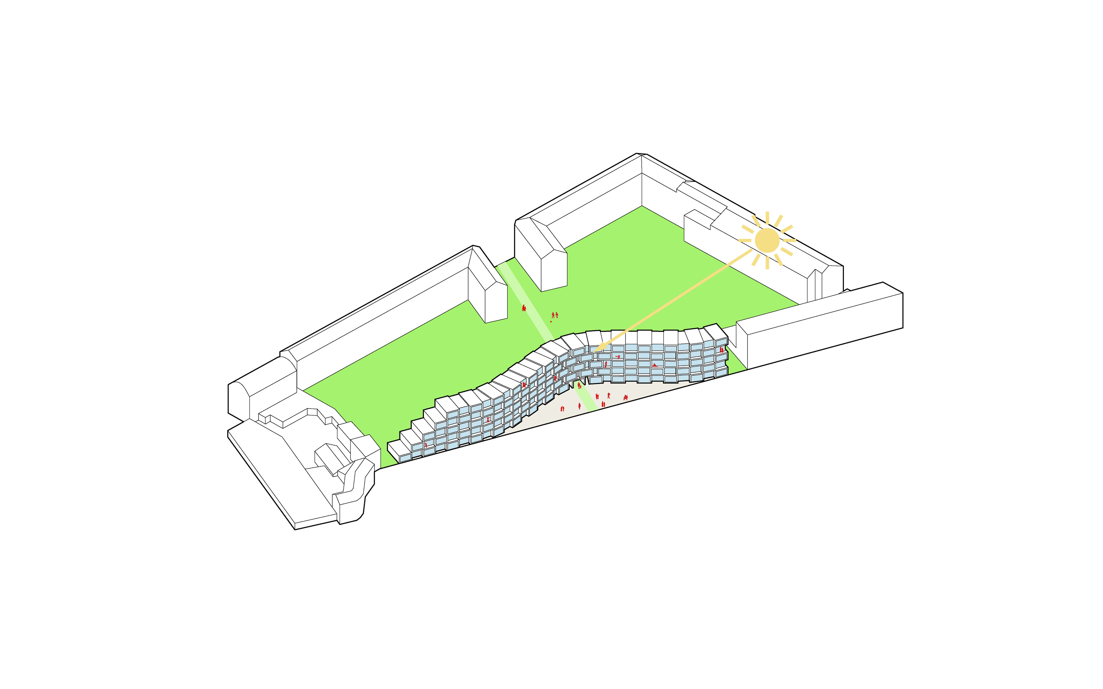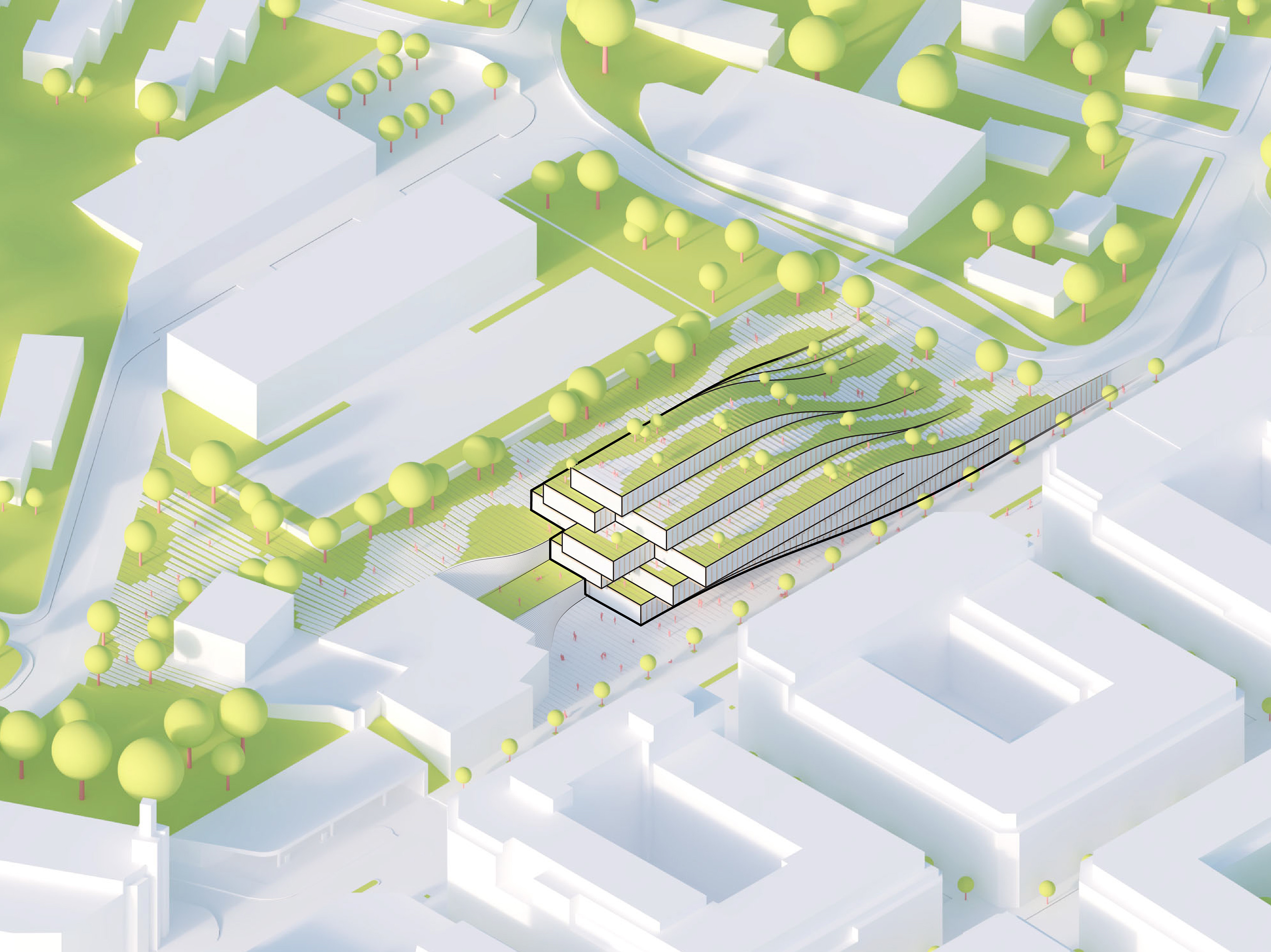 At its base, a pedestrian through-block connection forms a new gateway to the park and subway station. Throughout its height, soft openings are carved into the building mass to create eight distinct blocks. These ‘buildings within a building’ are connected by large, communal green terraces at different elevations.