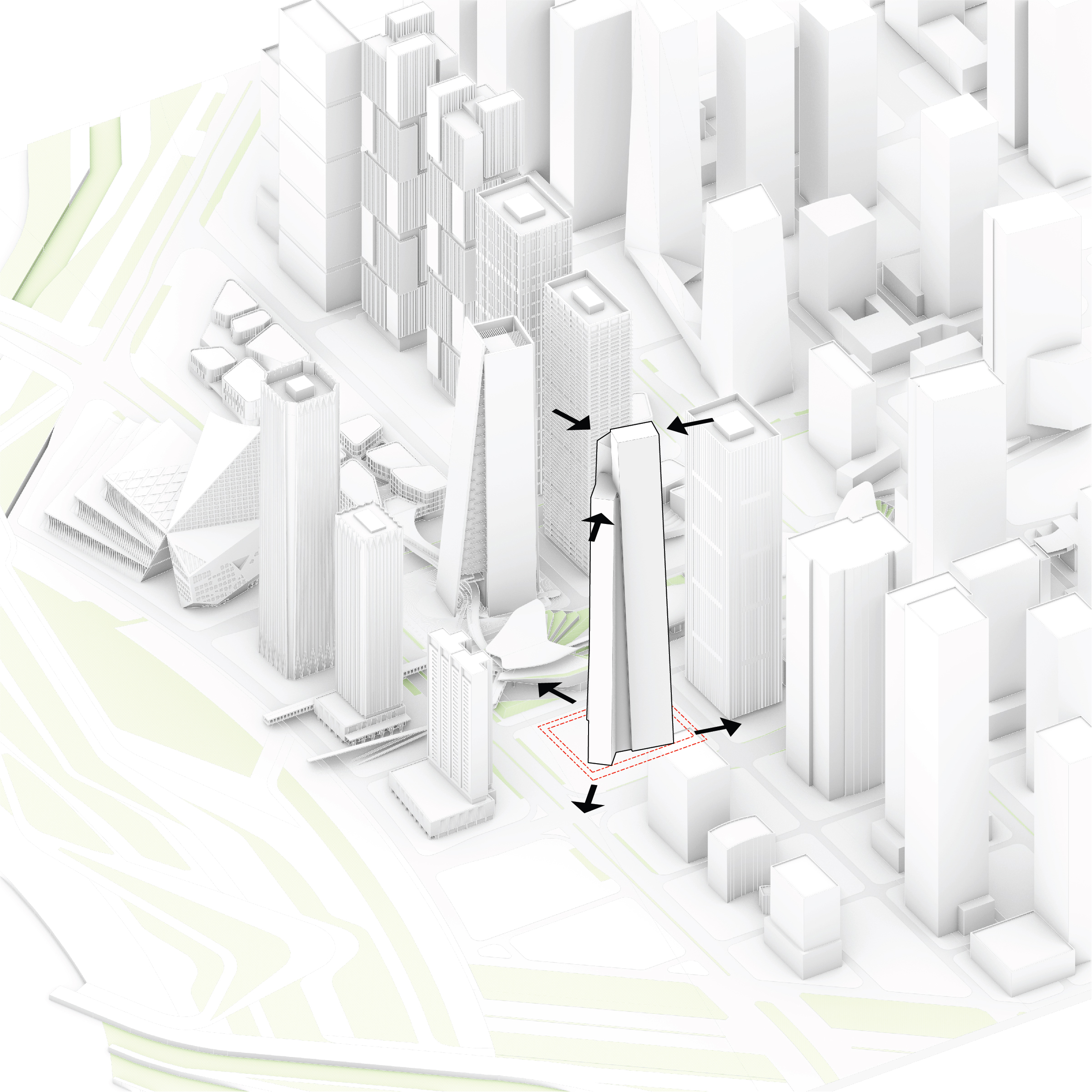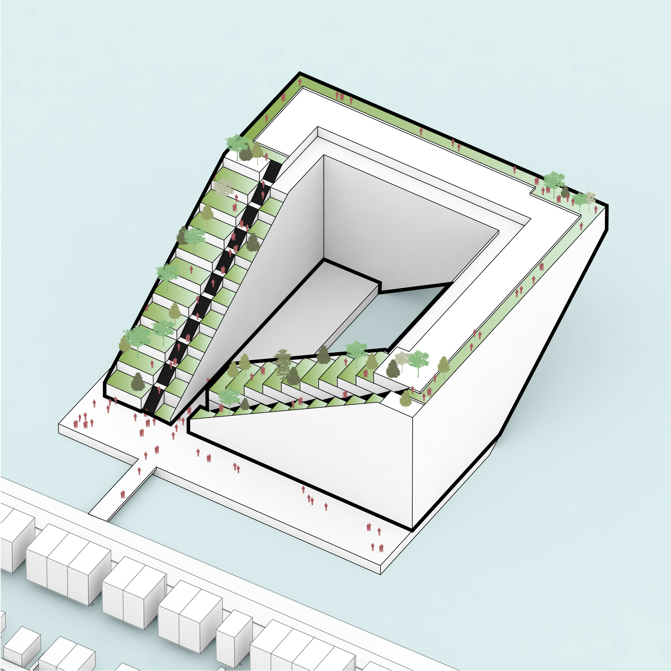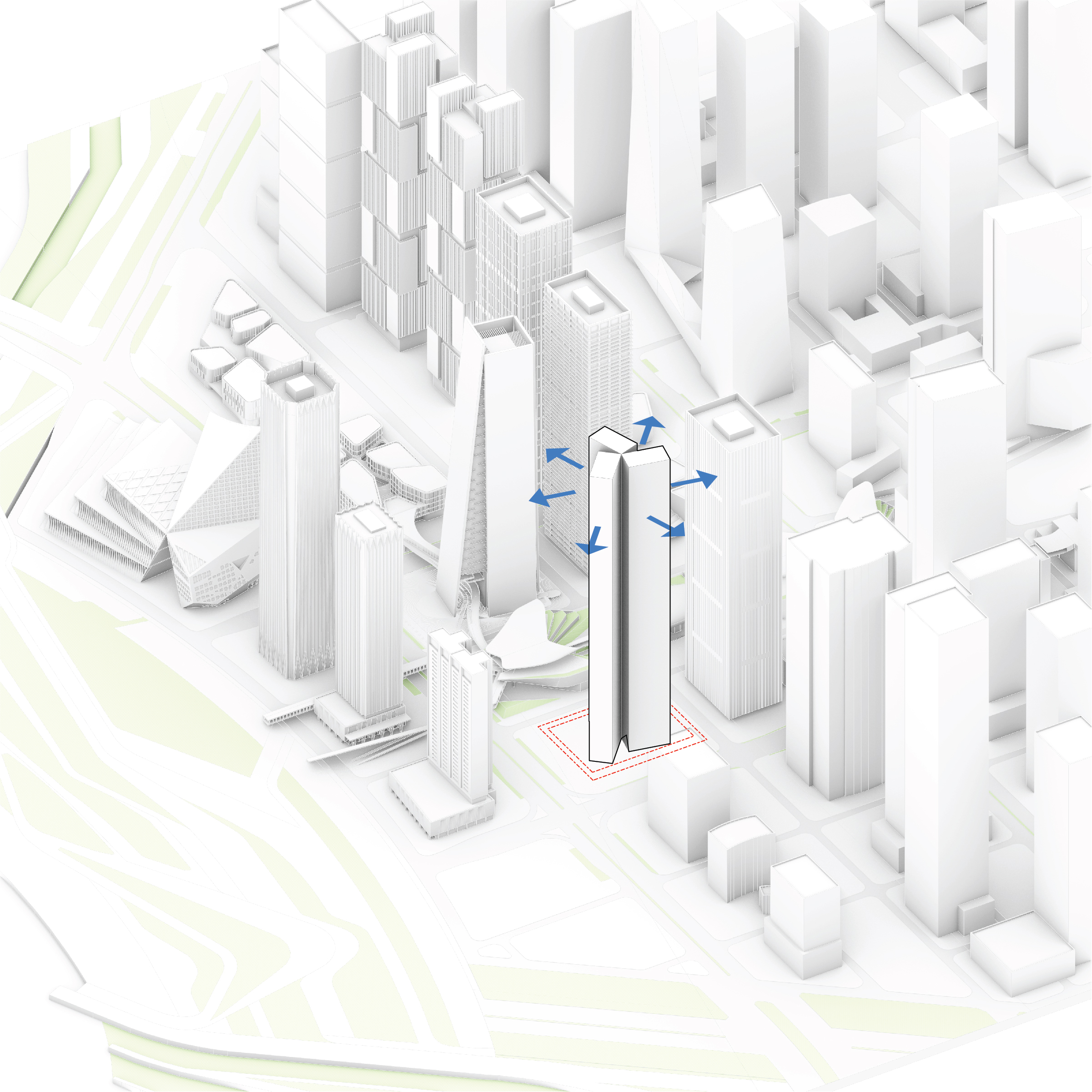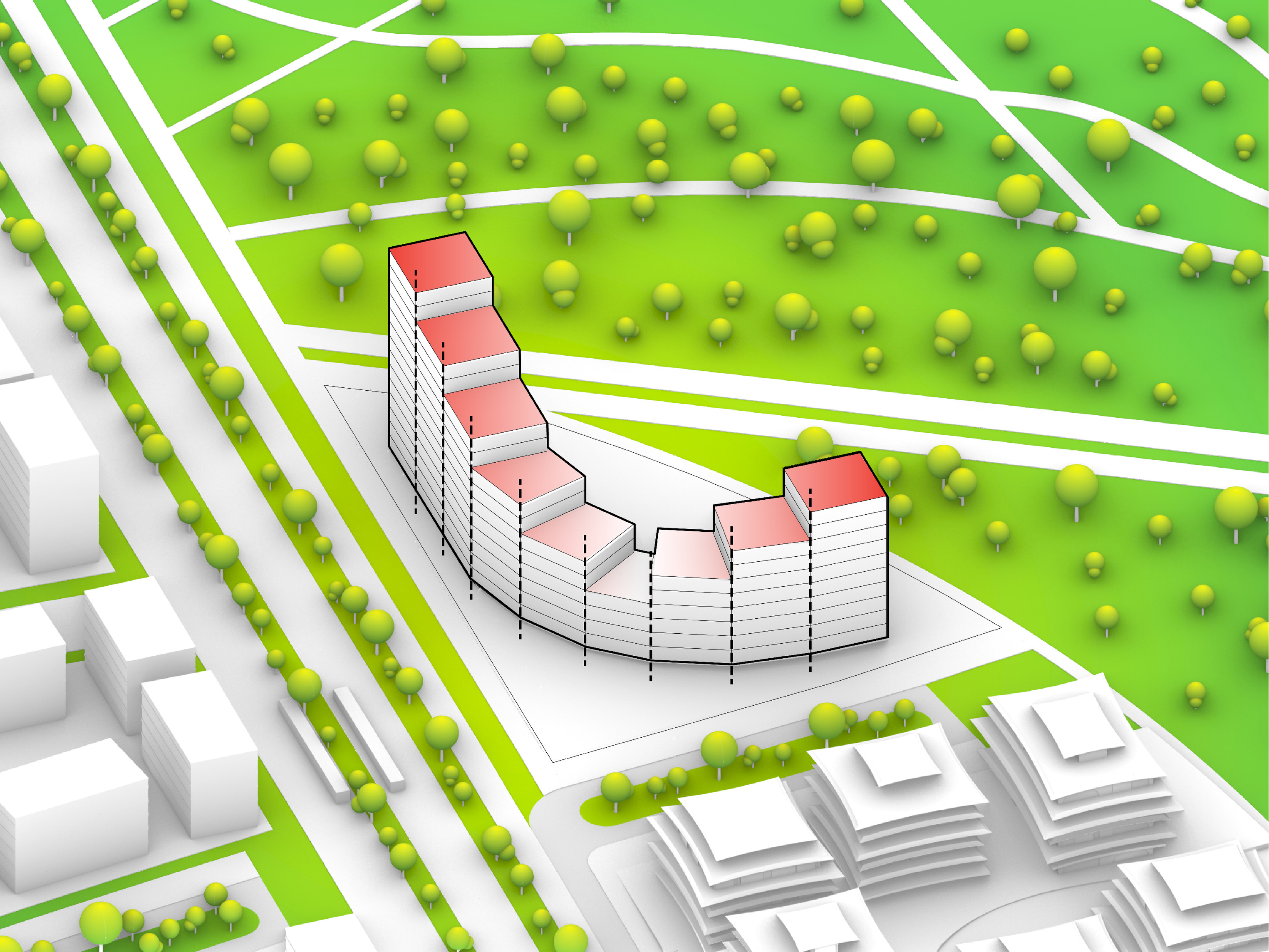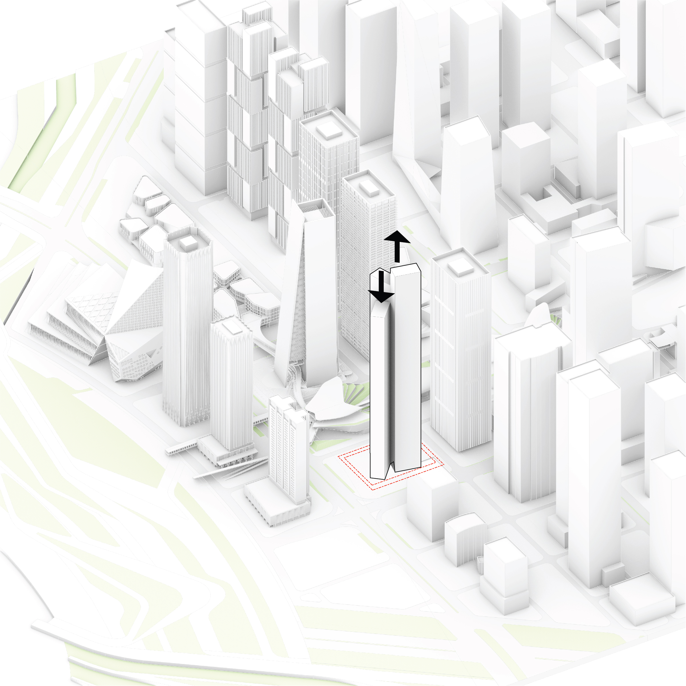 At its base, a pedestrian through-block connection forms a new gateway to the park and subway station. Throughout its height, soft openings are carved into the building mass to create eight distinct blocks. These ‘buildings within a building’ are connected by large, communal green terraces at different elevations.