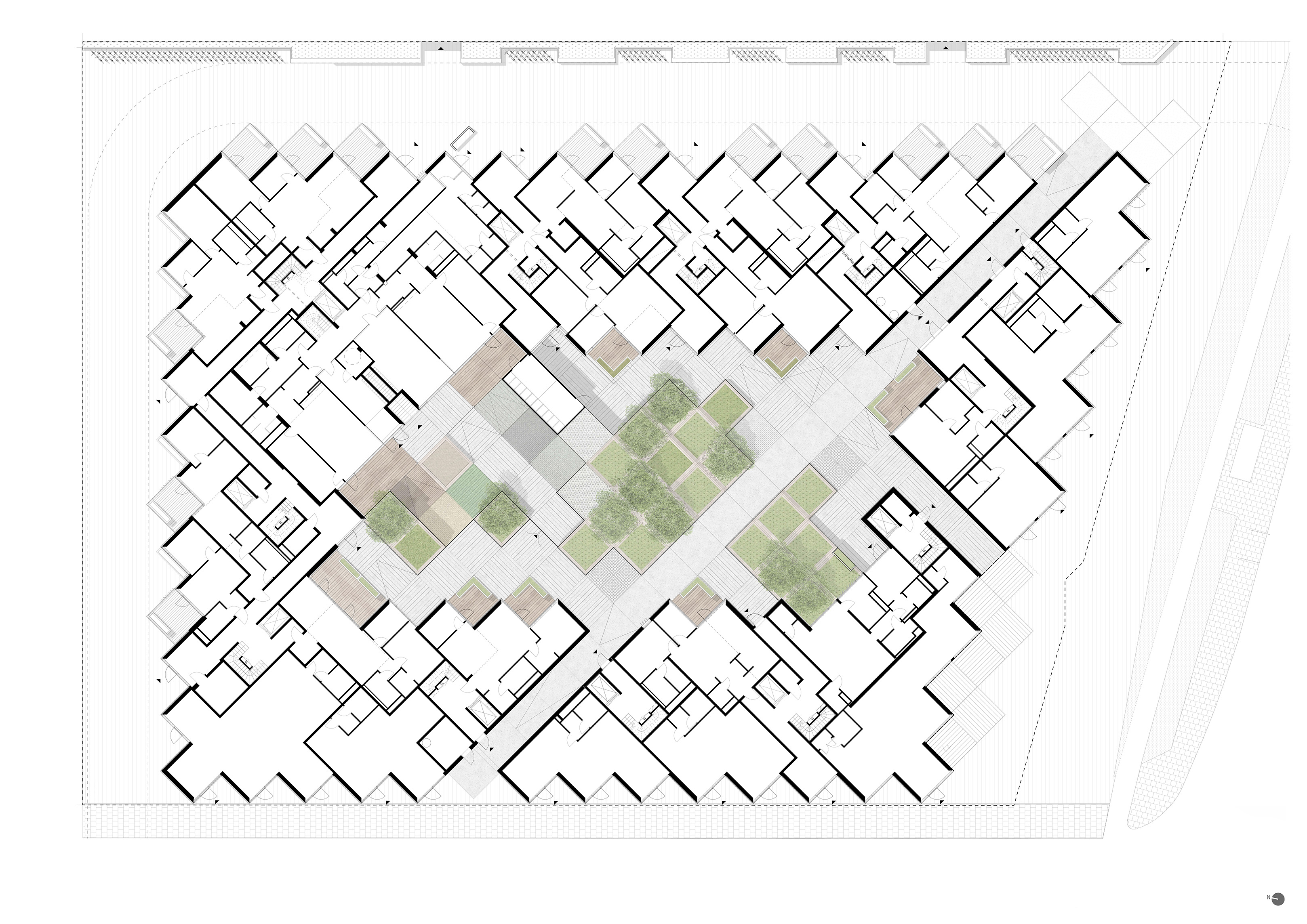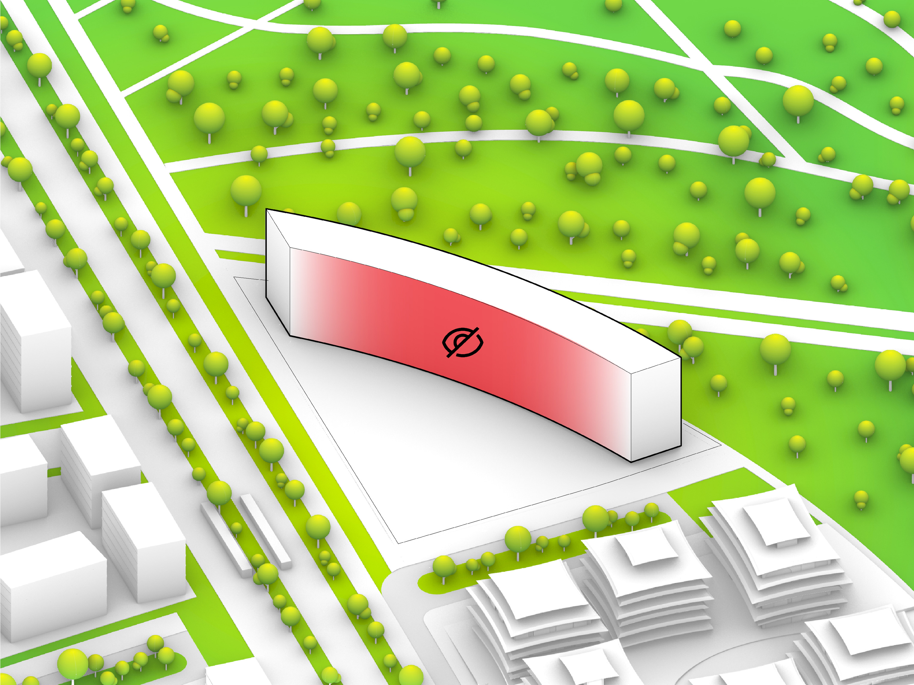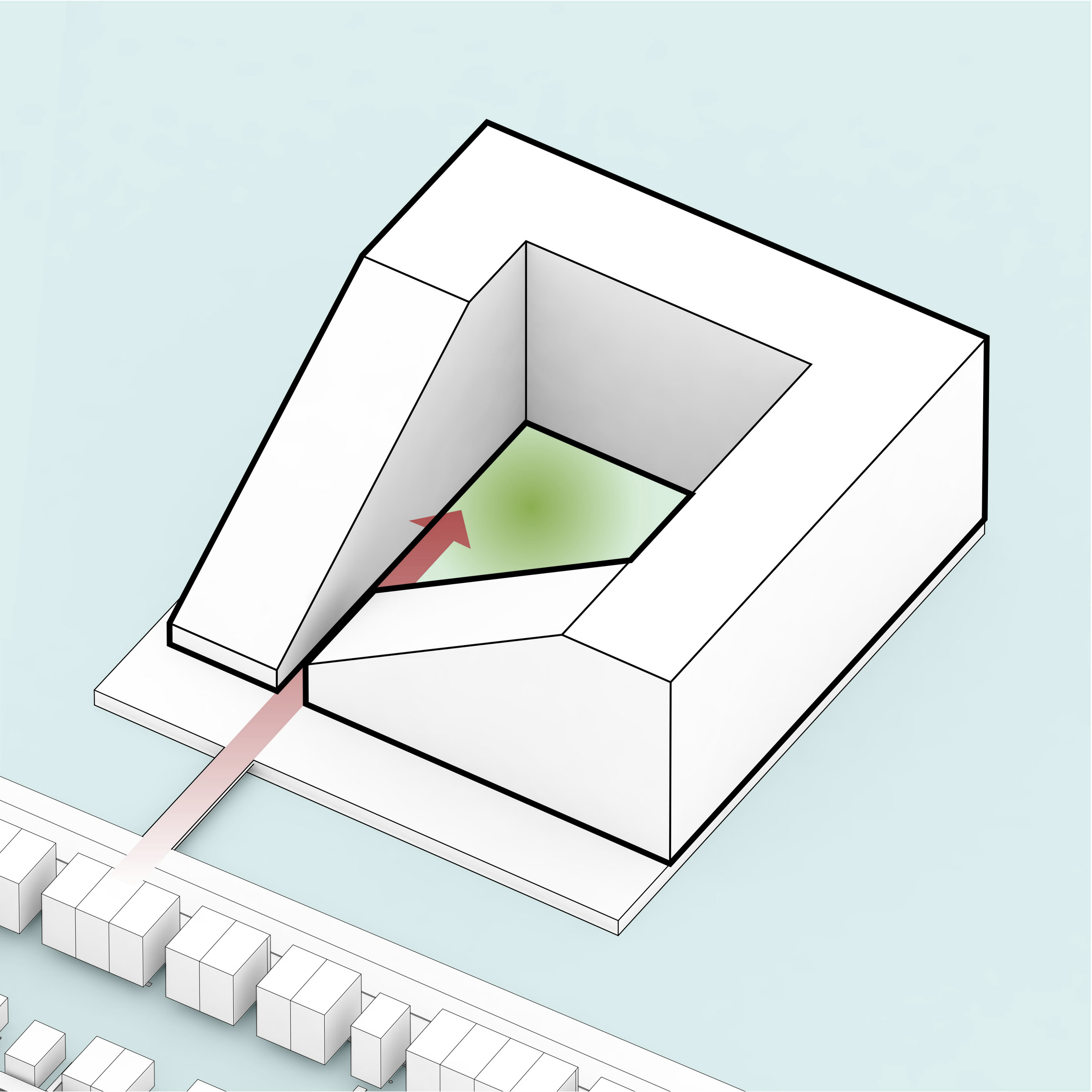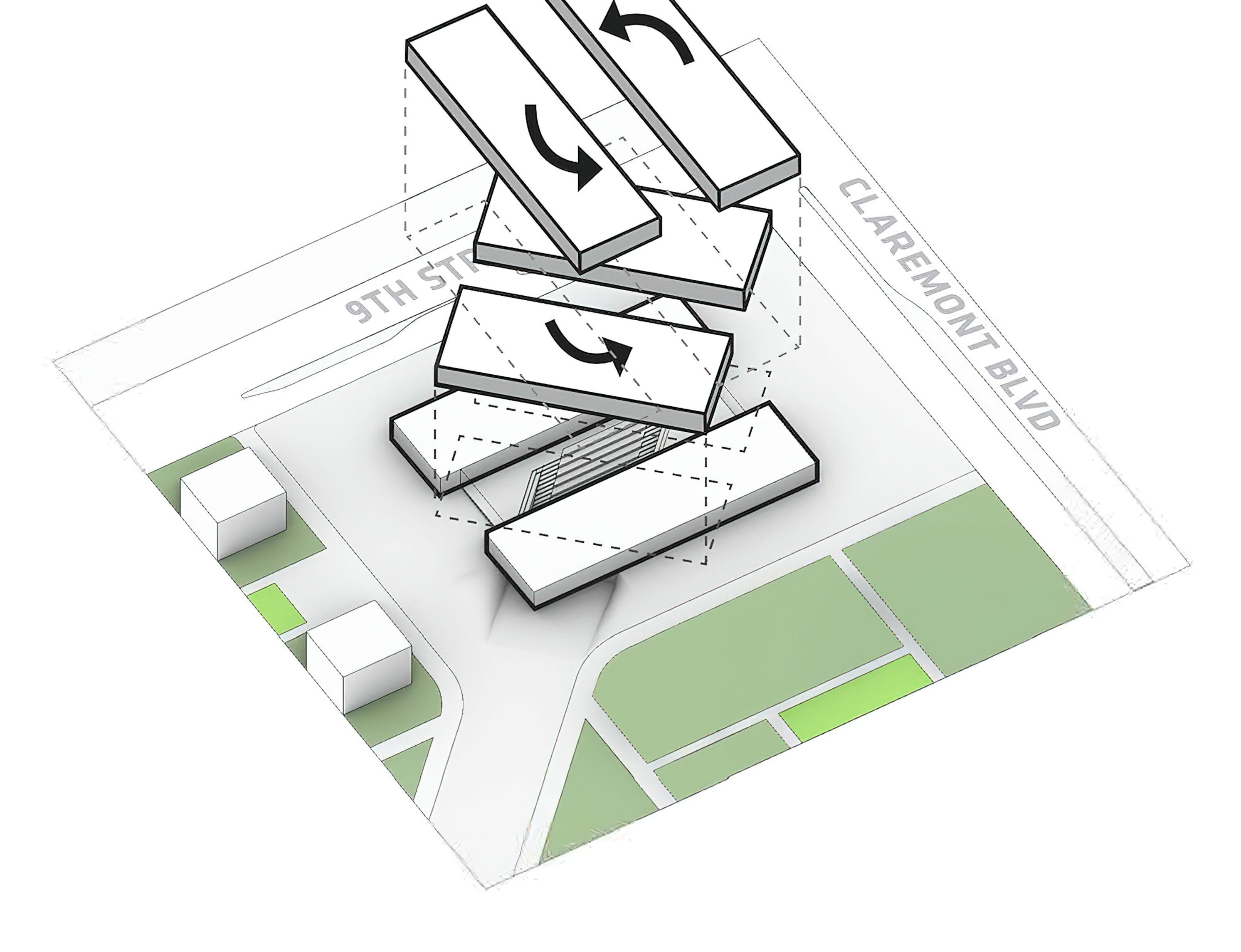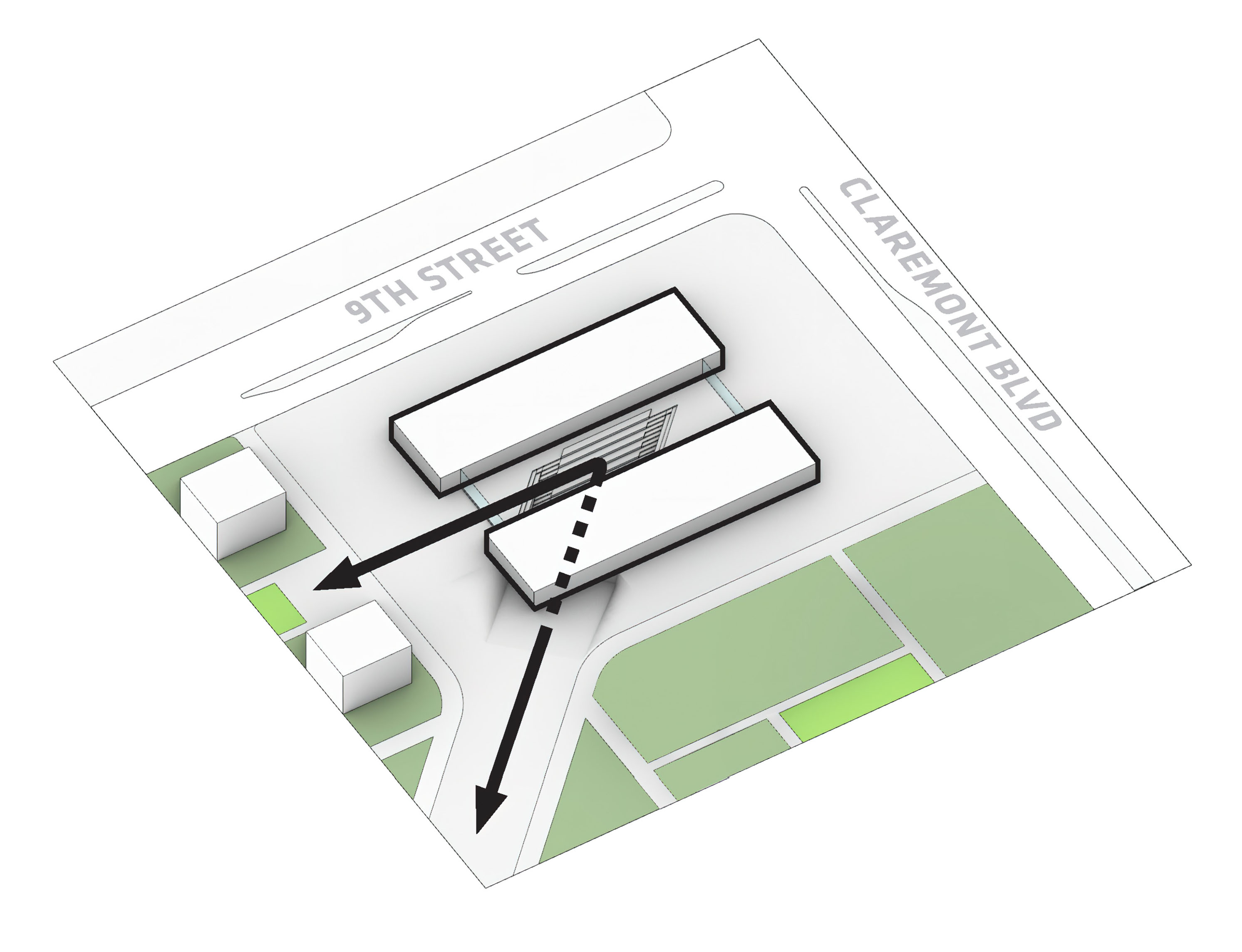 At its base, a pedestrian through-block connection forms a new gateway to the park and subway station. Throughout its height, soft openings are carved into the building mass to create eight distinct blocks. These ‘buildings within a building’ are connected by large, communal green terraces at different elevations.