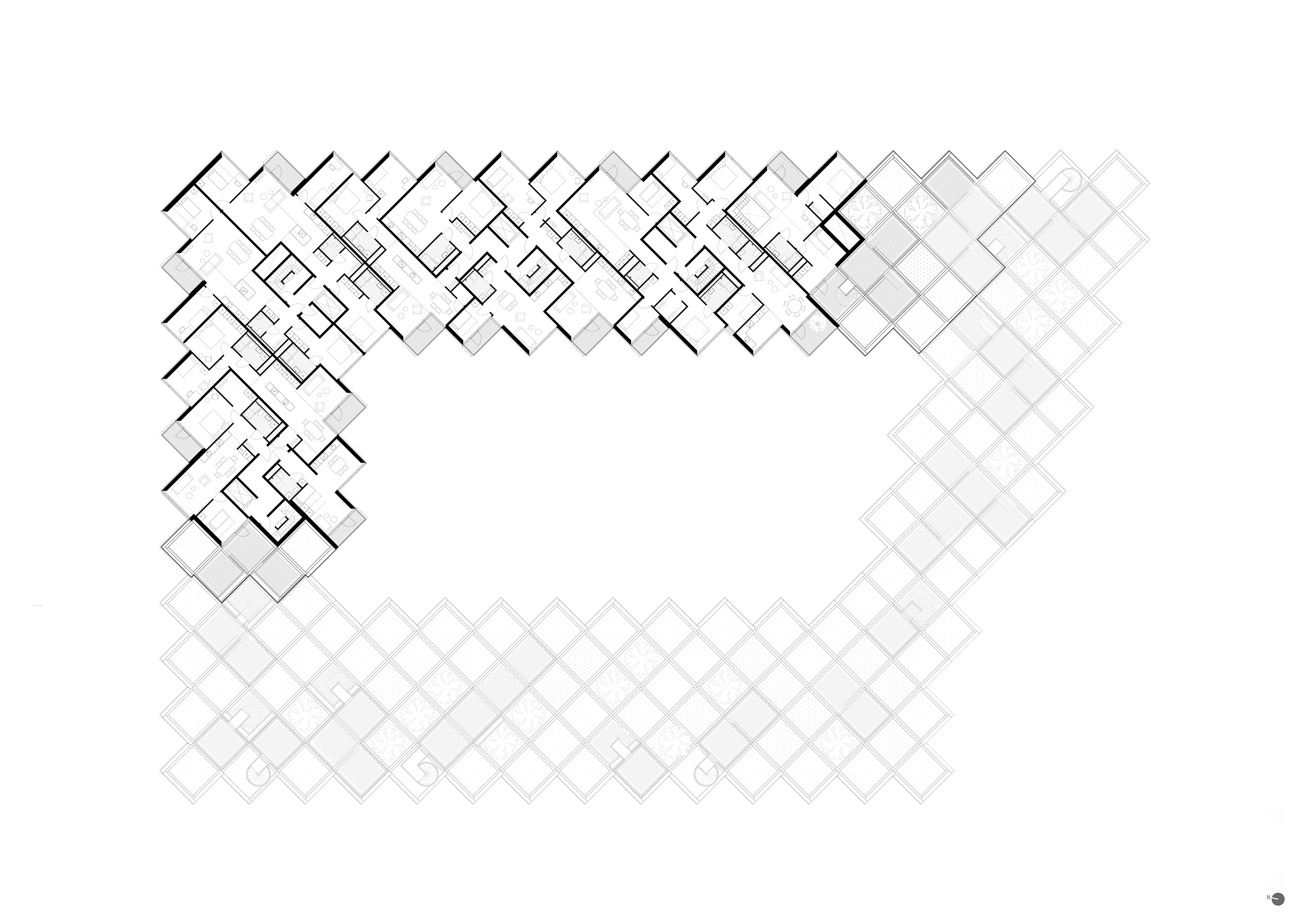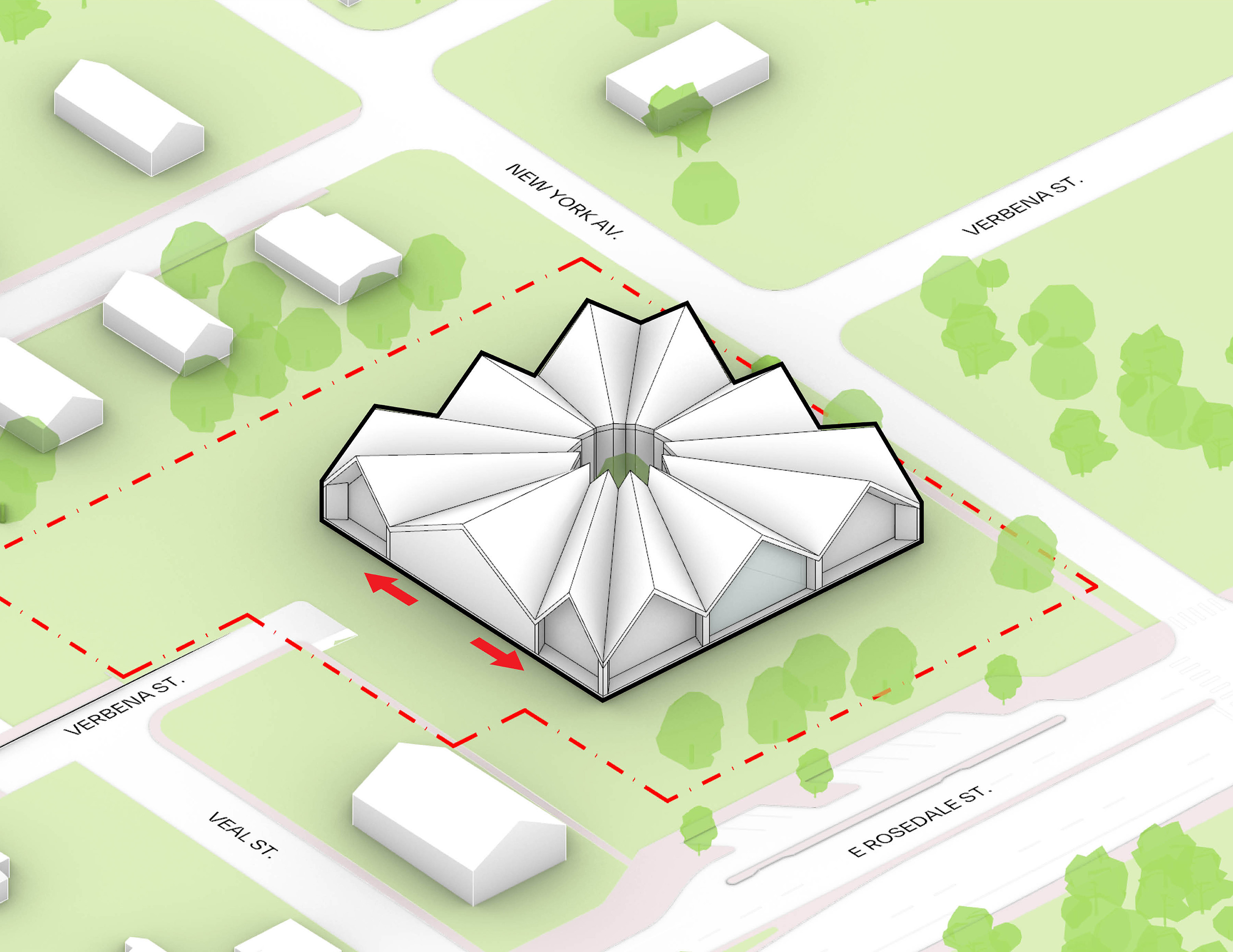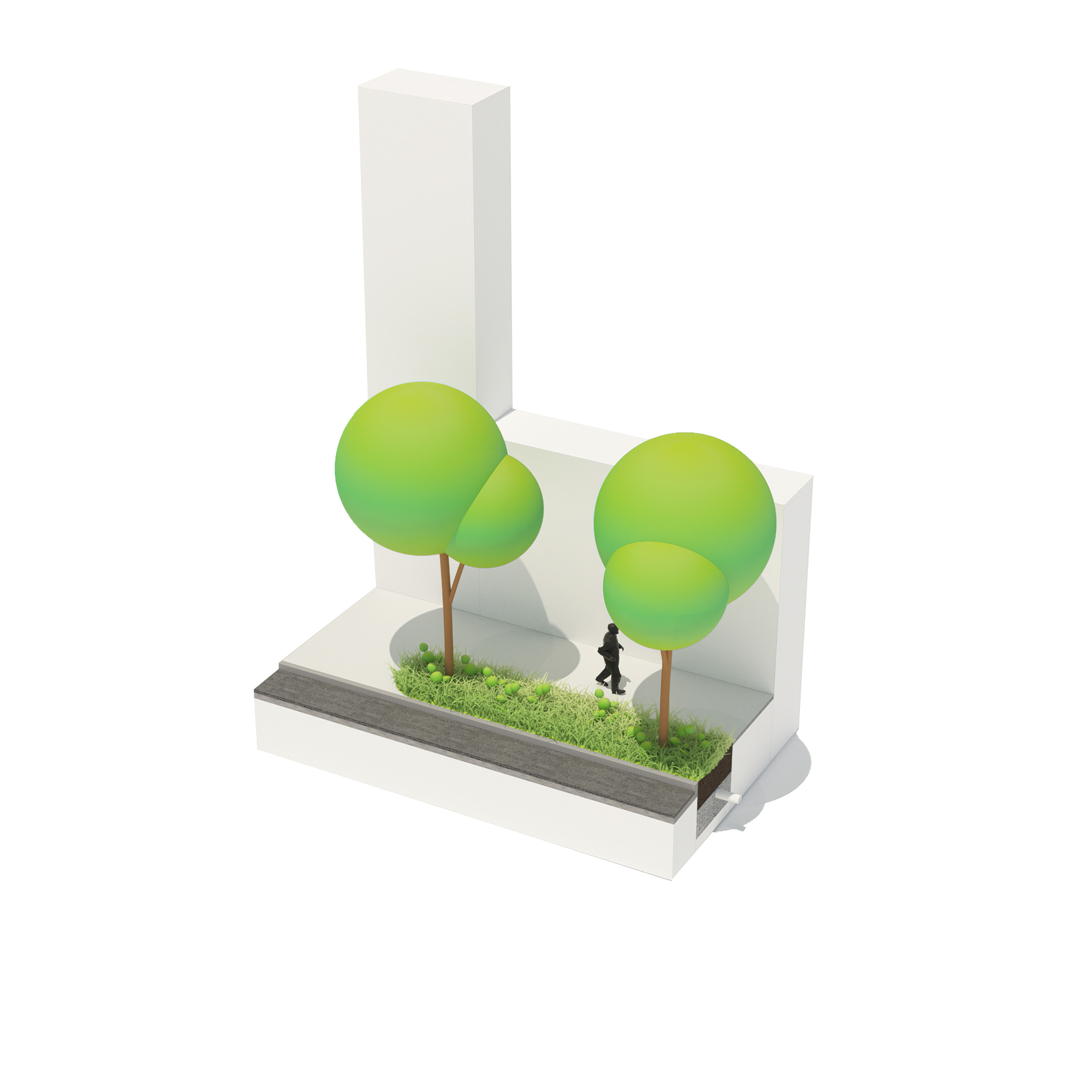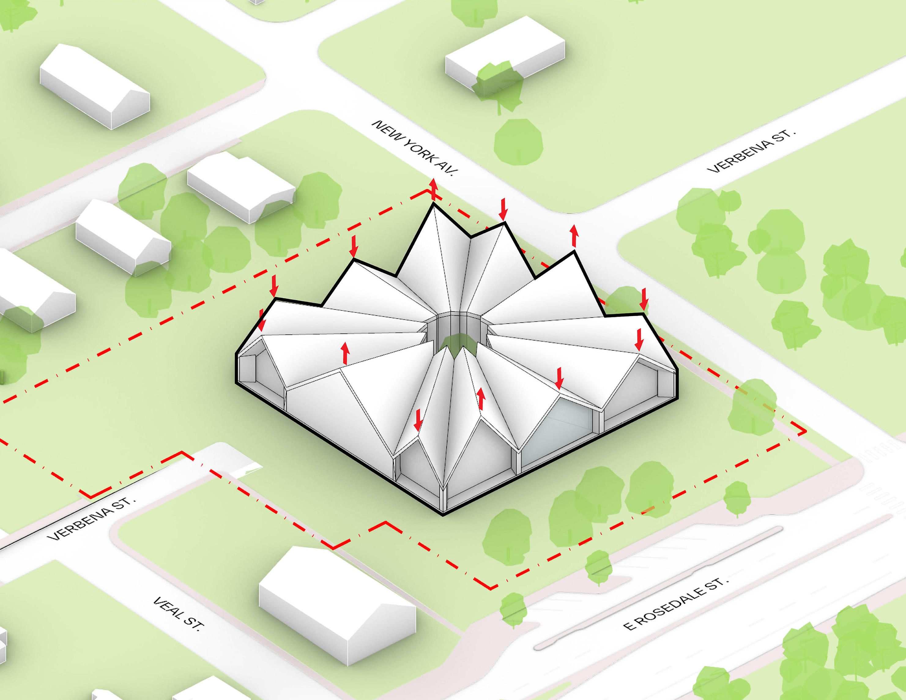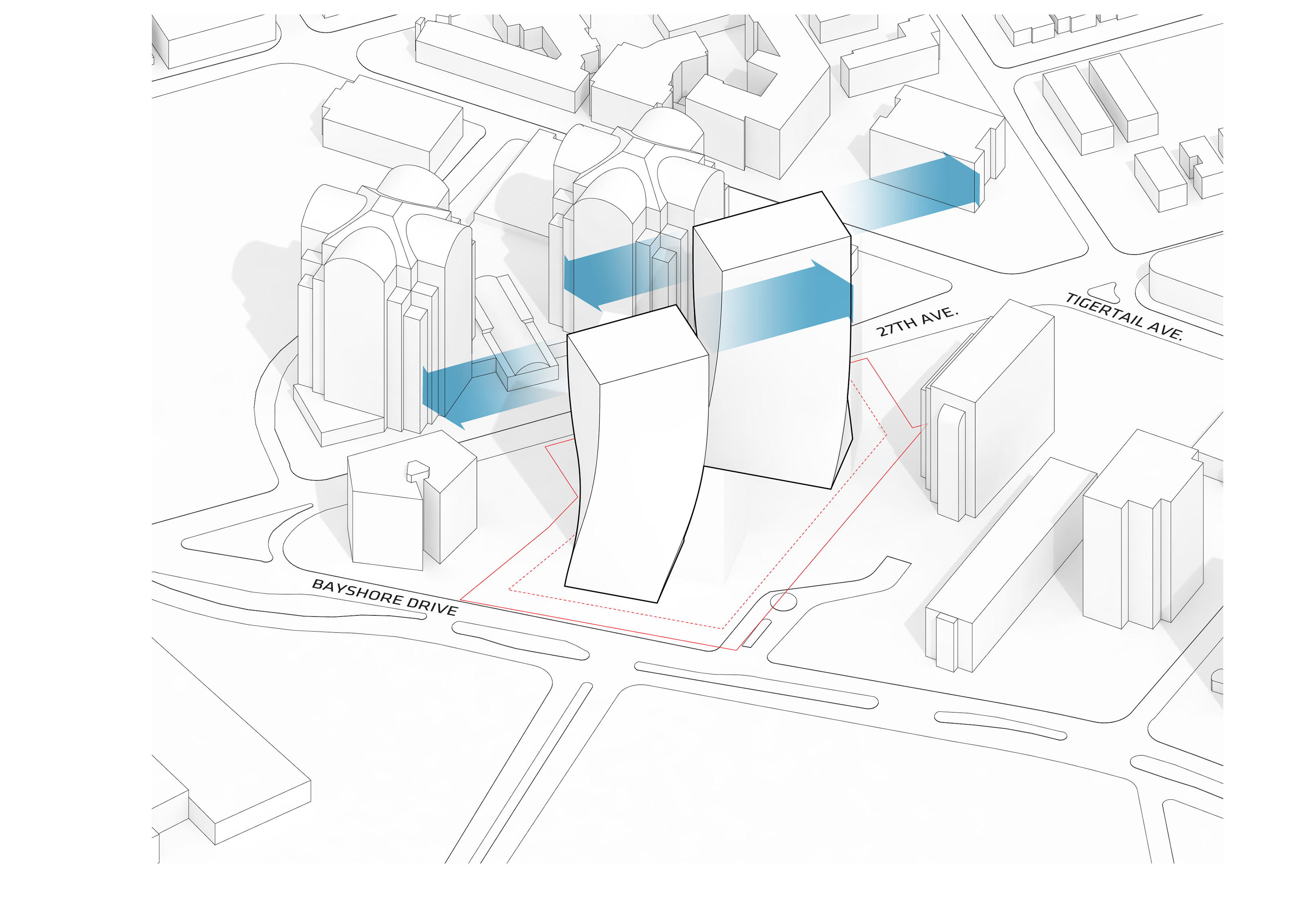 At its base, a pedestrian through-block connection forms a new gateway to the park and subway station. Throughout its height, soft openings are carved into the building mass to create eight distinct blocks. These ‘buildings within a building’ are connected by large, communal green terraces at different elevations.
