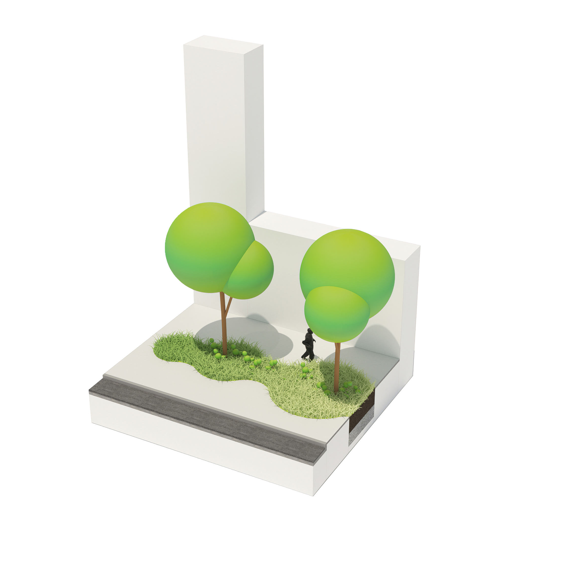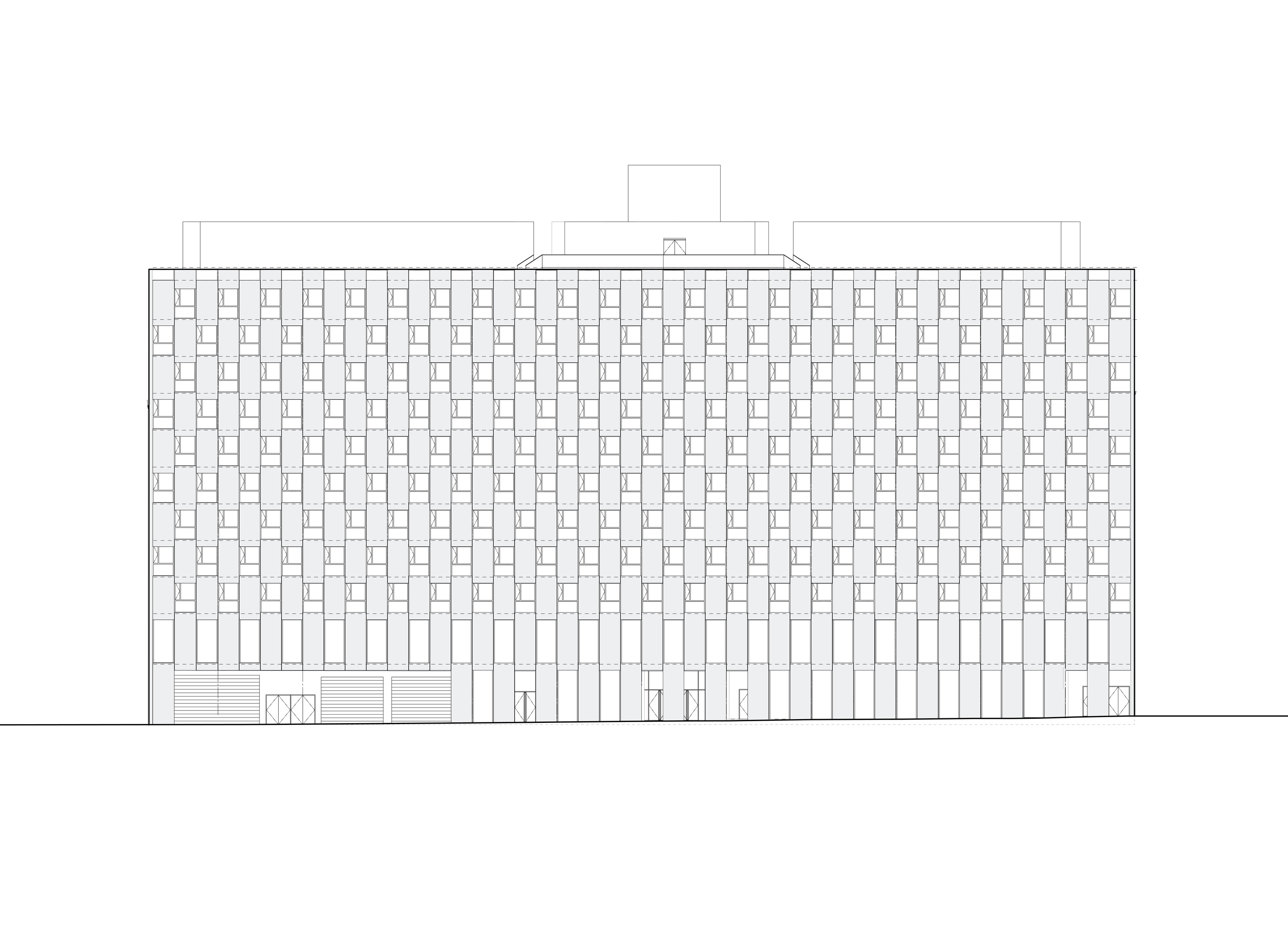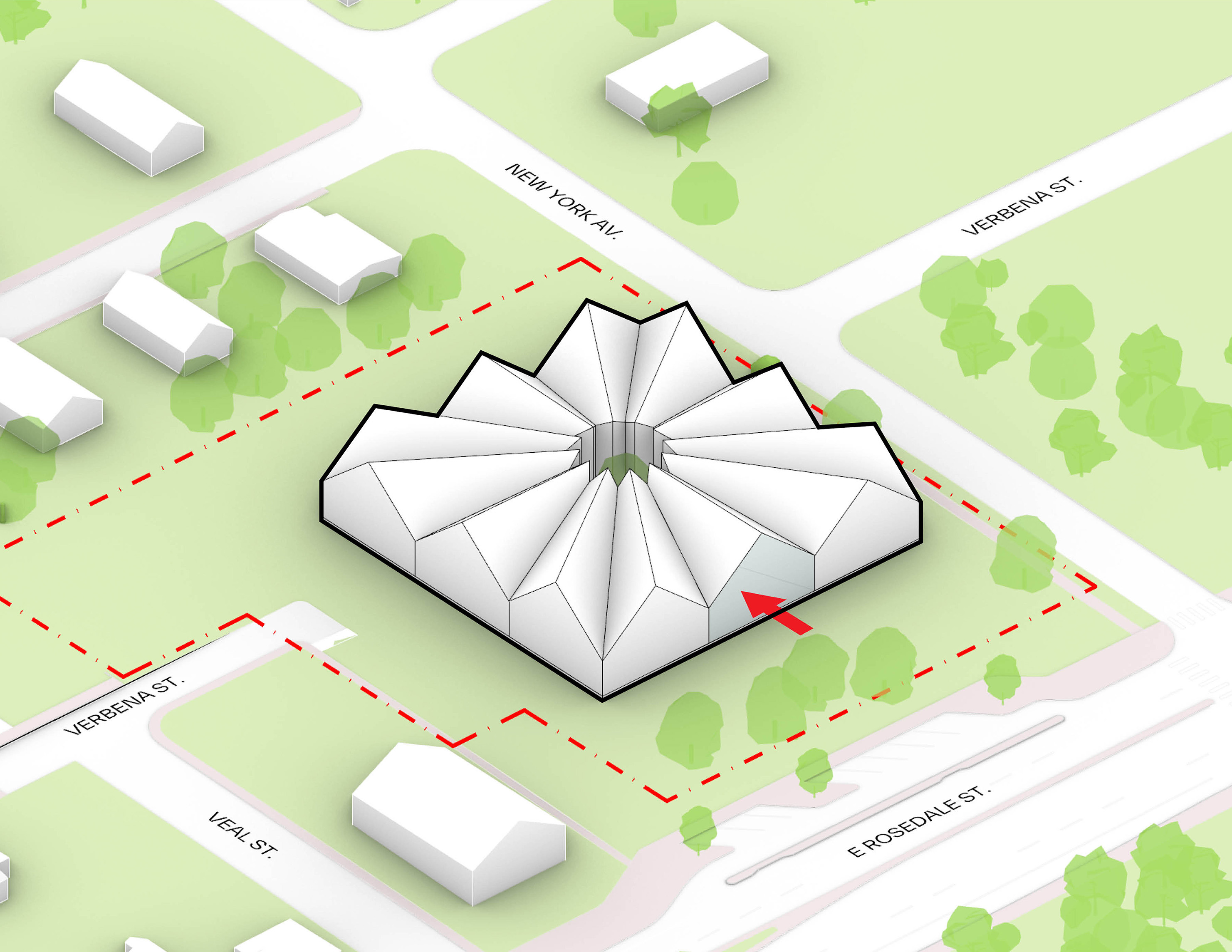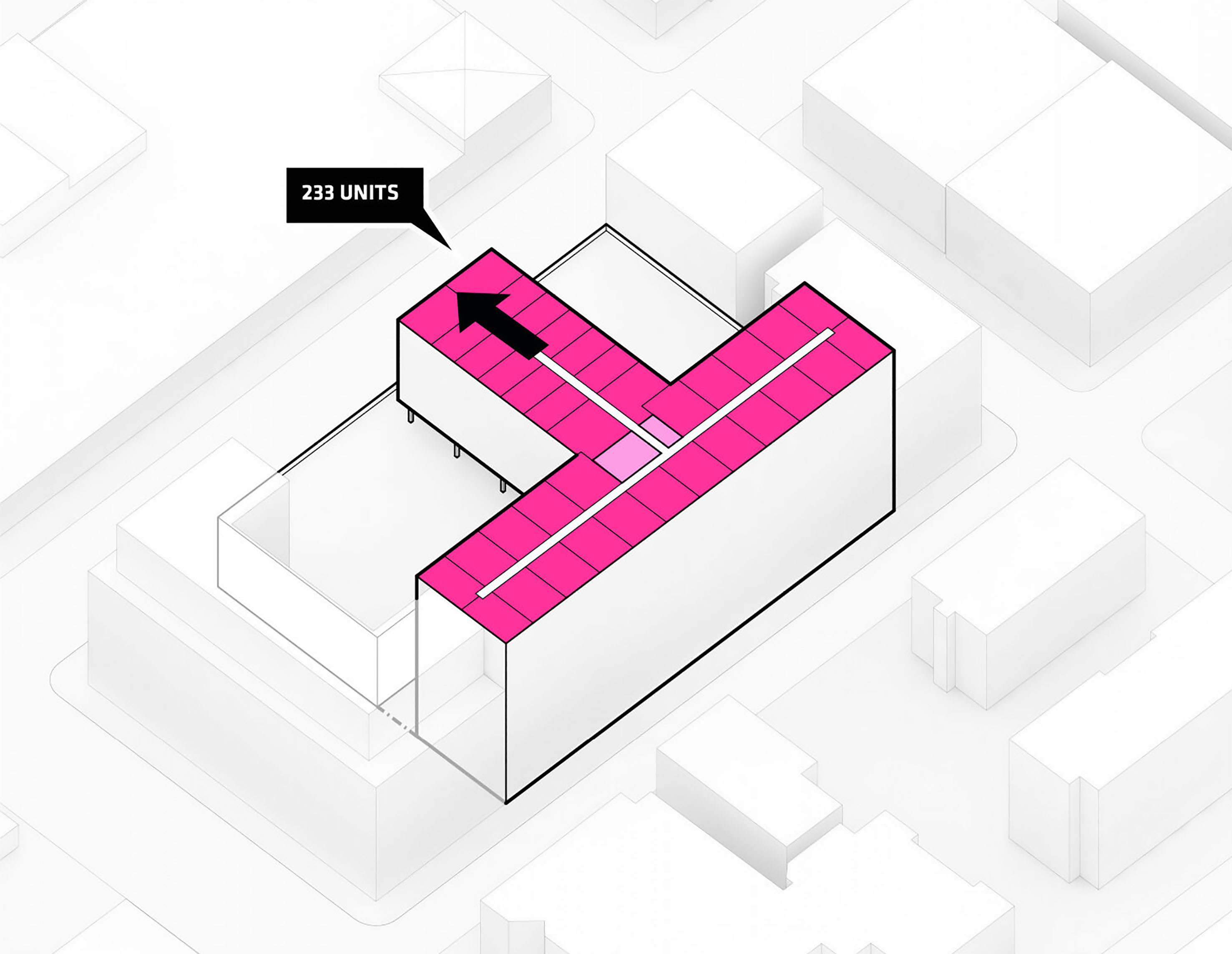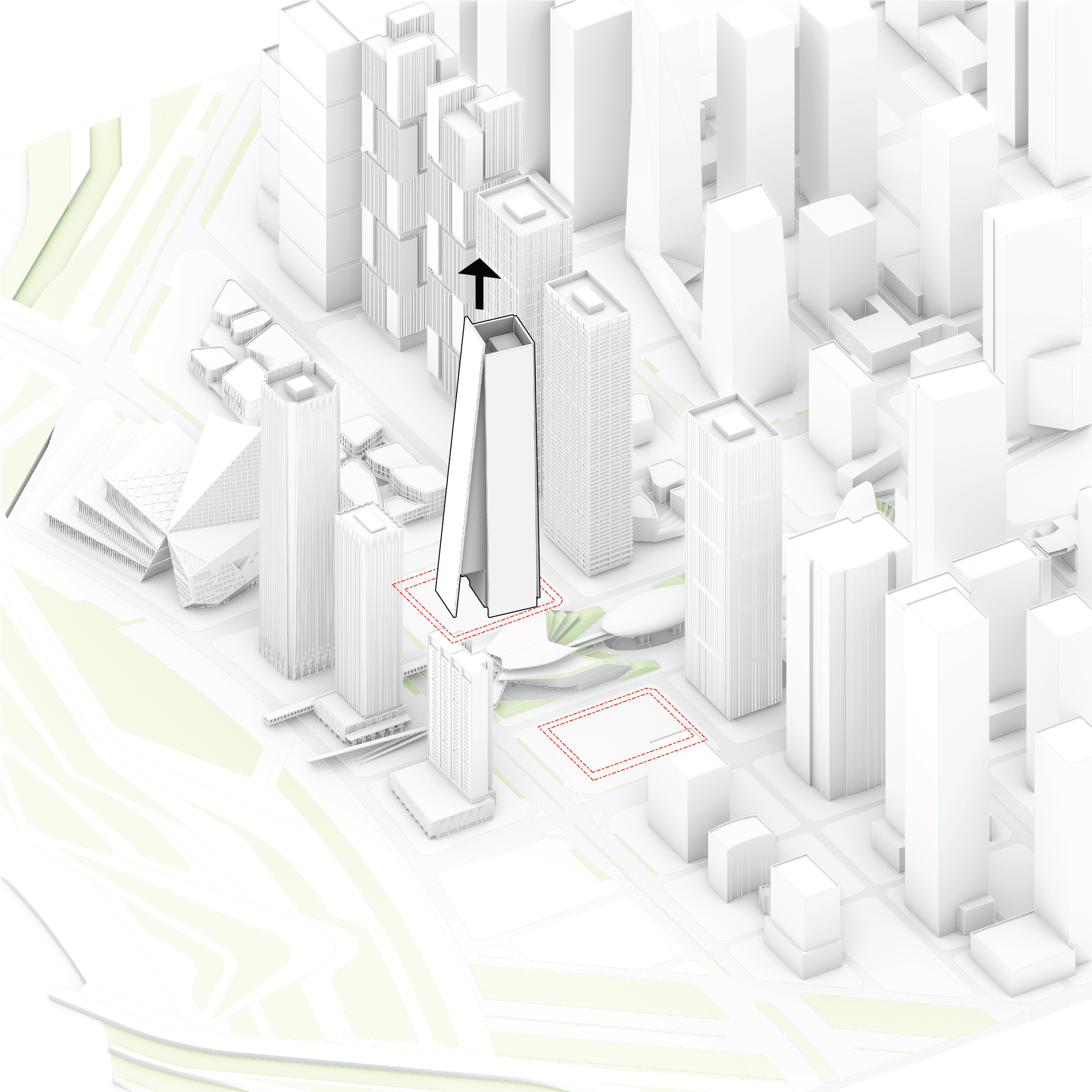 At its base, a pedestrian through-block connection forms a new gateway to the park and subway station. Throughout its height, soft openings are carved into the building mass to create eight distinct blocks. These ‘buildings within a building’ are connected by large, communal green terraces at different elevations.