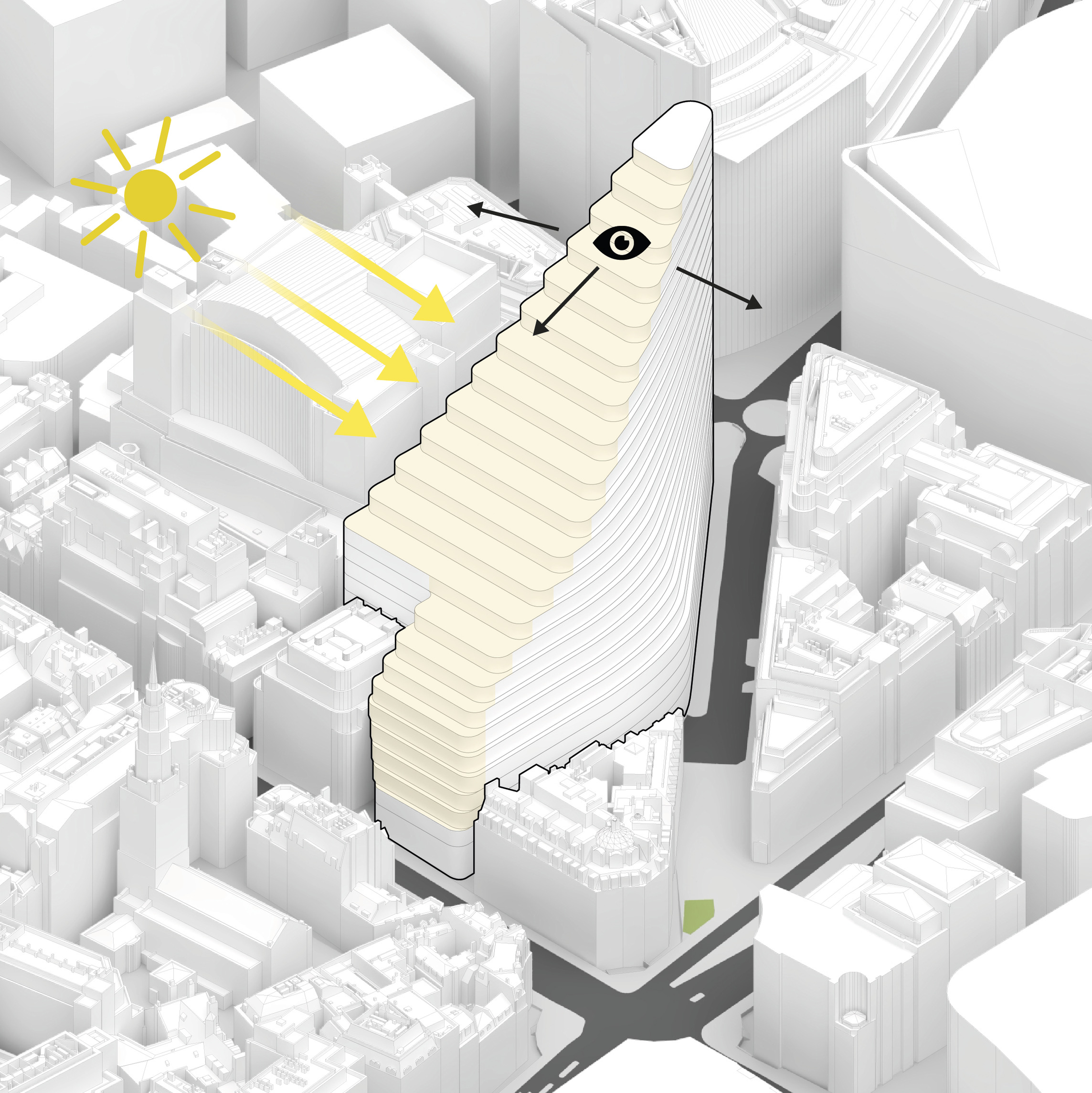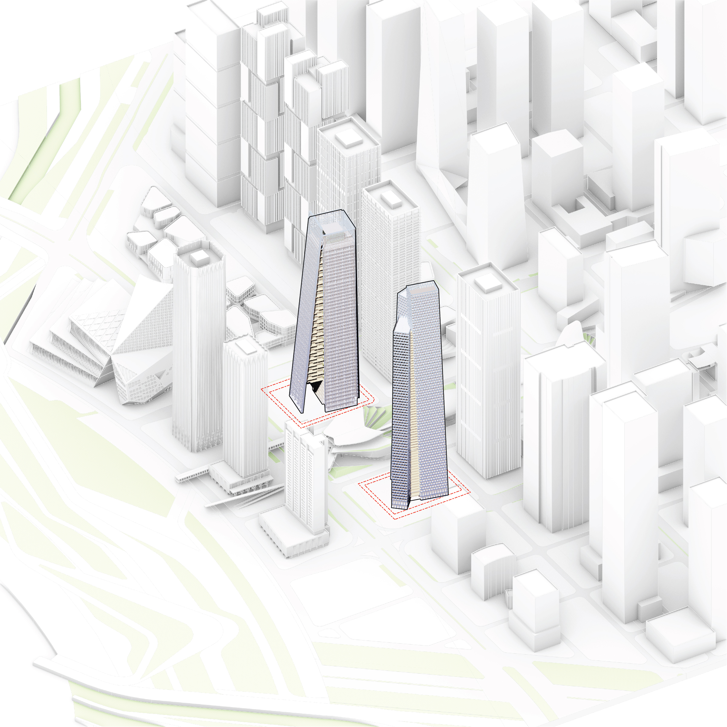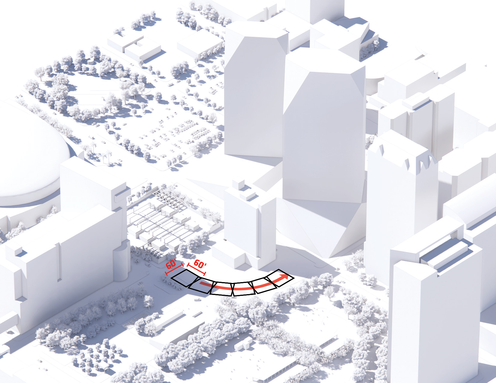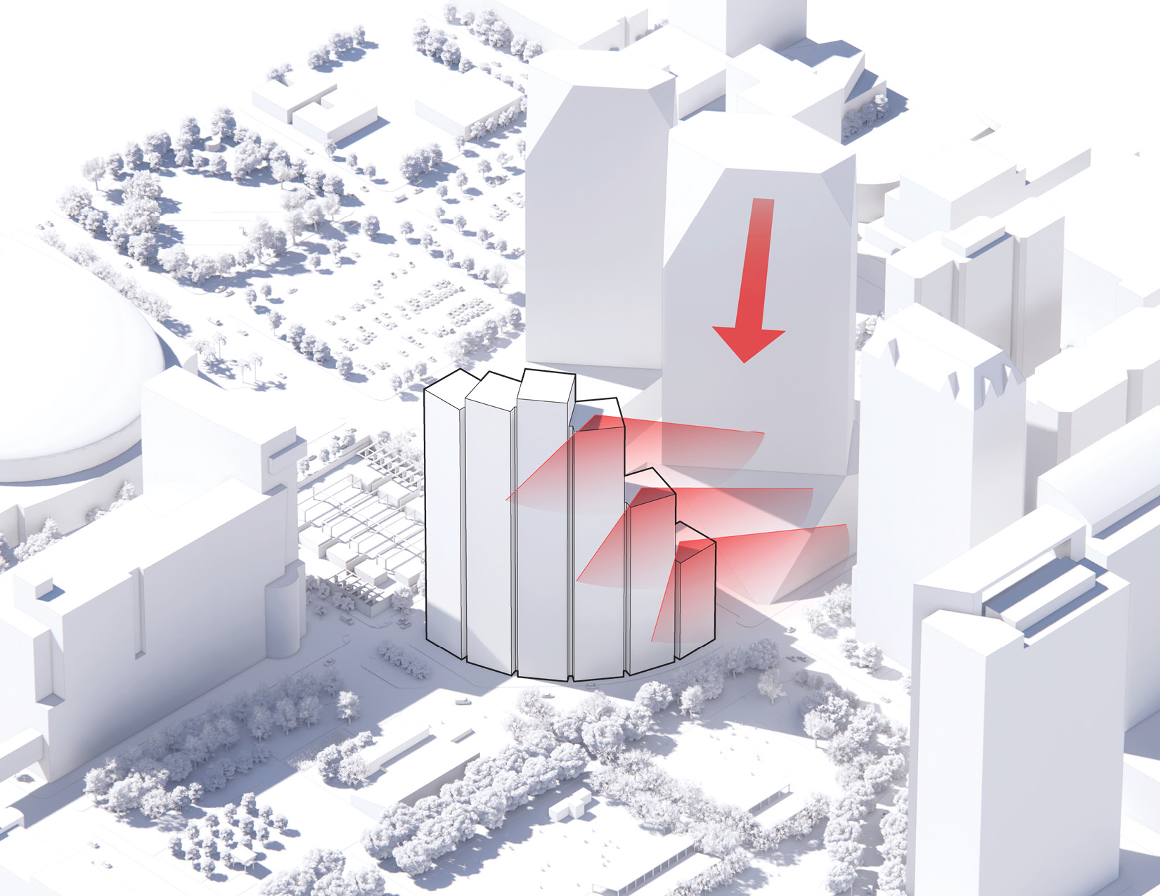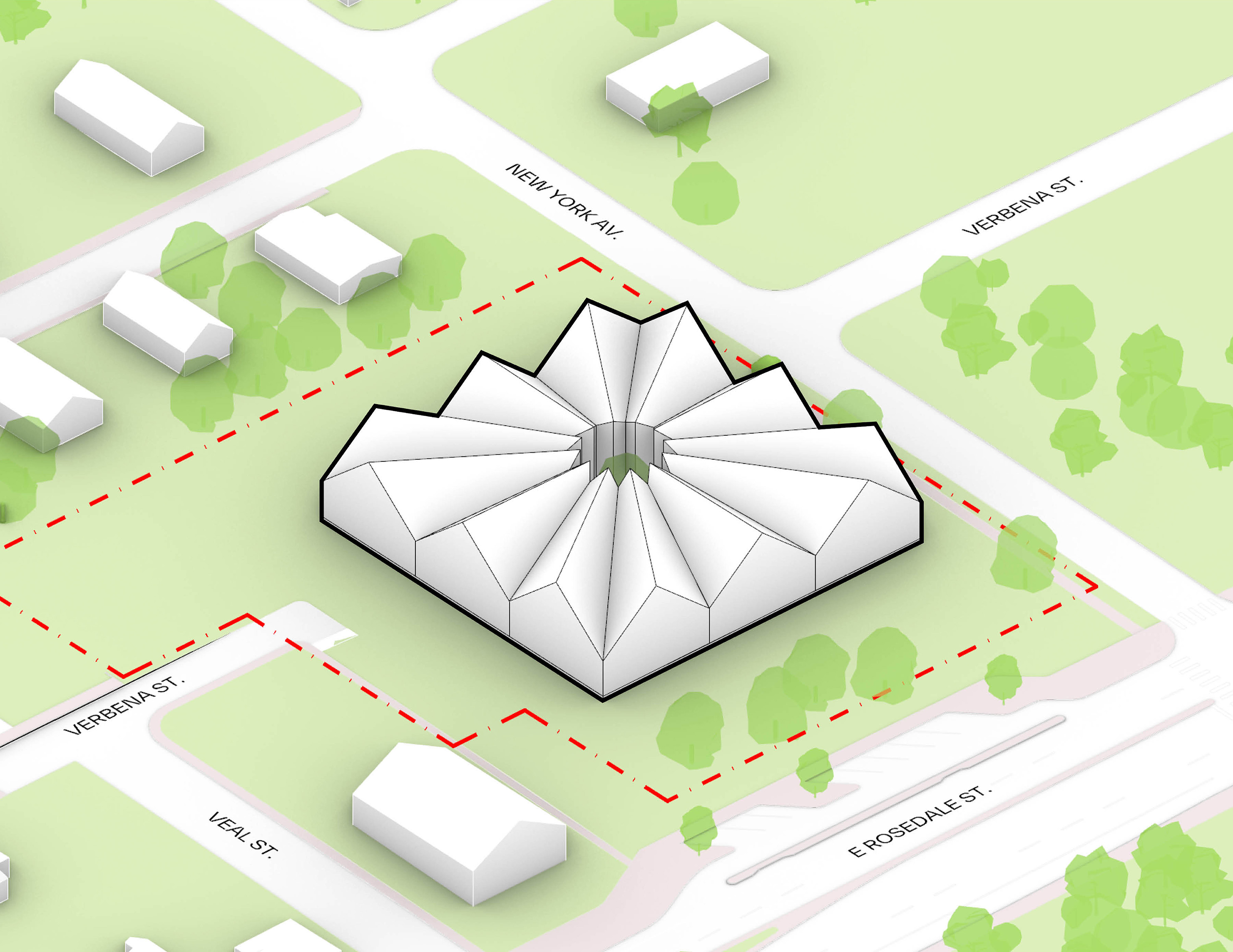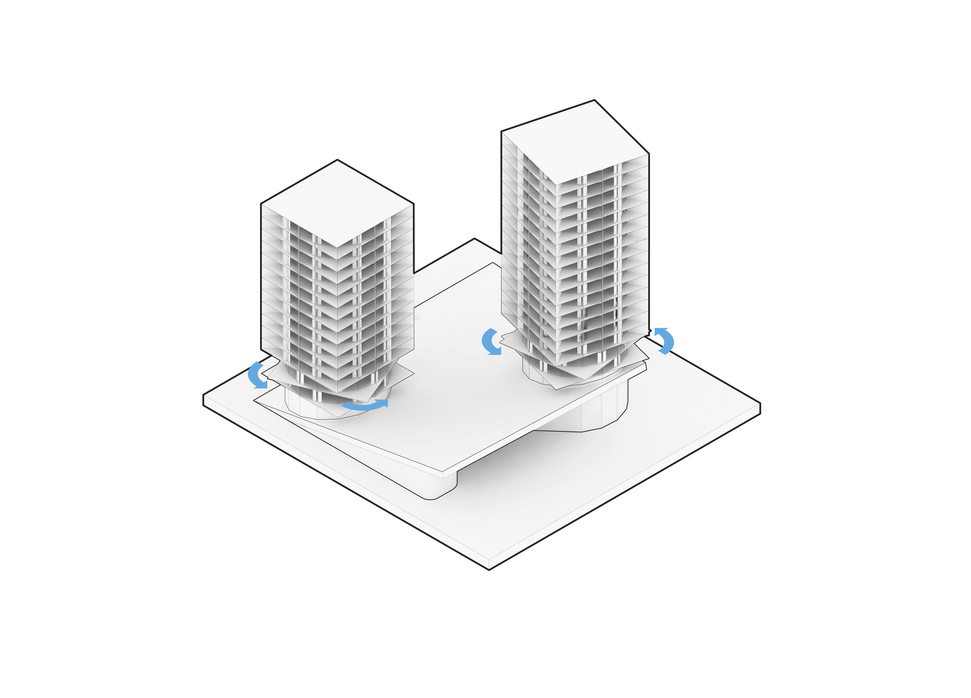 At its base, a pedestrian through-block connection forms a new gateway to the park and subway station. Throughout its height, soft openings are carved into the building mass to create eight distinct blocks. These ‘buildings within a building’ are connected by large, communal green terraces at different elevations.