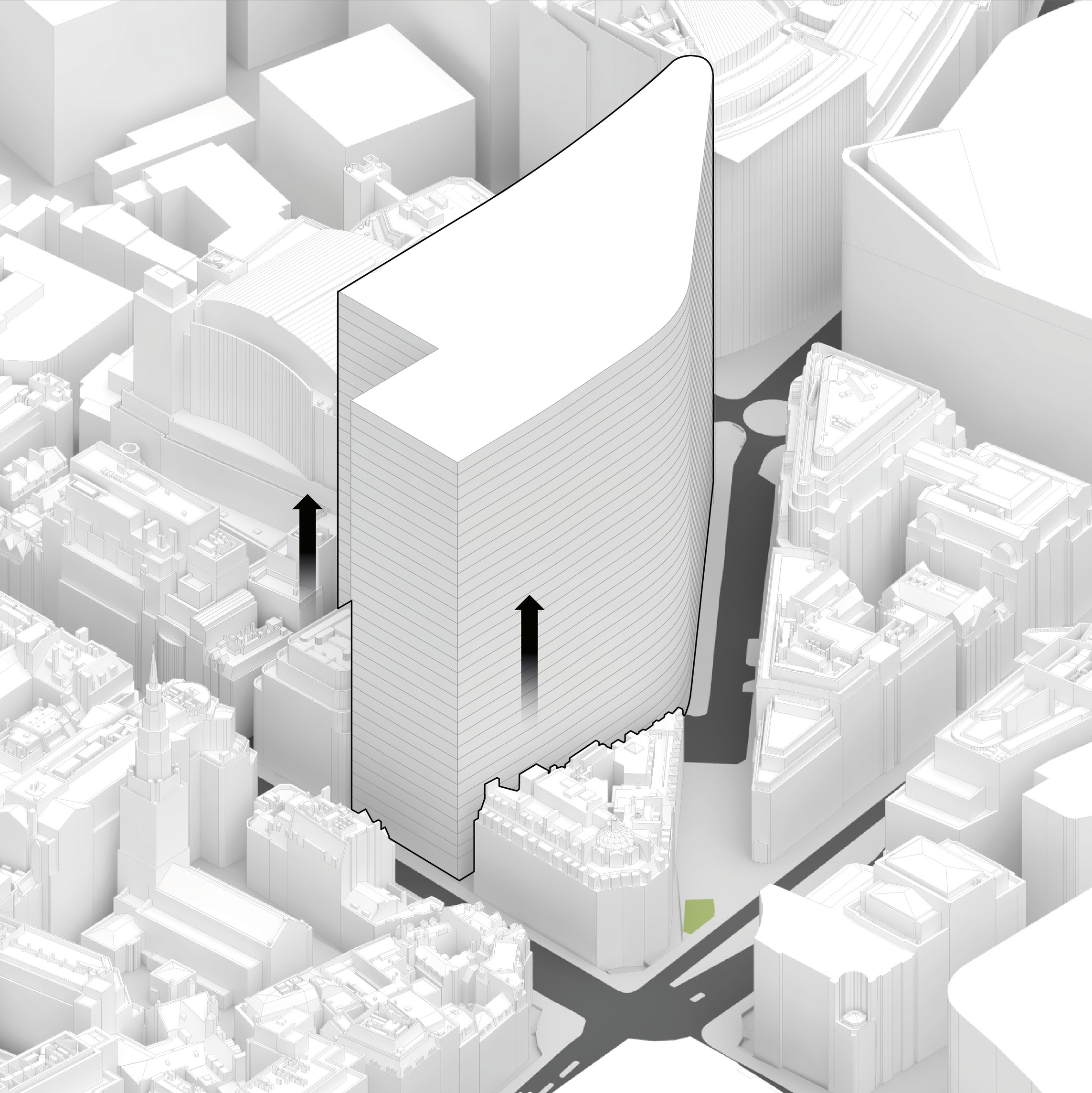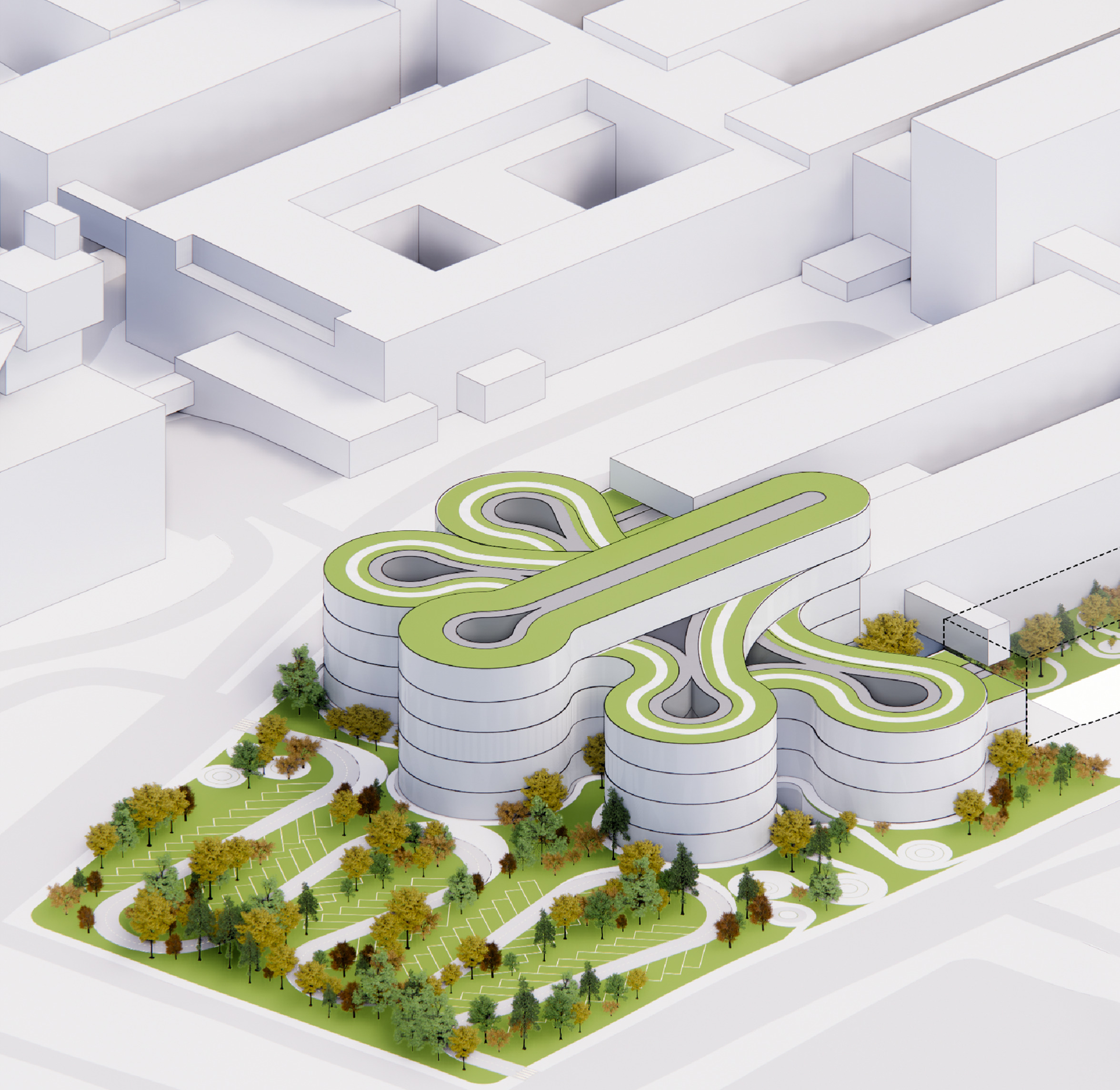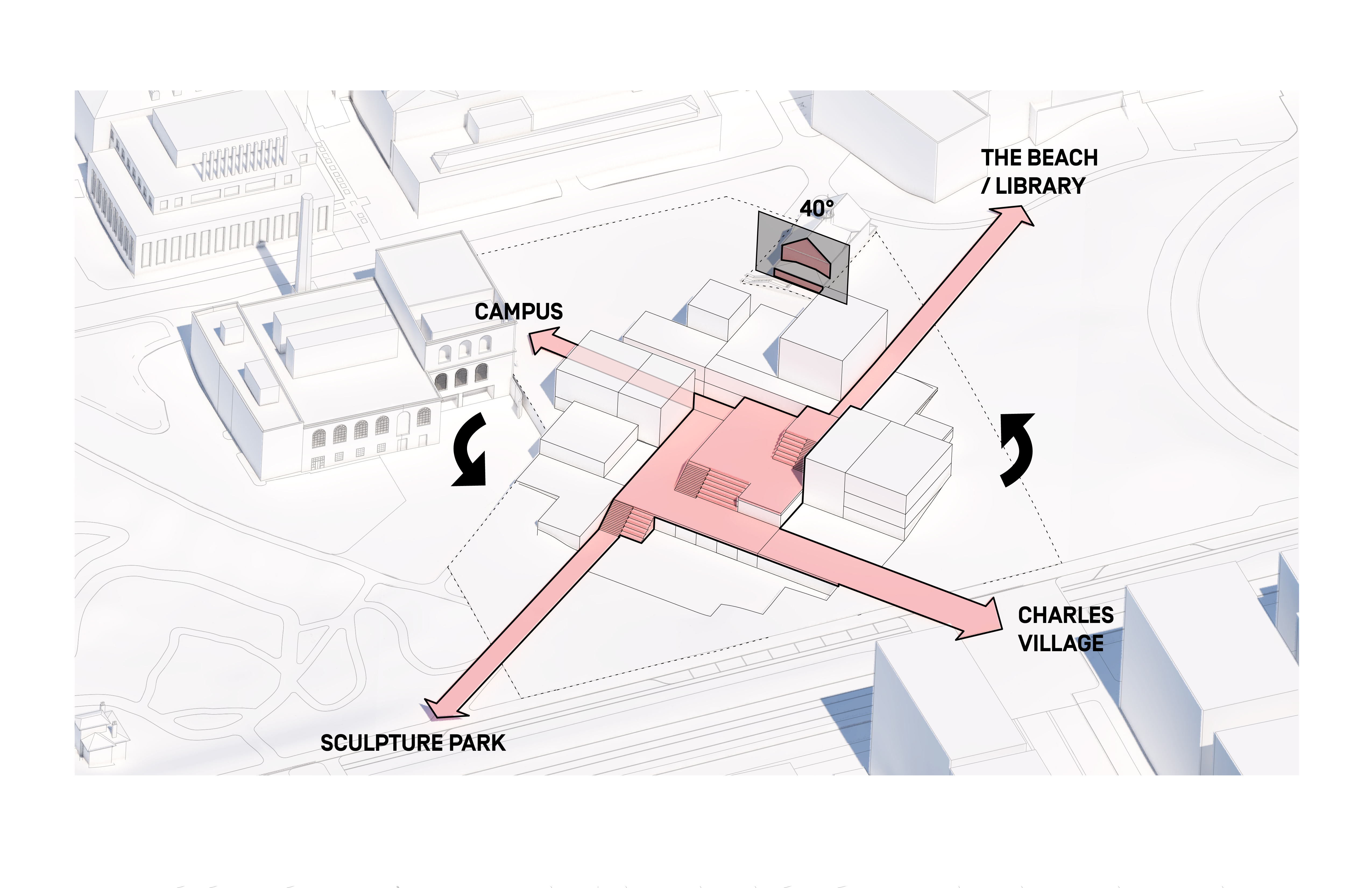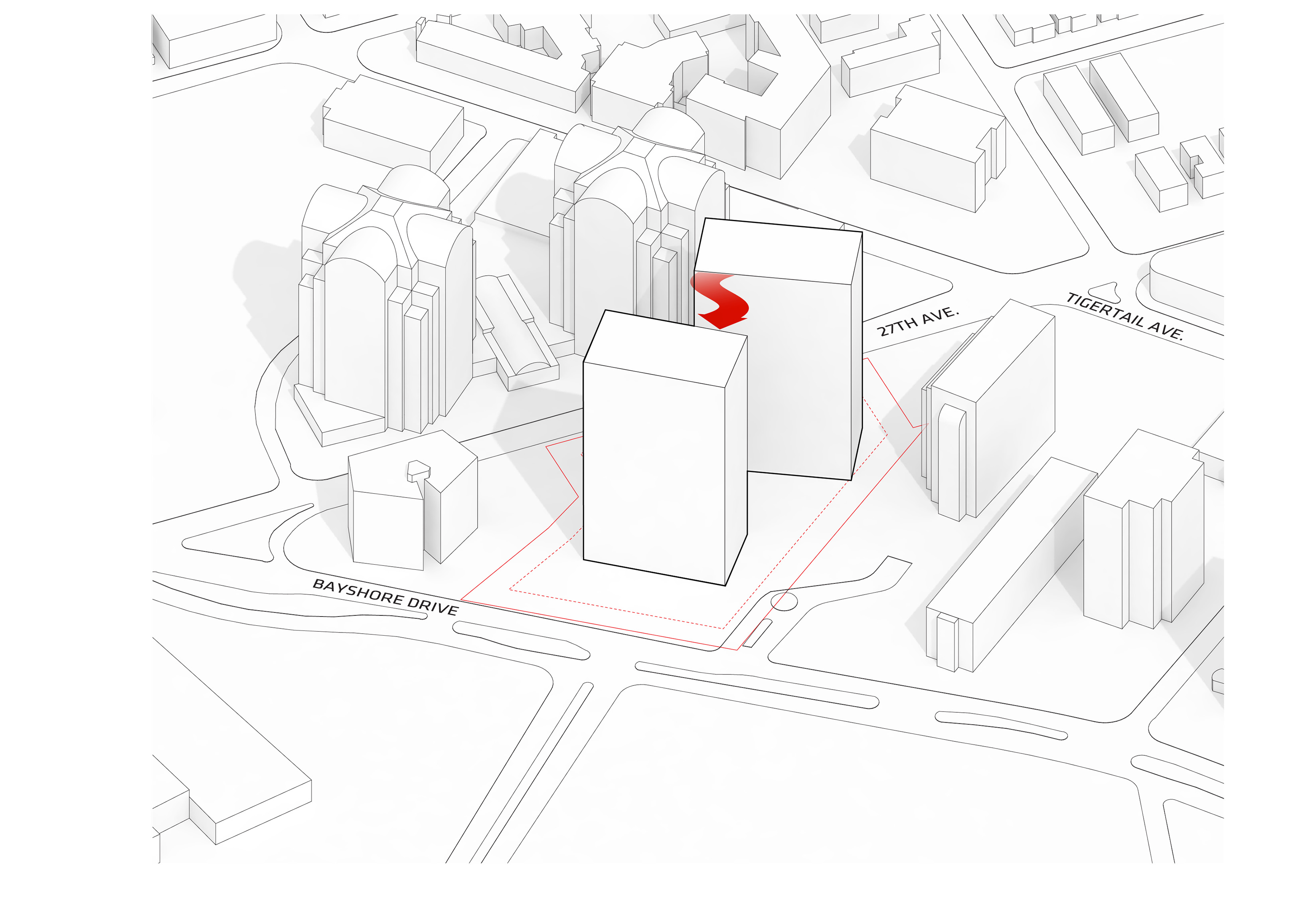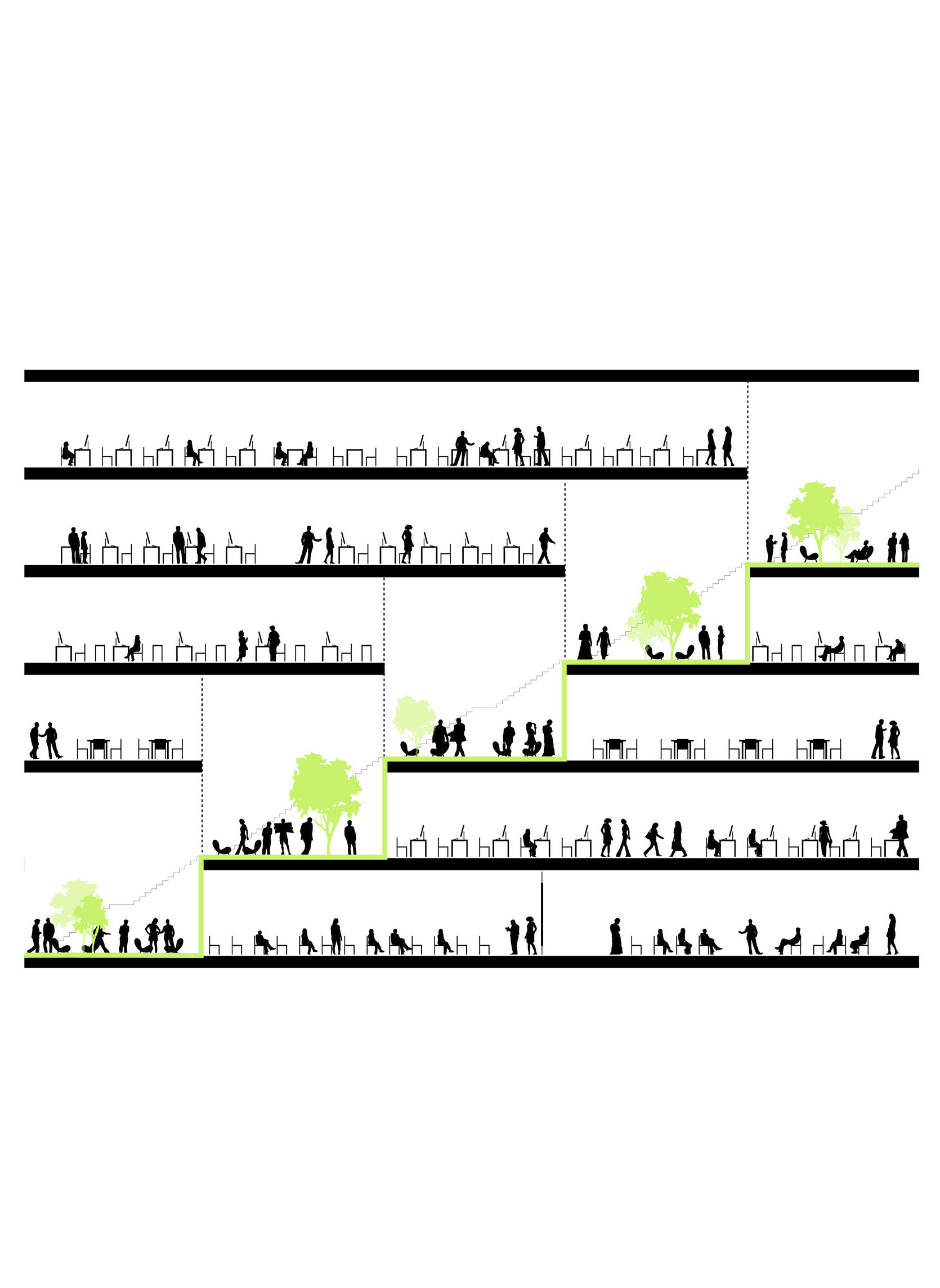 At its base, a pedestrian through-block connection forms a new gateway to the park and subway station. Throughout its height, soft openings are carved into the building mass to create eight distinct blocks. These ‘buildings within a building’ are connected by large, communal green terraces at different elevations.
