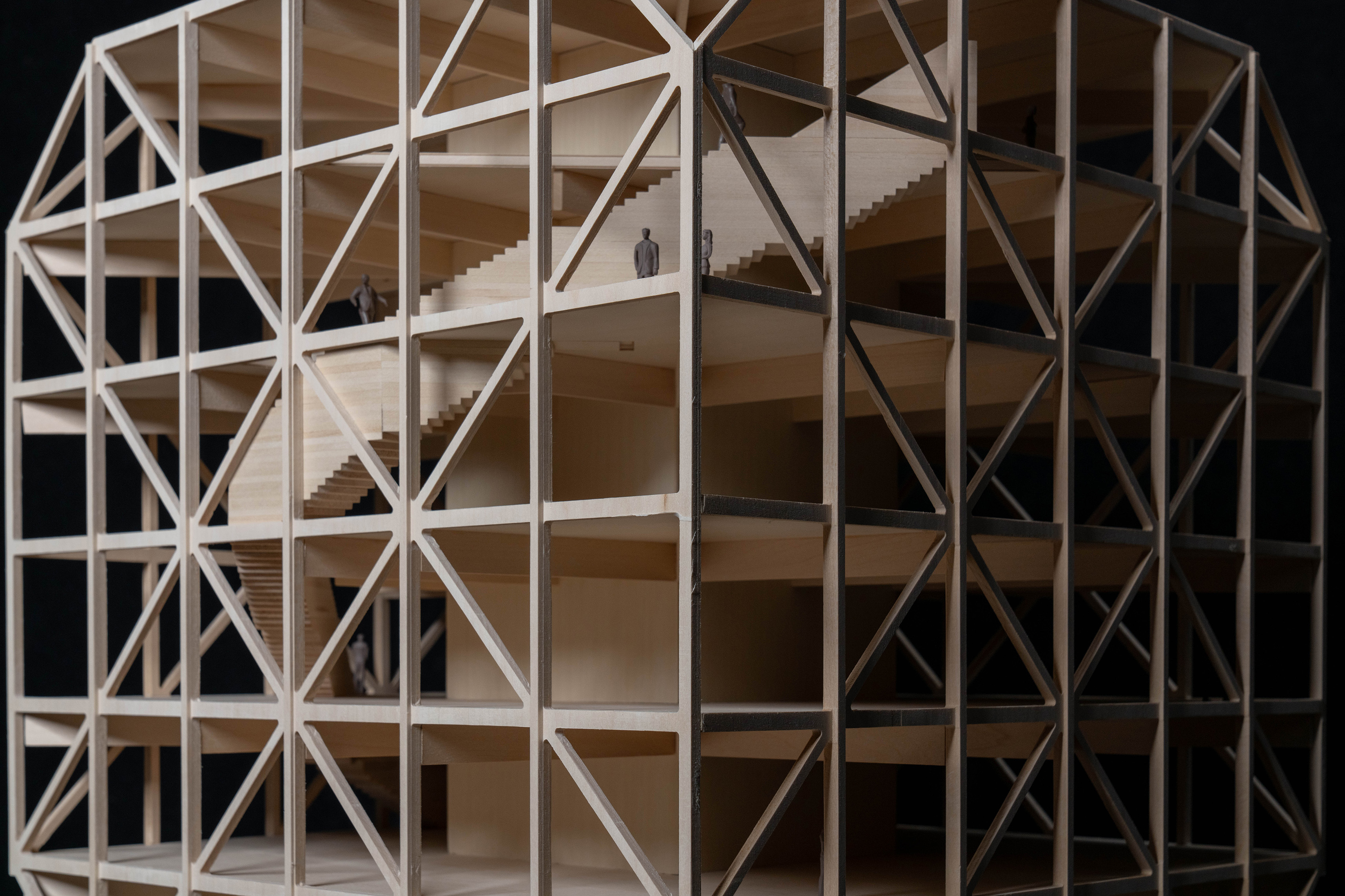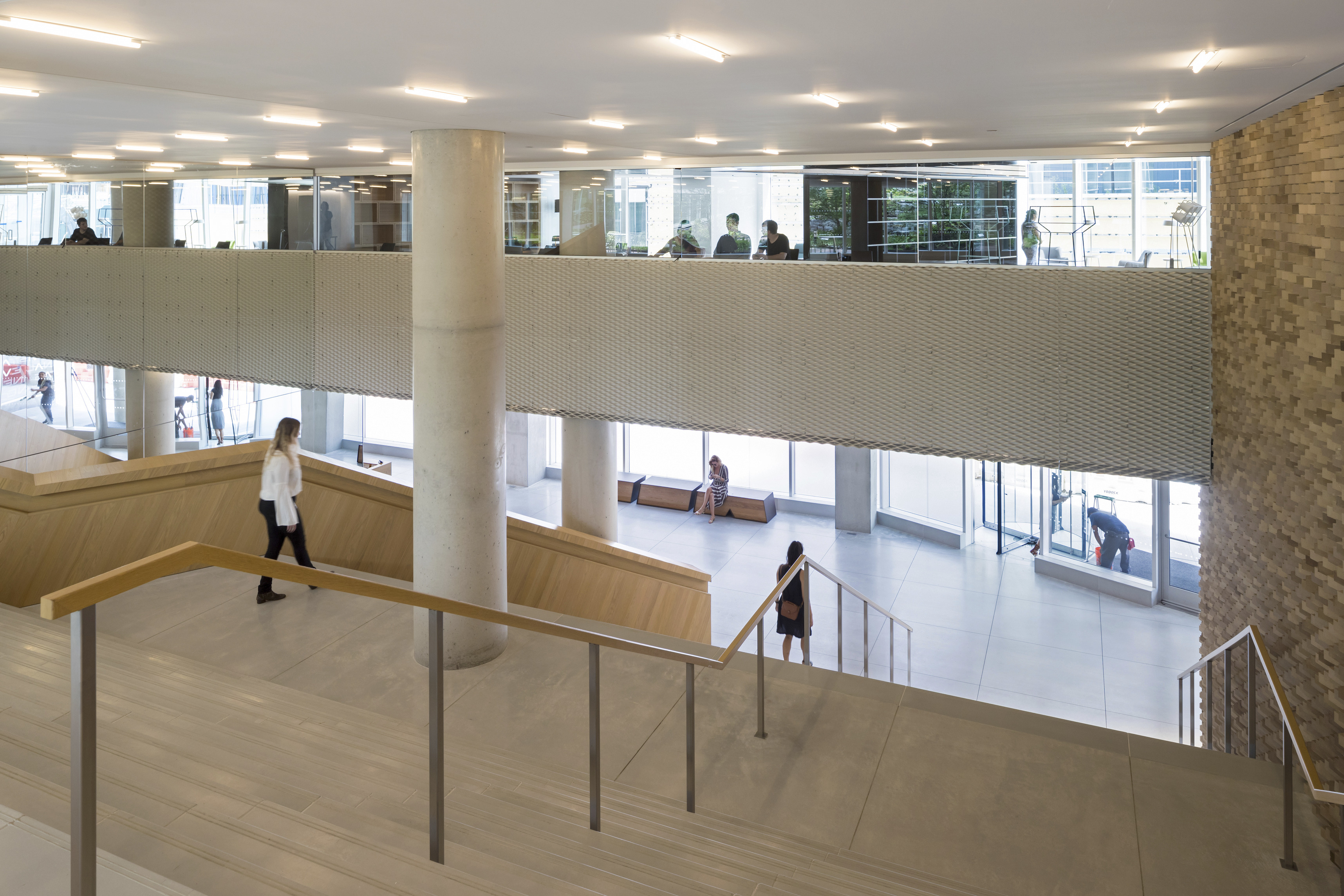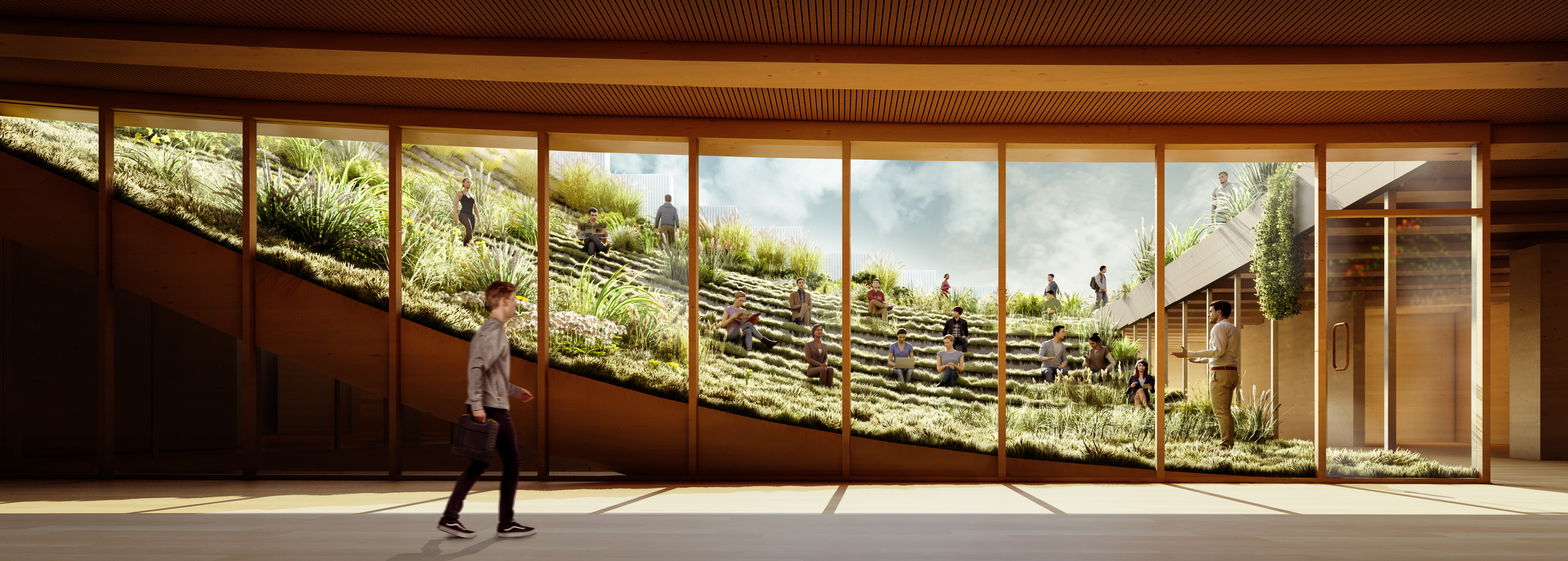 Inside, each level bridges the level below, supported by triangular steel trusses clad in Douglas fir. The texture, rhythm, and geometry of the trusses carry through to the exterior, creating a seamless transition from inside to outside. The atrium features a large staircase meant for socializing and relaxing that connects the first two floors and a café, creating a lively hub in the center of the building.