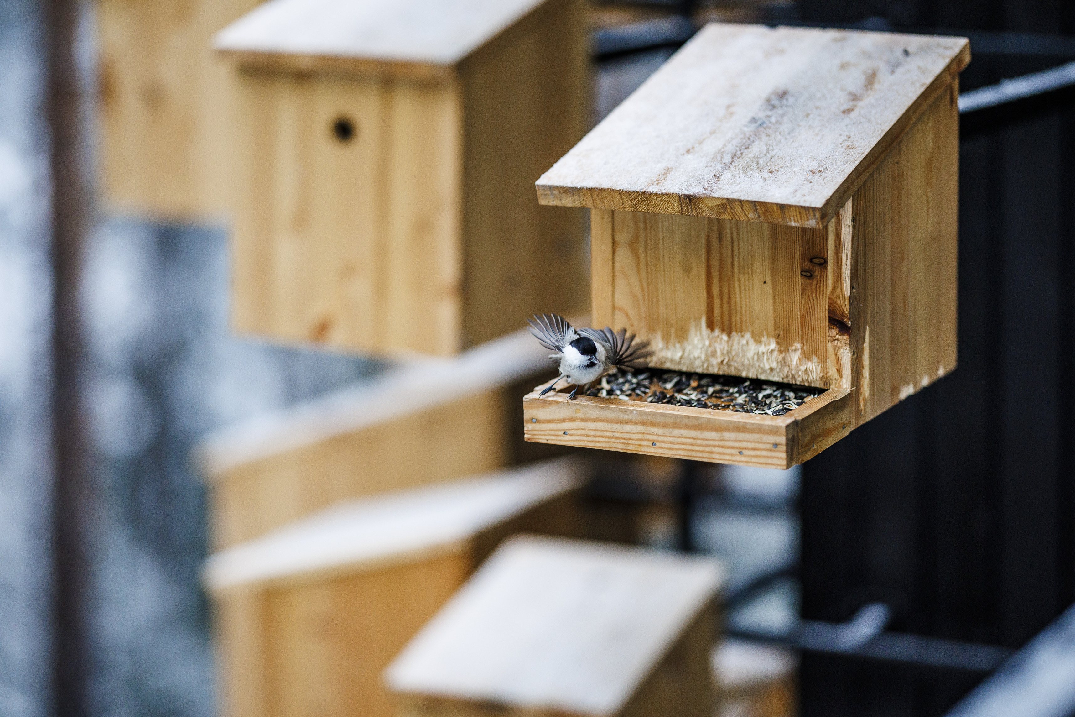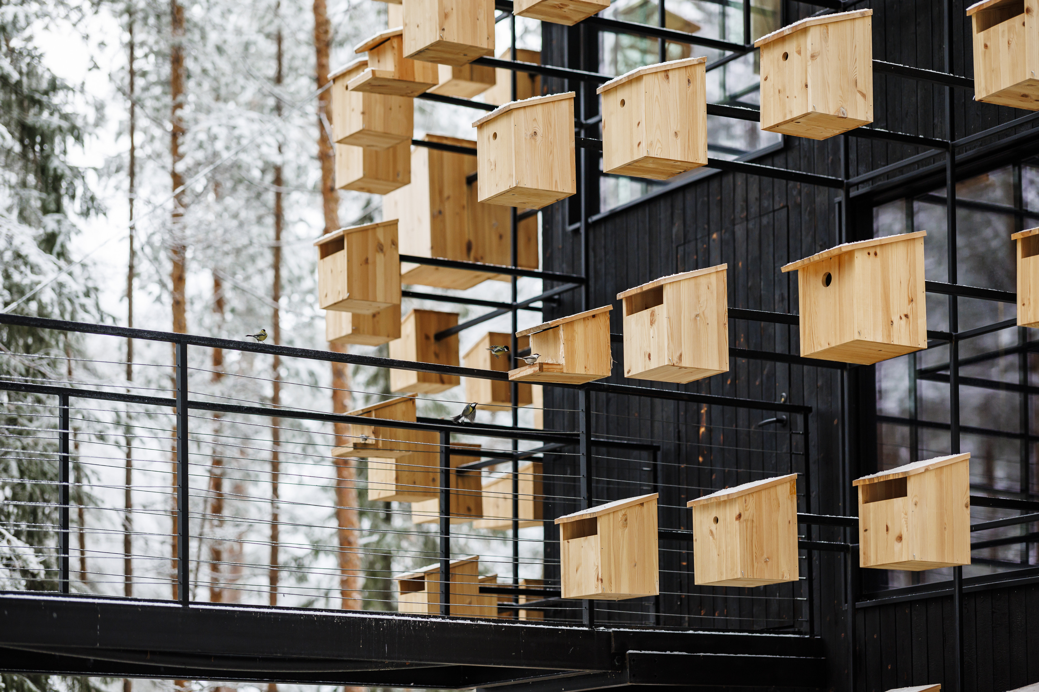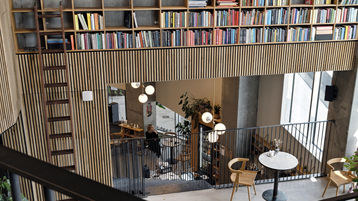 Inside, each level bridges the level below, supported by triangular steel trusses clad in Douglas fir. The texture, rhythm, and geometry of the trusses carry through to the exterior, creating a seamless transition from inside to outside. The atrium features a large staircase meant for socializing and relaxing that connects the first two floors and a café, creating a lively hub in the center of the building.