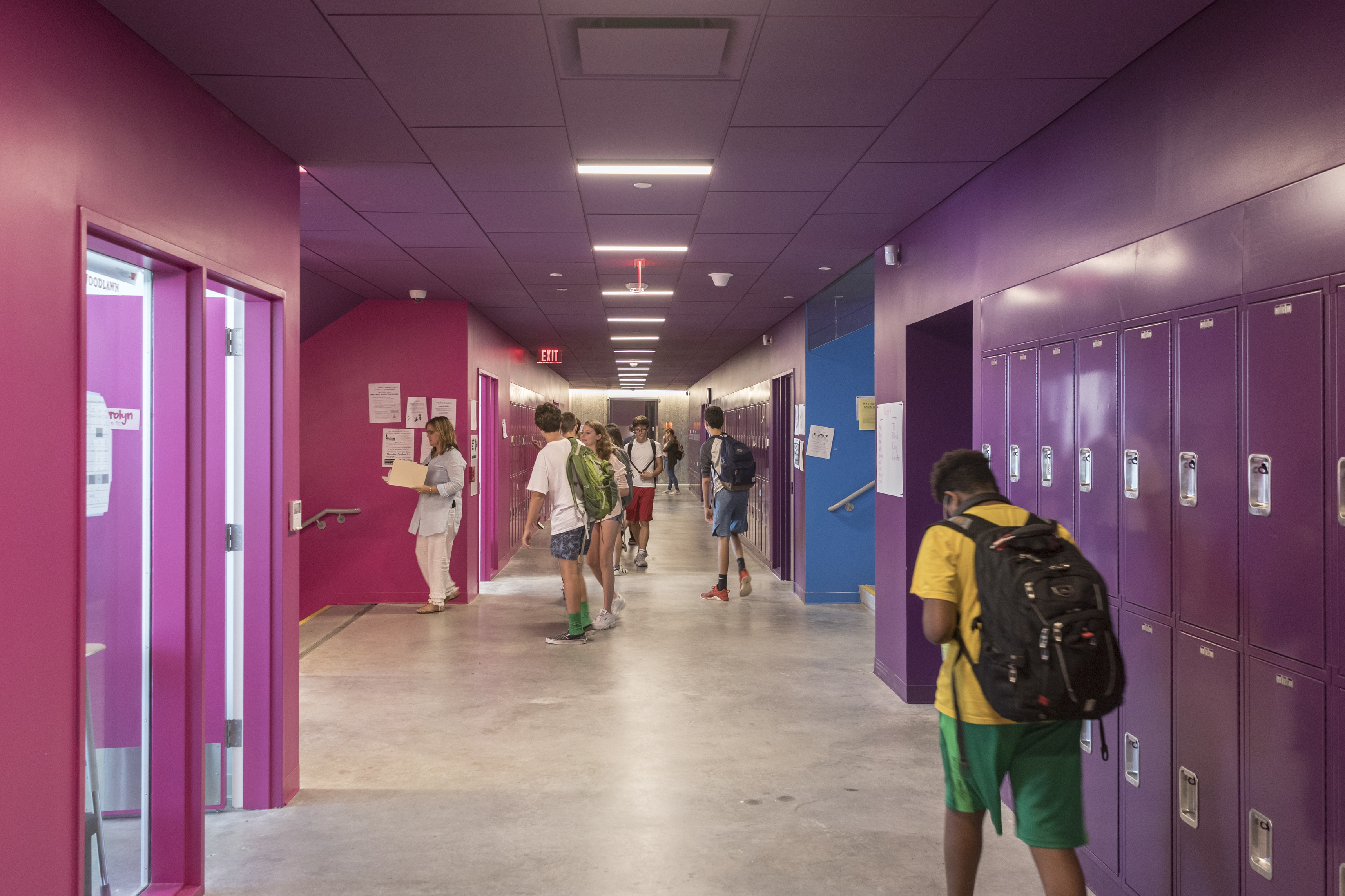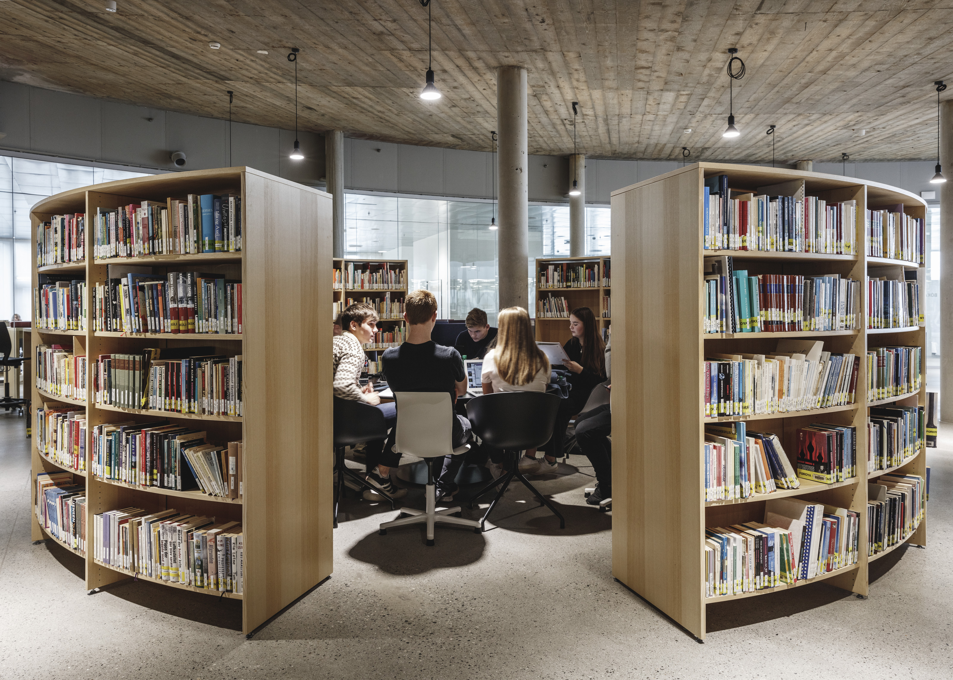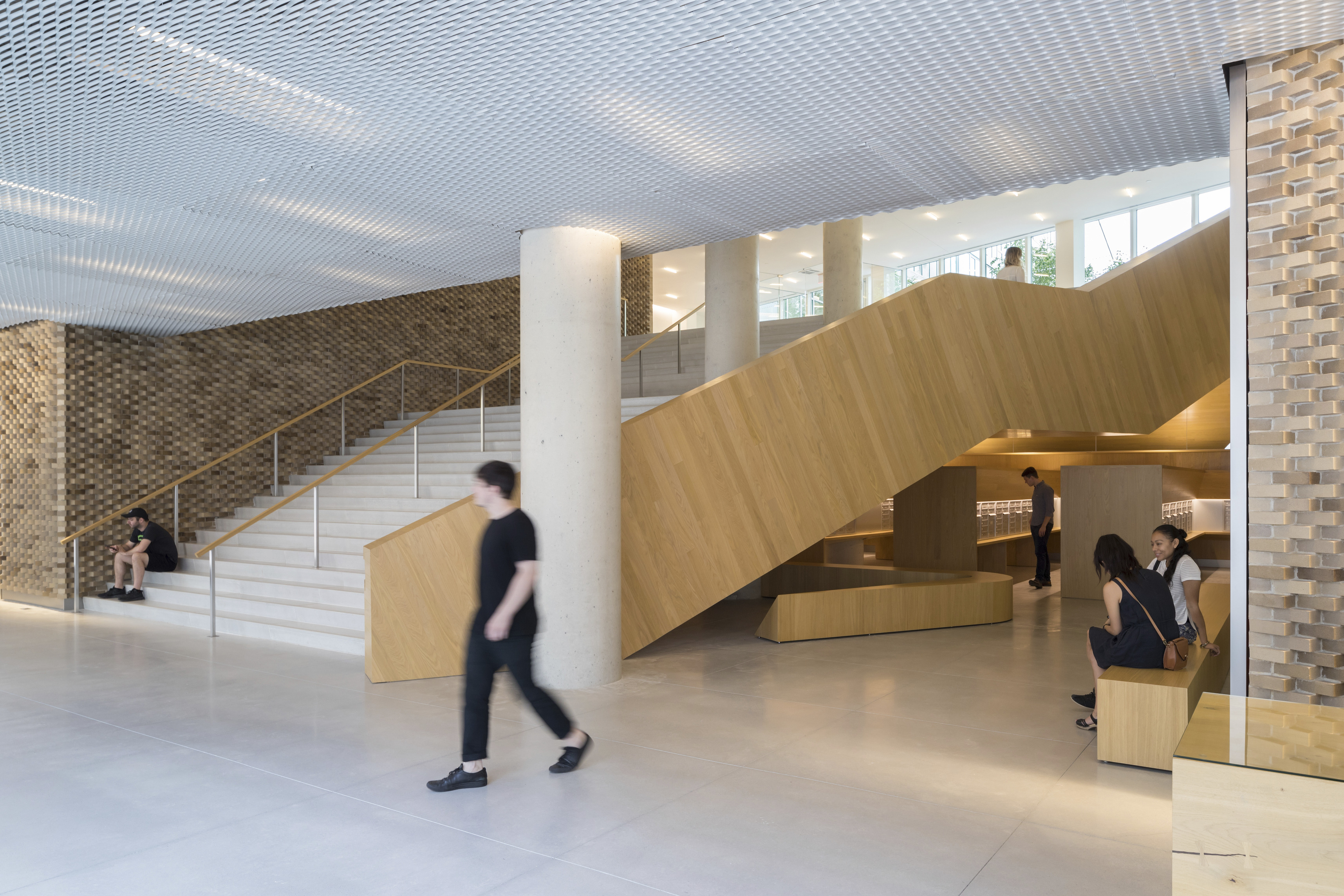 A forest of columns supports 29 “floating” cantilevered roof planes wrapped in glass shapes an interior that blurs the boundary between indoors and out. Shaped through in-depth research into the students’ needs, the building is transparent by design, welcoming daylight from all sides and offering views into the ever-changing mosaic of student life within.