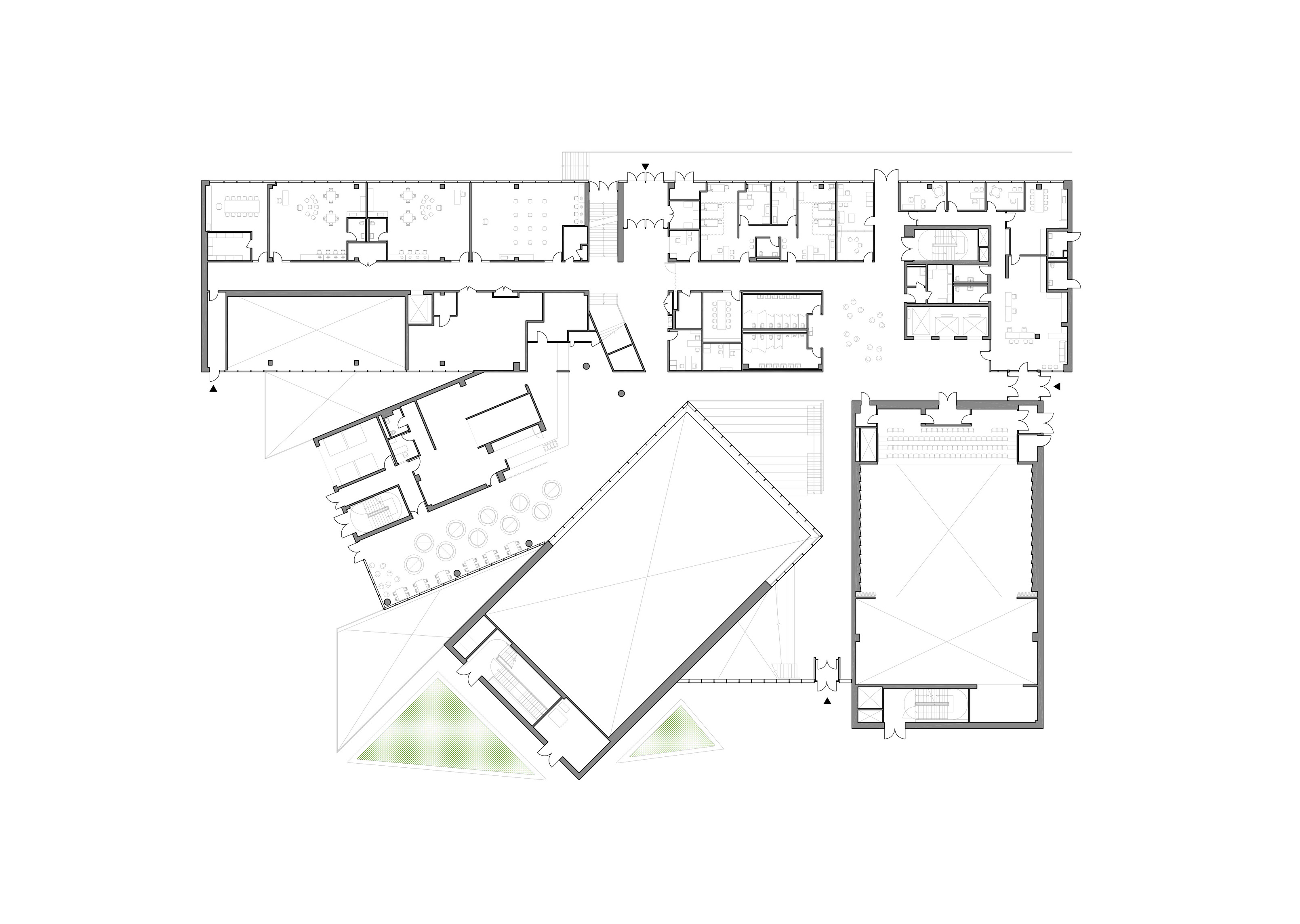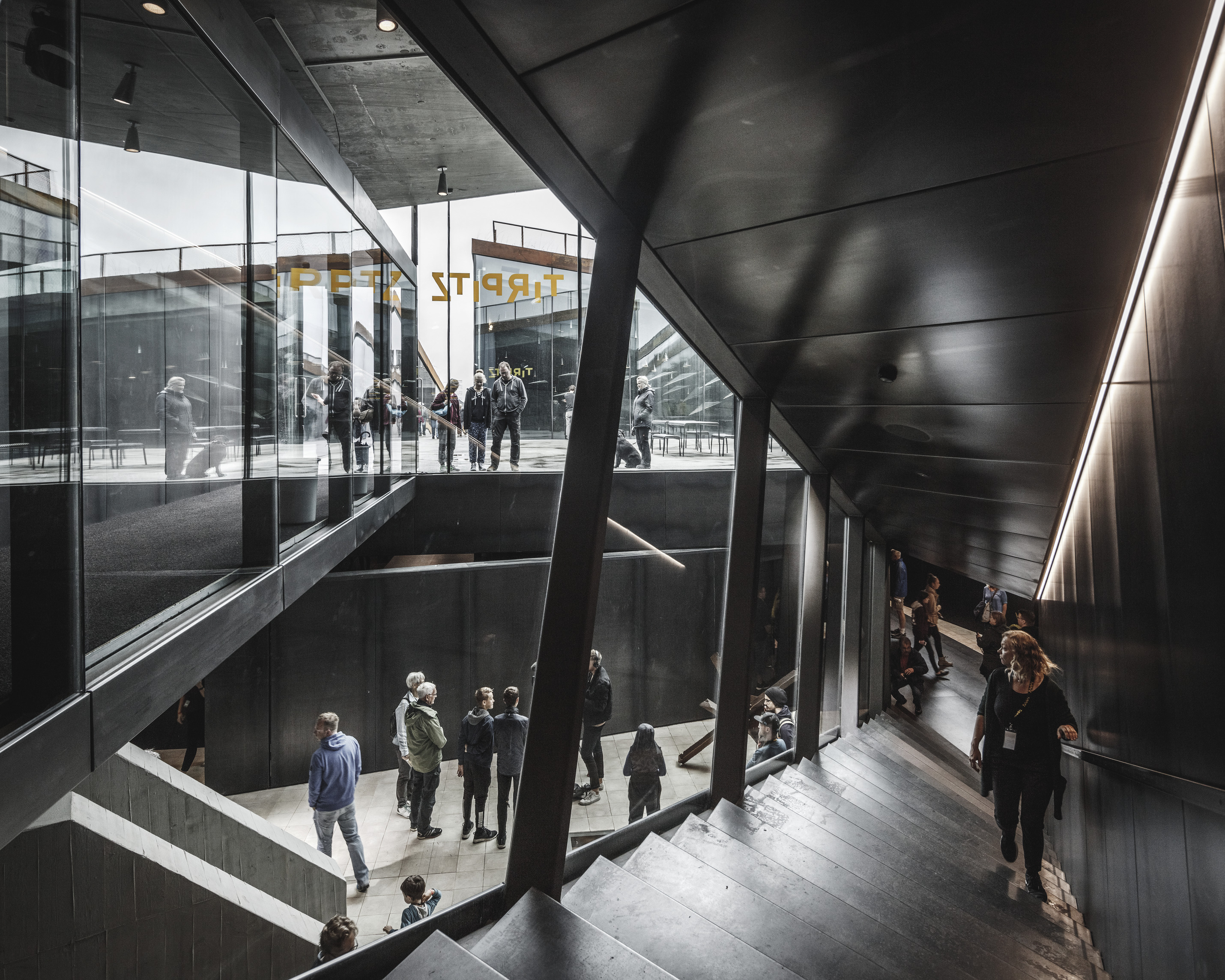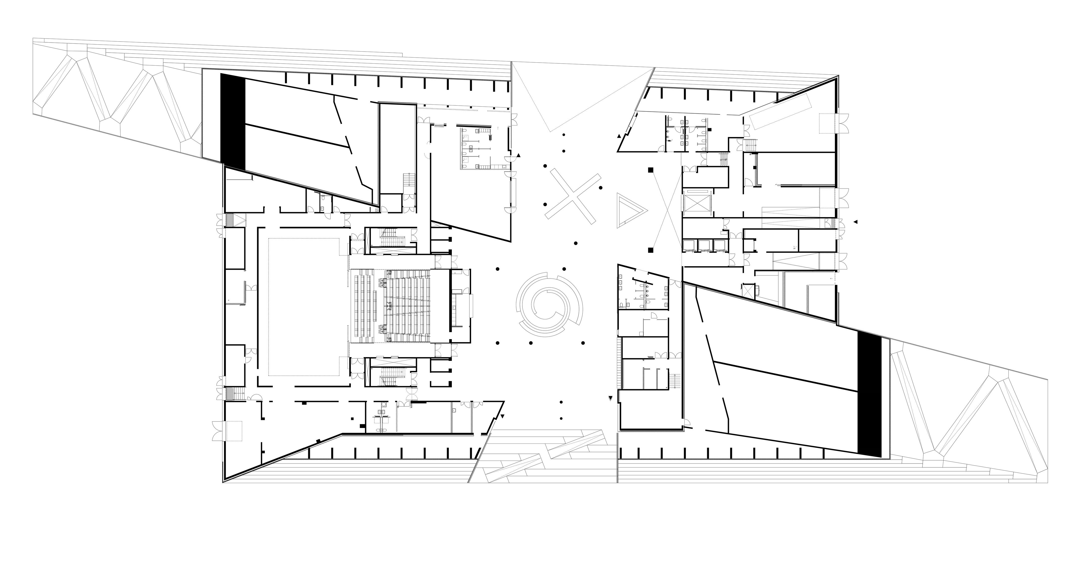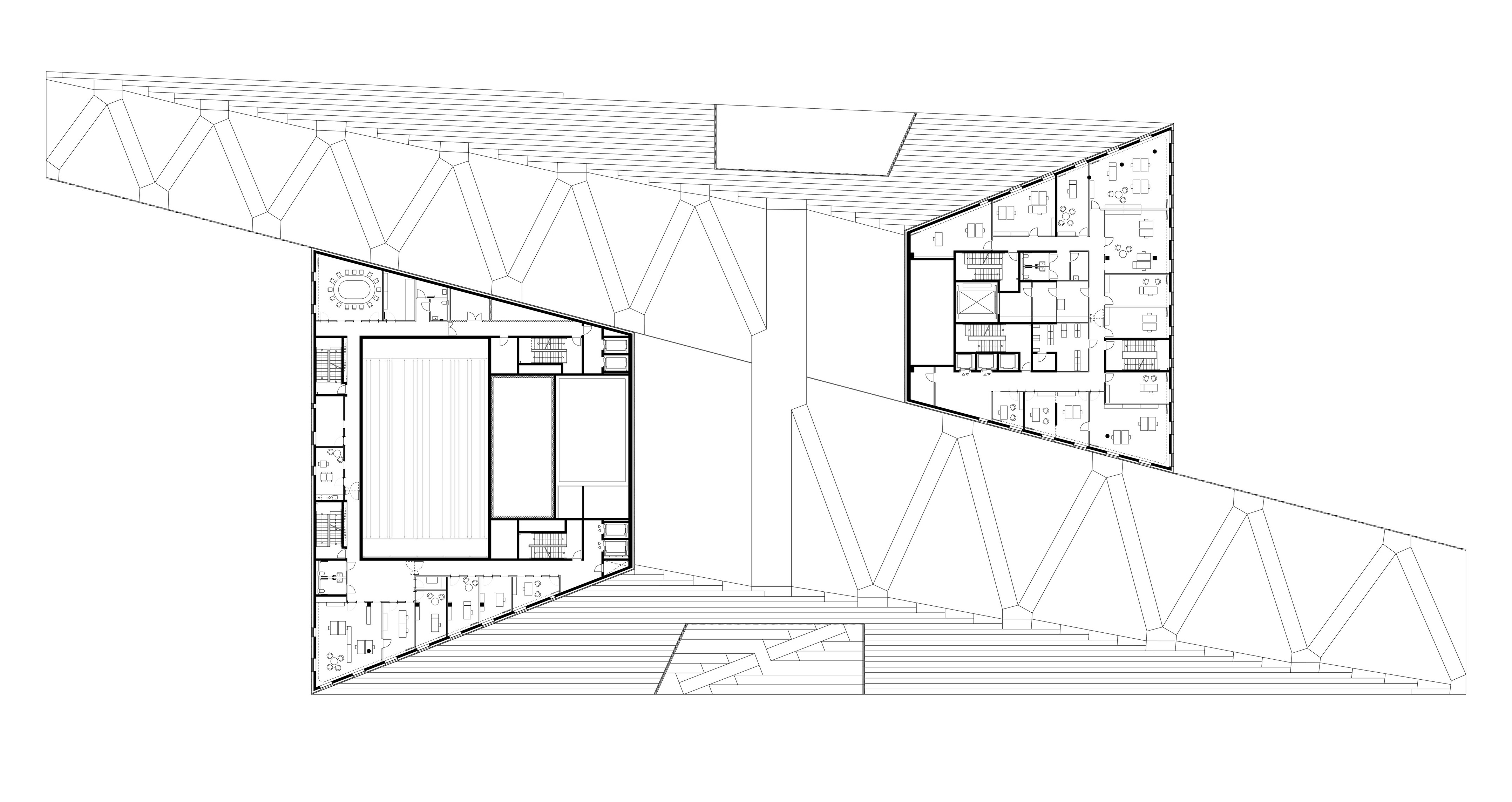 Inside, a spacious foyer serves as the building’s central square, filled with natural light. A grand staircase connects the foyer to the main auditorium, while overlapping levels create visual connections between the different program areas.