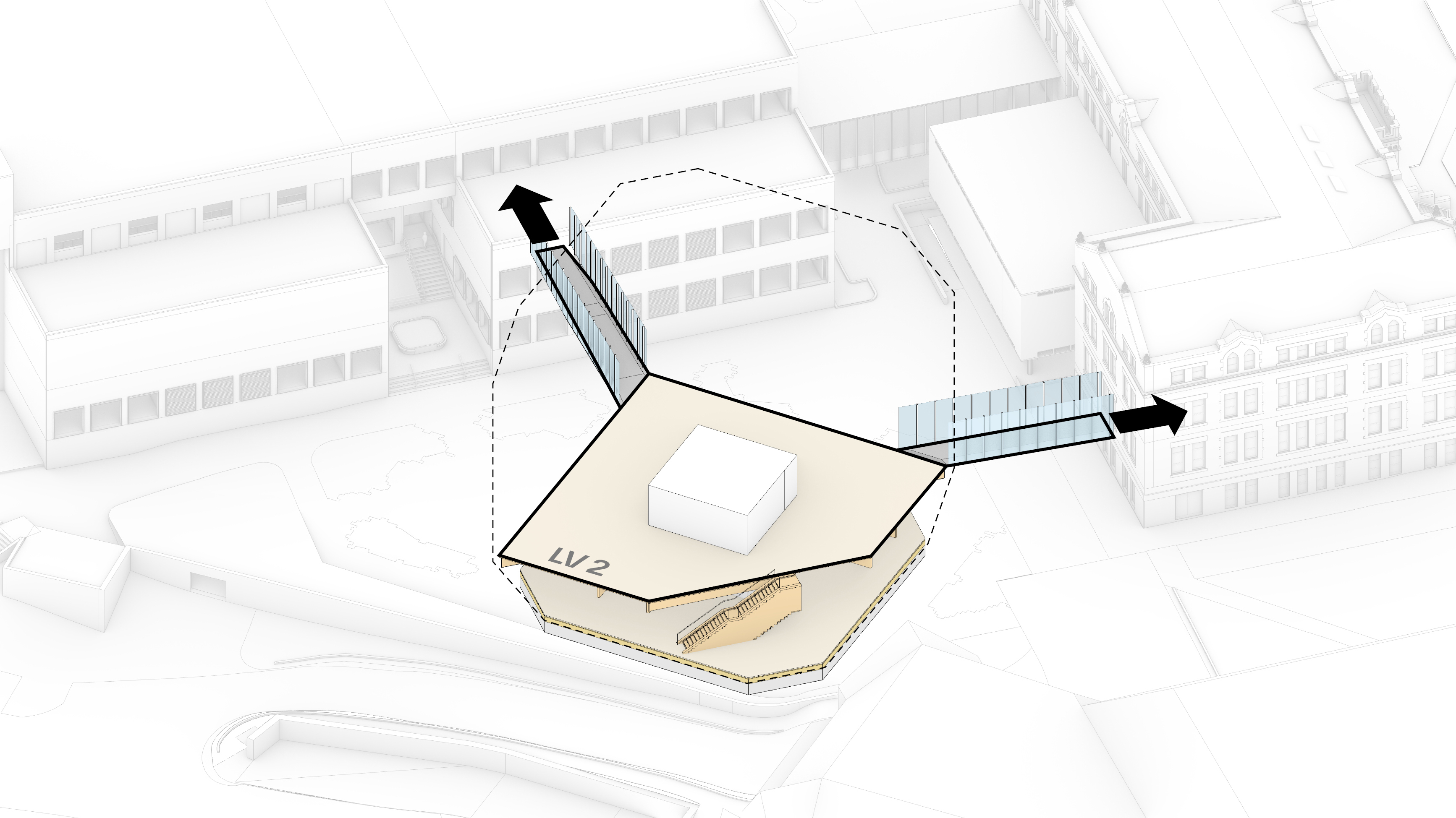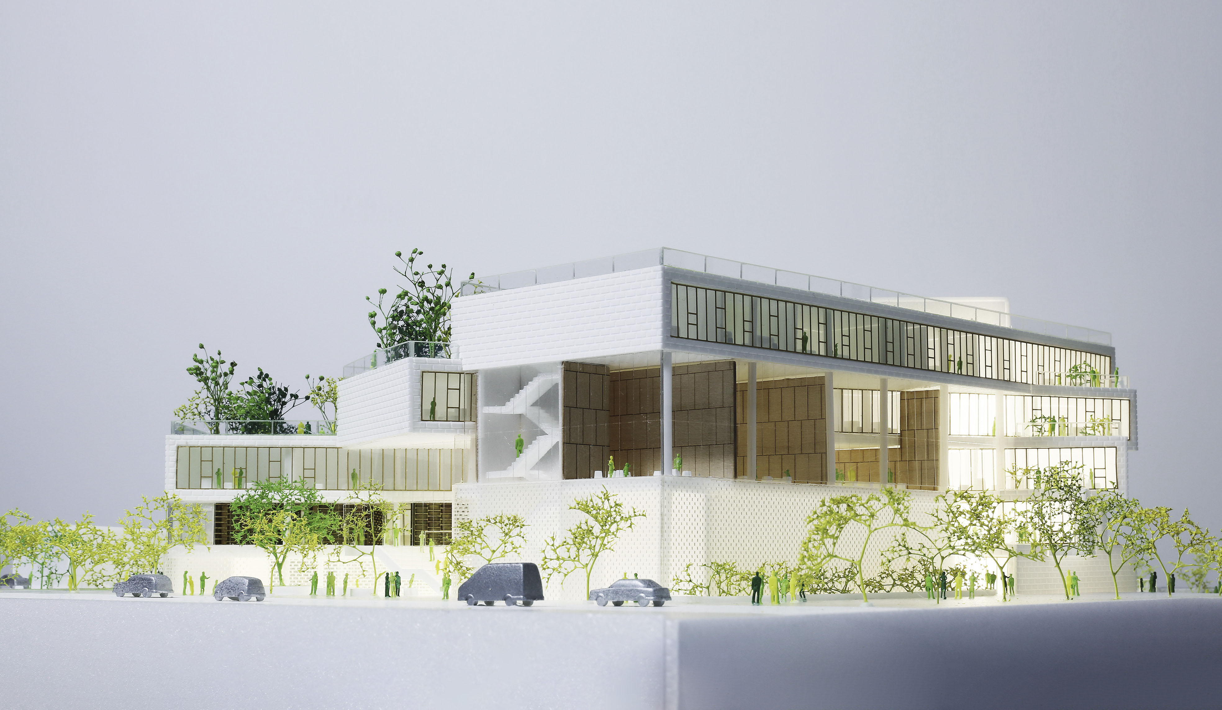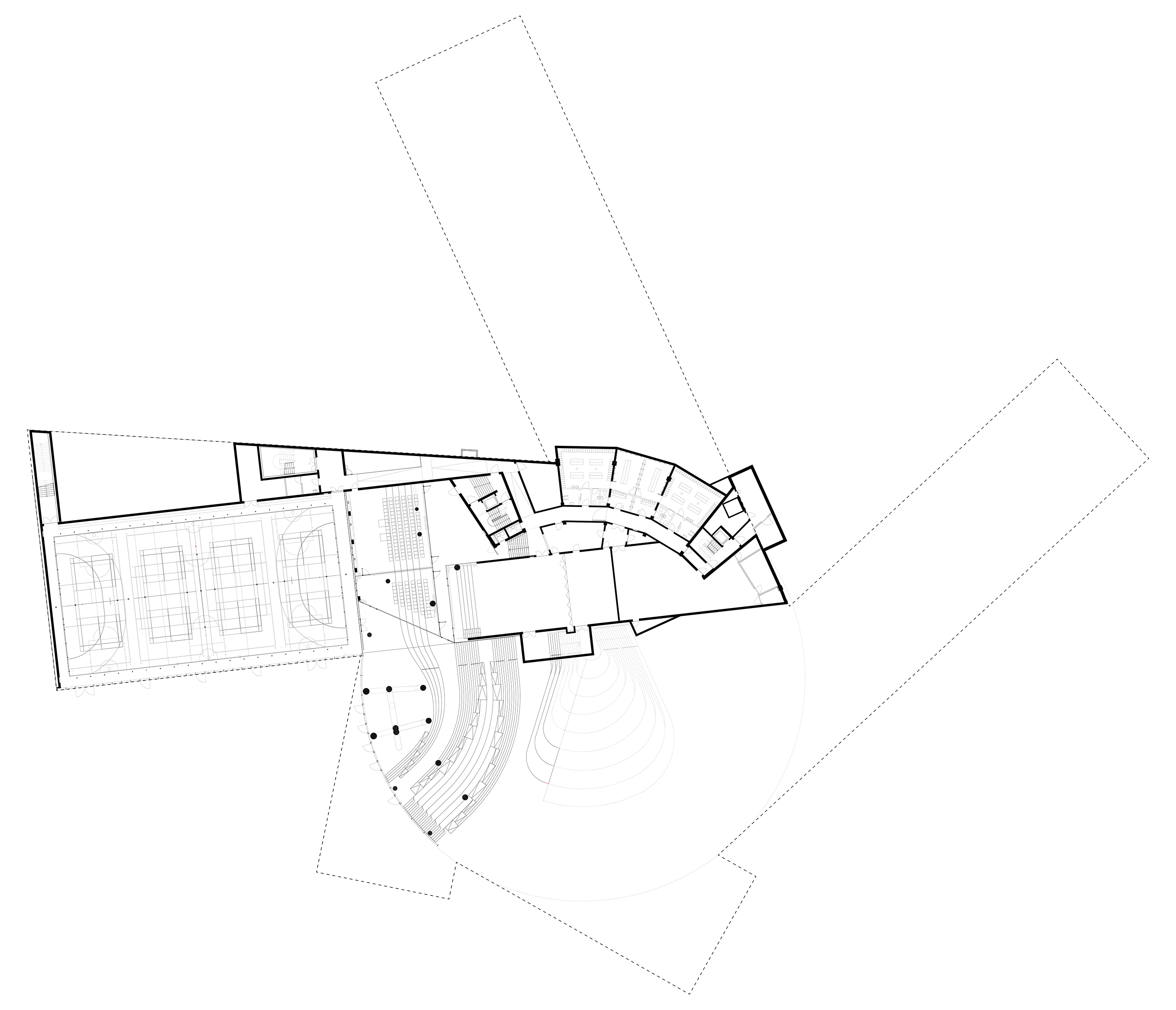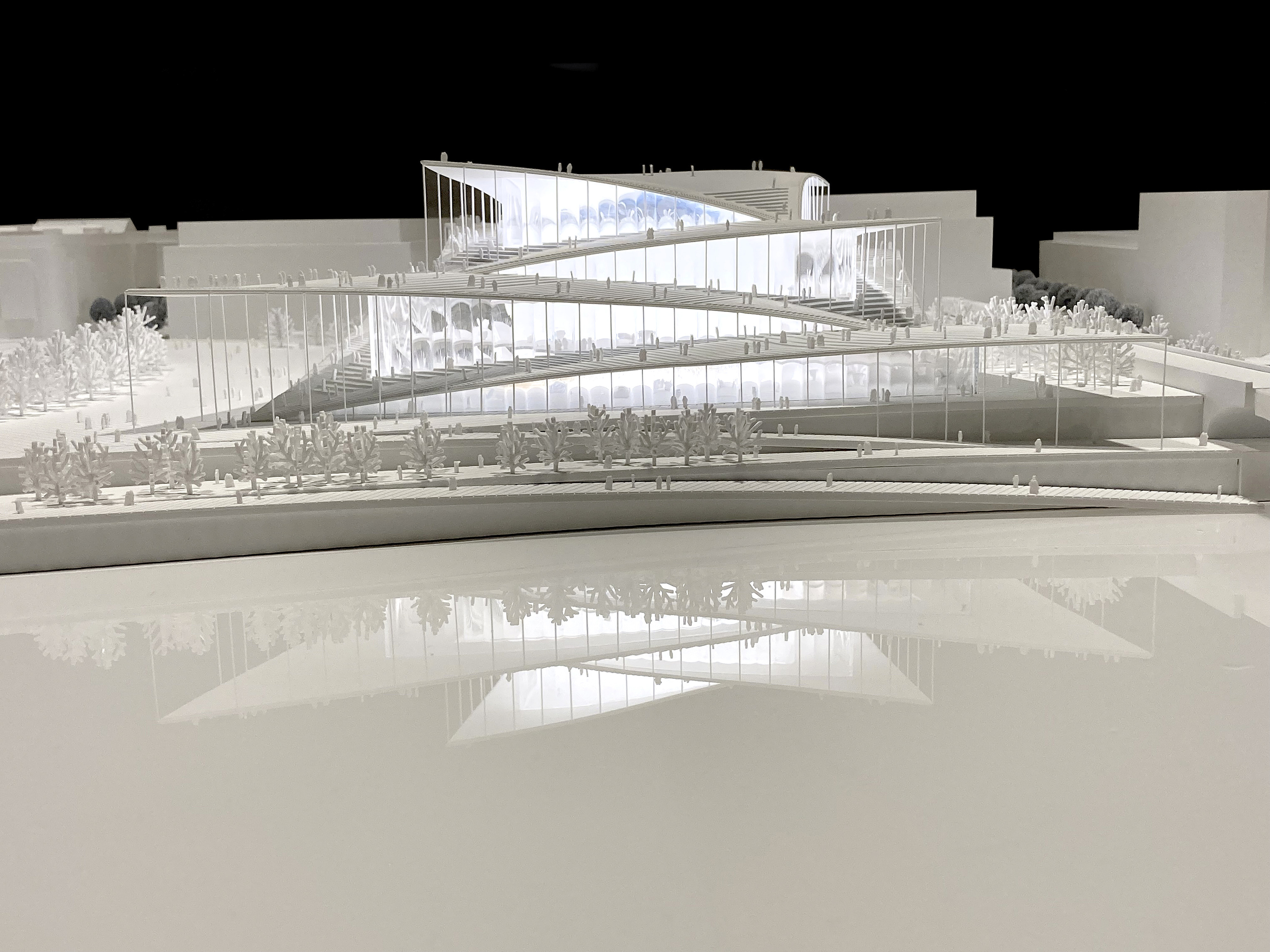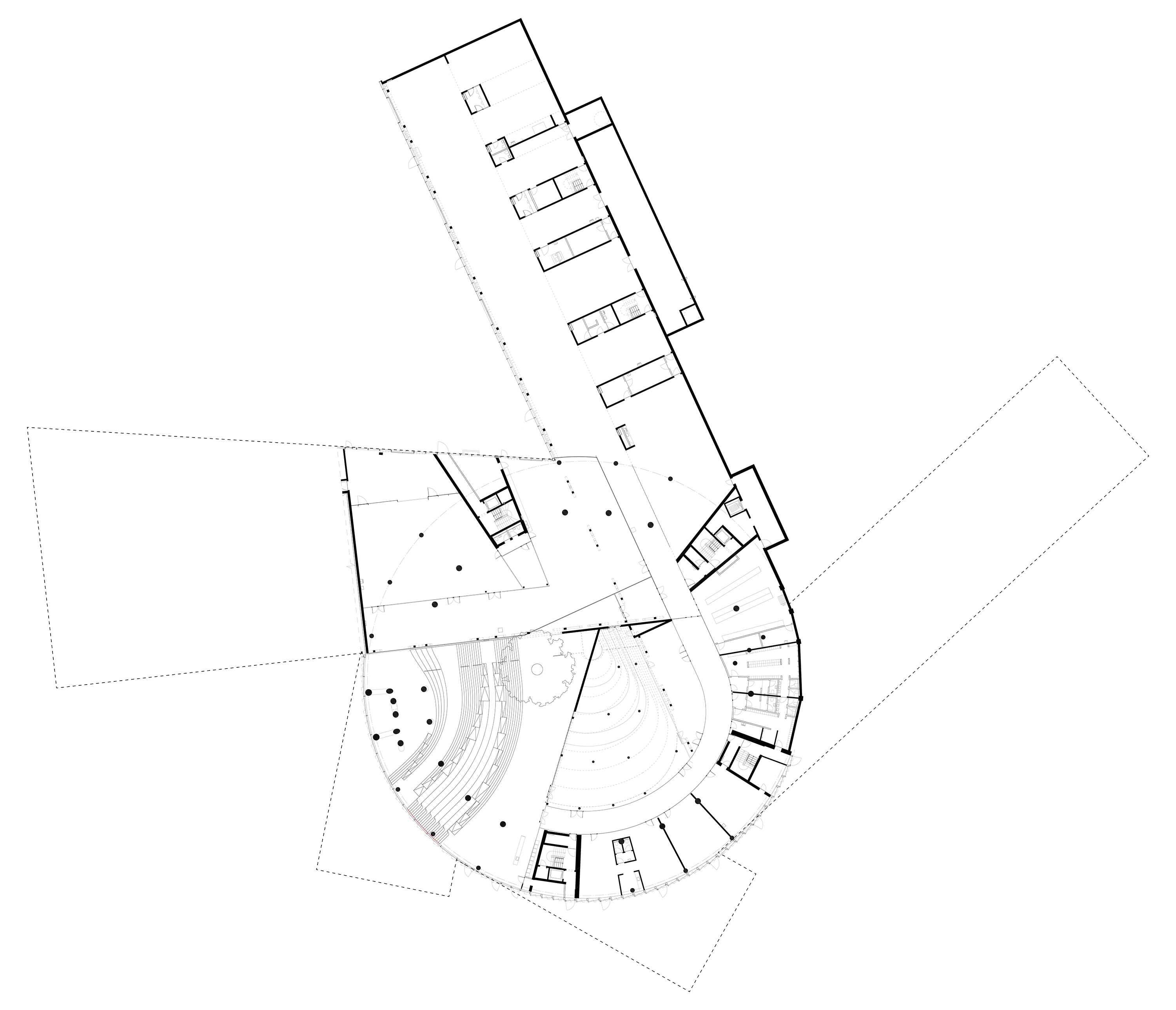 Inside, a spacious foyer serves as the building’s central square, filled with natural light. A grand staircase connects the foyer to the main auditorium, while overlapping levels create visual connections between the different program areas.
