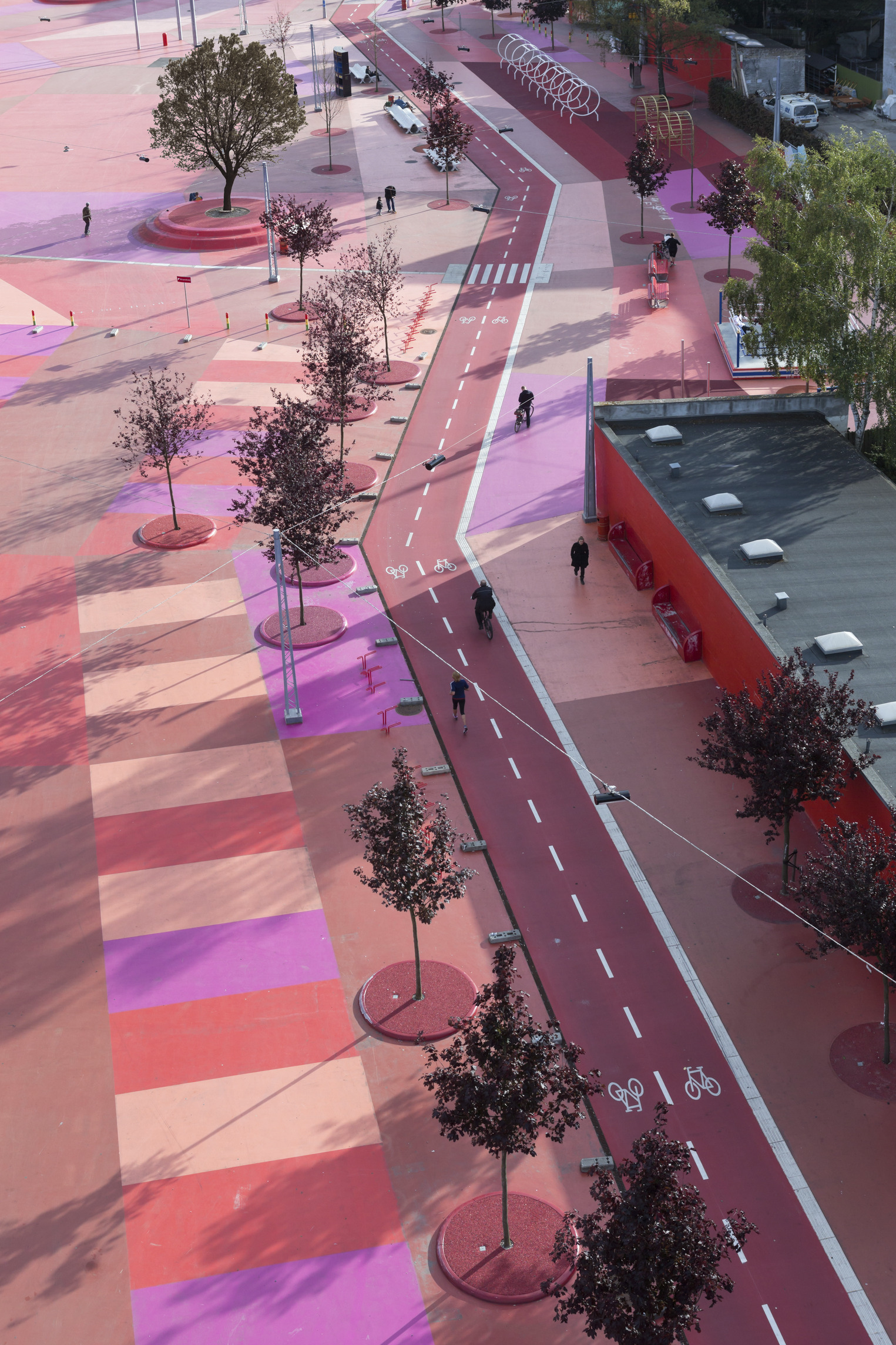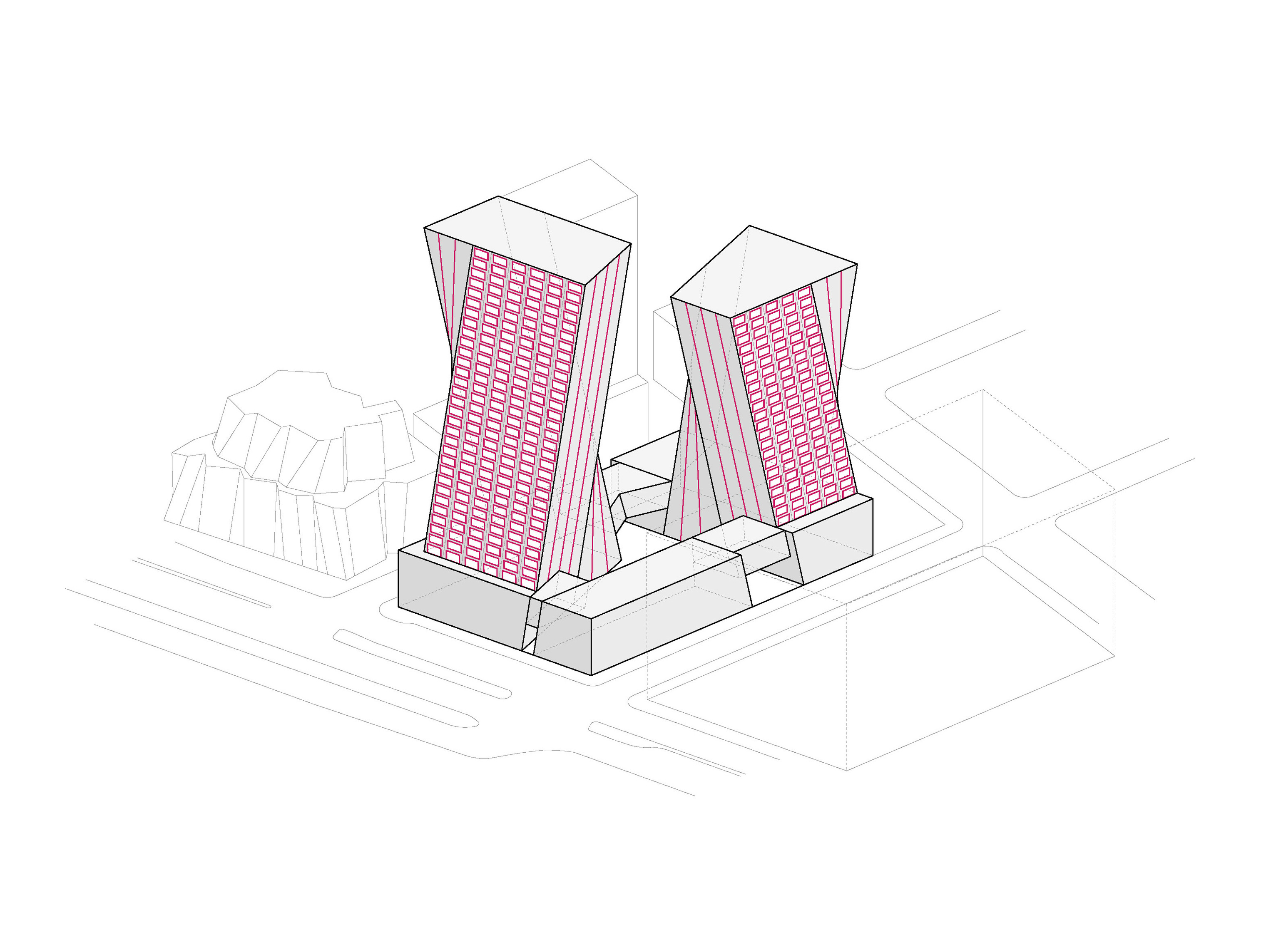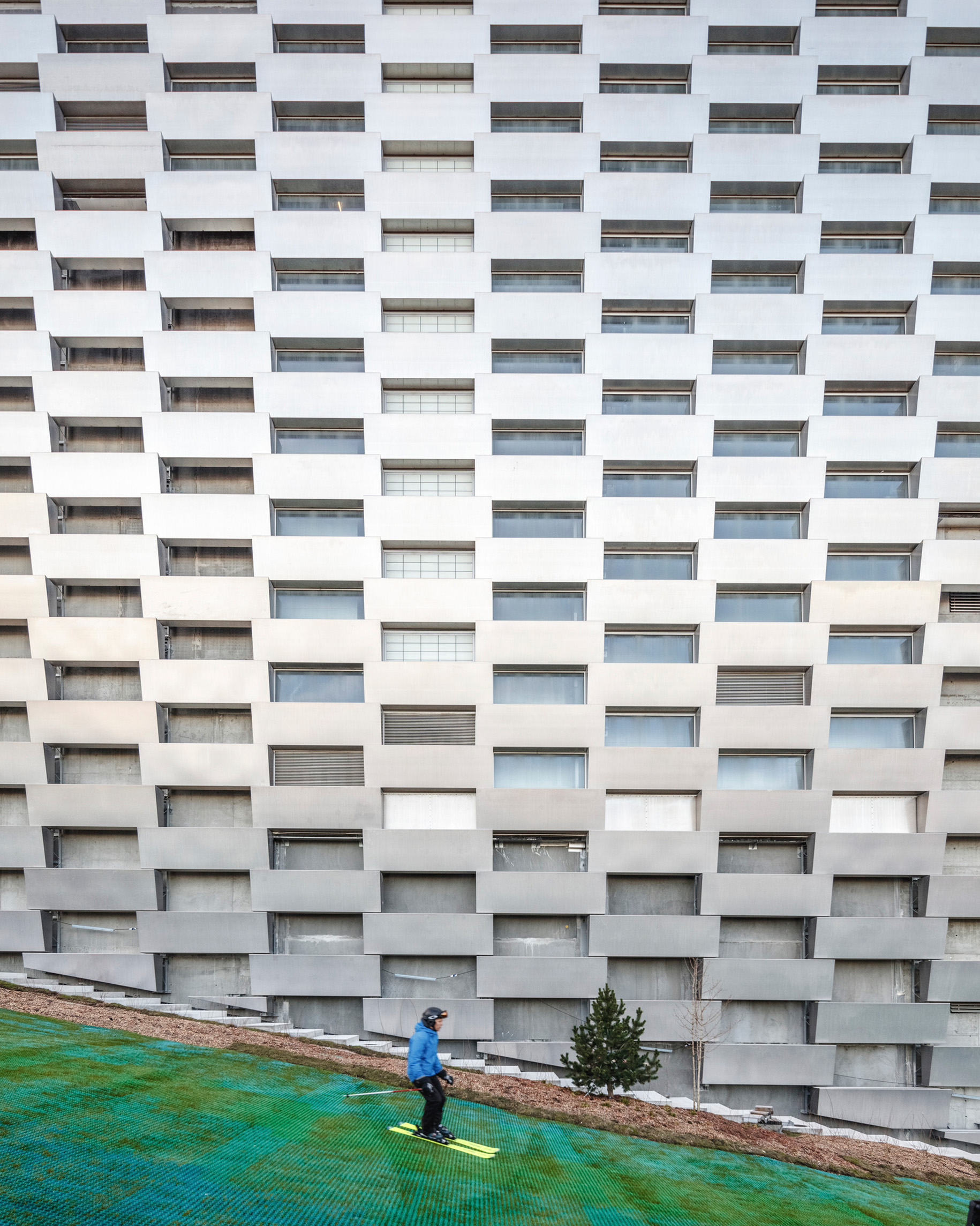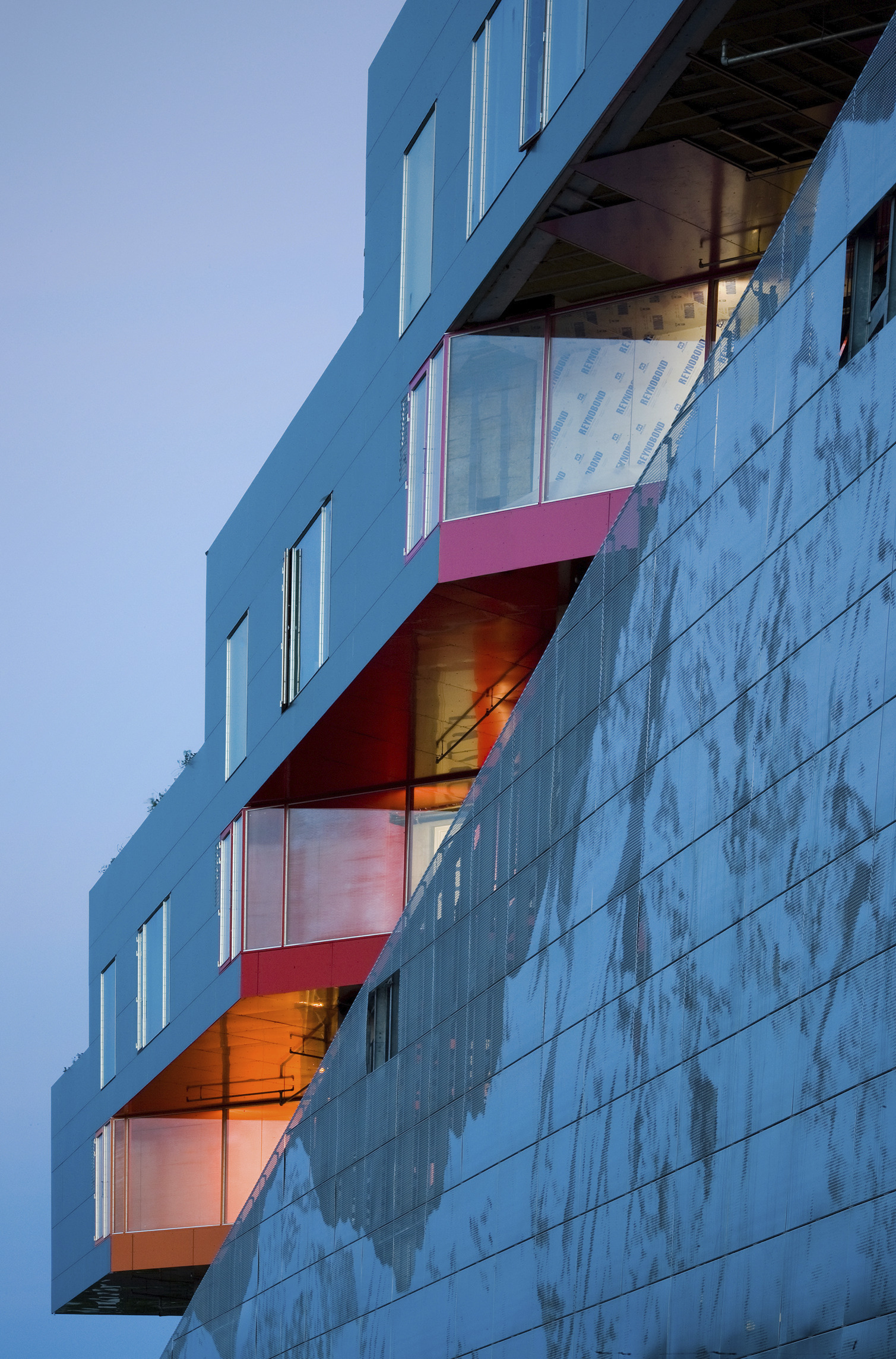 While the façade pattern is based on the scale of the individual apartments, the red and pink hues give each volume its own identity. Together, these residential blocks form a vertical neighborhood that exemplifies a new approach to integrating outdoor space into a high-density residential building aimed at fostering a community.
