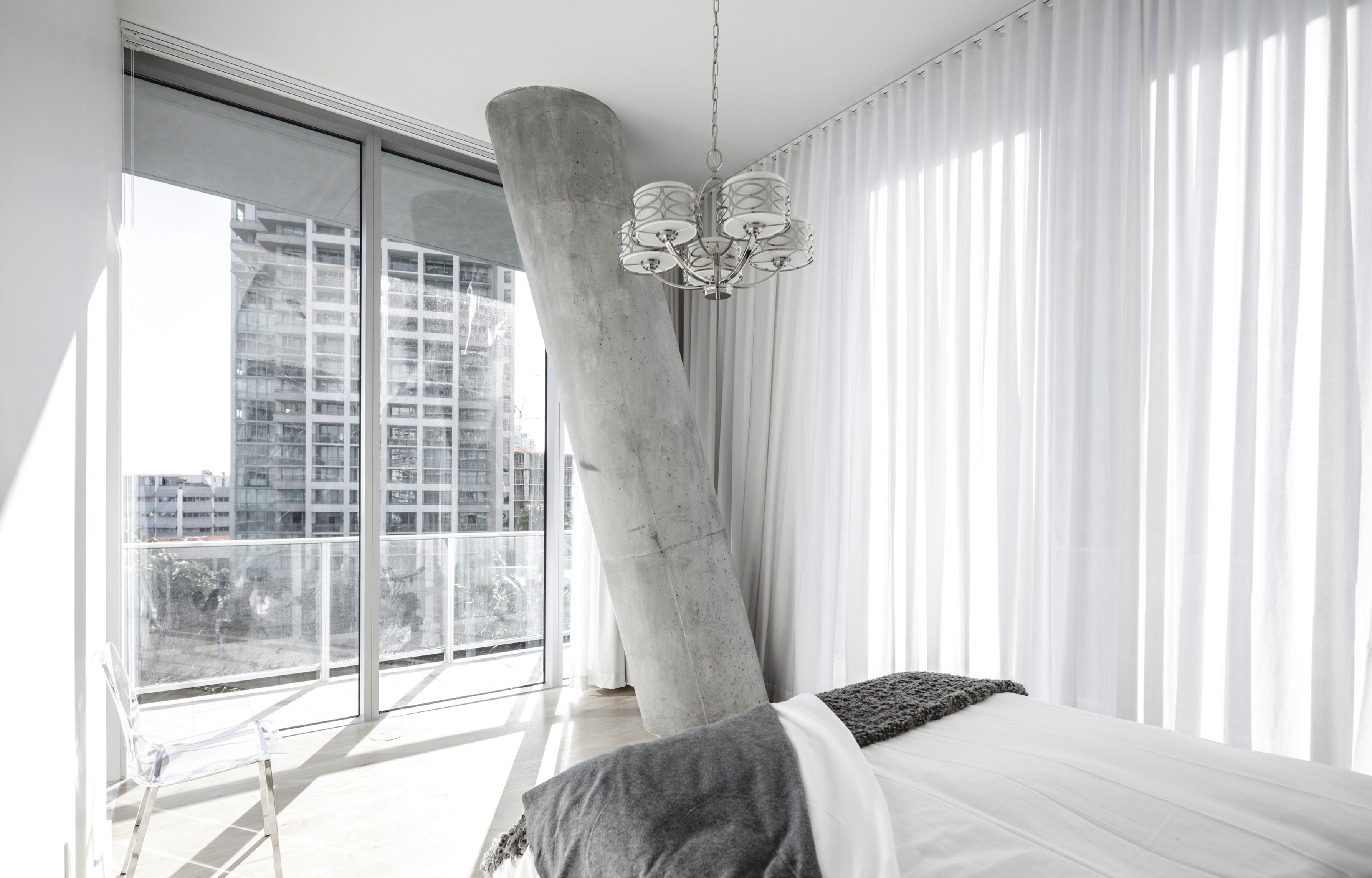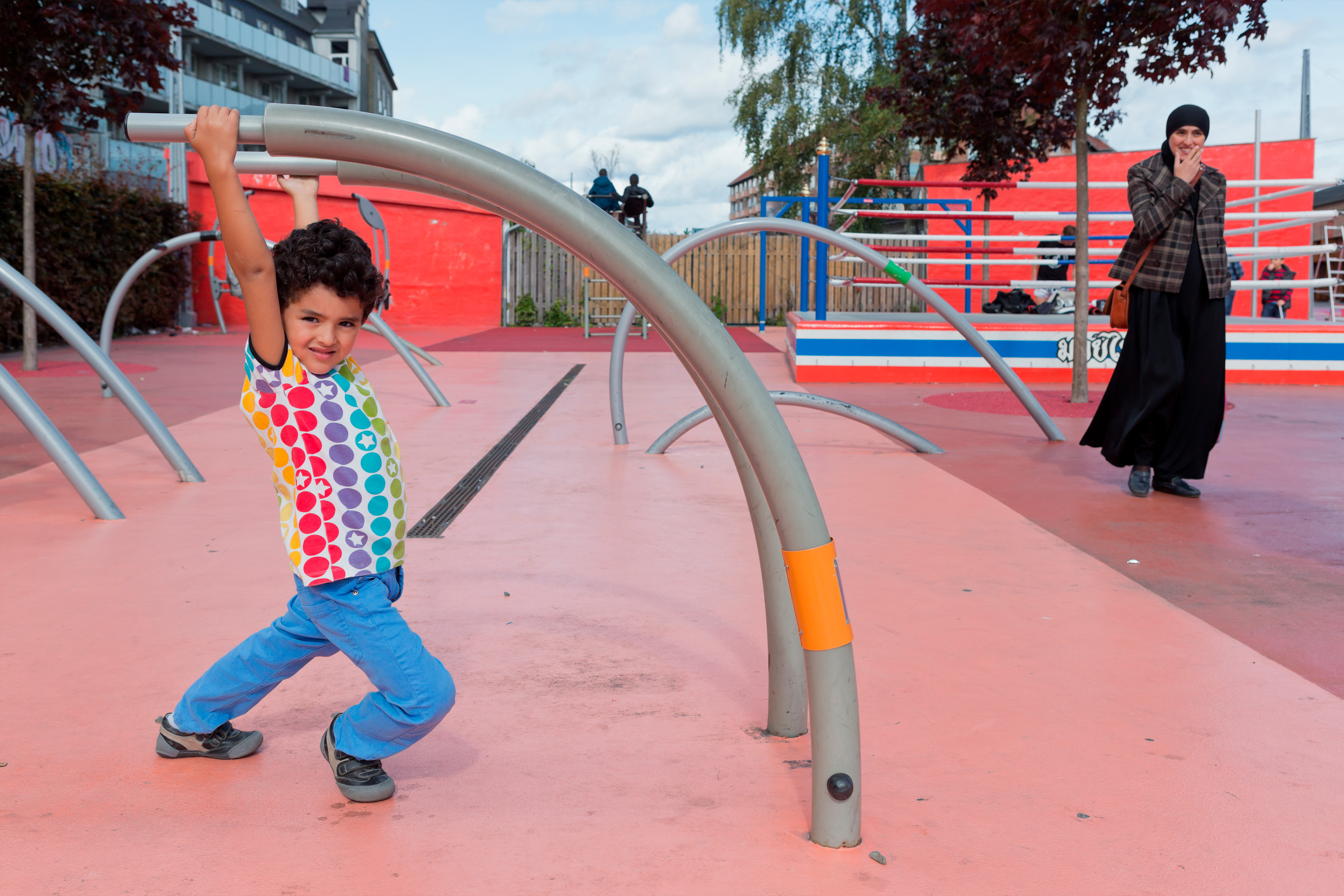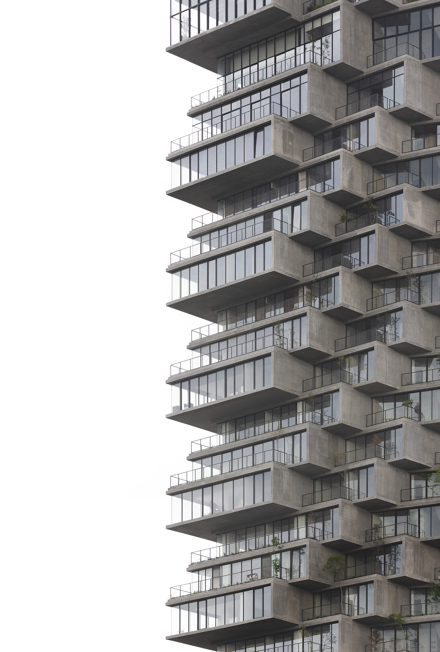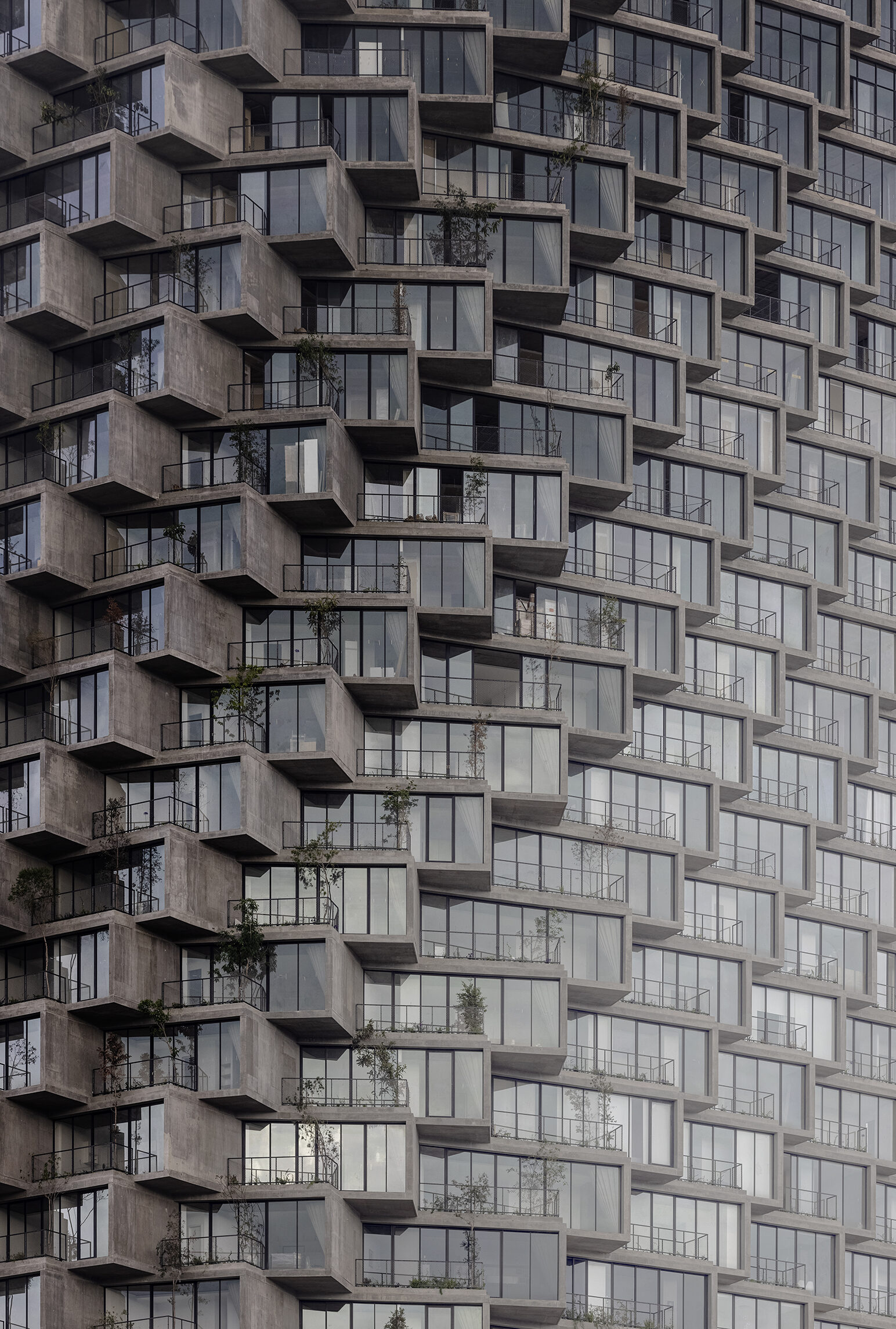 While the façade pattern is based on the scale of the individual apartments, the red and pink hues give each volume its own identity. Together, these residential blocks form a vertical neighborhood that exemplifies a new approach to integrating outdoor space into a high-density residential building aimed at fostering a community.