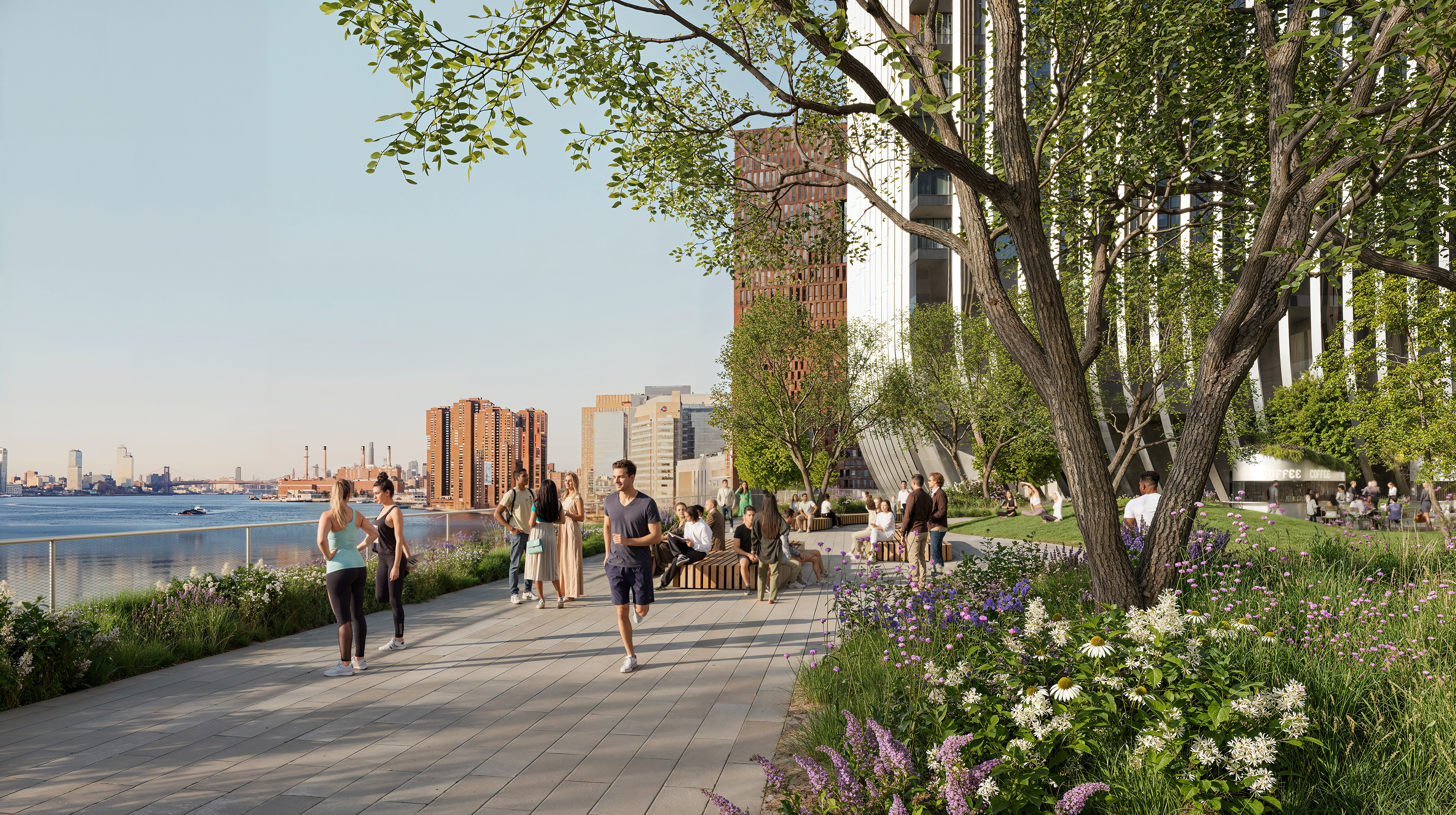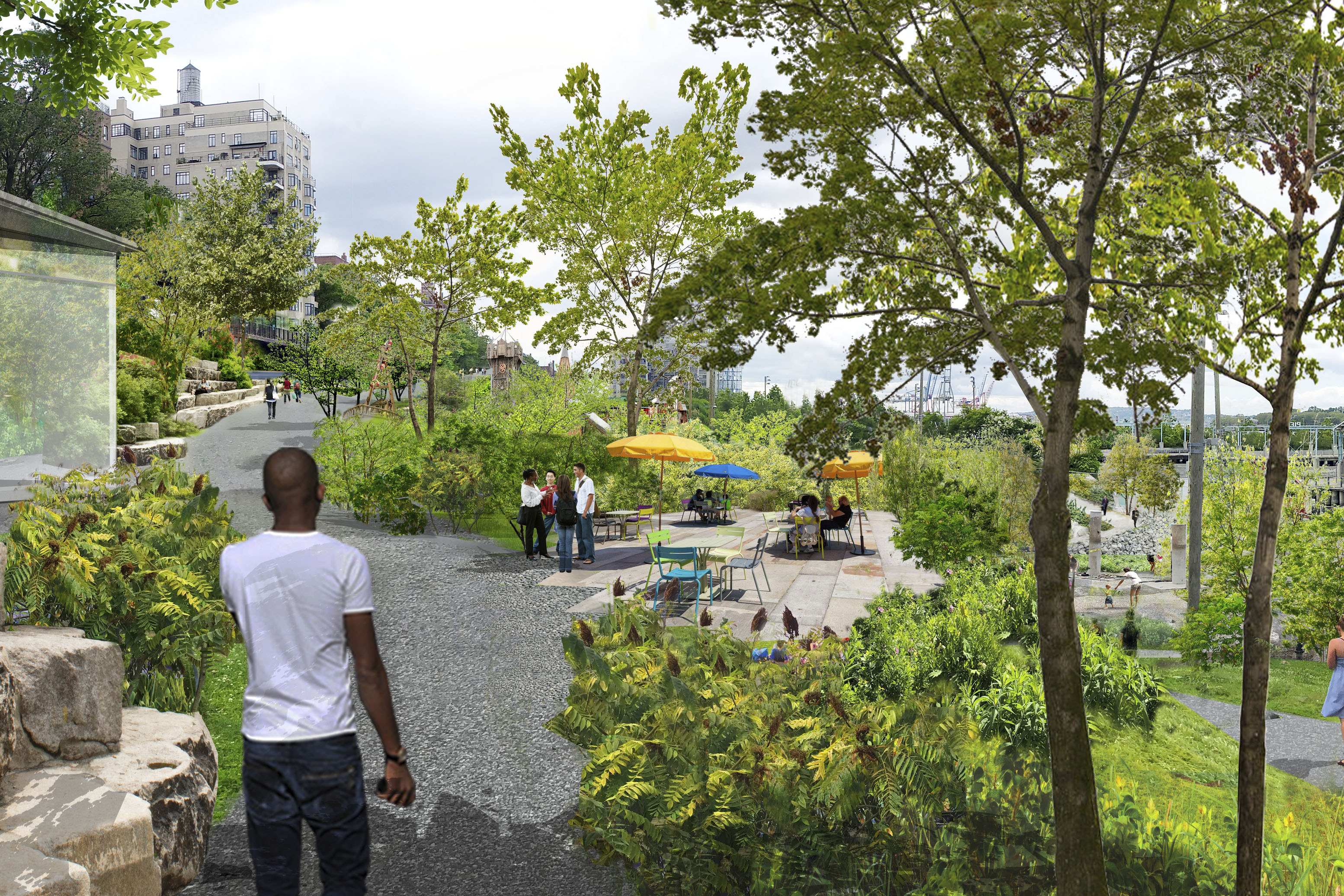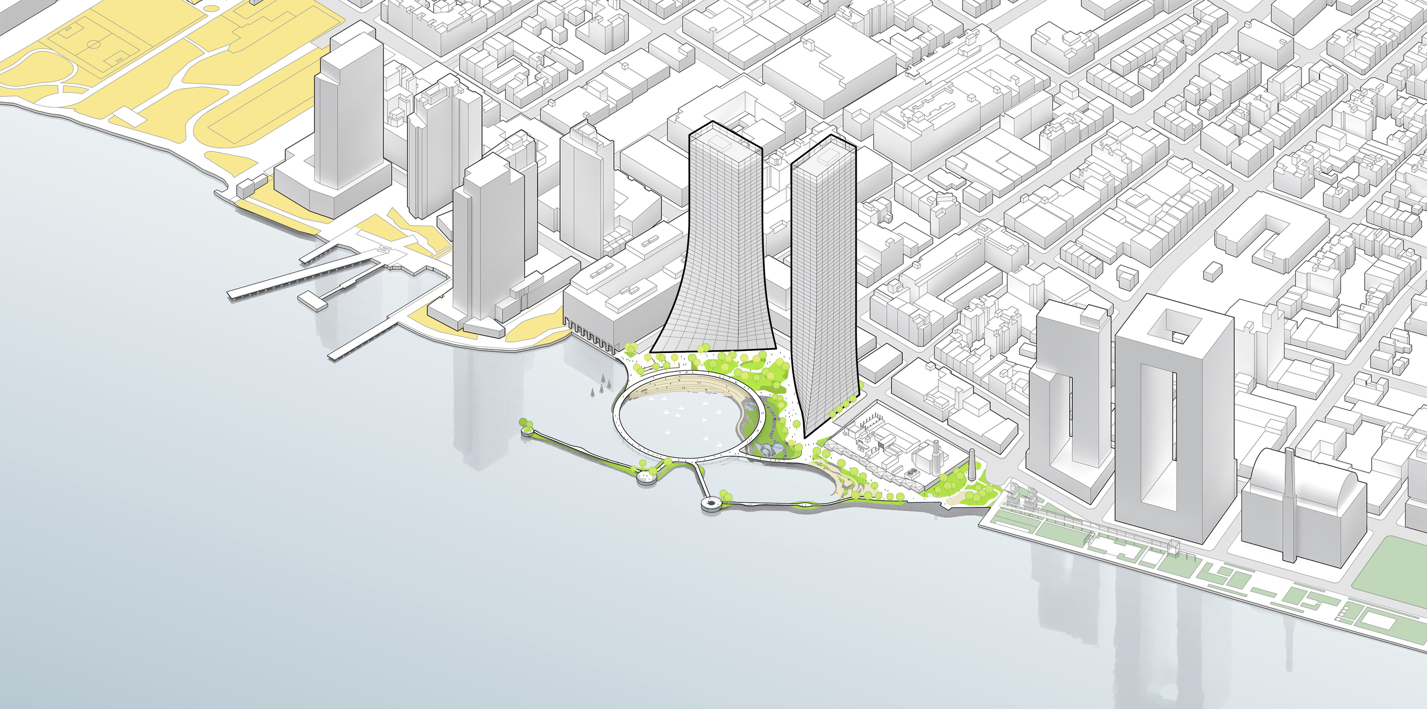 The residential towers are oriented to limit view obstruction from the neighborhood and maximize the Metropolitan Avenue view corridor. Blending the towers with the landscape softens the relationship between building and park, forming a gateway that welcomes the community to the water.
