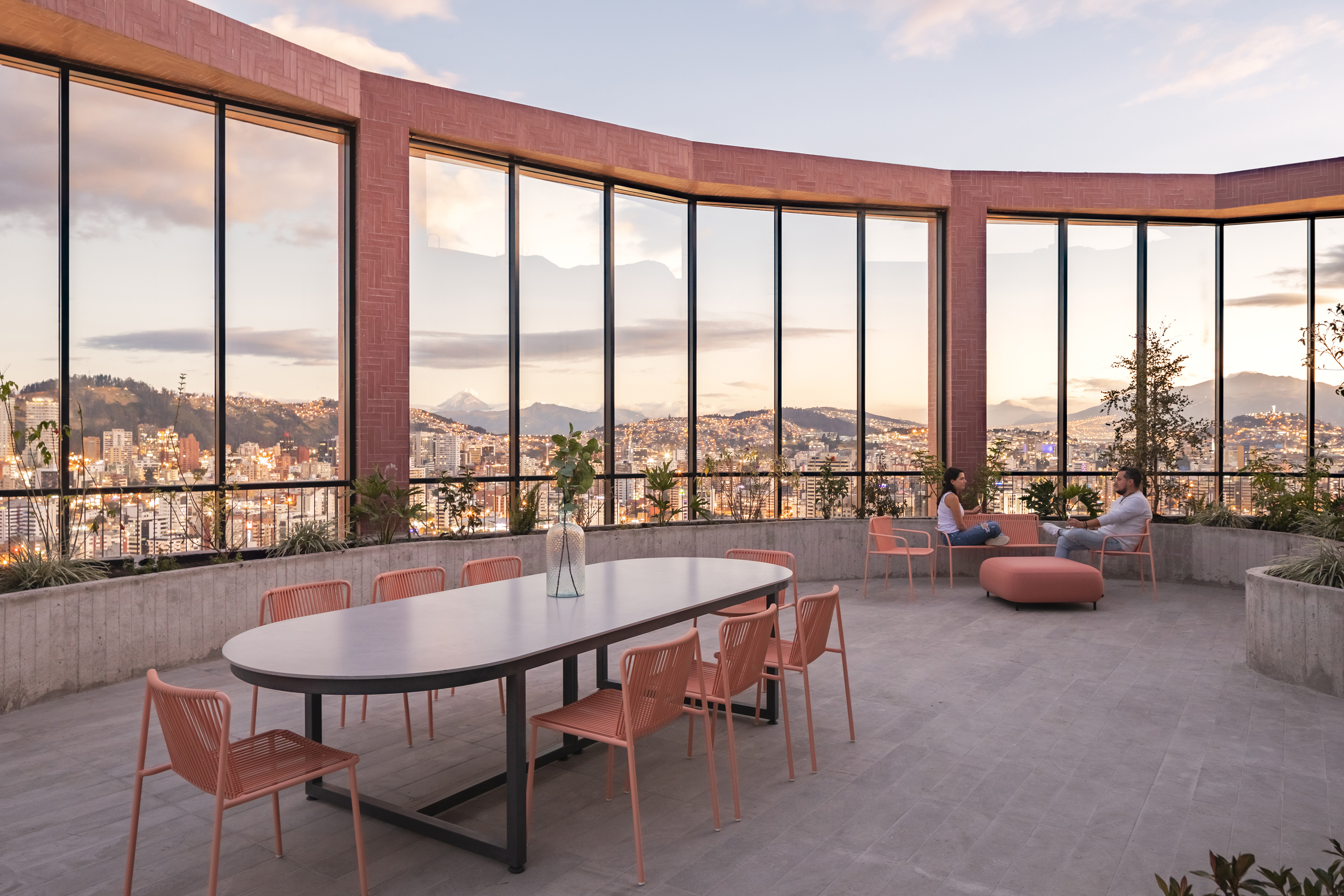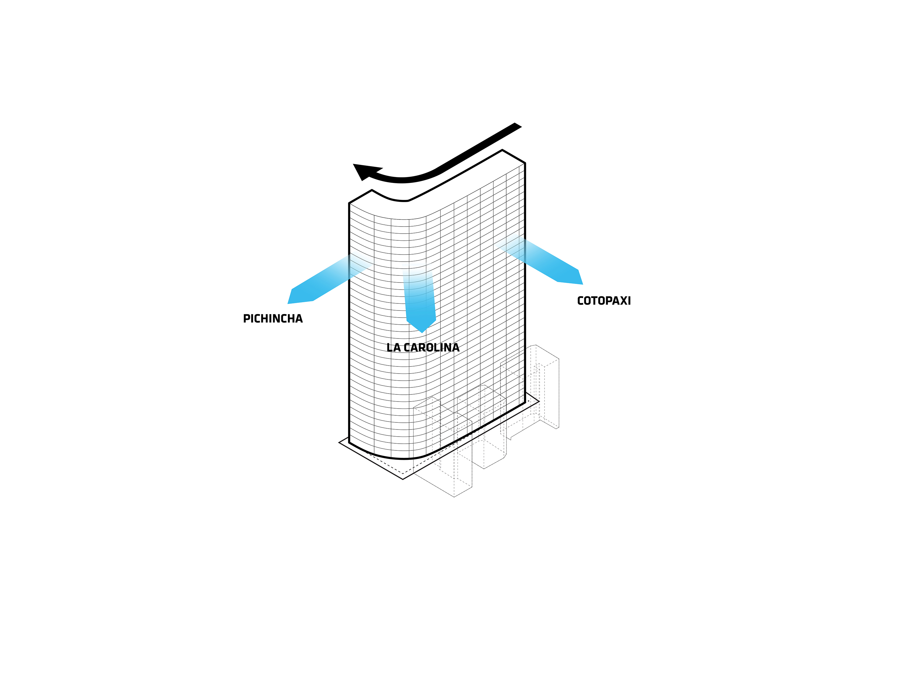 EPIQ, the 24-story mixed-use tower, is located on the southern tip of La Carolina Park in the center of the city. The shape of the site is a quarter of a circle and occupies the west corner intersection of Avenida de la Republica and Avenida Eloy Alfaro, across the street from the new Quito subway. The rounded corners of the building allow for panoramic views of the city while maximizing daylight exposure.