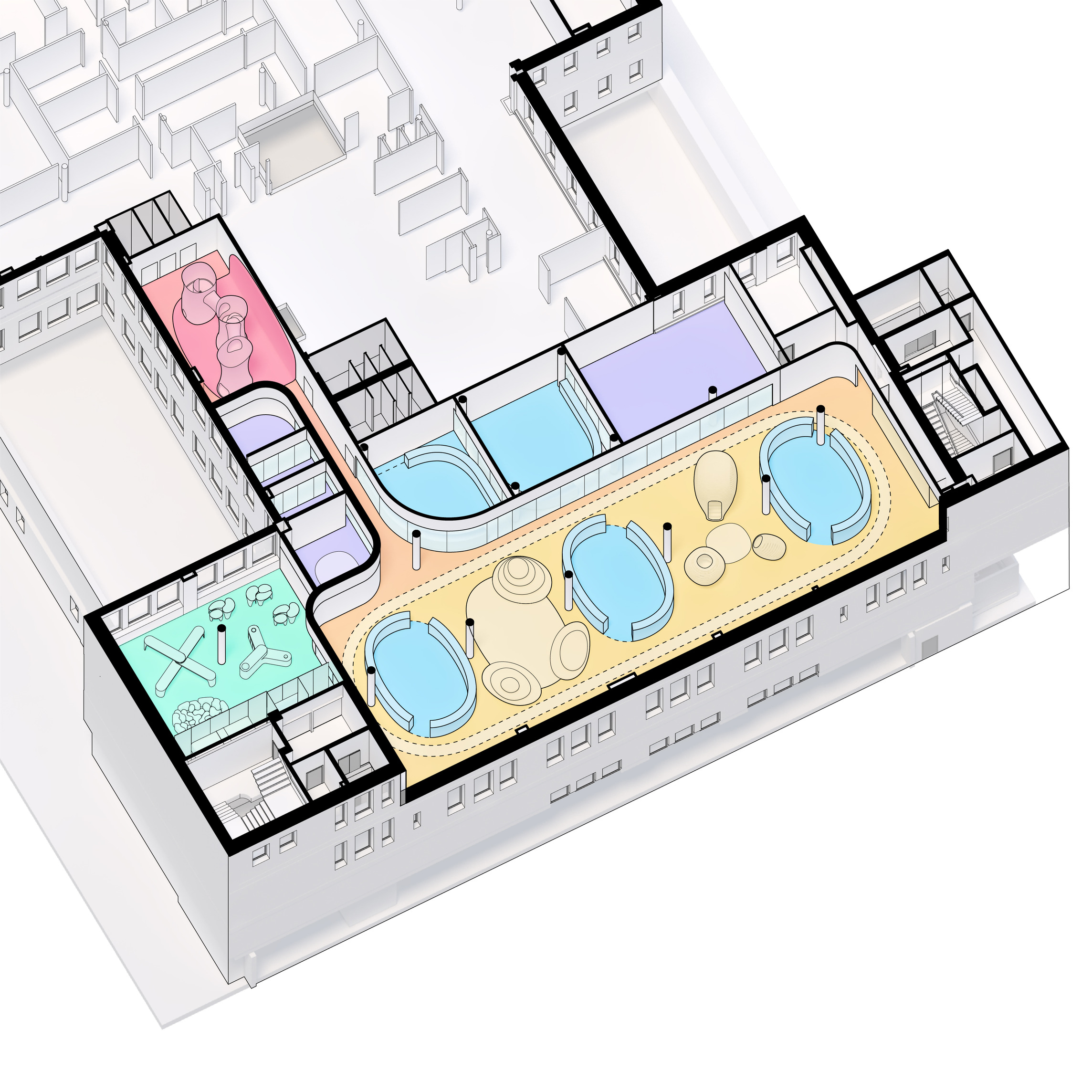 Part of the hospital contains observed treatment areas where patients for the good of self protection and their surroundings will have limited freedom to move, though without feeling claustrophobically trapped.