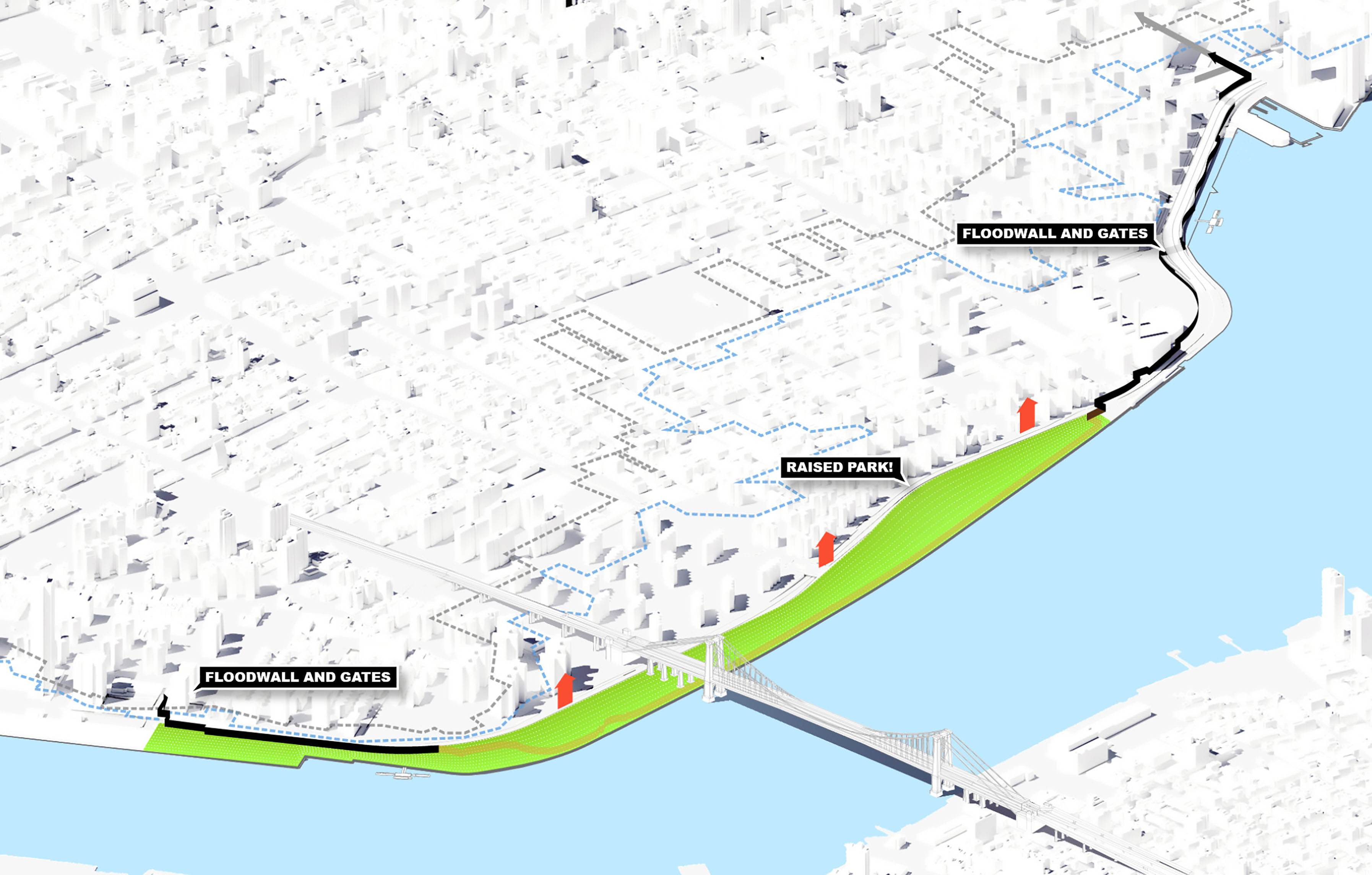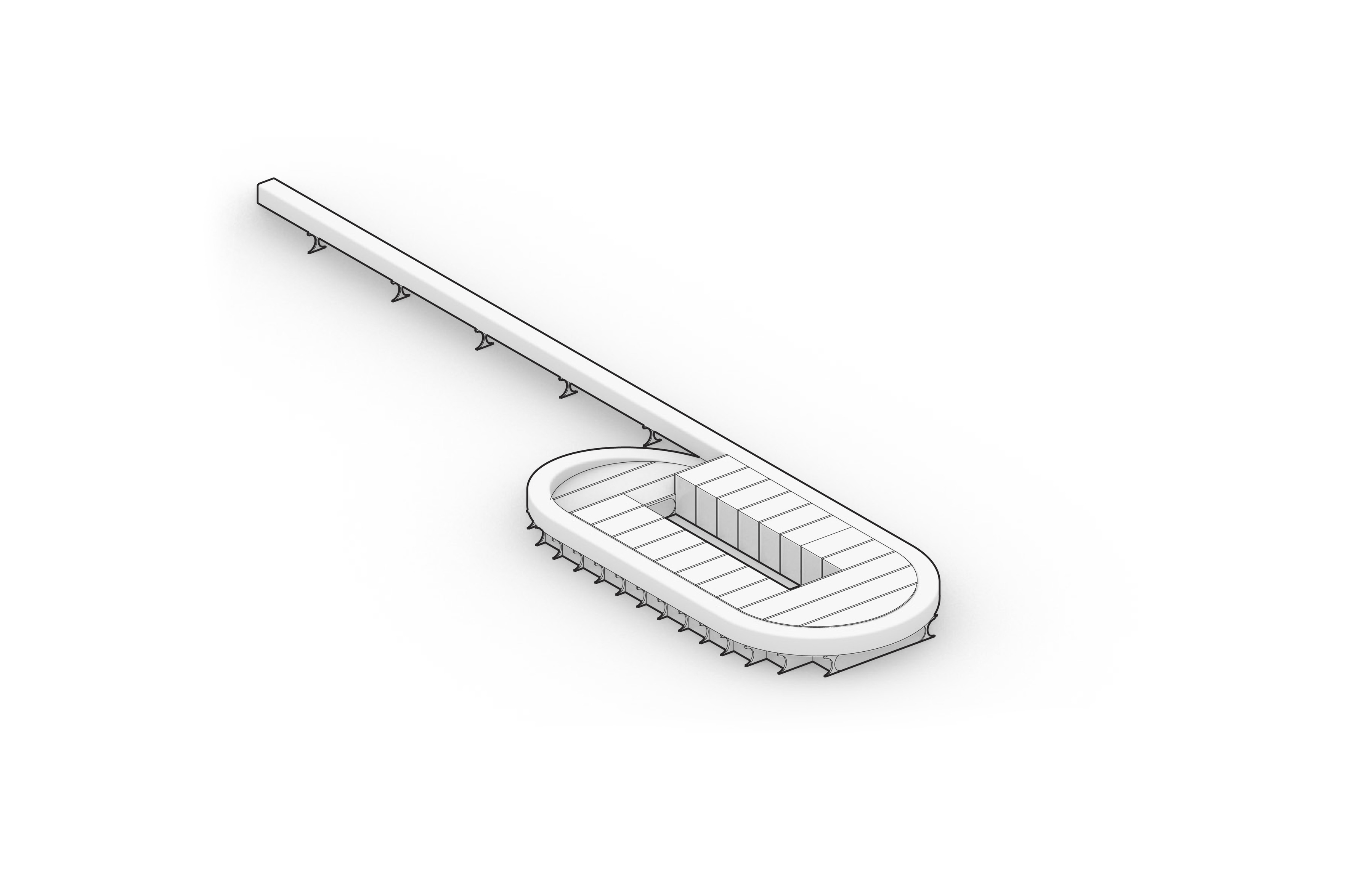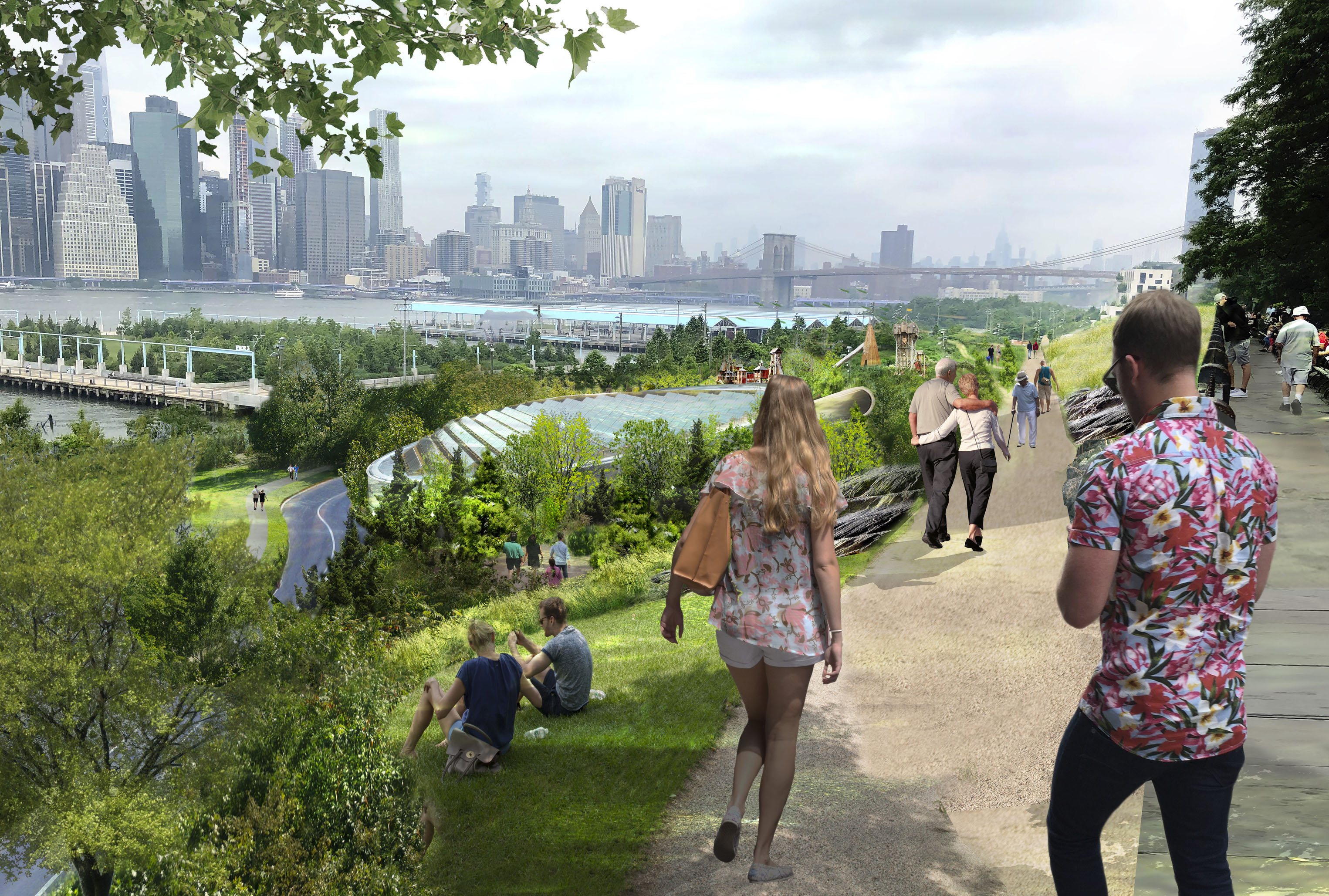 By deconstructing and re-naturalizing the built urban shoreline, the water’s edge is expanded into the city, creating a beach that brings people out to the water. A circular path frames a protected cove, providing 360° panoramic views of Brooklyn and Manhattan. By extending landscape-piers to the concrete caissons existing today, breakwaters are created that dissipate wave action from river waves and wakes from boats. This protected cove will support in-water recreation such as swimming and boating, while mitigating the effects of storm surge on the neighborhood.