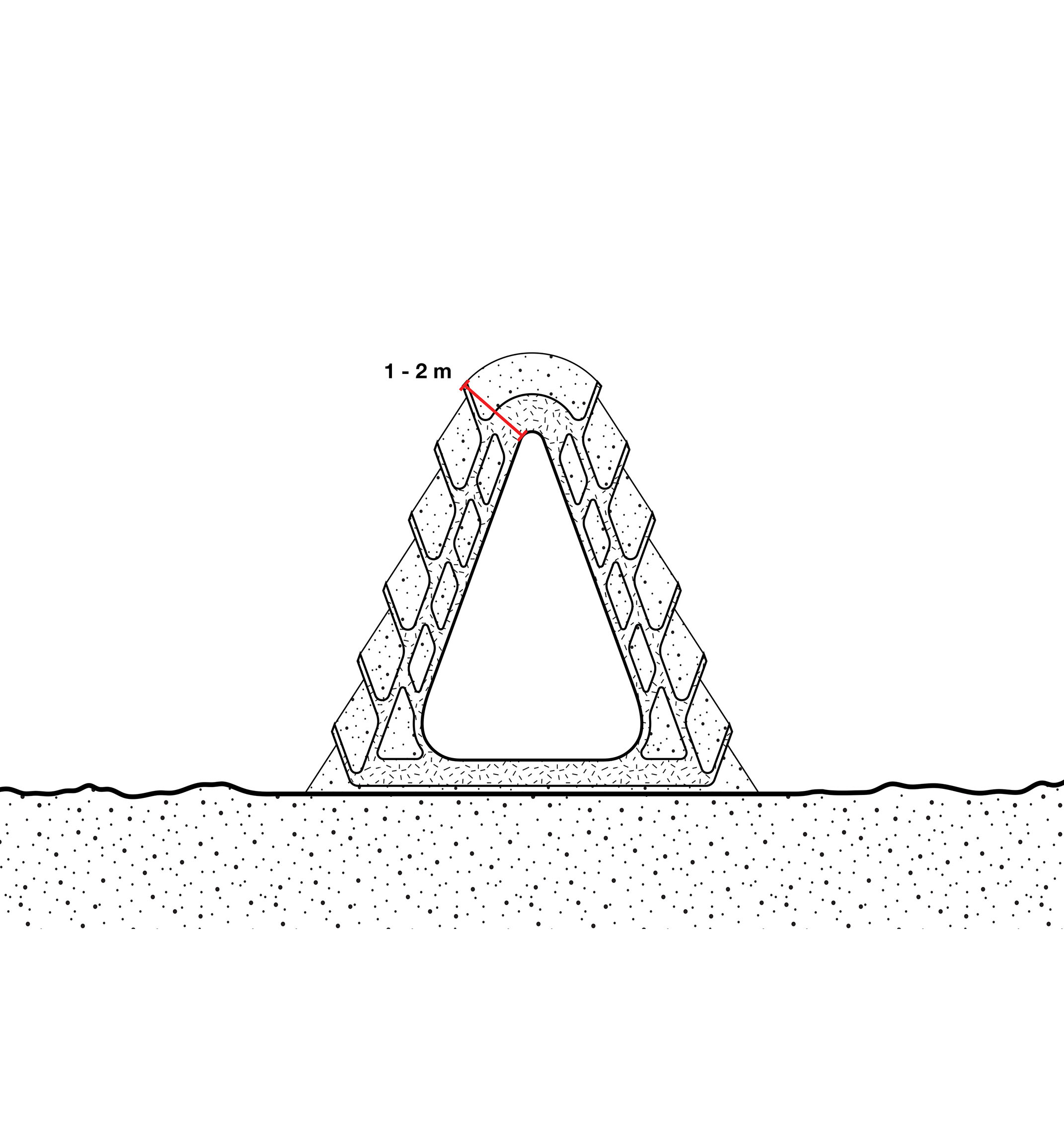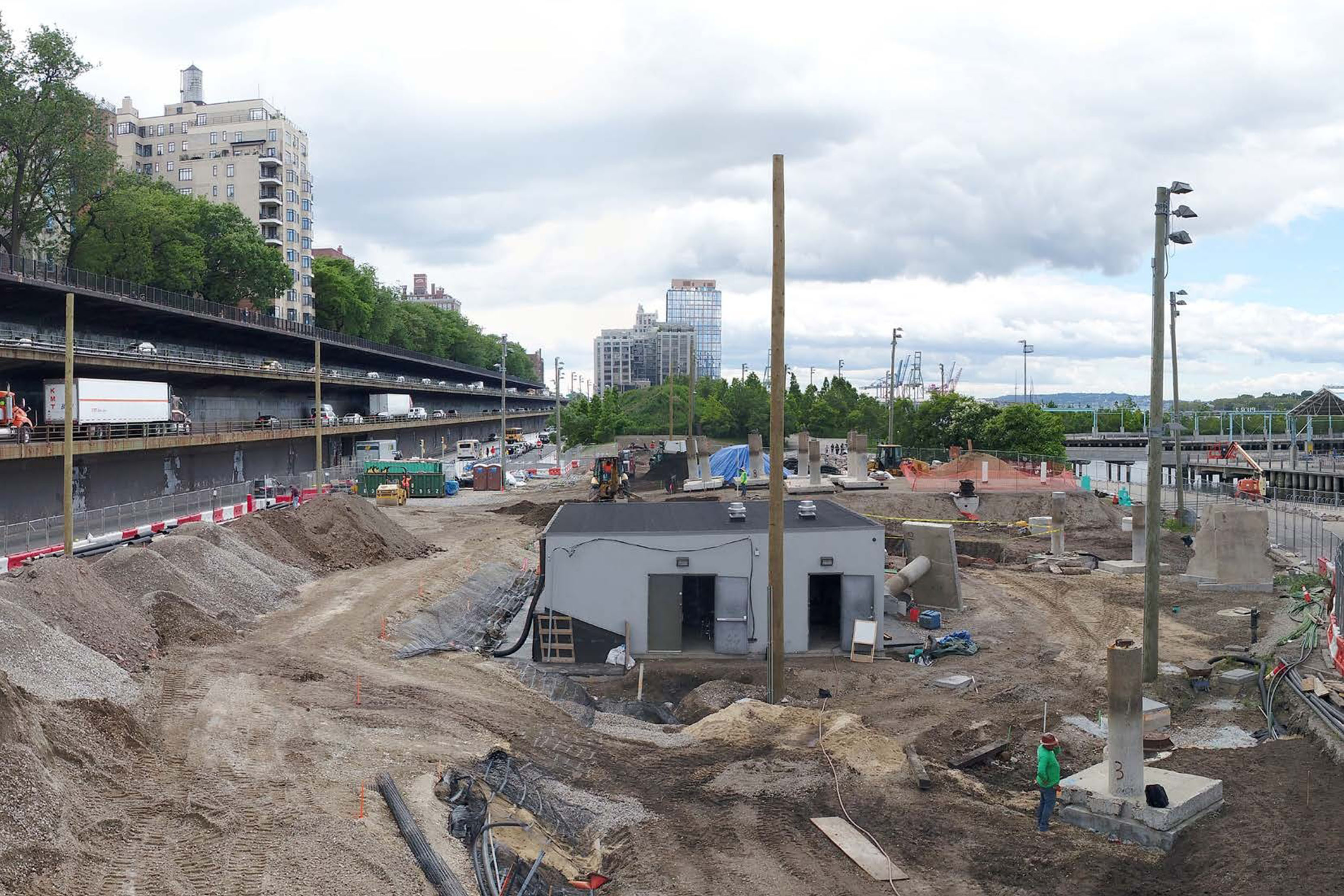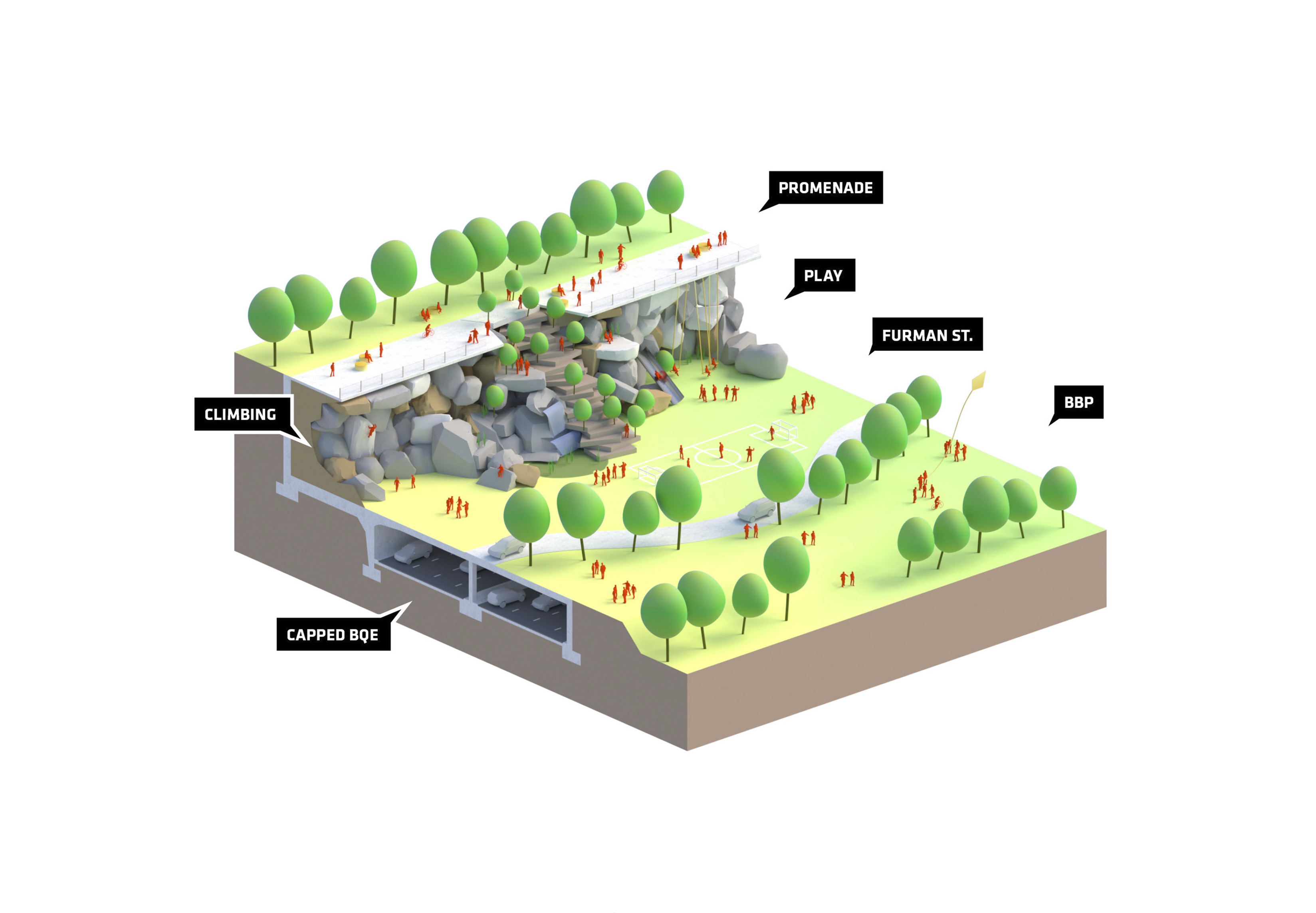 By deconstructing and re-naturalizing the built urban shoreline, the water’s edge is expanded into the city, creating a beach that brings people out to the water. A circular path frames a protected cove, providing 360° panoramic views of Brooklyn and Manhattan. By extending landscape-piers to the concrete caissons existing today, breakwaters are created that dissipate wave action from river waves and wakes from boats. This protected cove will support in-water recreation such as swimming and boating, while mitigating the effects of storm surge on the neighborhood.