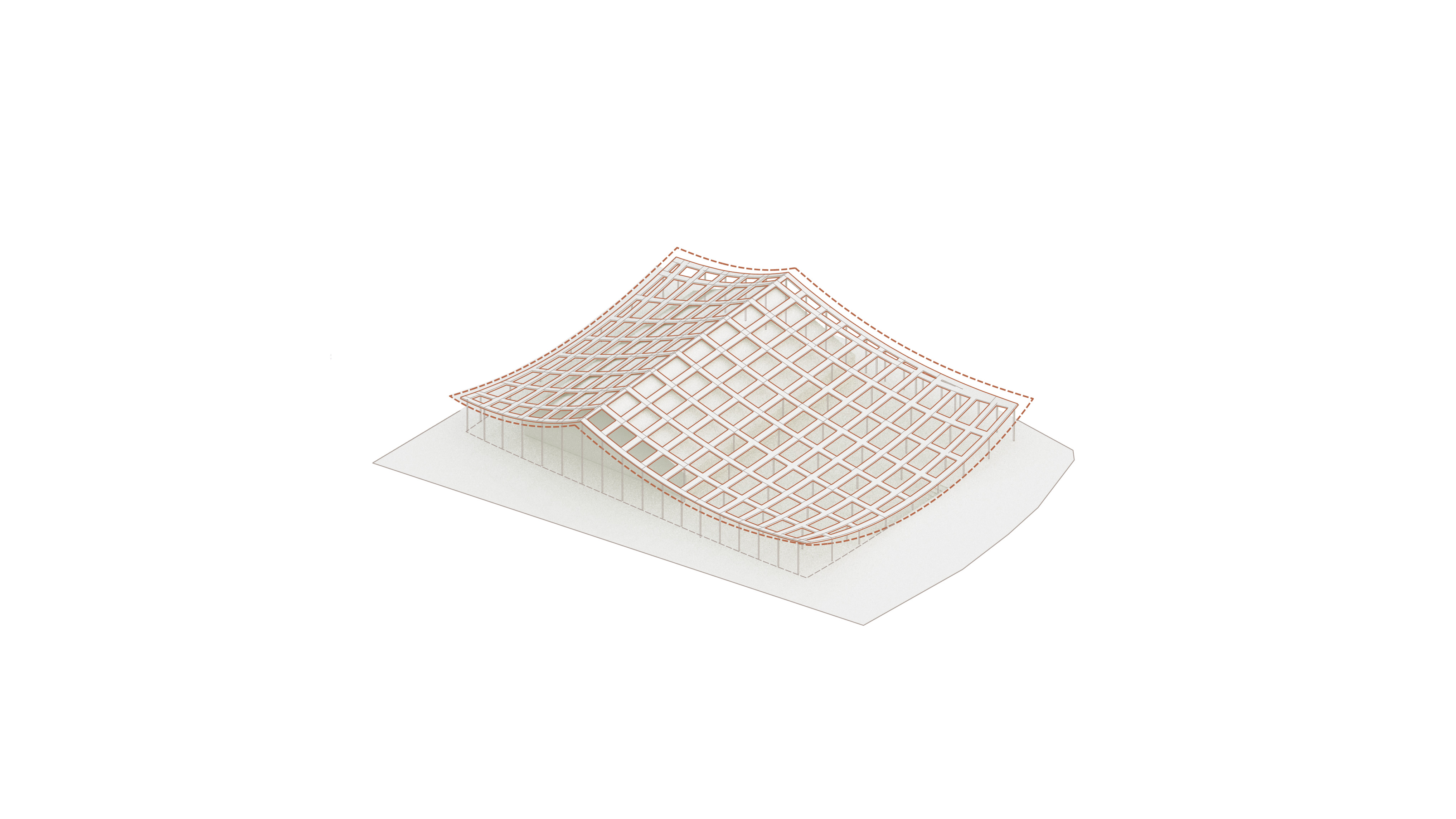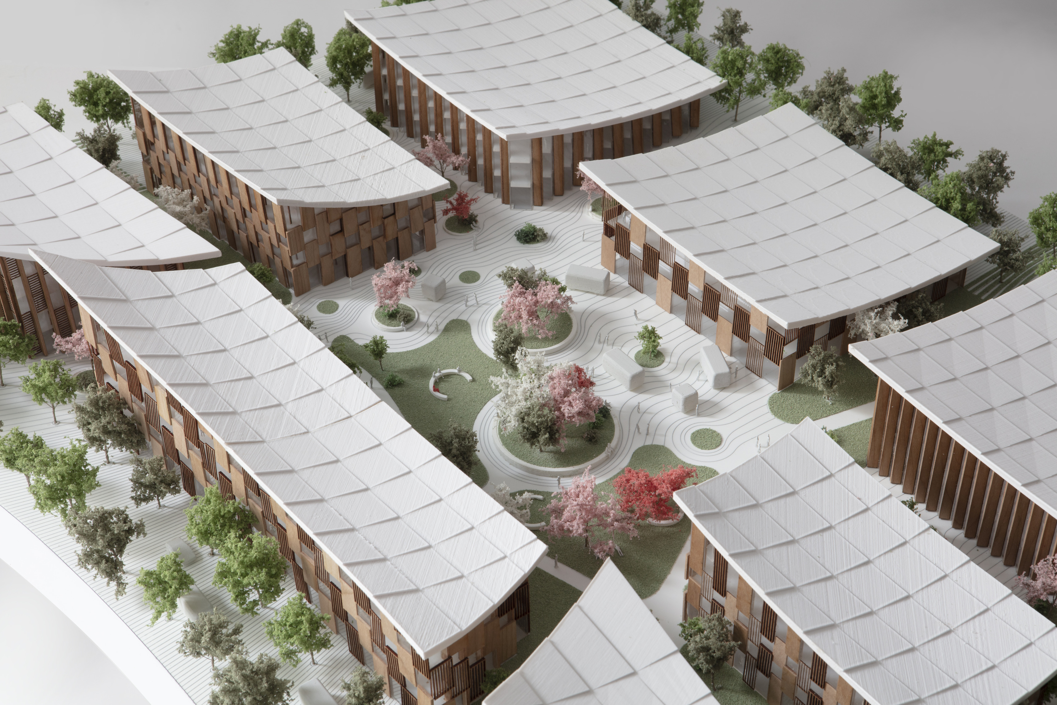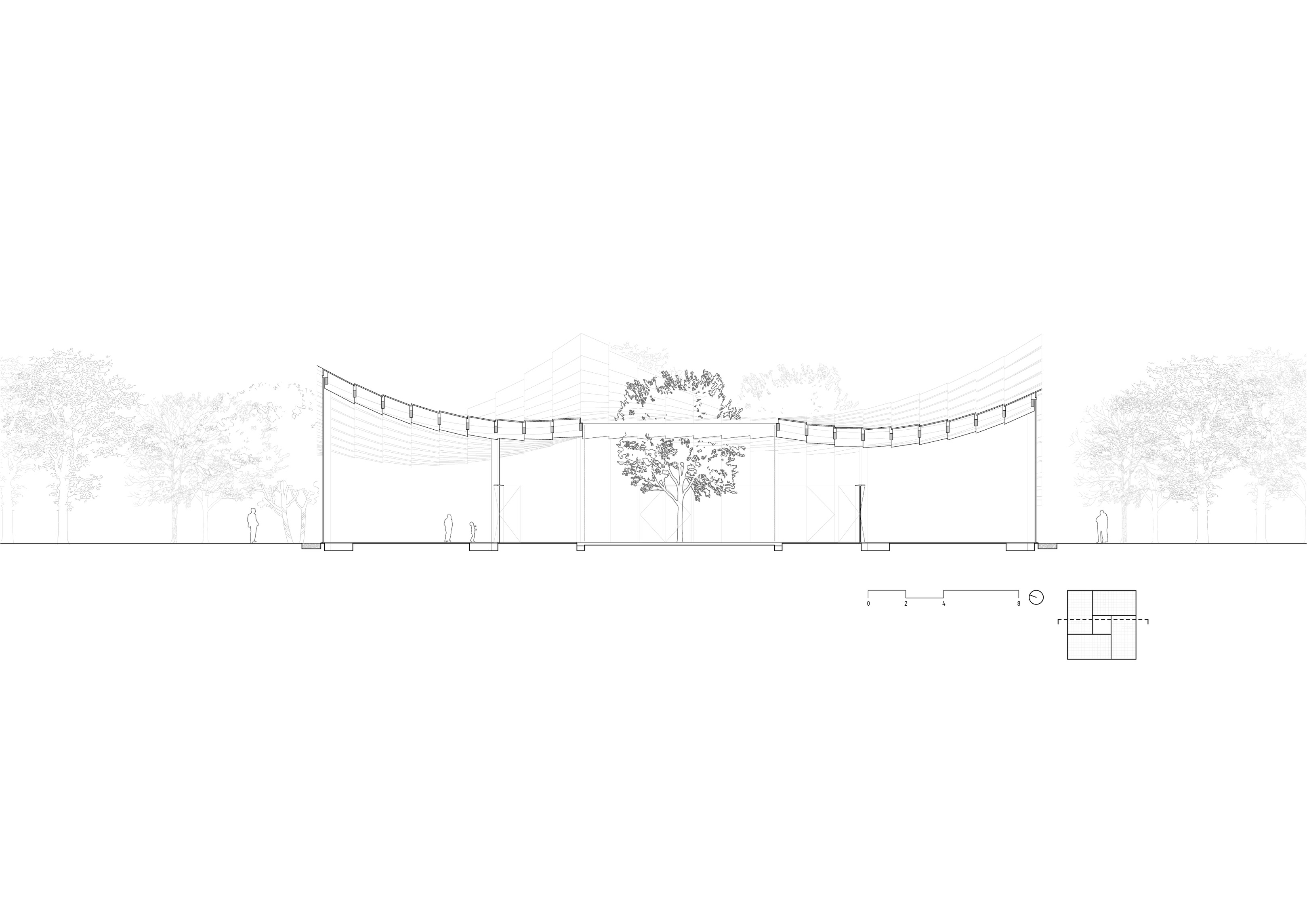 Conceived as a reimagination of the traditional garden ‘lang’ 廊 – a long, covered corridor that traces a path – 12 interconnected pavilions are unified beneath a continuous, ribbon-like roof whose gentle undulations recall the silhouette of tiled eaves.