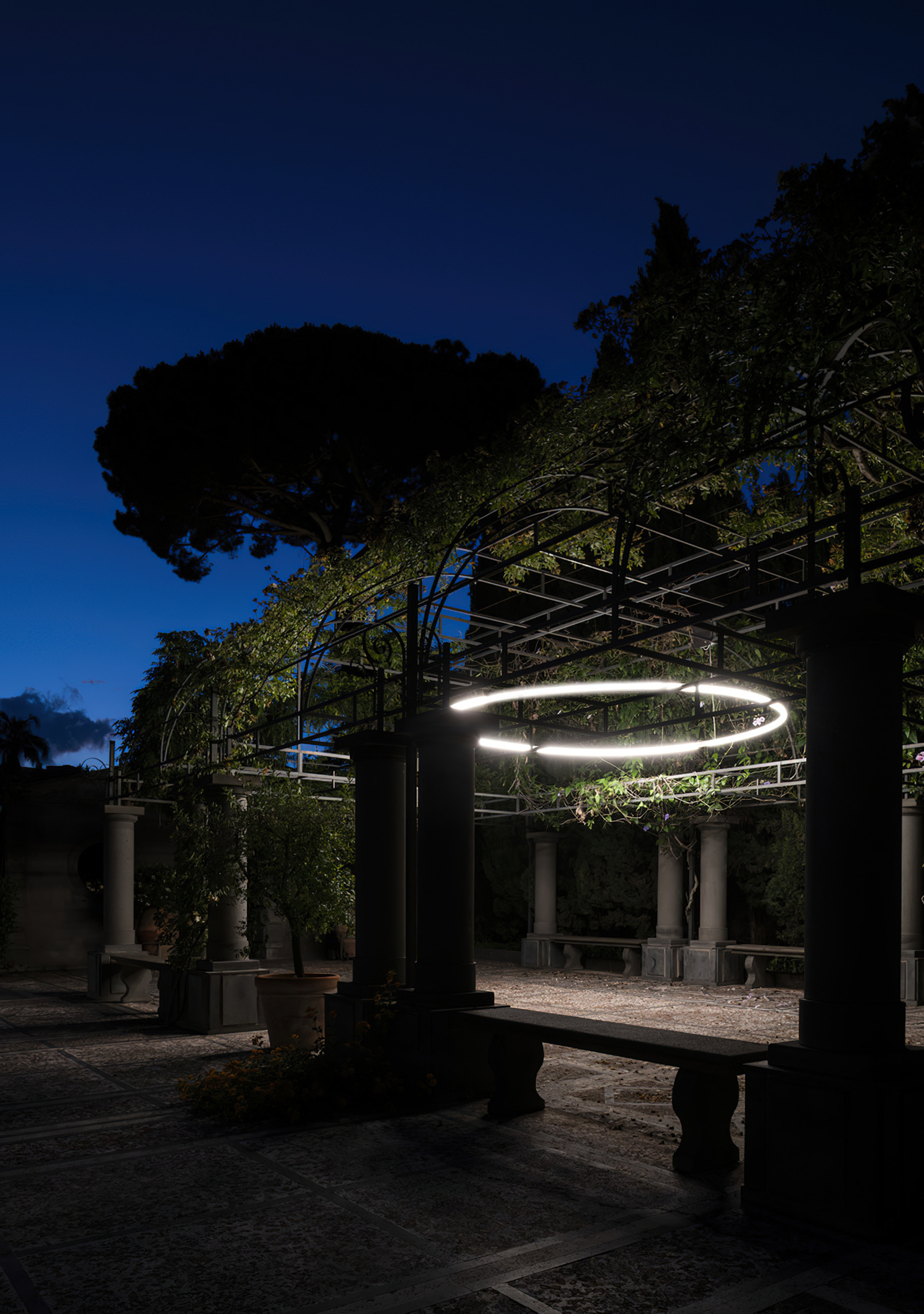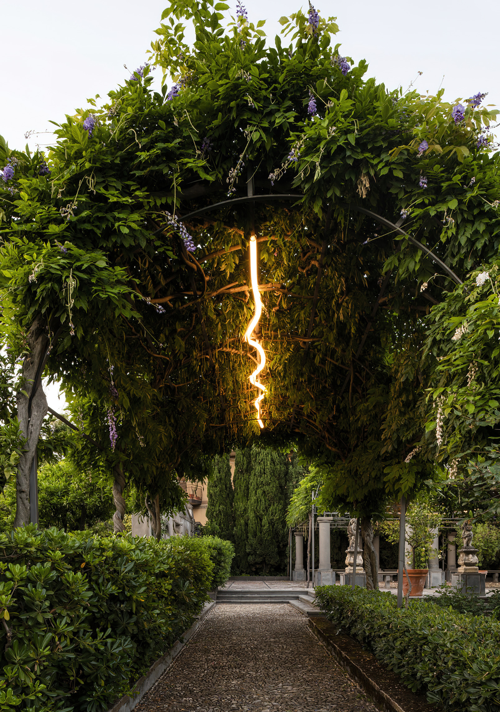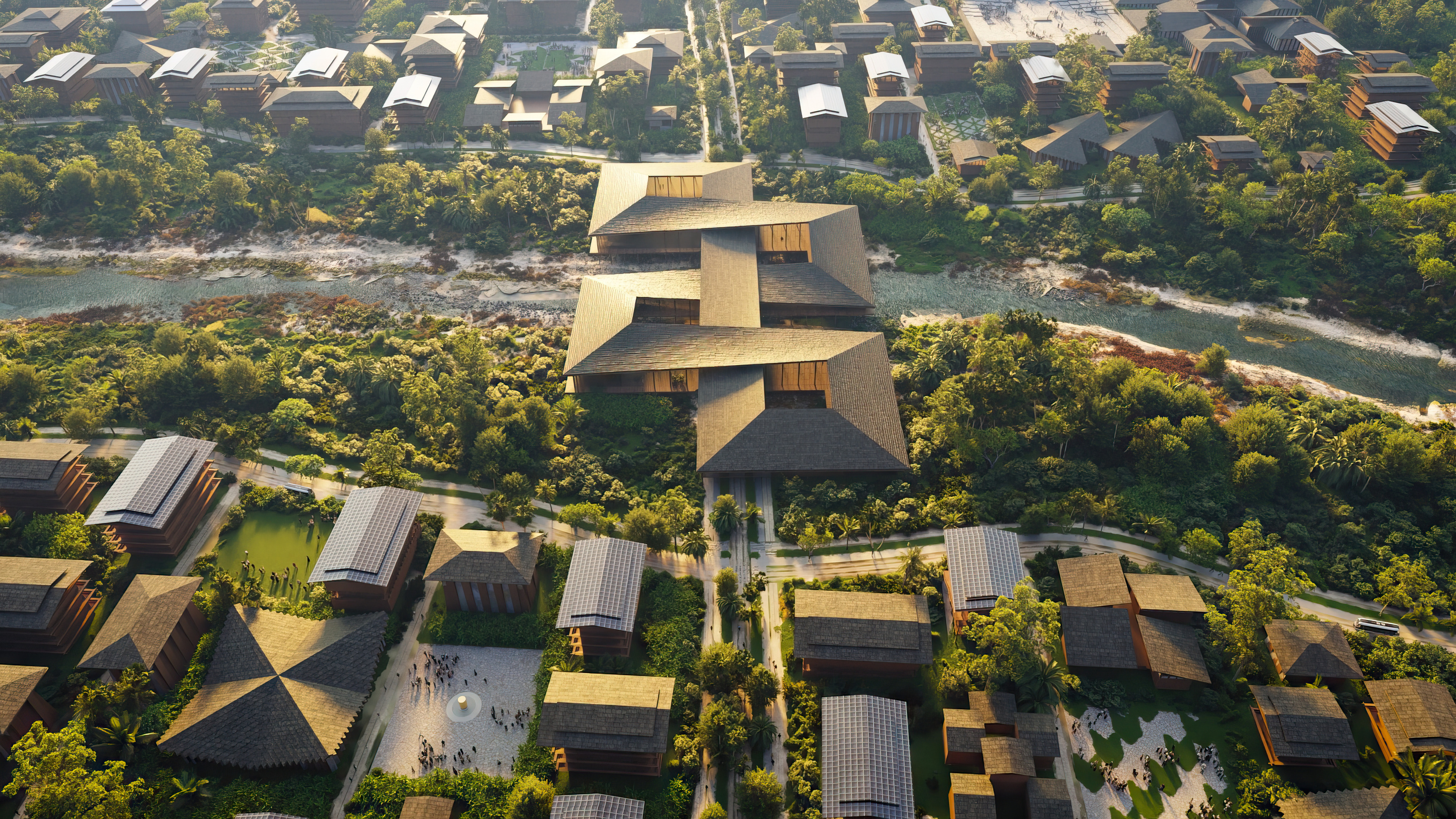 Conceived as a reimagination of the traditional garden ‘lang’ 廊 – a long, covered corridor that traces a path – 12 interconnected pavilions are unified beneath a continuous, ribbon-like roof whose gentle undulations recall the silhouette of tiled eaves.