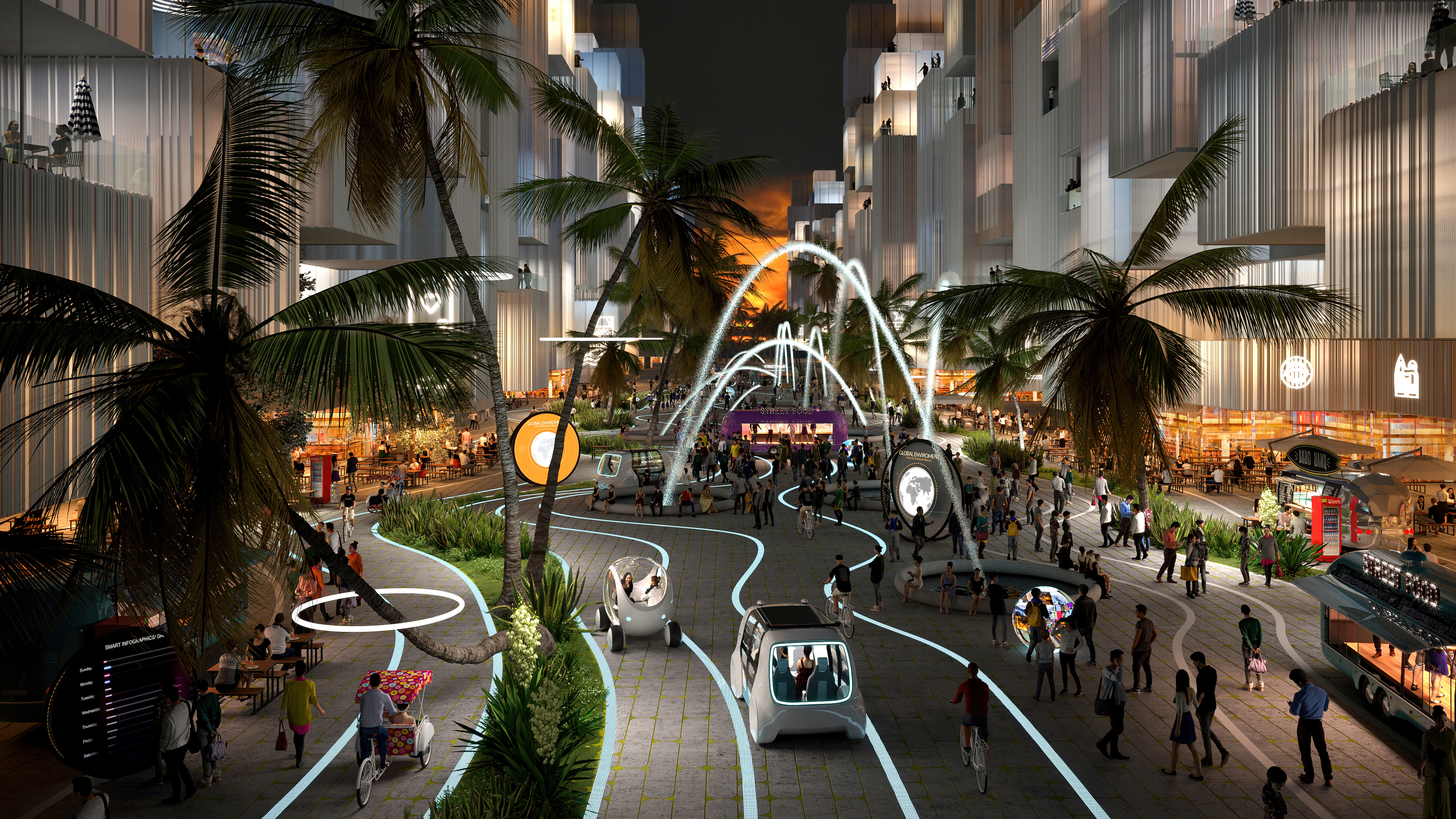 Designed to be a 15-minute city, Telosa’s layout allows workplaces, schools, and basic goods and services to remain within a 15-minute commute from residents’ homes. Vehicles powered by fossil fuels will not be permitted inside city limits, with an emphasis instead being placed upon walkability and the use of scooters, bicycles, and autonomous electric vehicles – including the Sky Tram, part of Telosa’s transport system.