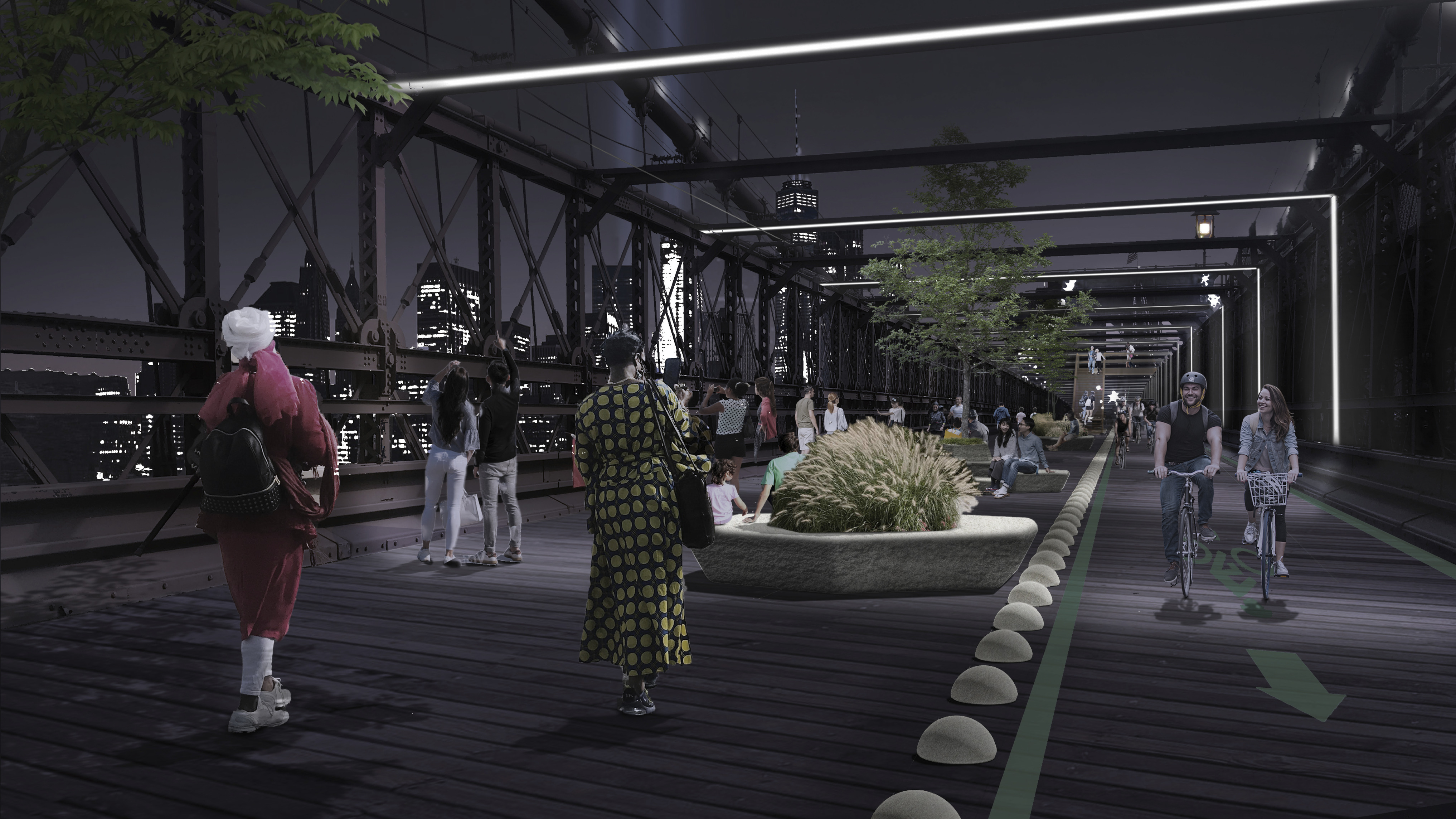 “Our proposal closes one of the last remaining gaps in the continuous transformation of the Williamsburg waterfront into a post-industrial natural habitat. Rather than stopping at the hard edge of the old dock, Metropolitan Avenue is split into a pedestrian loop extending all the way into the river, connecting the dots of the concrete caissons to form an urban archipelago of recreative islands while protecting a beach and body of water for water sports and wetlands. The radical transformation of Copenhagen’s port into a swimmable extension of the public space that we helped pioneer two decades ago, now seems to be knocking at the door in Williamsburg and the entire East River. The River Loop will be the first of many invitations for New Yorkers to dip their toes in the water.”