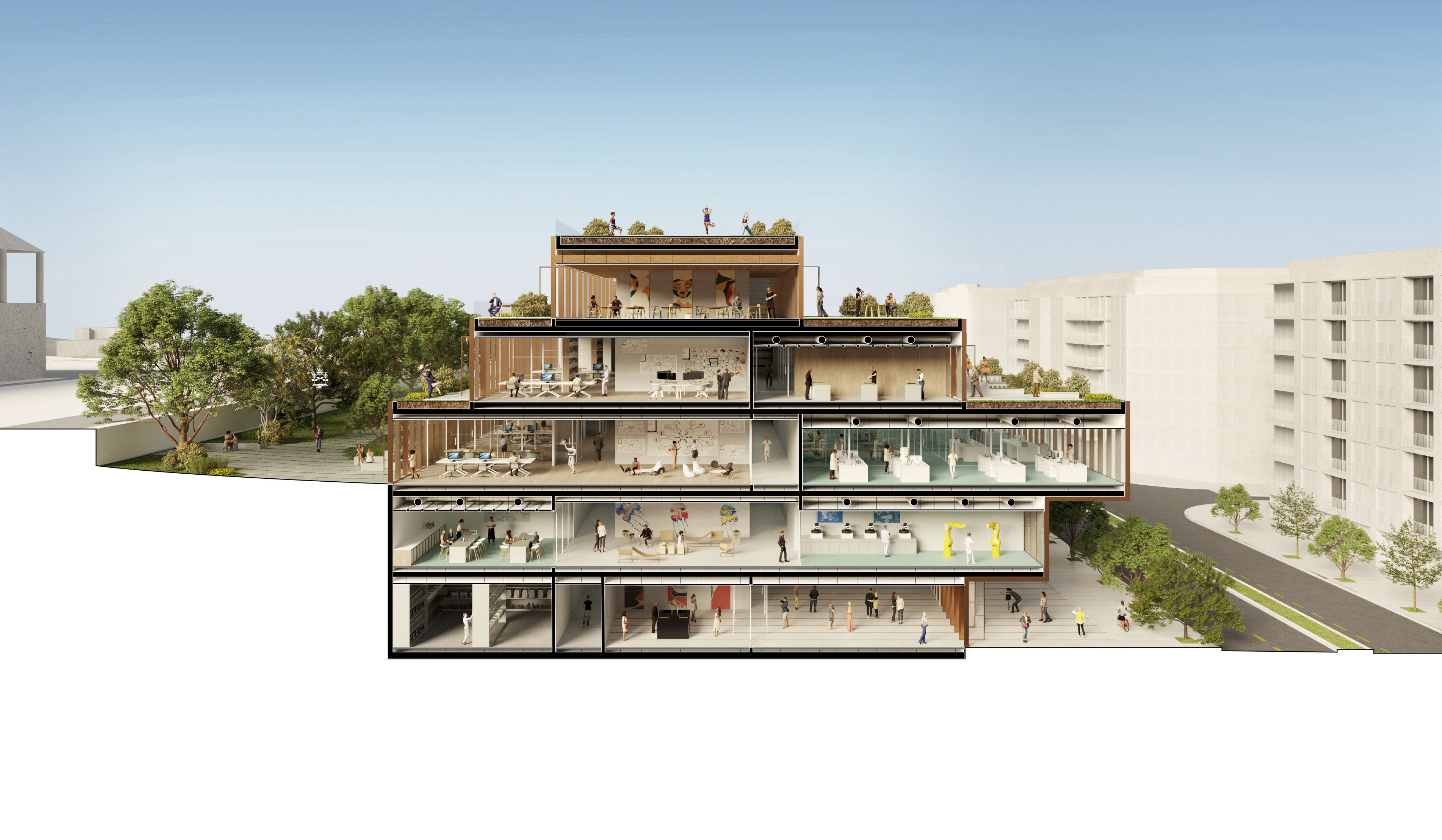 A mix of housing, retail, and business – to be built primarily of carbon-sequestering wood with photovoltaic panels installed on the roofs – characterize each city block, ensuring vibrant and active neighborhoods at all times of the day. Toyota’s R&D spaces house robotic construction, 3D printing, and mobility labs, while typical offices flexibly accommodate workstations, lounges, and indoor gardens.