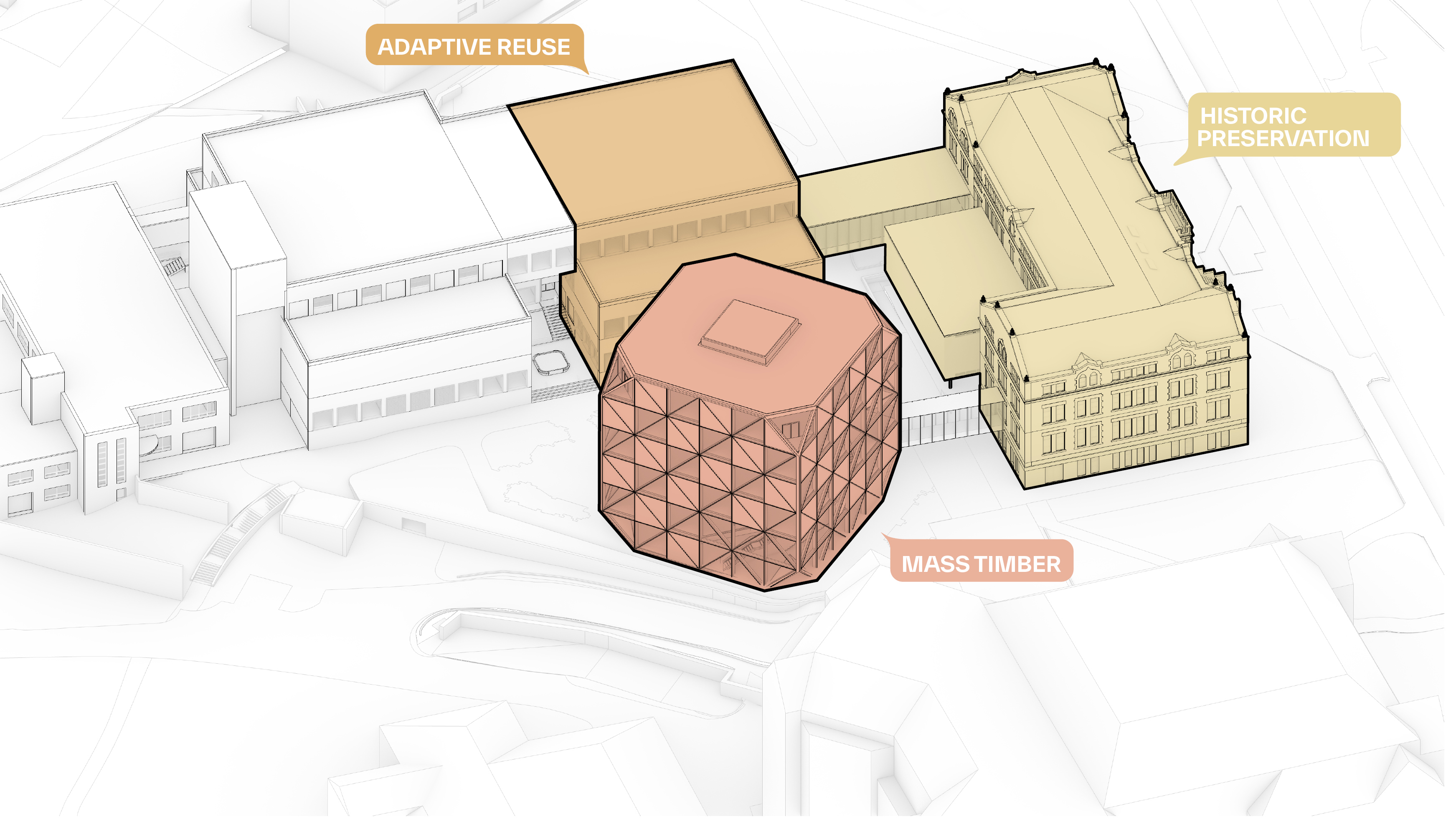 "Where student activities at Johns Hopkins University were once dispersed all over campus and all over town, they are now collected and clustered at the Bloomberg Student Center - a village of timber pavilions climbing the natural hill on the university’s edge. Like the indoor counterpart of The Beach - the circular sloping front lawn of the Homewood campus - the Student Center is open and inviting in all directions. Tugged into the topography, the center is a four-story building where every floor is directly accessible from the outside, from every side. As the individual timber pavilions join together, they leave generous openings in between, allowing daylight and views to reach every corner of the building. At its heart - underneath the solar paneled rooftops - the creative commons is a cascading, four seasons meeting space for students and faculty - academic, cultural, and social activities alike. The mass timber construction not only substantially reduces the embodied carbon footprint of the building, but also provides an atmosphere of welcoming warmth and inviting informality."