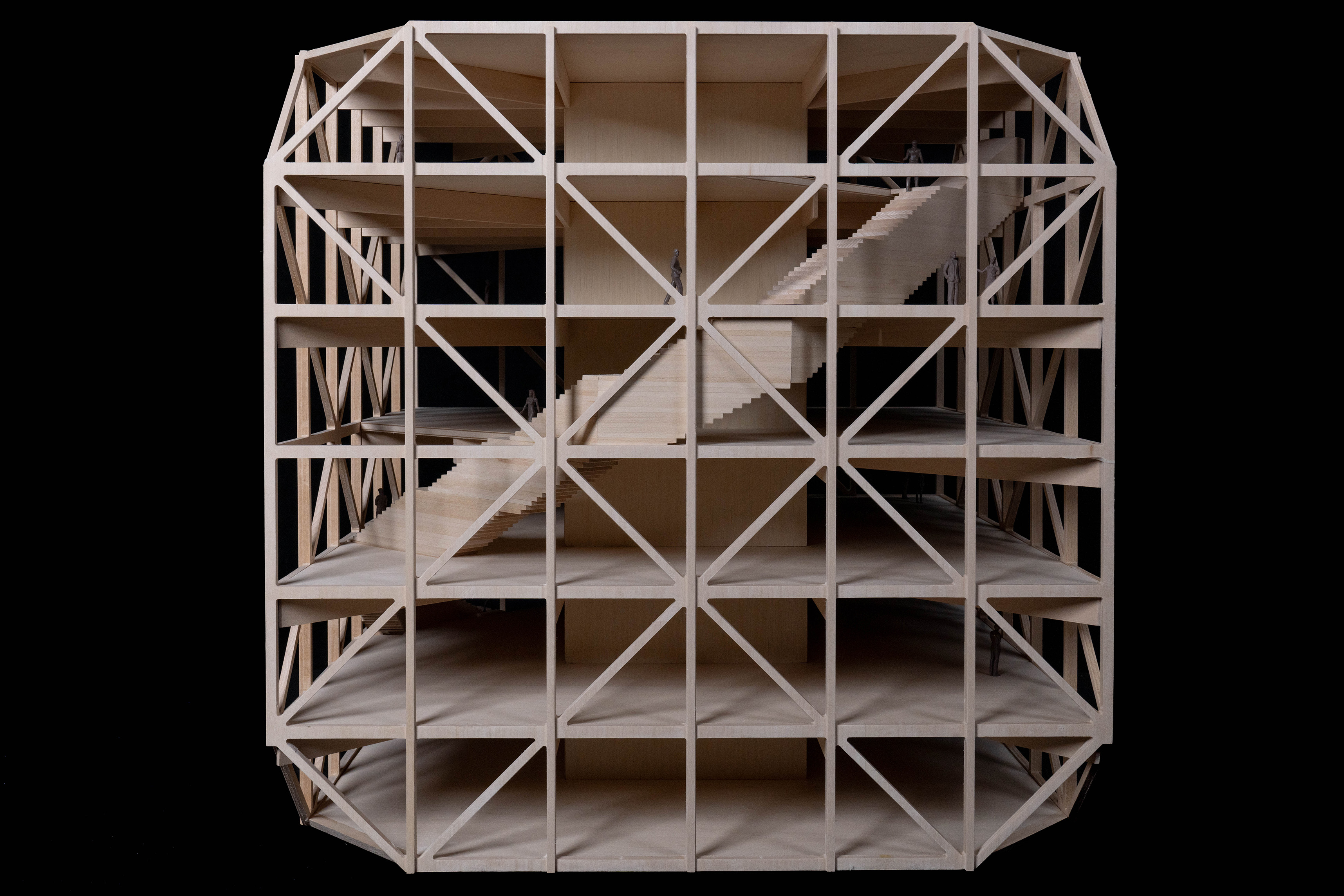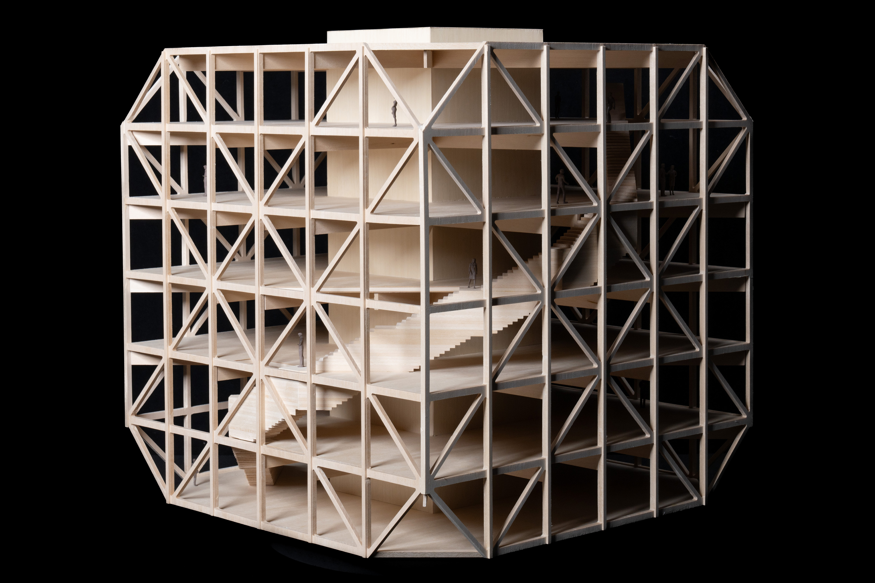 The building’s structure is designed as a stack of two volumes, with each pair rotated 45 degrees from the floor below. The voids of the rotated blocks create the full-height atrium at the heart of the building, which provides direct views into classrooms and research spaces from all levels. The open spaces within the atrium invite collaboration, embodying the center’s architectural and educational approach.